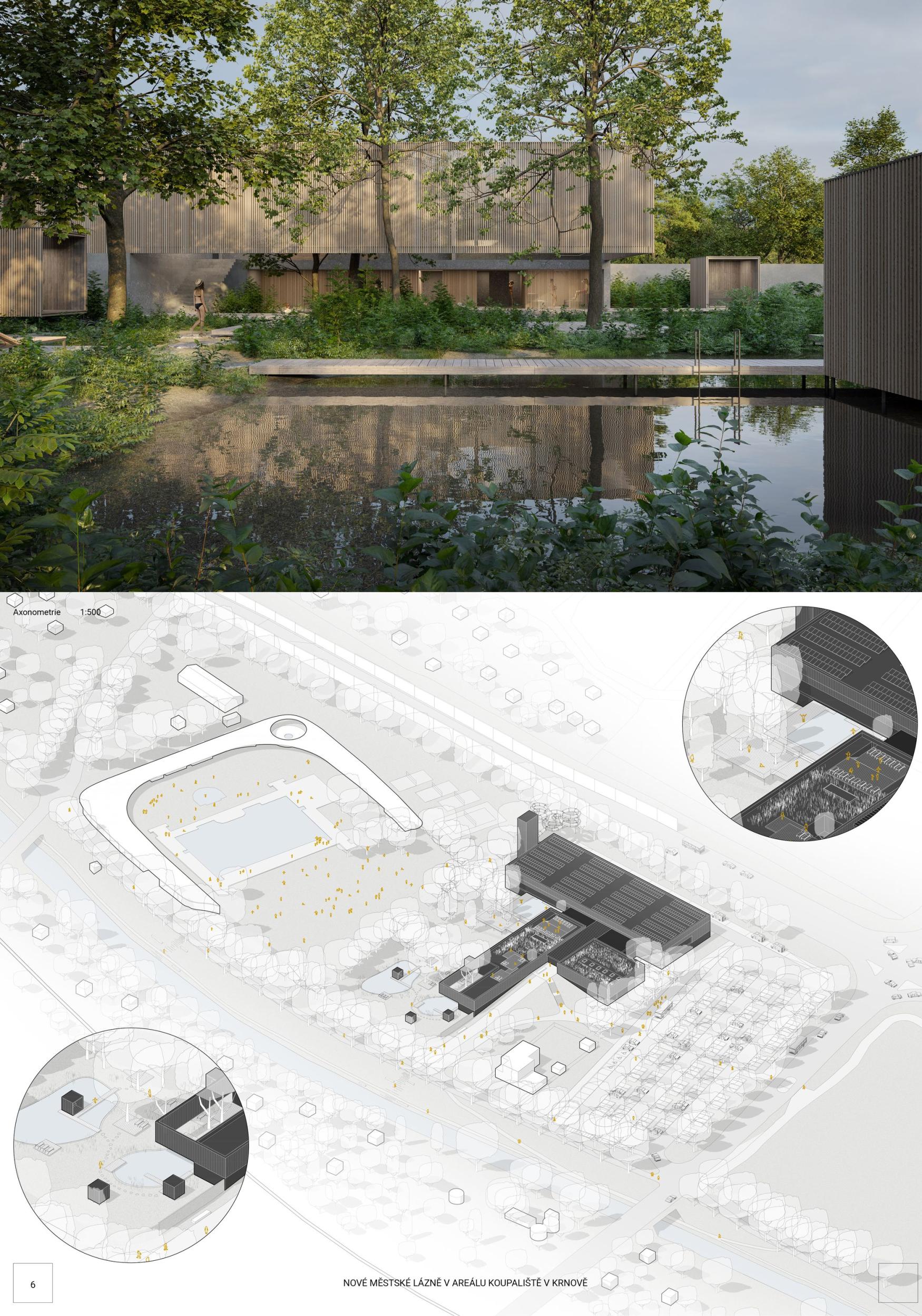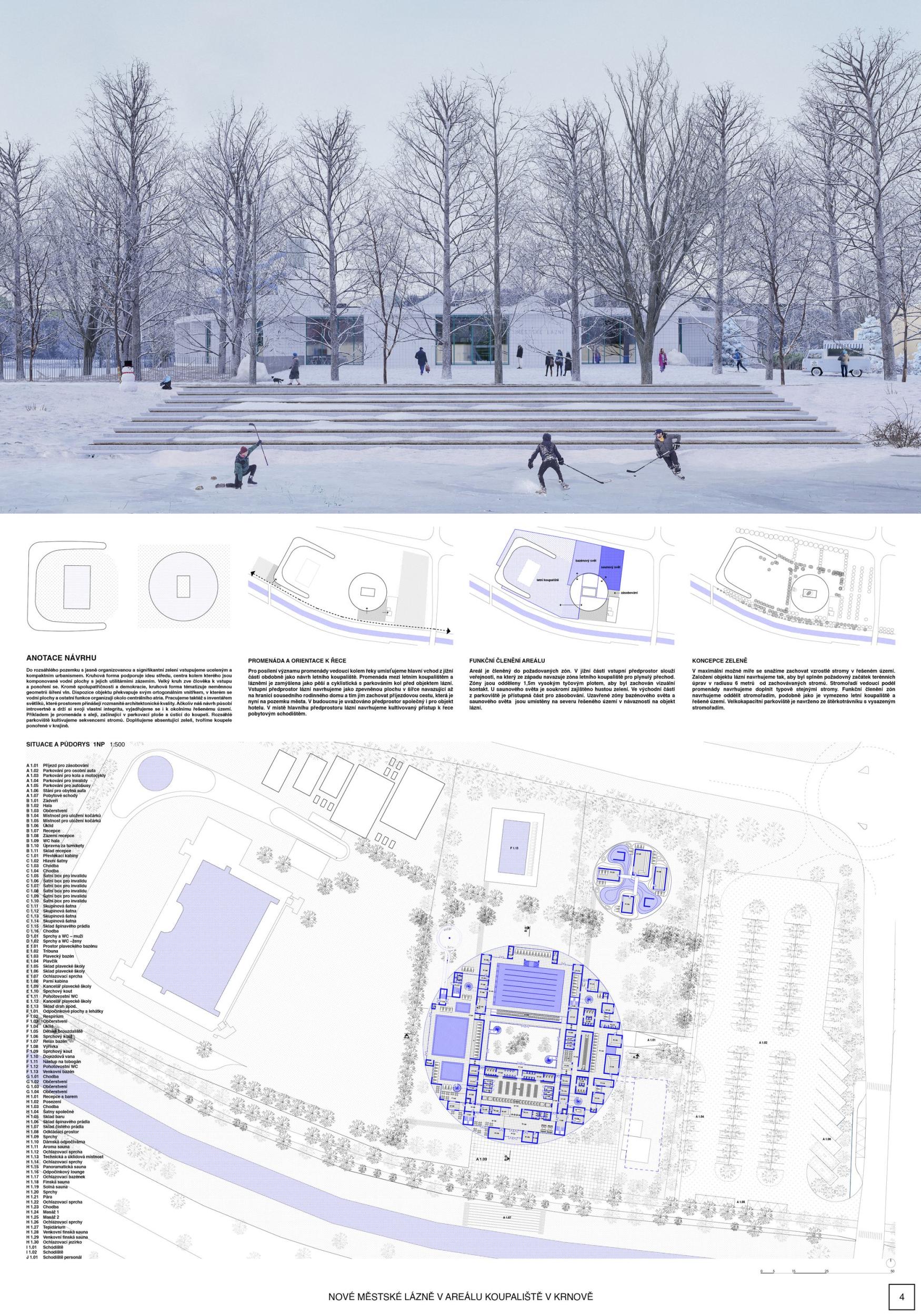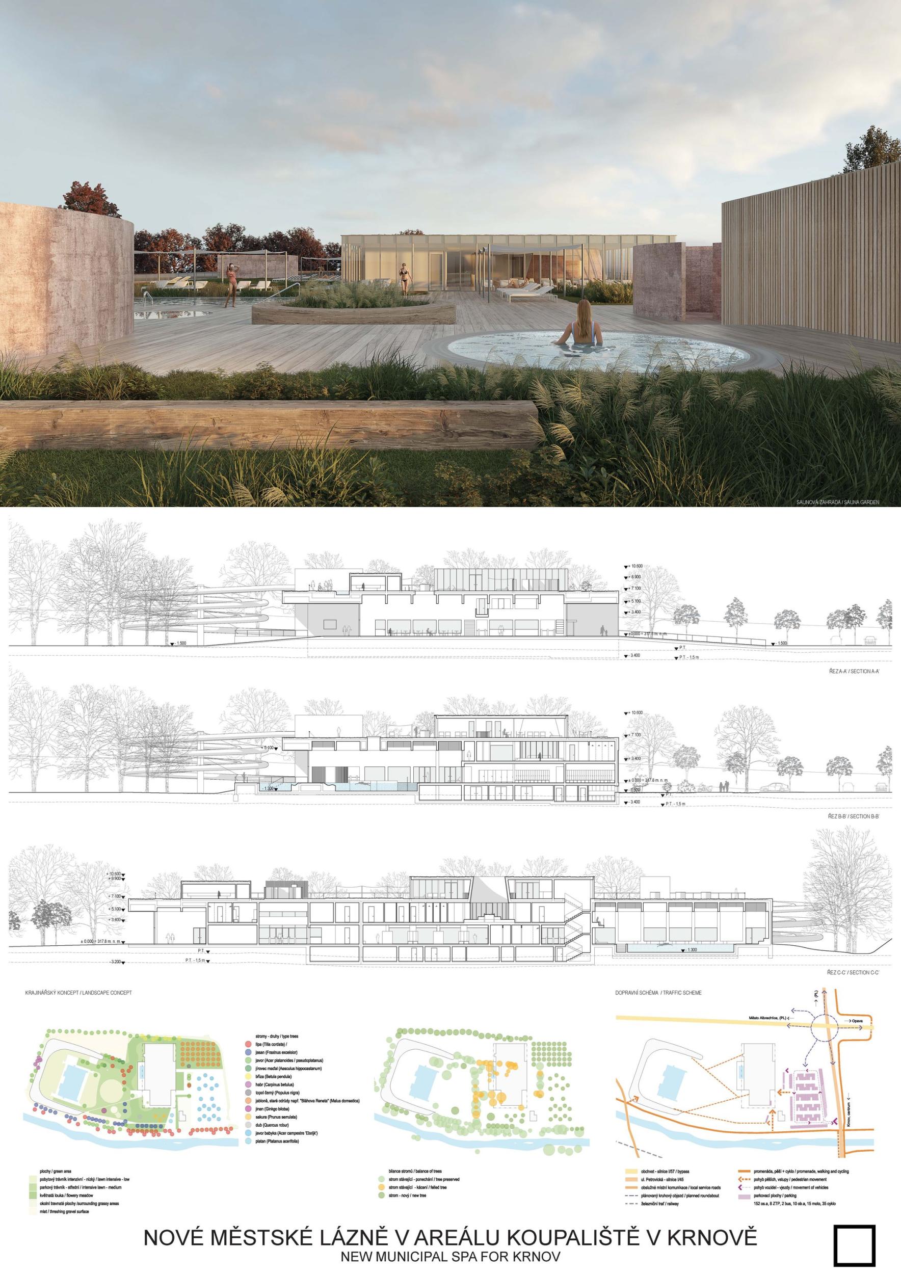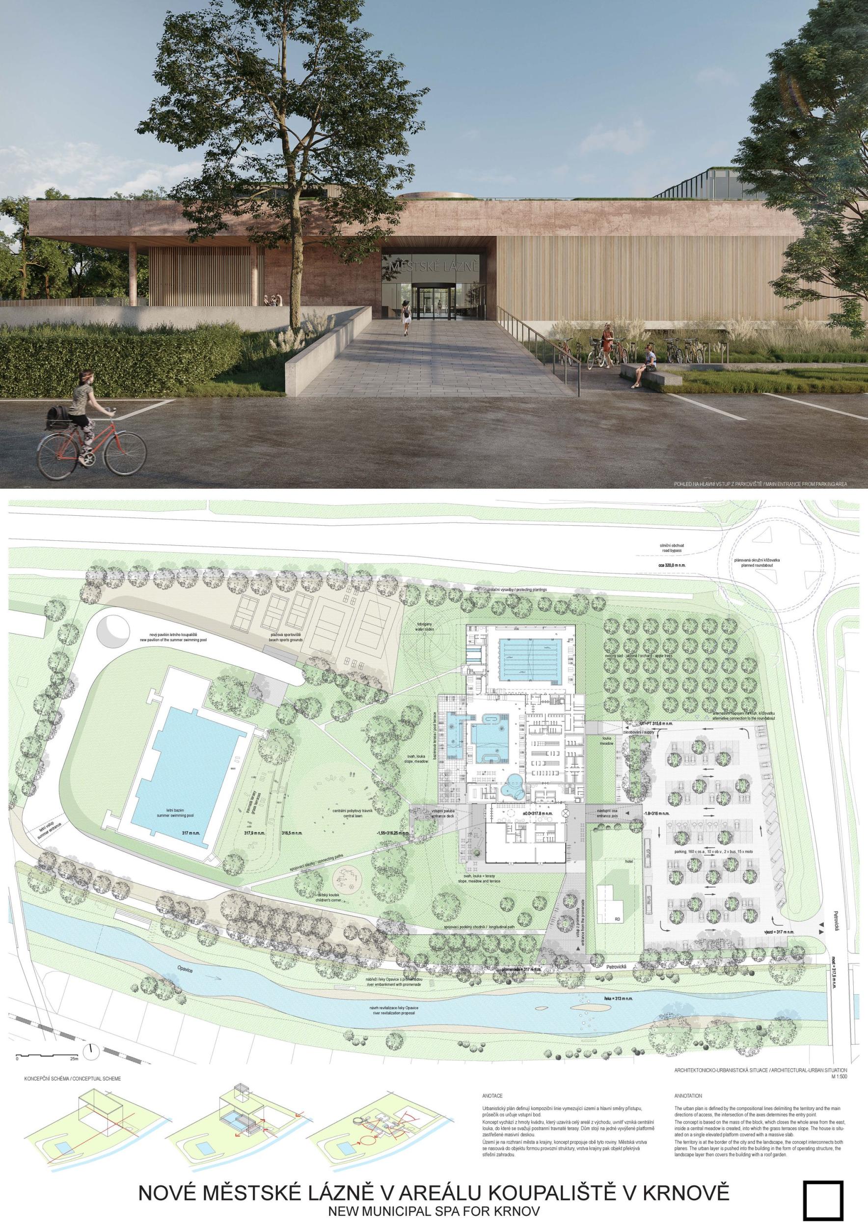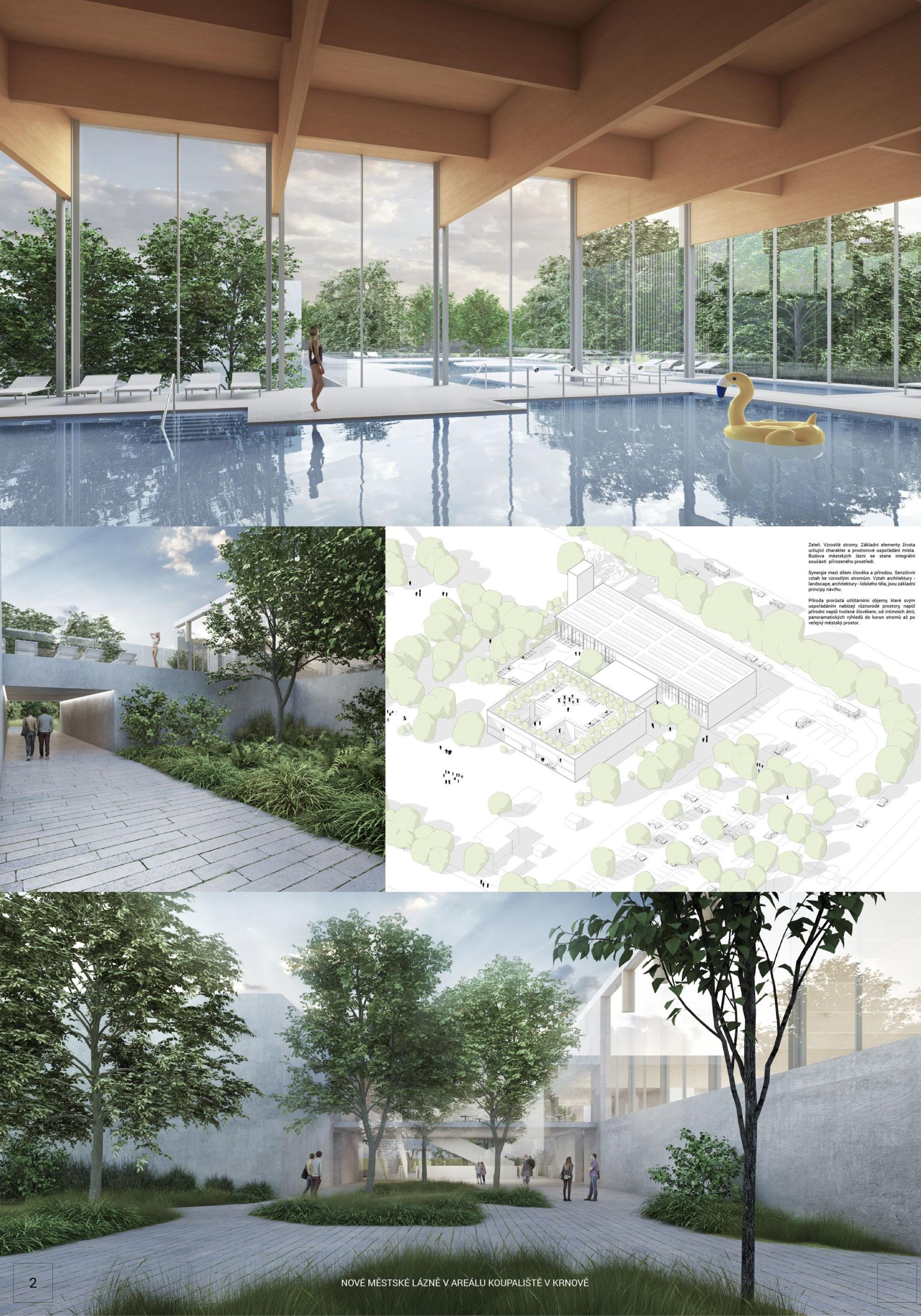The design considers multiple layers in both landscape scale and detail and is unique in its strong urban design concept. Landscaped in a unique way, the space of the "spa park" has a relaxed, natural, pleasant feel. It leaves maximum open space for a common park and unifies the swimming pool and pool area, the connection between the two parts of the site is synergistic, opening to the south along the entire length of the site. The dialogue with the river Opavice is also positive. Here, it would not be necessary to stick to a single bank solution. The location of the new building in the northern part has created a green pocket, which is the biggest benefit of the proposal. The house is operationally clear and legible. The jury appreciates the location of the pool halls to the park and the maximum visitor contact within the site. The compactness and conciseness of the design also work with the subtle curvature of the plan, the light and the structure of the house. The expression of the house, on the other hand, is rather schematic and this, together with the solution to the western corner, weakens the overall concept. A sense of spa-like intimacy may be lacking. Slight mistrust is raised by the timber trees on the roof structures (their size in relation to the strength of the plant substrate).
