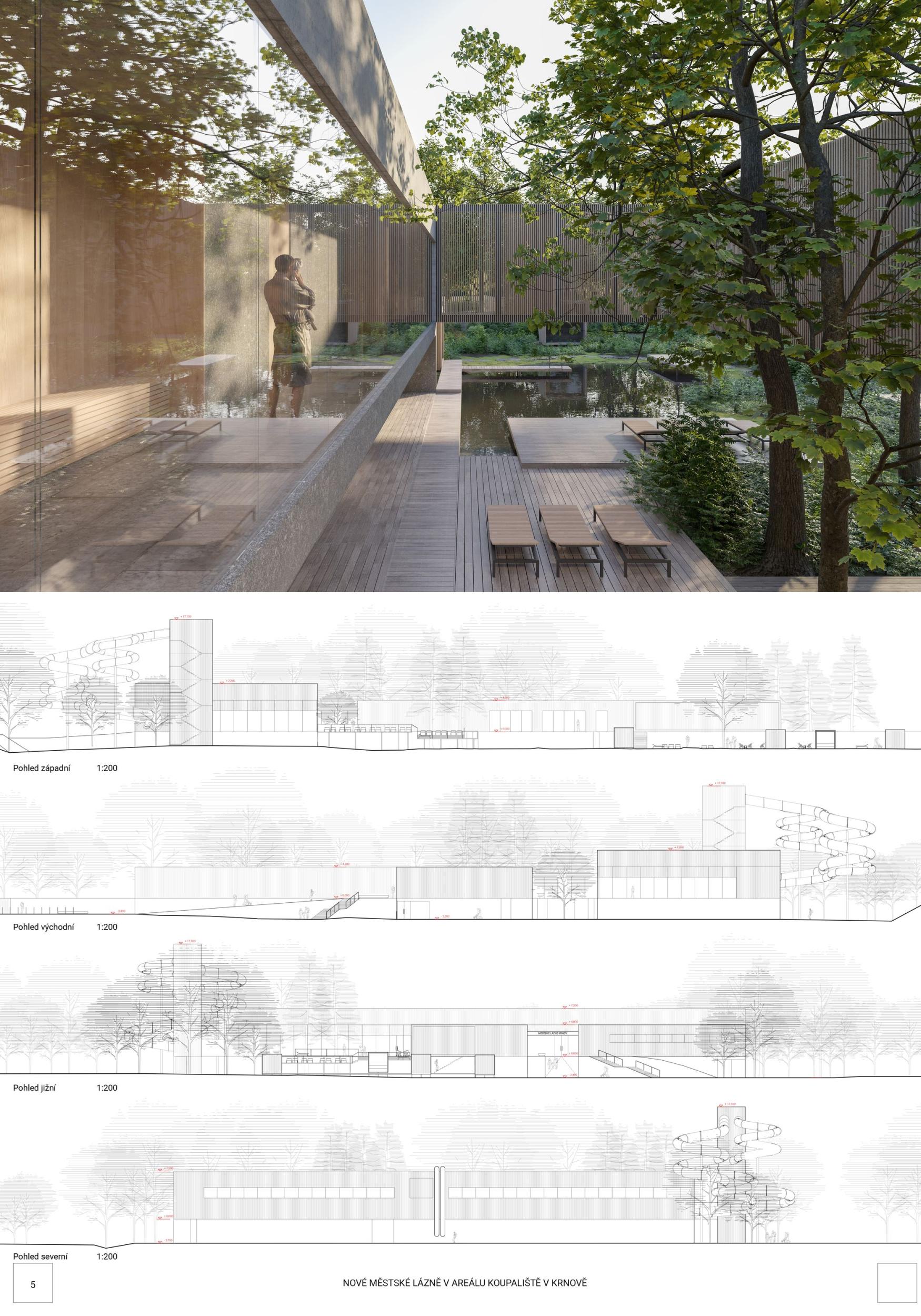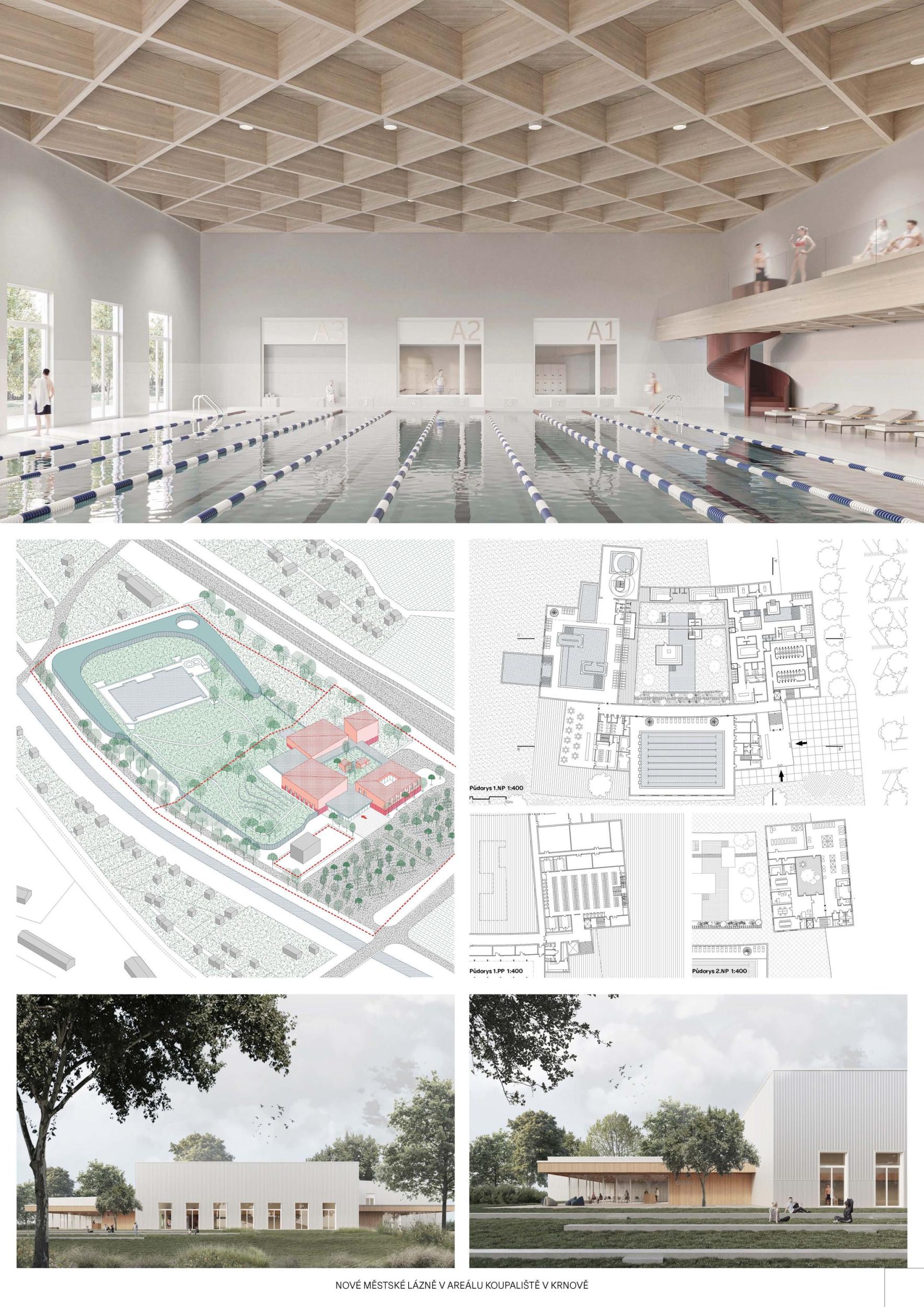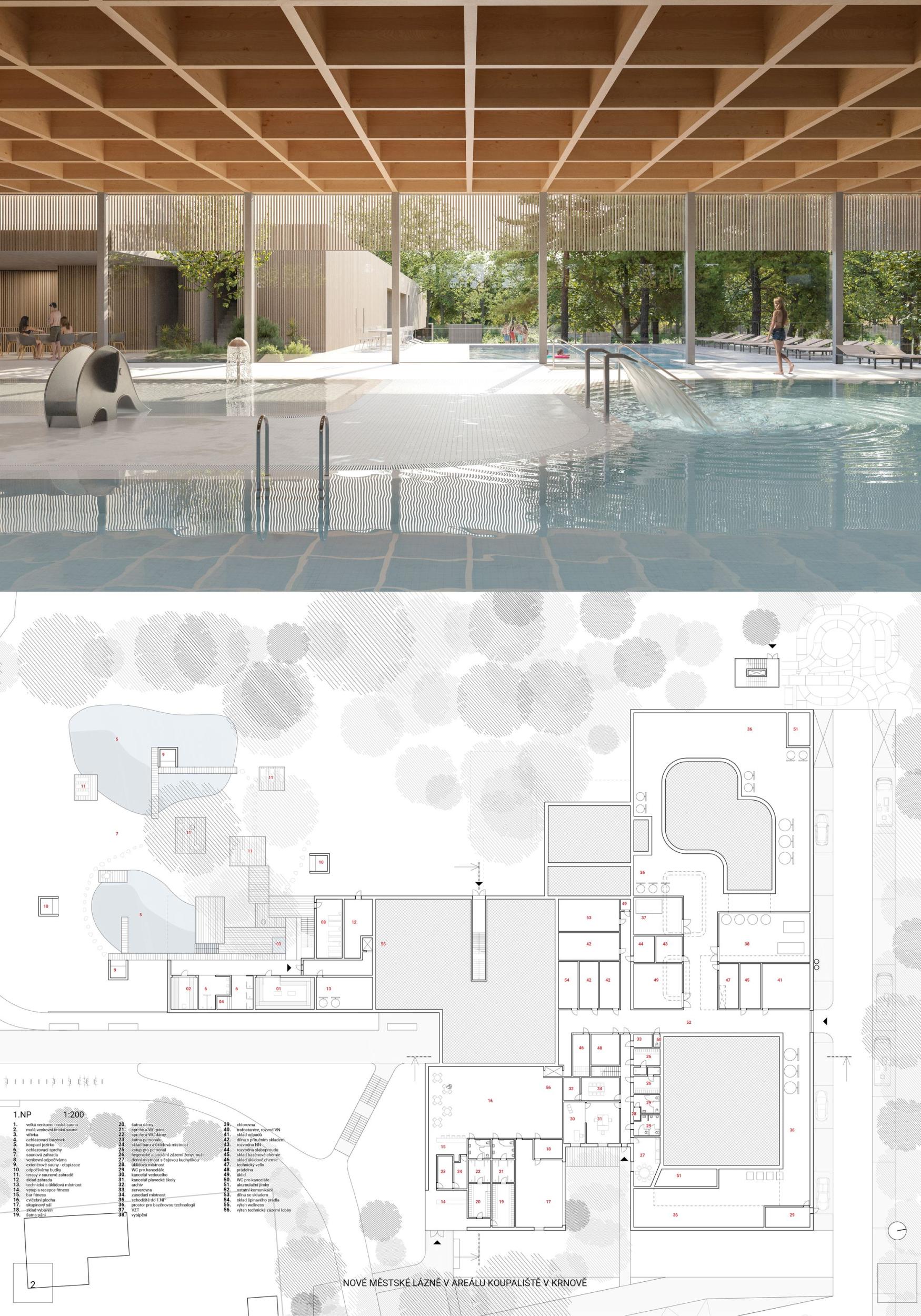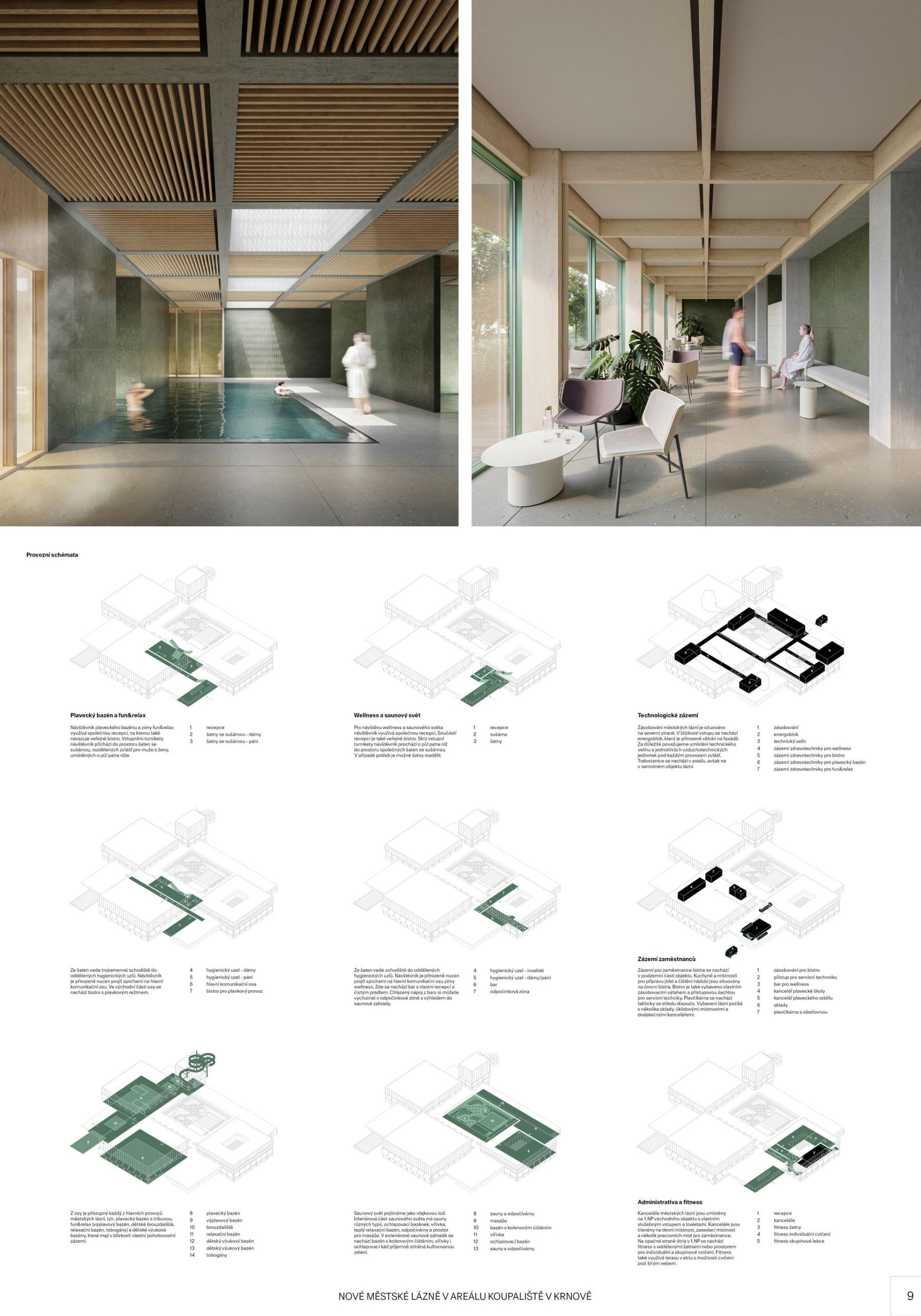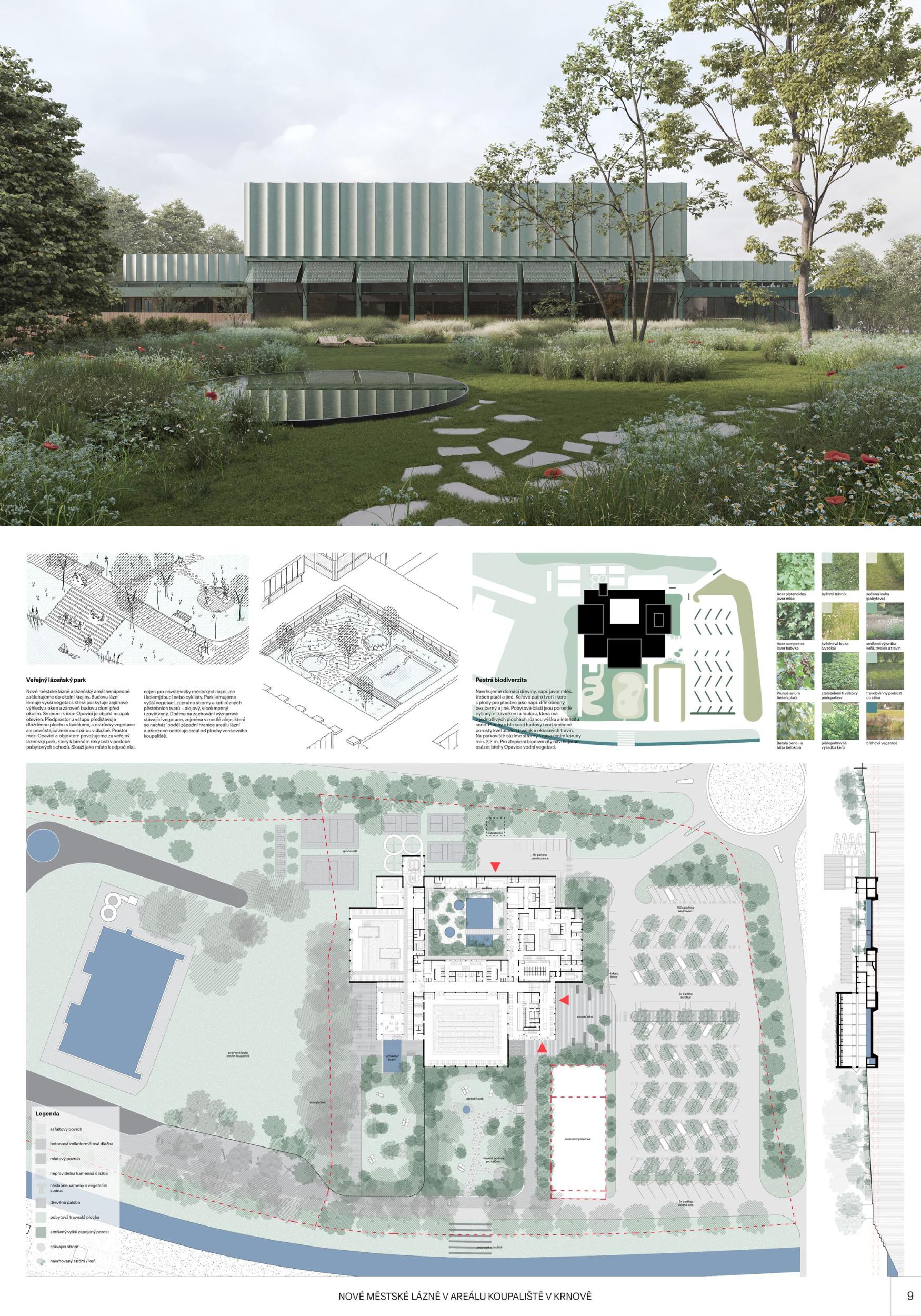 The design considers multiple layers in both landscape scale and detail and is unique in its strong urban design concept. Landscaped in a unique way, the space of the "spa park" has a relaxed, natural, pleasant feel. It leaves maximum open space for a common park and unifies the swimming pool and pool area, the connection between the two parts of the site is synergistic, opening to the south along the entire length of the site. The dialogue with the river Opavice is also positive. Here, it would not be necessary to stick to a single bank solution. The location of the new building in the northern part has created a green pocket, which is the biggest benefit of the proposal. The house is operationally clear and legible. The jury appreciates the location of the pool halls to the park and the maximum visitor contact within the site. The compactness and conciseness of the design also work with the subtle curvature of the plan, the light and the structure of the house. The expression of the house, on the other hand, is rather schematic and this, together with the solution to the western corner, weakens the overall concept. A sense of spa-like intimacy may be lacking. Slight mistrust is raised by the timber trees on the roof structures (their size in relation to the strength of the plant substrate).