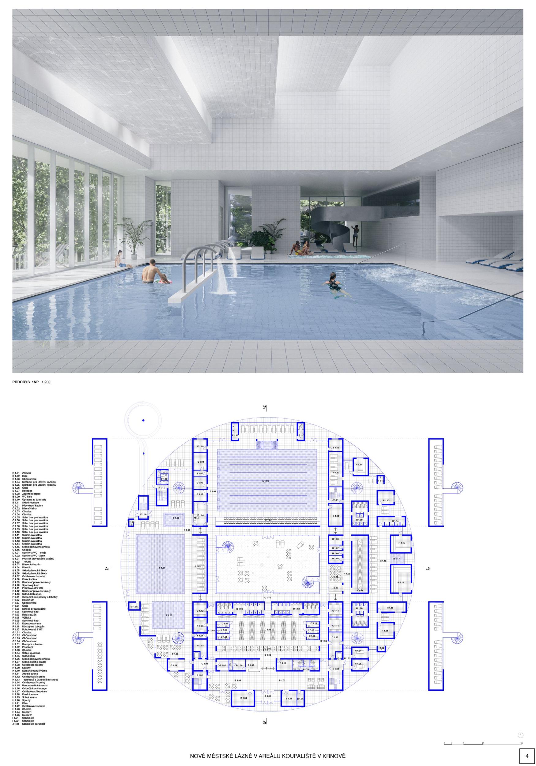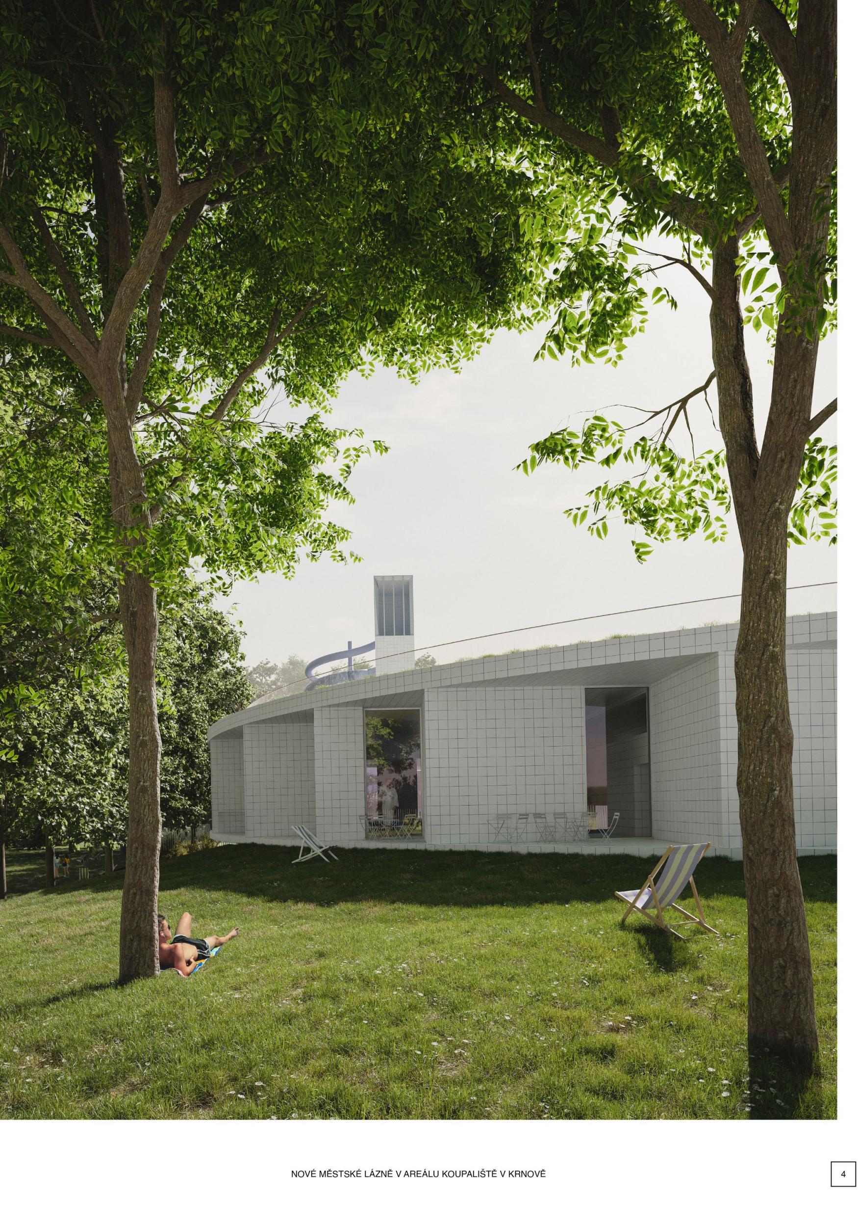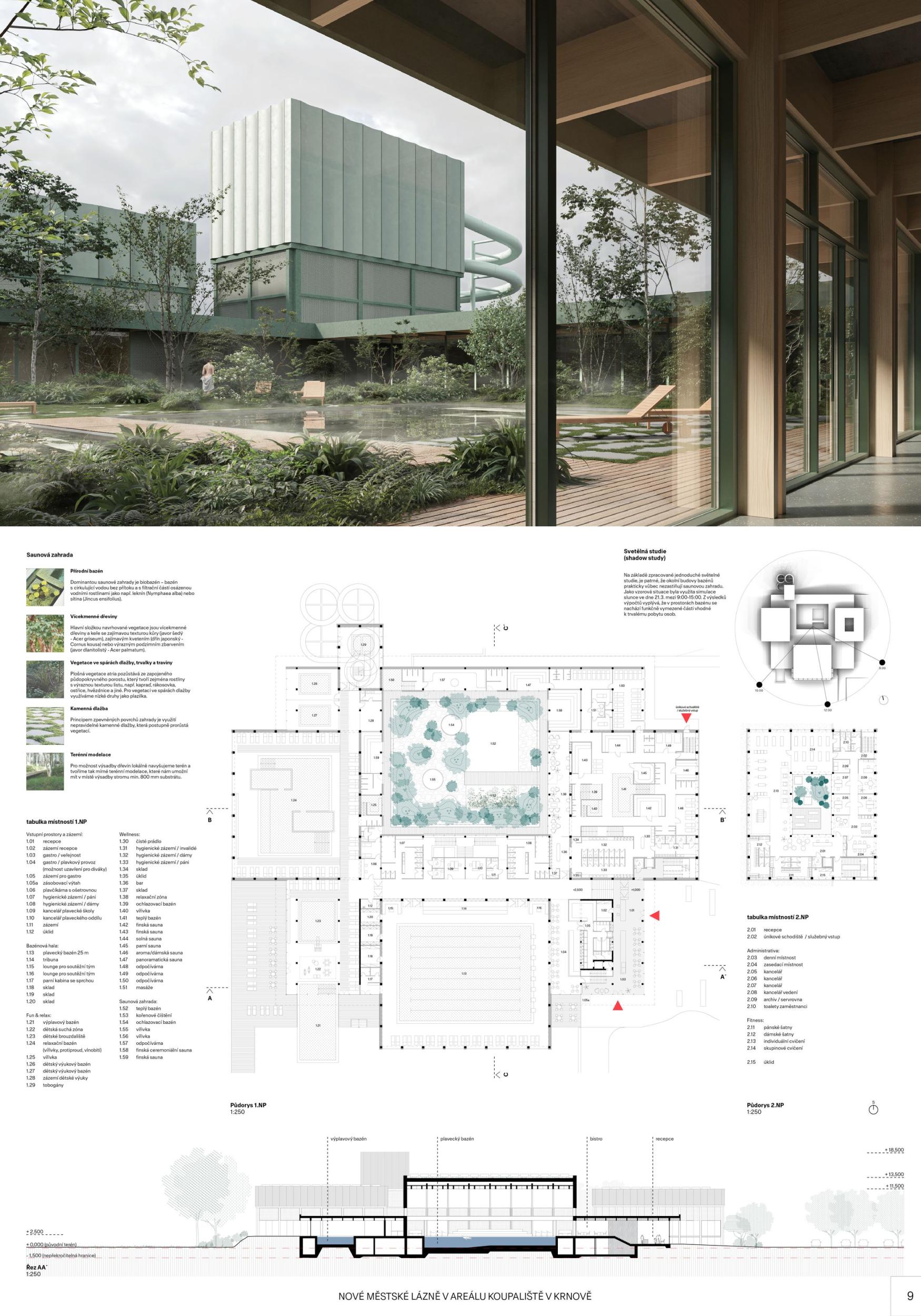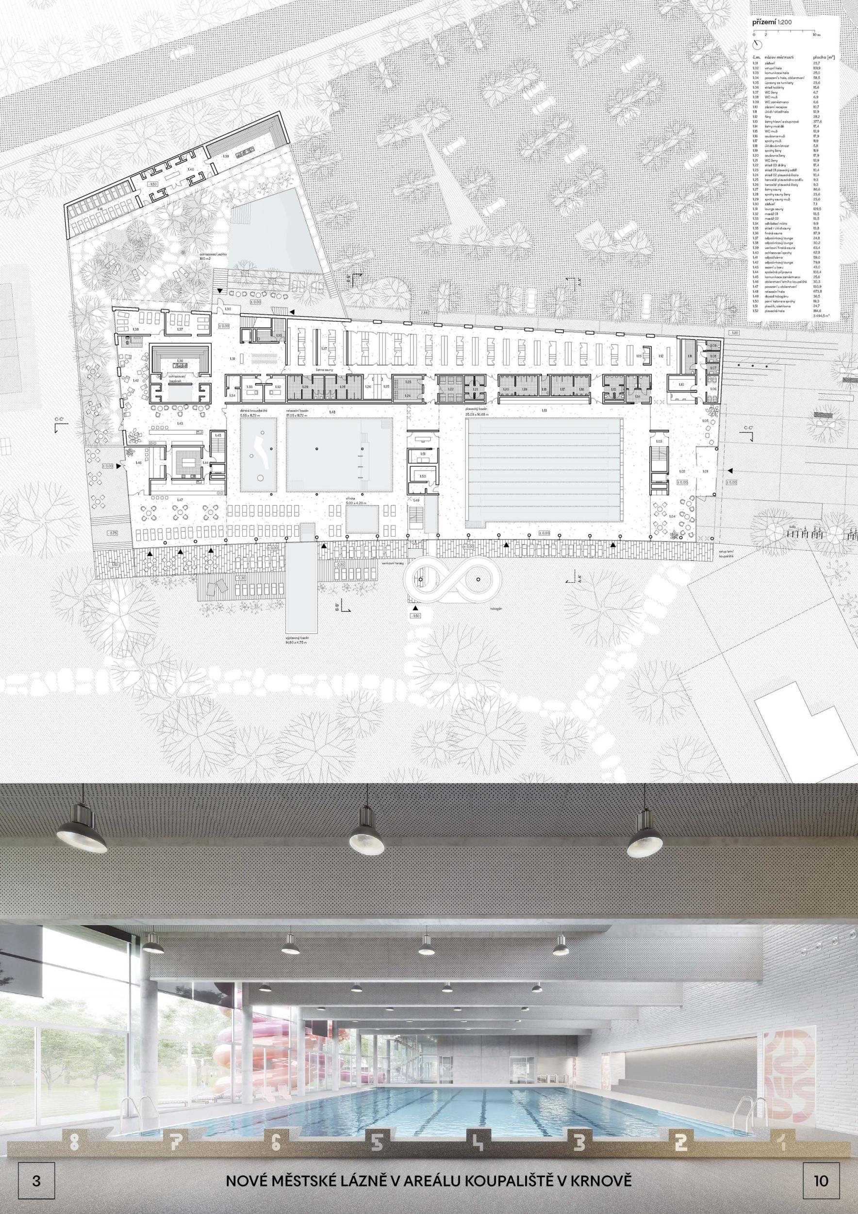 The design considers multiple layers in both landscape scale and detail and is unique in its strong urban design concept. Landscaped in a unique way, the space of the "spa park" has a relaxed, natural, pleasant feel. It leaves maximum open space for a common park and unifies the swimming pool and pool area, the connection between the two parts of the site is synergistic, opening to the south along the entire length of the site. The dialogue with the river Opavice is also positive. Here, it would not be necessary to stick to a single bank solution. The location of the new building in the northern part has created a green pocket, which is the biggest benefit of the proposal. The house is operationally clear and legible. The jury appreciates the location of the pool halls to the park and the maximum visitor contact within the site. The compactness and conciseness of the design also work with the subtle curvature of the plan, the light and the structure of the house. The expression of the house, on the other hand, is rather schematic and this, together with the solution to the western corner, weakens the overall concept. A sense of spa-like intimacy may be lacking. Slight mistrust is raised by the timber trees on the roof structures (their size in relation to the strength of the plant substrate).
