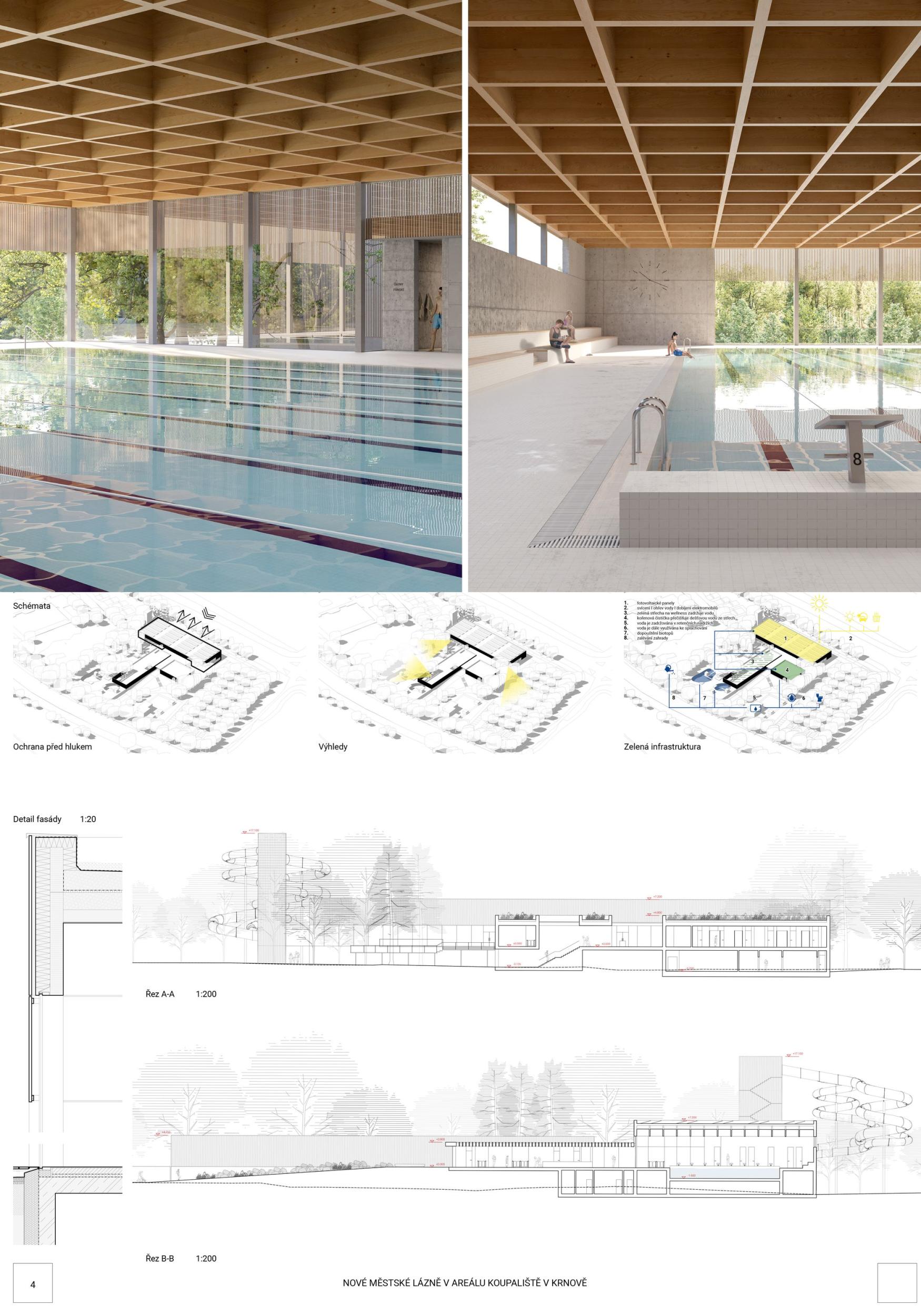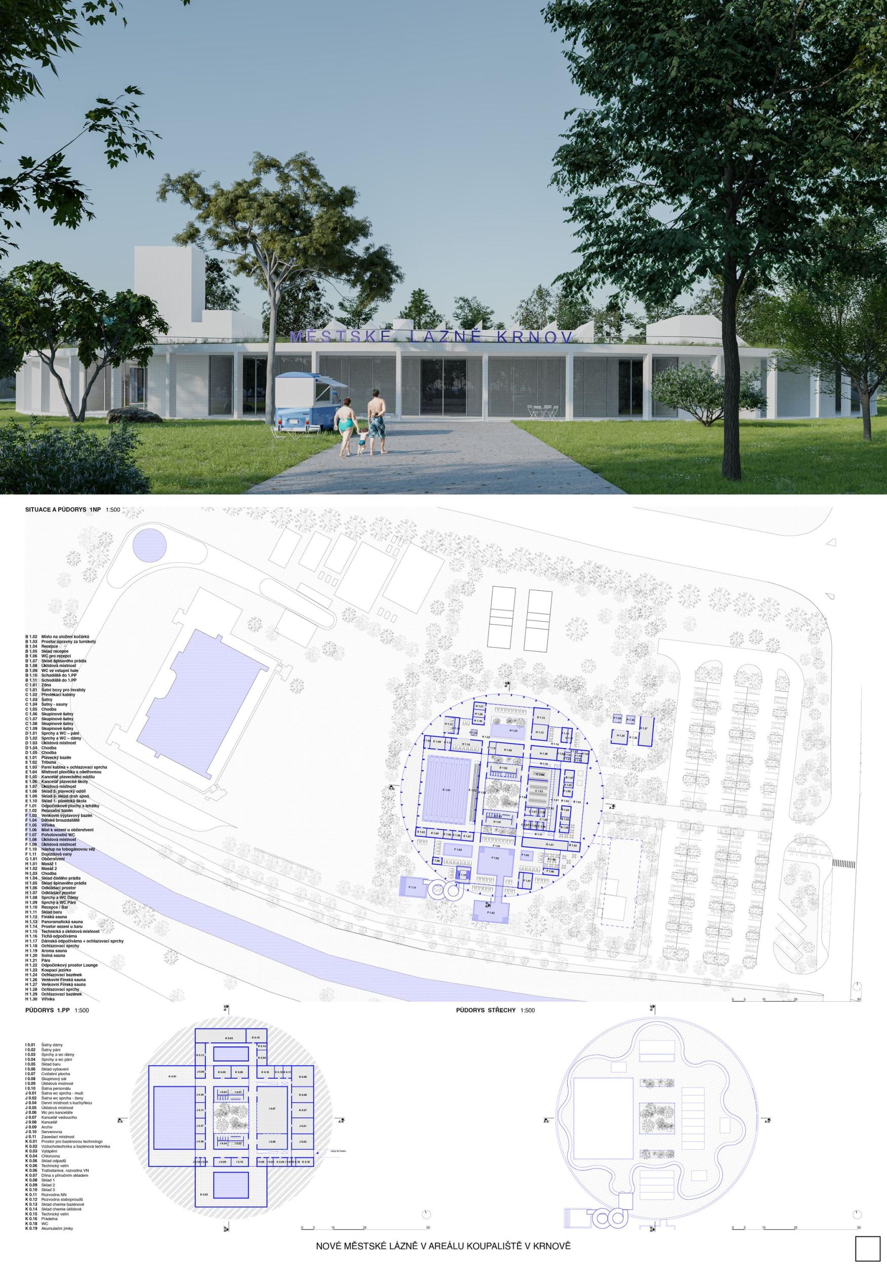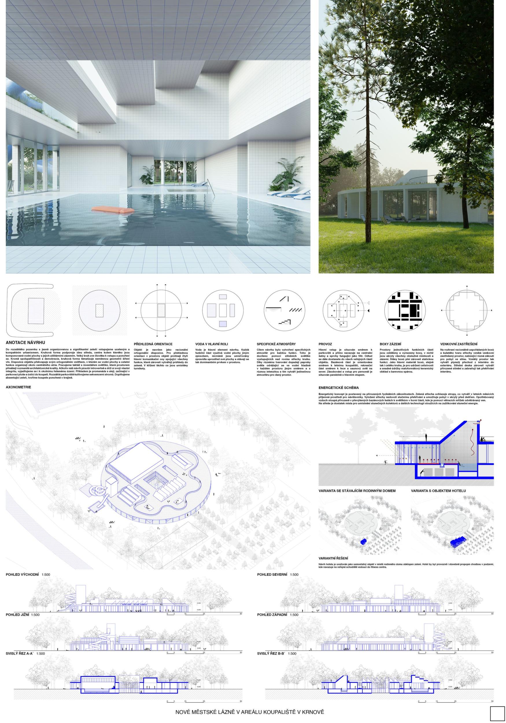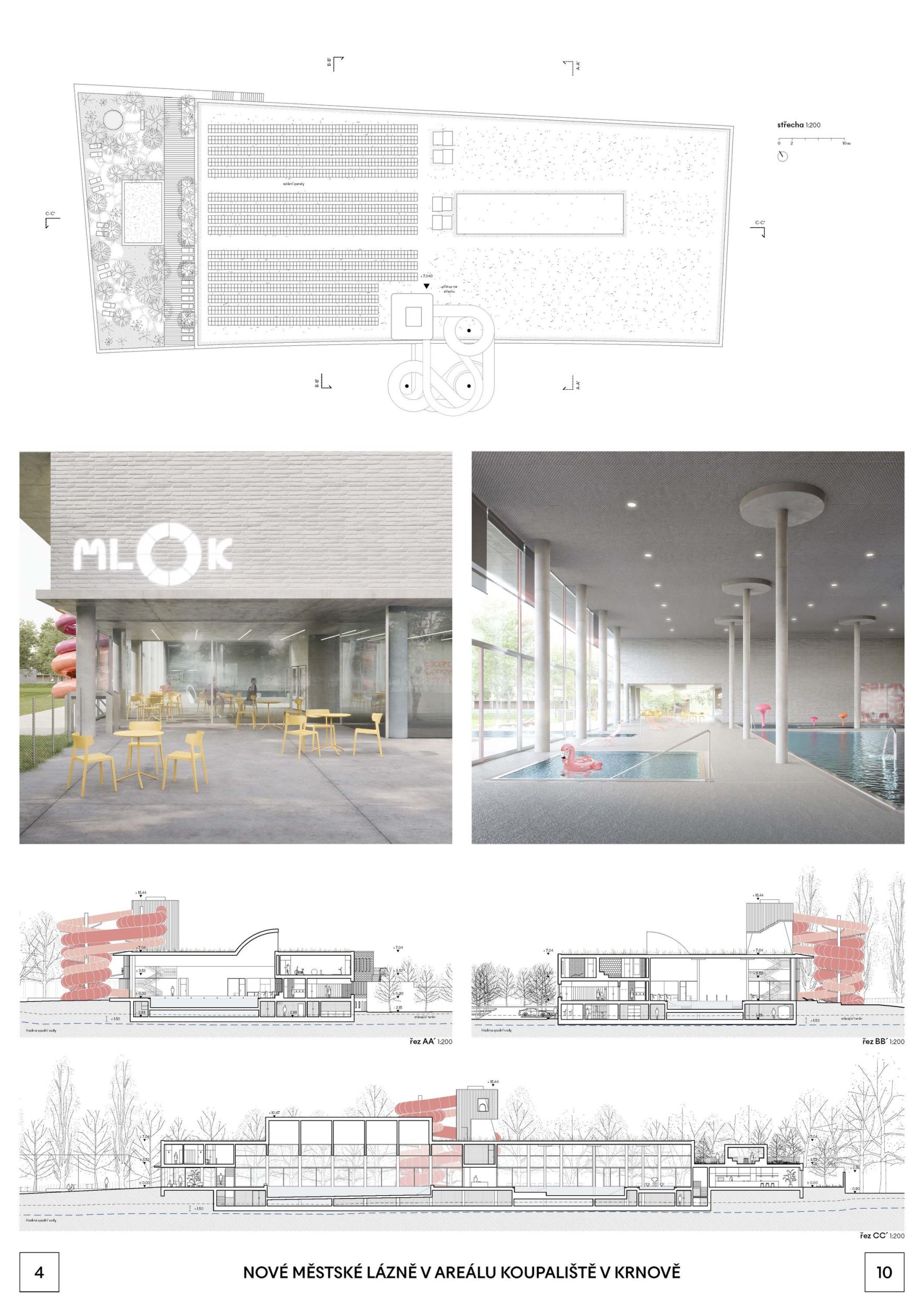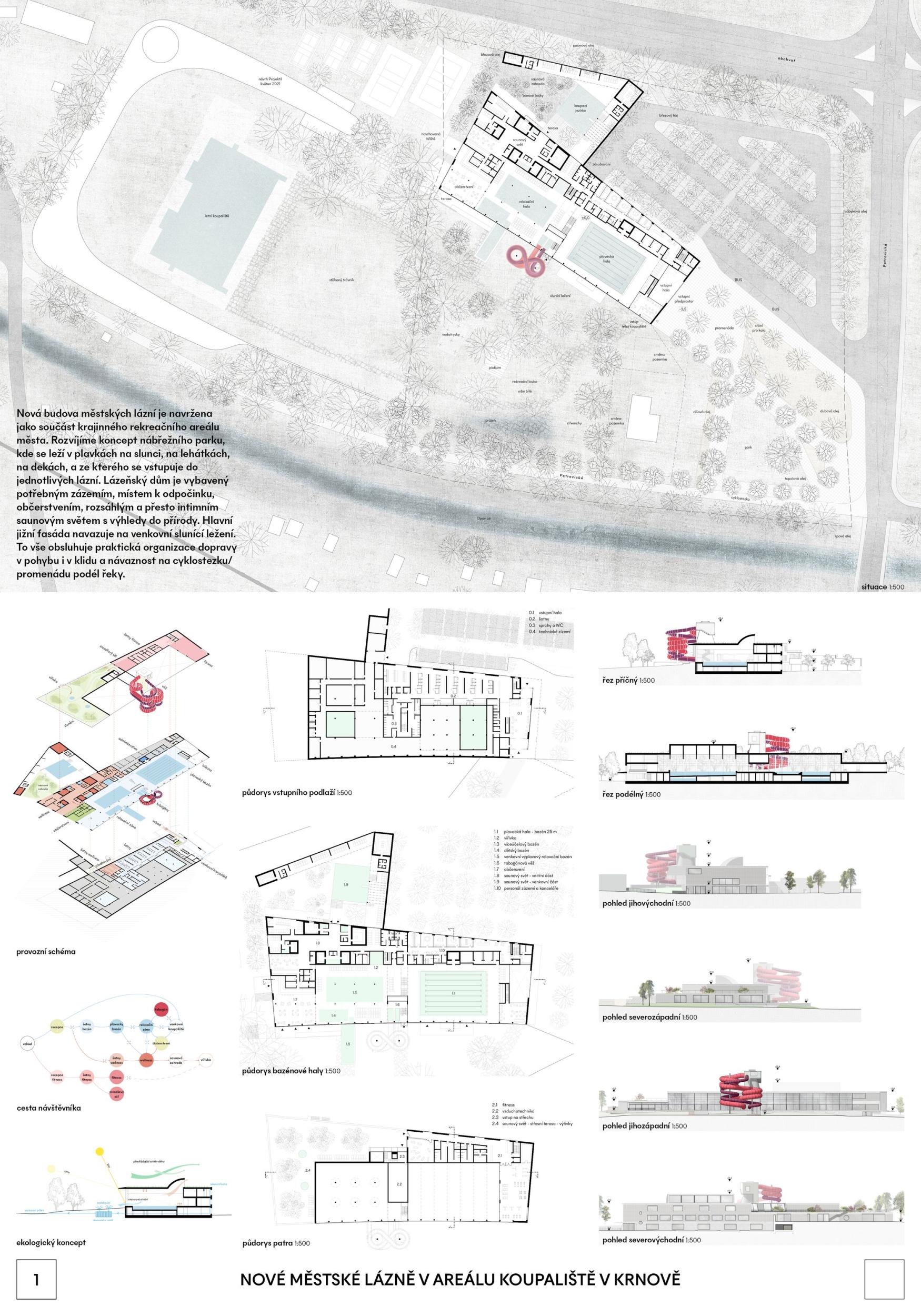 The design considers multiple layers in both landscape scale and detail and is unique in its strong urban design concept. Landscaped in a unique way, the space of the "spa park" has a relaxed, natural, pleasant feel. It leaves maximum open space for a common park and unifies the swimming pool and pool area, the connection between the two parts of the site is synergistic, opening to the south along the entire length of the site. The dialogue with the river Opavice is also positive. Here, it would not be necessary to stick to a single bank solution. The location of the new building in the northern part has created a green pocket, which is the biggest benefit of the proposal. The house is operationally clear and legible. The jury appreciates the location of the pool halls to the park and the maximum visitor contact within the site. The compactness and conciseness of the design also work with the subtle curvature of the plan, the light and the structure of the house. The expression of the house, on the other hand, is rather schematic and this, together with the solution to the western corner, weakens the overall concept. A sense of spa-like intimacy may be lacking. Slight mistrust is raised by the timber trees on the roof structures (their size in relation to the strength of the plant substrate).