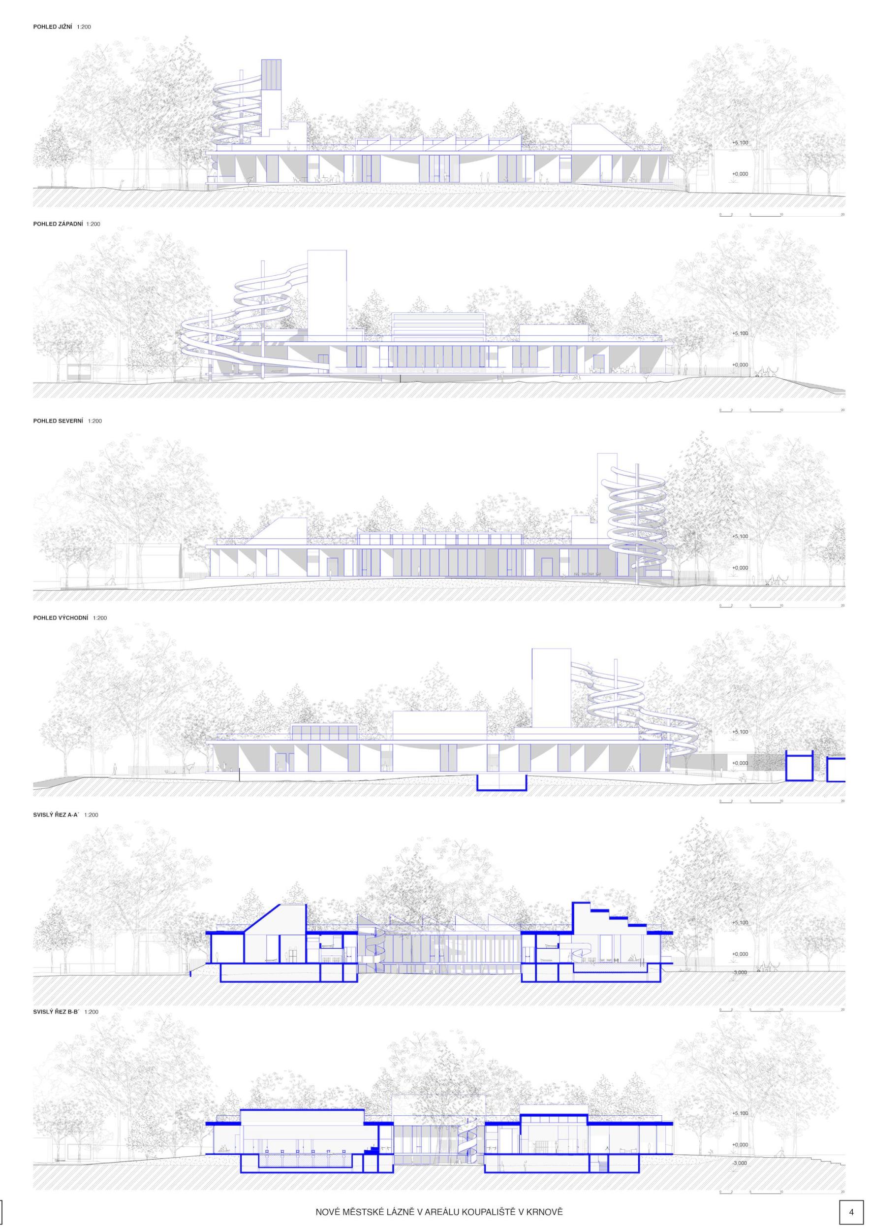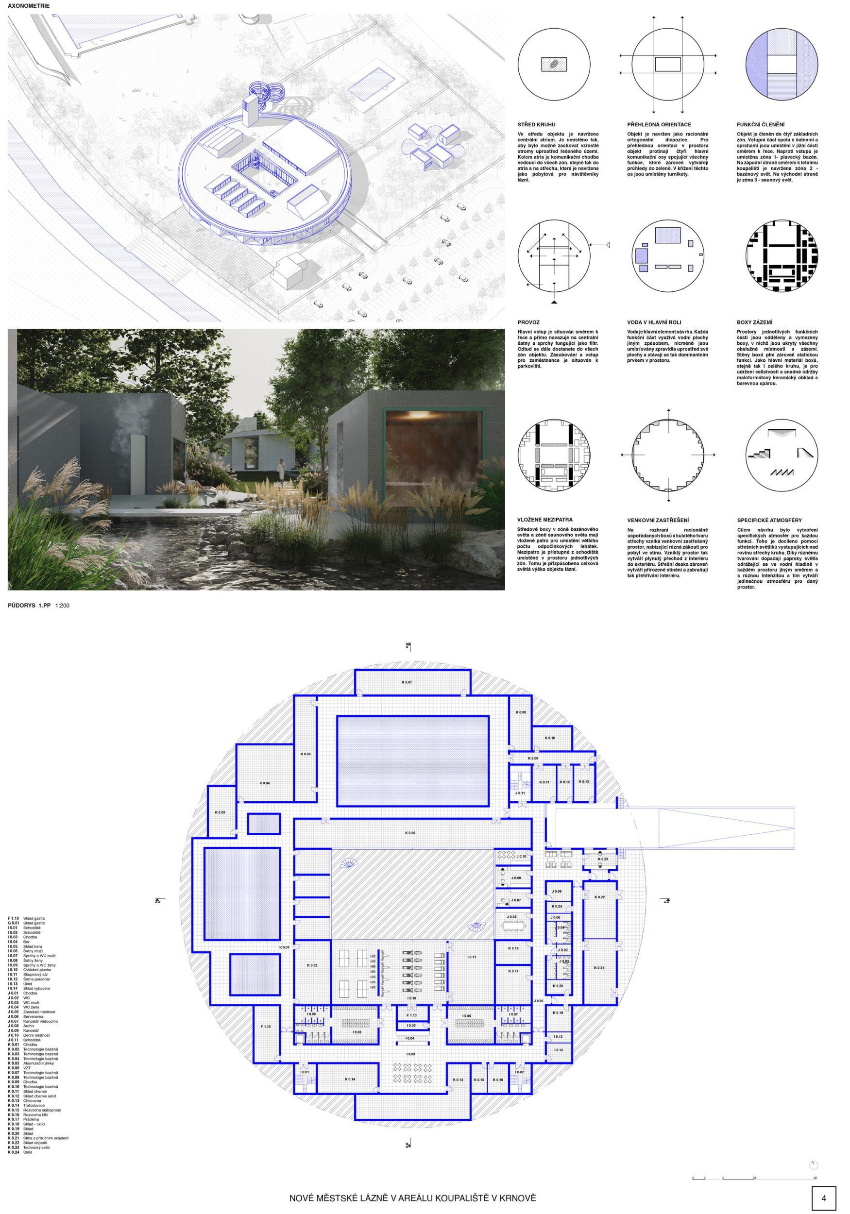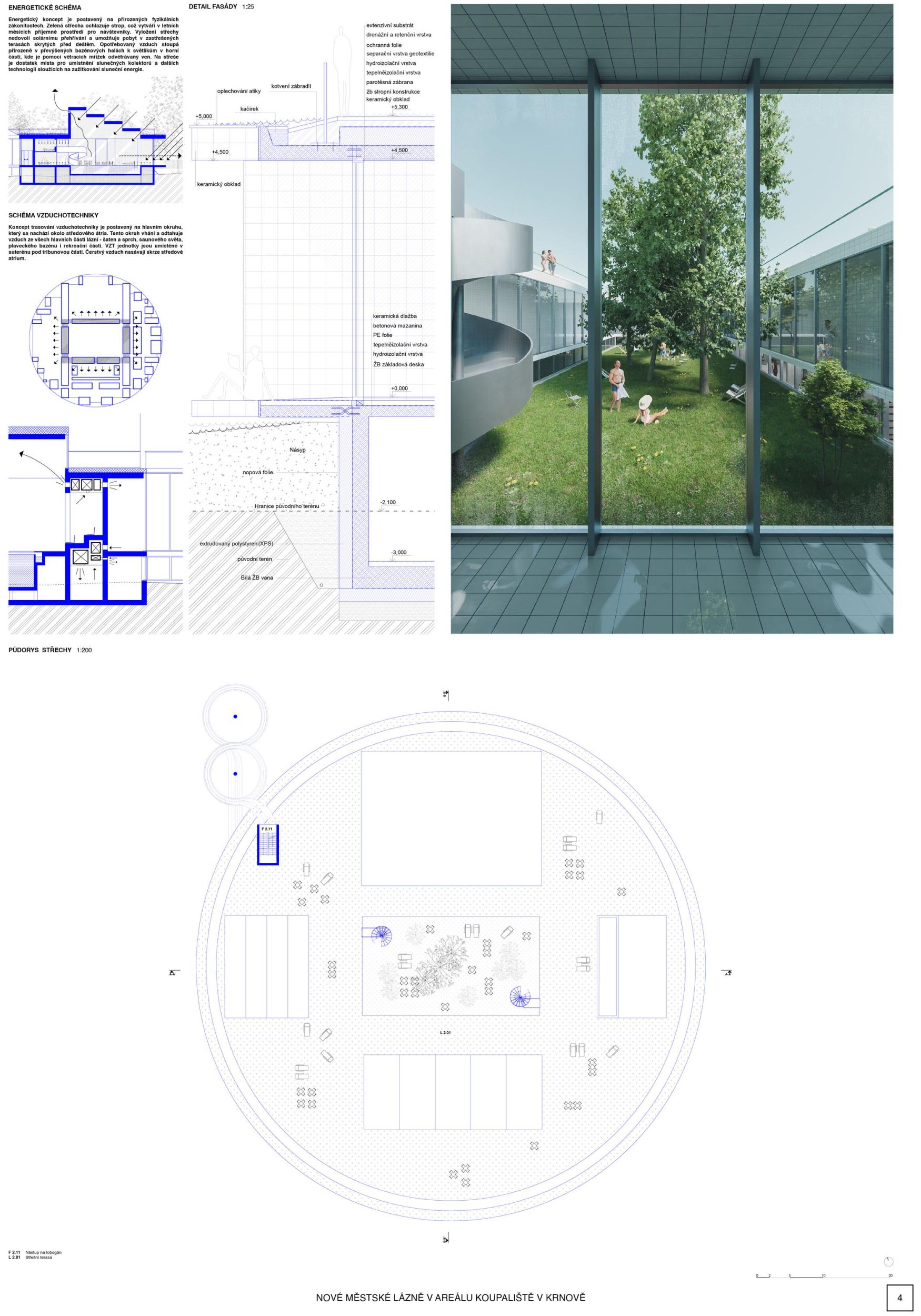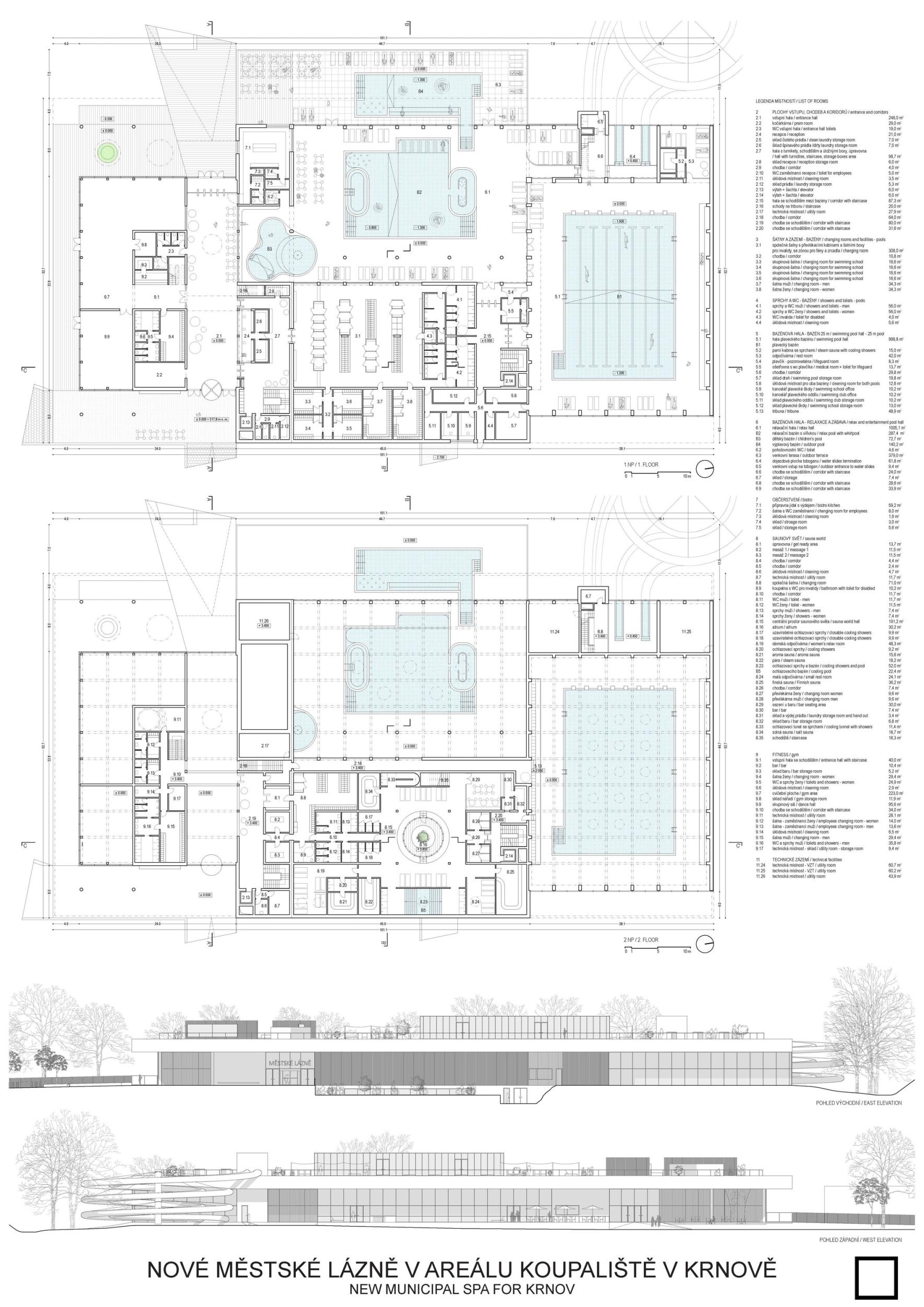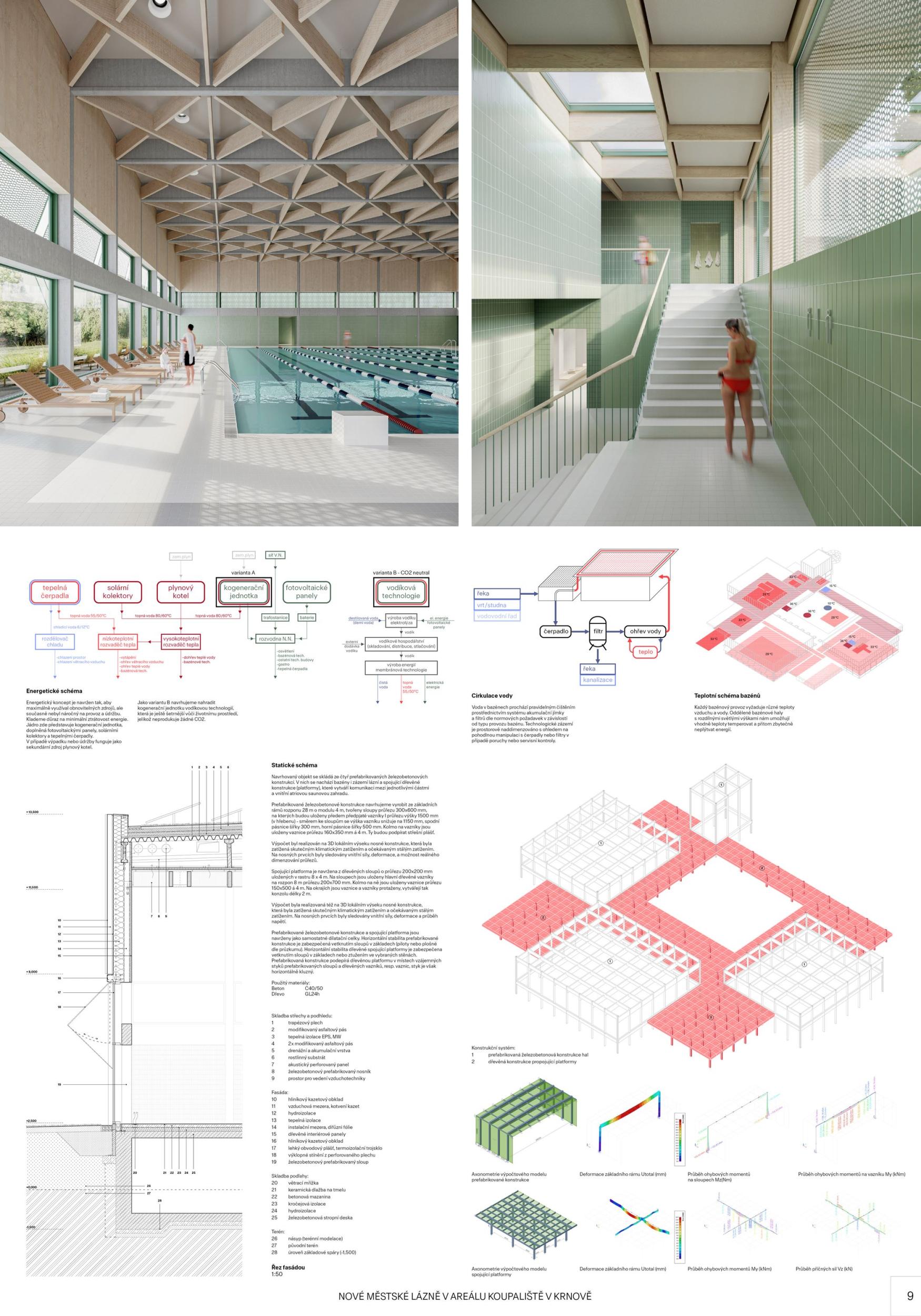 The design considers multiple layers in both landscape scale and detail and is unique in its strong urban design concept. Landscaped in a unique way, the space of the "spa park" has a relaxed, natural, pleasant feel. It leaves maximum open space for a common park and unifies the swimming pool and pool area, the connection between the two parts of the site is synergistic, opening to the south along the entire length of the site. The dialogue with the river Opavice is also positive. Here, it would not be necessary to stick to a single bank solution. The location of the new building in the northern part has created a green pocket, which is the biggest benefit of the proposal. The house is operationally clear and legible. The jury appreciates the location of the pool halls to the park and the maximum visitor contact within the site. The compactness and conciseness of the design also work with the subtle curvature of the plan, the light and the structure of the house. The expression of the house, on the other hand, is rather schematic and this, together with the solution to the western corner, weakens the overall concept. A sense of spa-like intimacy may be lacking. Slight mistrust is raised by the timber trees on the roof structures (their size in relation to the strength of the plant substrate).