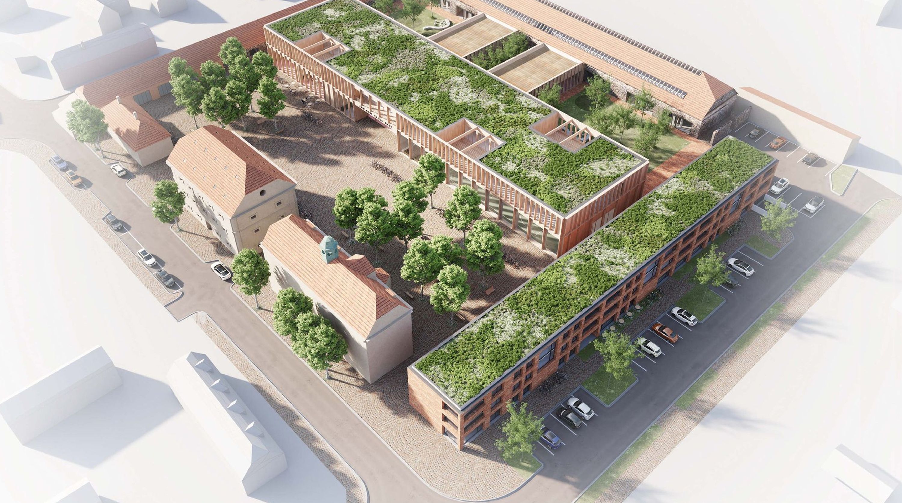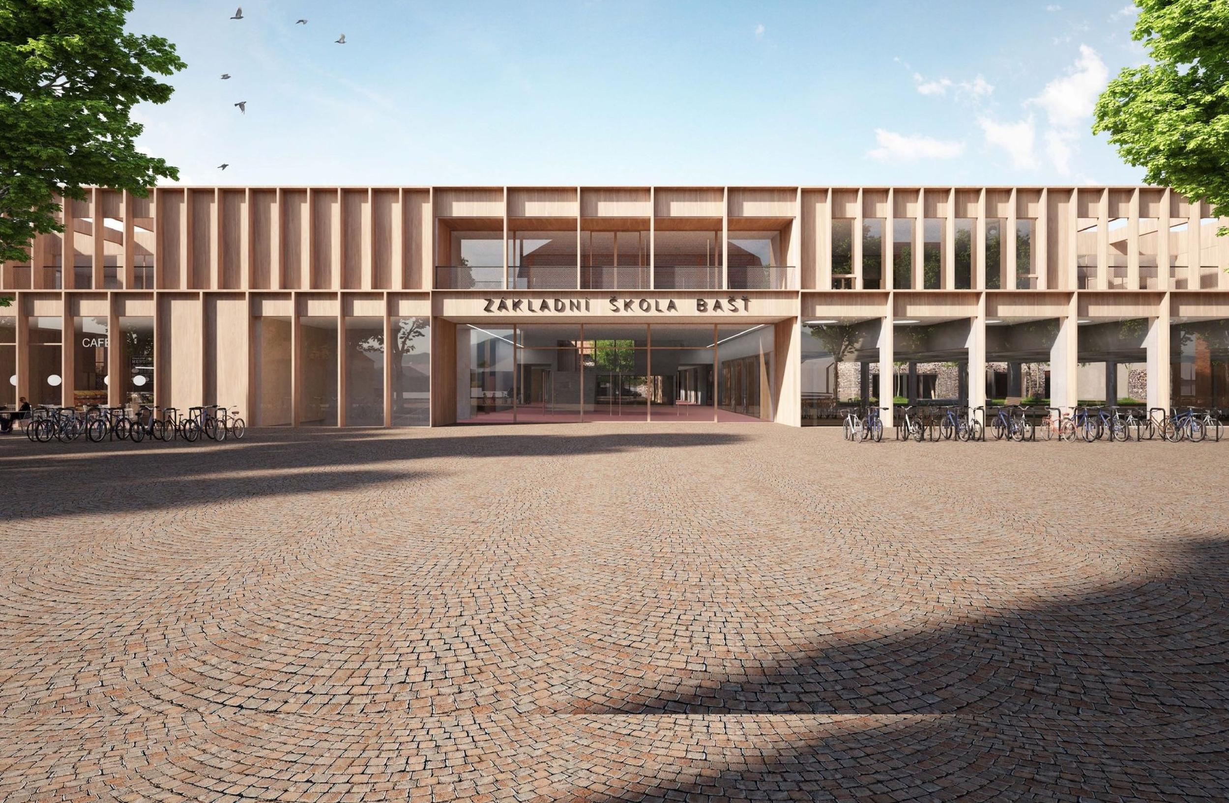 The subject of the competition was the design of a new building of a primary school and other new buildings for the municipality, where spaces for small businesses and services will be created on the ground floor and municipal flats on the upper floors, including alterations to public space, i.e. a new village square.