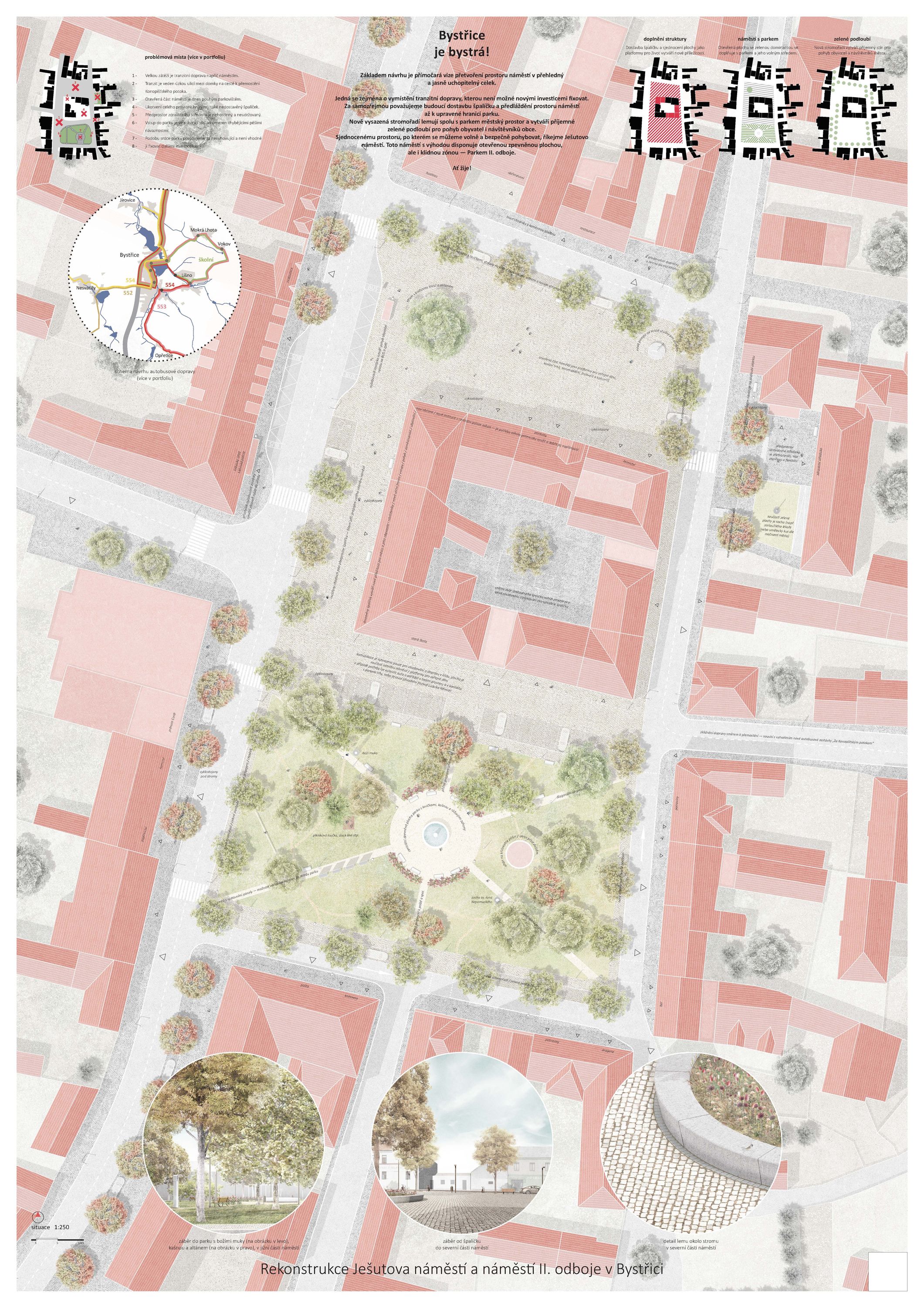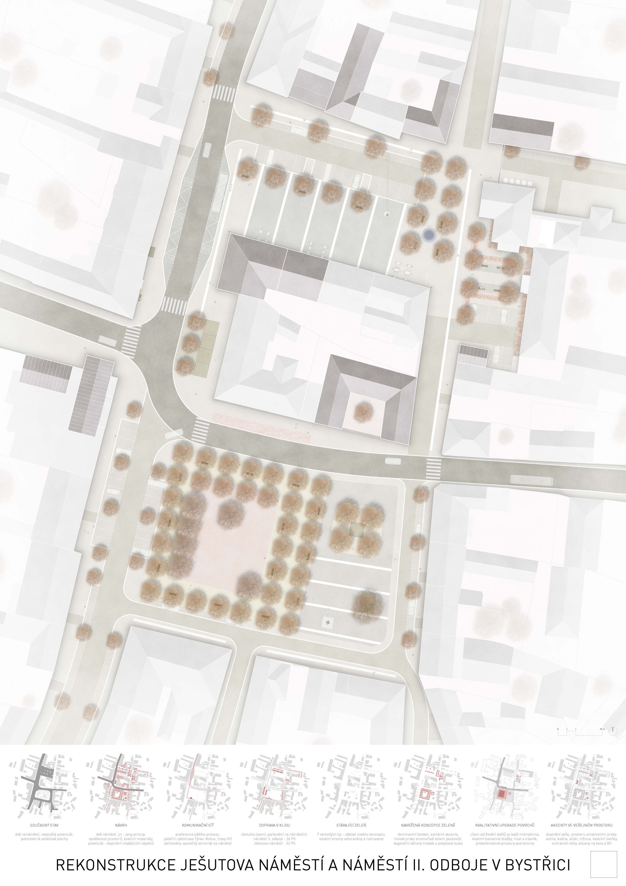 A convincing, complex, and unifying solution of both parts of the square, material solution of missing volumes (sensitive completion of the blocks), adequate content of individual spaces, thoughtful topography. The greenery concept is professionally based, confirms the existing high-quality mature trees, and establishes a new landscape composition. Happy is also the new location of the statue of St. Jan Nepomucký. We like the detail of the compositional division of the paving. Functionally, it is necessary to highlight the transport solution, realistic acceptance of the traffic load by road 2nd class, smart traffic solutions at rest, pedestrians' movement, and cyclists. We appreciate the axonometric schemes of variants of use, by which the design is tested from the point of view of spatial organization and graphically well presented. From the point of view of the construction and technical solution, it is possible to highlight rainwater treatment. The surfaces are designed from quality materials; the ratio of paved and unpaved surfaces is optimal.