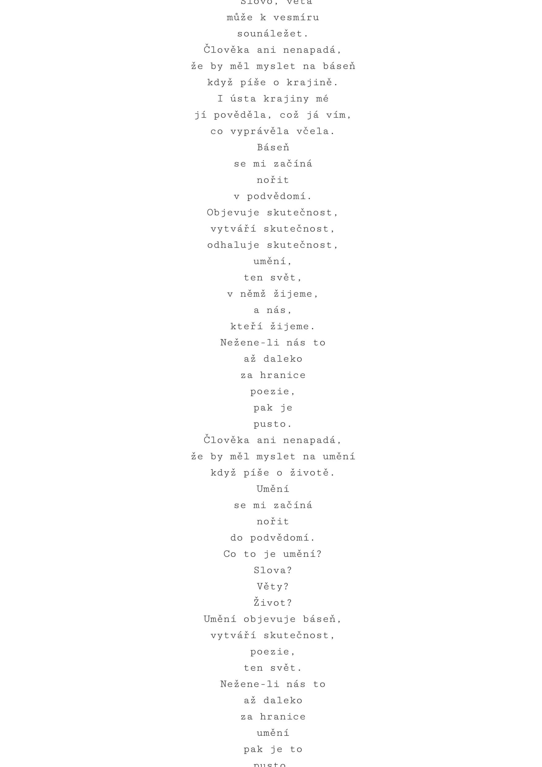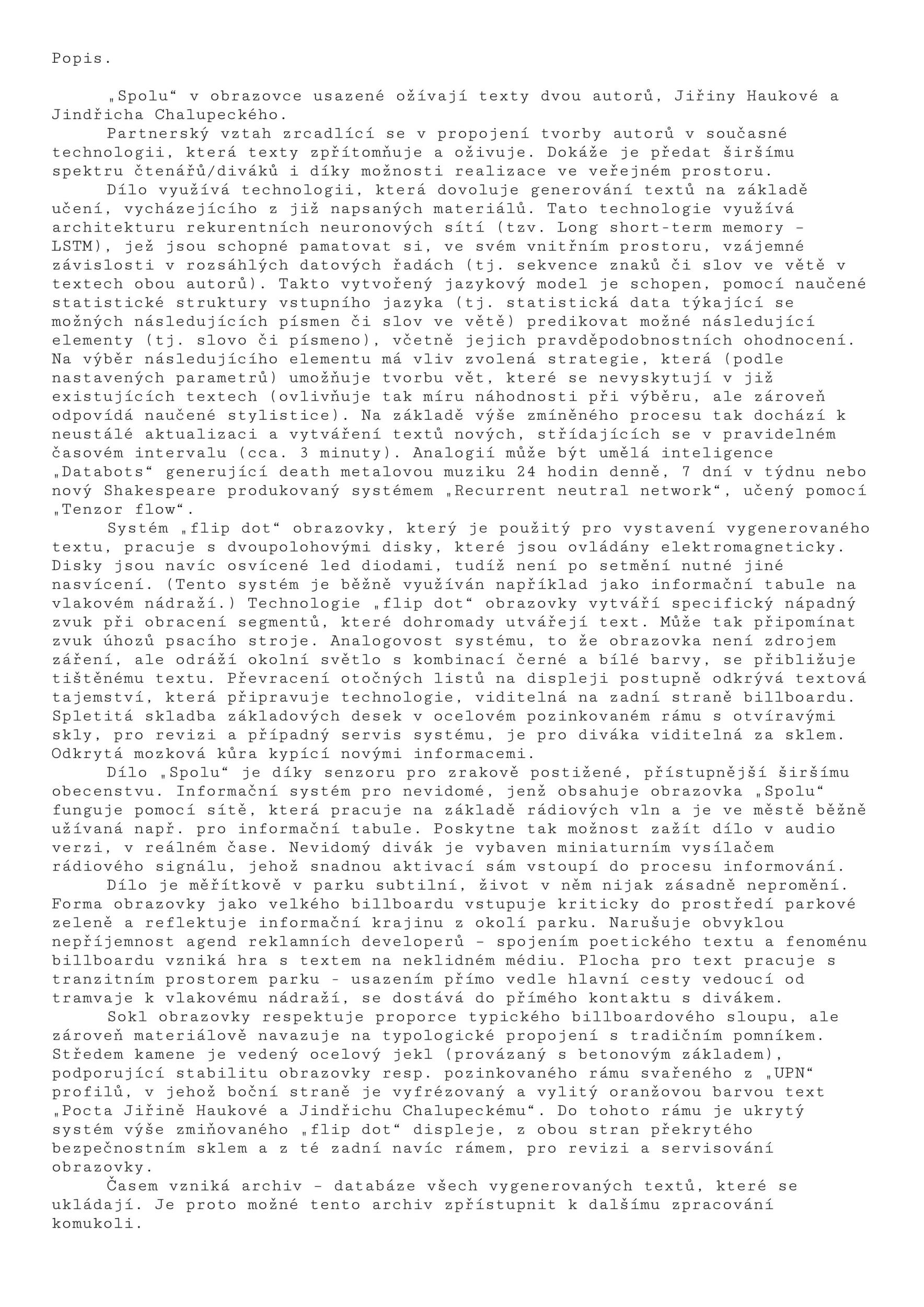 The tribute to Jiřina Hauková and Jindřich Chalupecký is a synthesis of both - "together." It speaks through a new hybrid billboard. Using existing technology, it can create new texts through the texts of both authors. By connecting these two personalities, endless variations of intelligent generated text are born. It is invented by a neural network system, taught by all available texts and archives left behind by both authors. A combination of two approaches to creating written text is created, creating new immortal poetry and ideas that are constantly being updated.