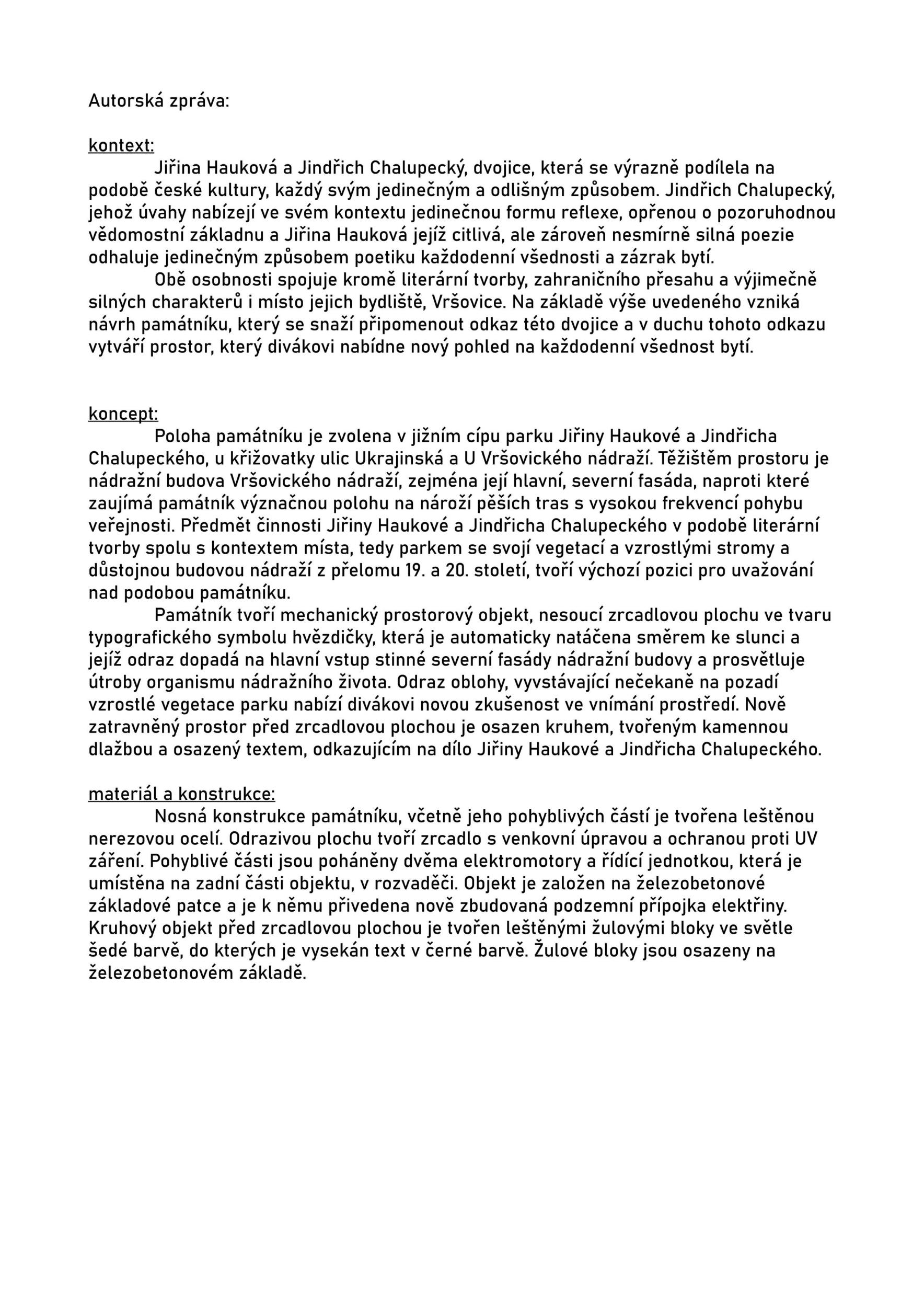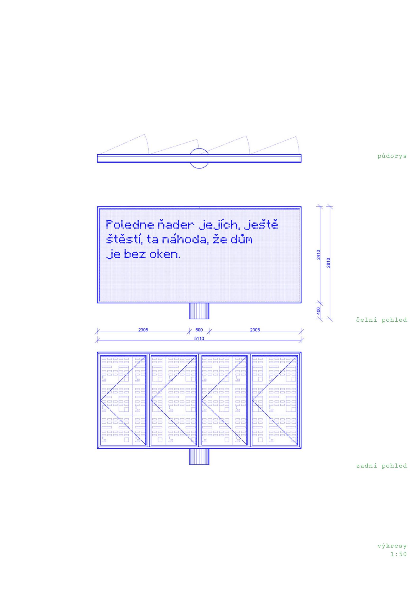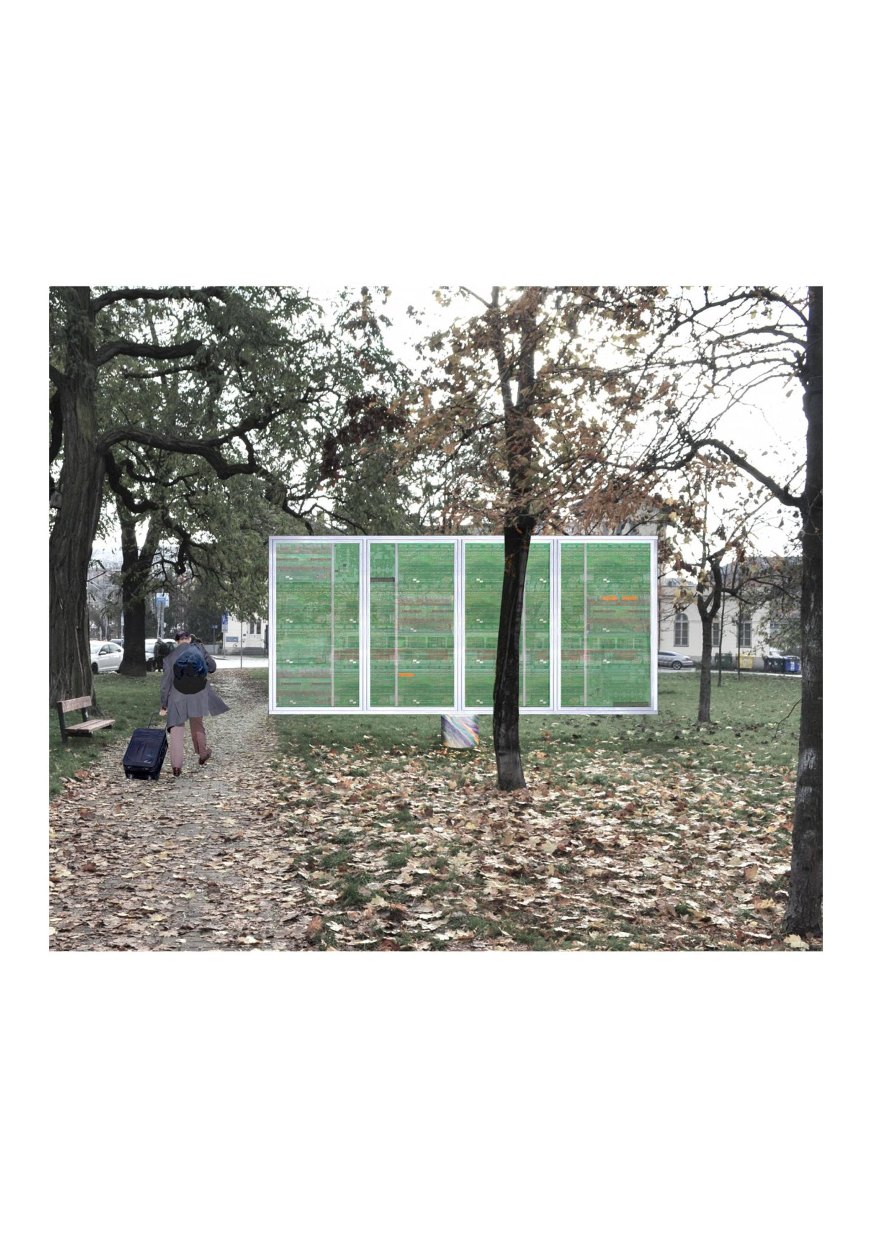 An interesting project of a "hybrid auto-intellectual billboard" - technologically, formally, and content-wise. The automatic generation of new texts corresponds to several current procedures thematizing the limits and possibilities of artificial intelligence and automation (Chalupecký also wrote with some apprehension in his canonical text The World We Live In). An interesting part of the work is the creation of an archive of generated texts. The project works interestingly with the legacy of both authors. It uses a simple display, common for public space, but typically for a nearby train station rather than a park. A kind of living archive based on the generation of new texts using a neural network system relates both authors' work to the present. At the same time, it is an attractive element for the users of the place. Straightforwardly, it also evokes a slightly inappropriate, unpathetic "retro" atmosphere of a kind of drive-in cinema.