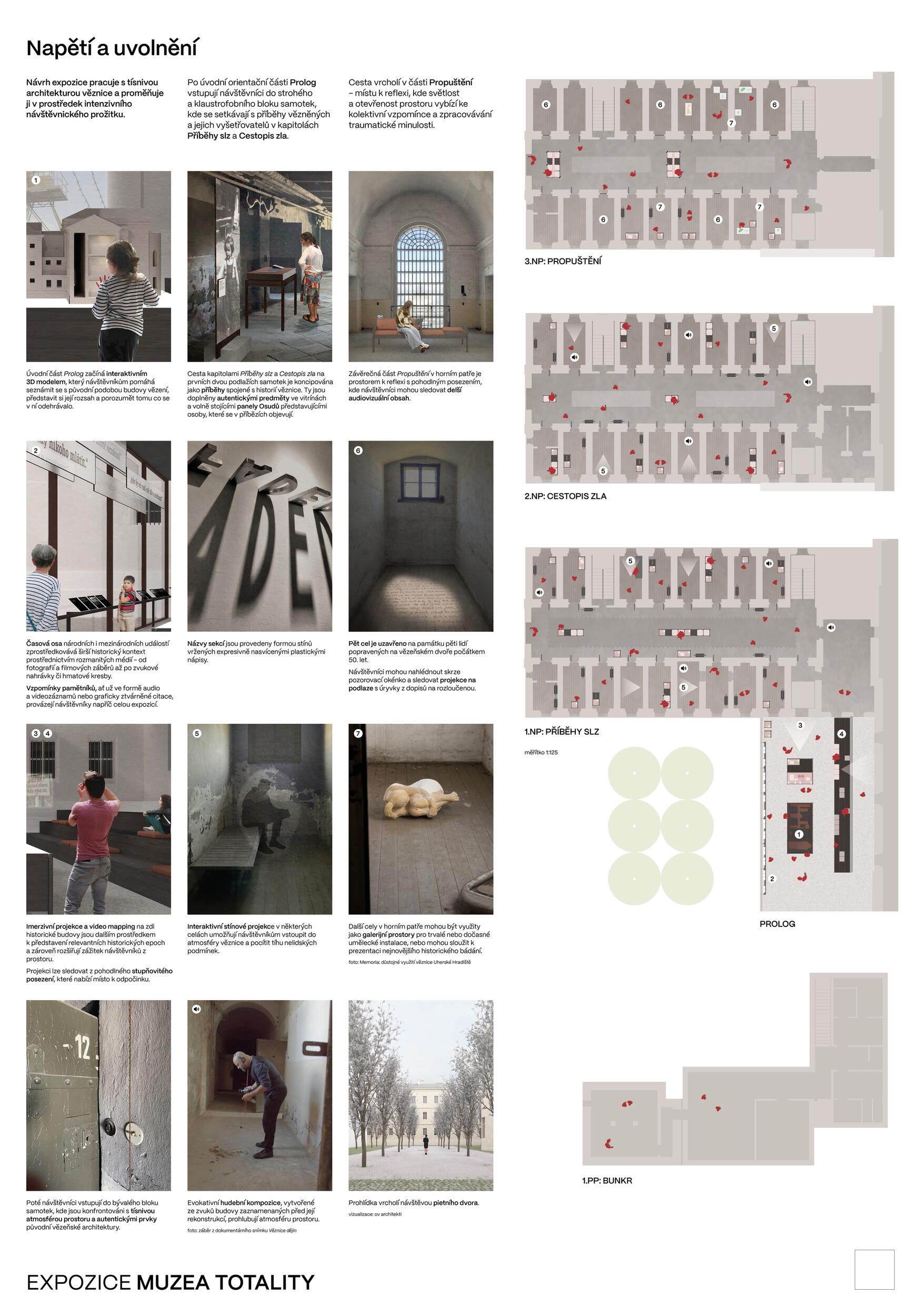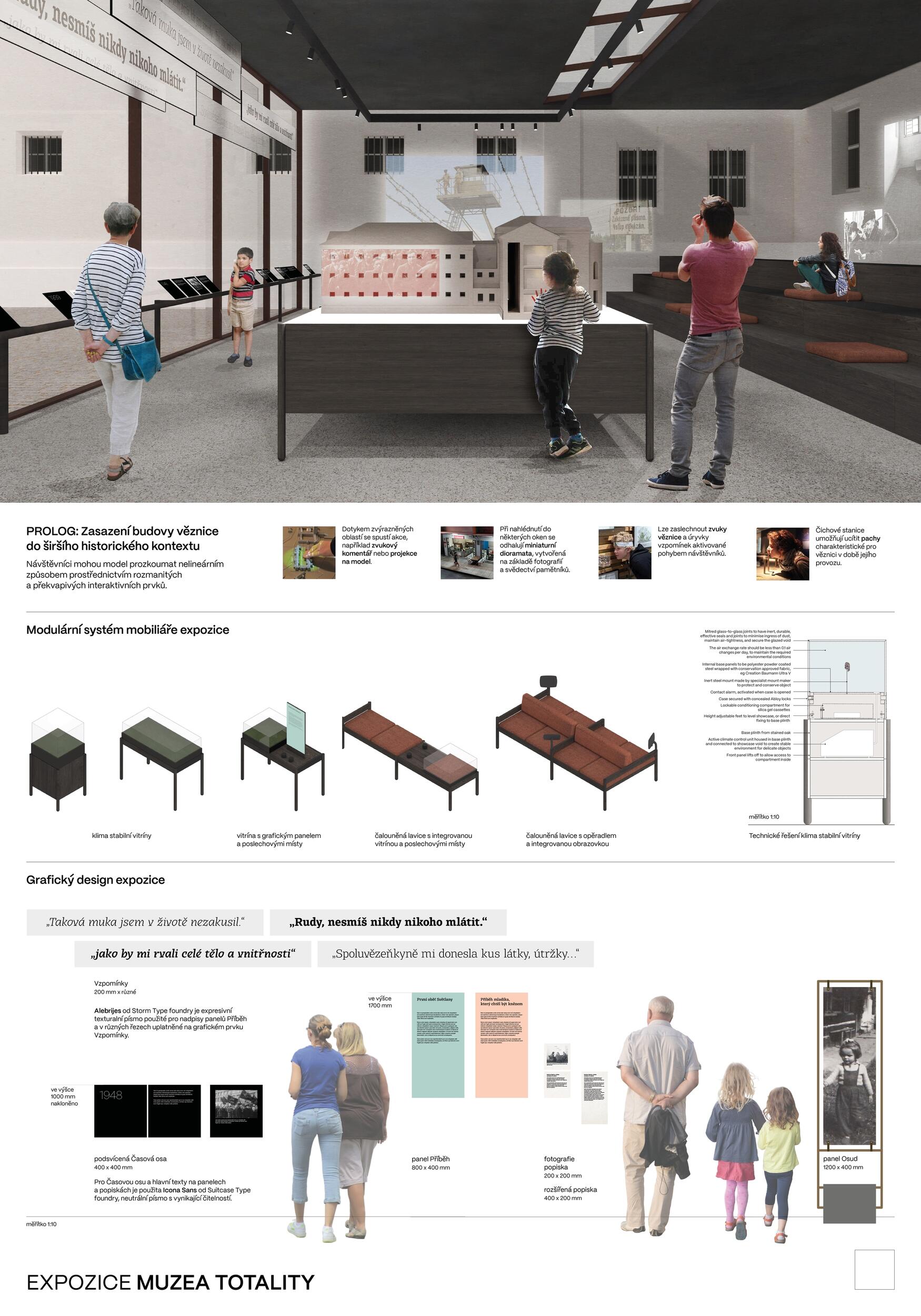 The design presents a dignified and sophisticated concept for a contemporary museum exhibition with a sense of place and the purpose of the institution. Its simple, minimalist, even austere tone emphasises the atmosphere of the prison as a place of suffering and a place for reflection on the history of 20th-century totalitarianism. The exhibition follows the logic of the libretto, works in detail with the material content, and appropriately highlights the fates of individuals in contrast to the bureaucratic repressive apparatus. The modular furniture integrates sufficient opportunities for visitors to rest, including a detailed drawing of climate-stable display cases. The programme proposes sufficient interactive elements for the work of the museum's education department, as well as audiovisual and olfactory attractions. The jury considers the offer of participatory work with the Memoria Association, the Moravian Museum and the local community on the possibility of reflection to be innovative. The graphic design is suitable for all formats of museum texts, including work with image materials, quotations, captions, and 3D typography. A point of discussion was the scope of architectural modifications to the existing renovated state and the possibility of restoring the prison's inner courtyard. The restoration of the galleries and partial connection via "bridges" with resting elements is indicated but not elaborated. The jury would consider it appropriate to examine this in the context of the construction modifications to the museum and the building as a whole.
