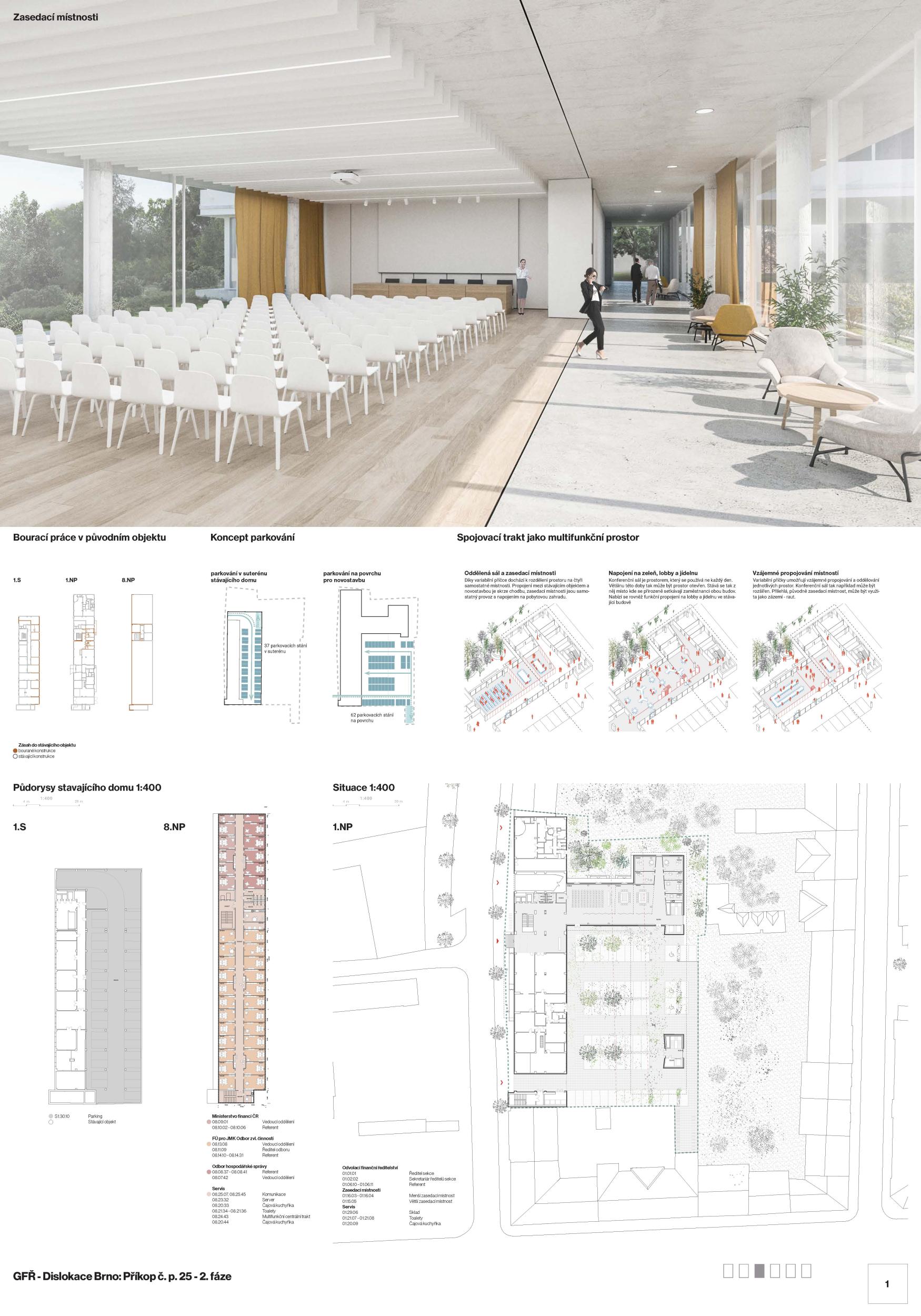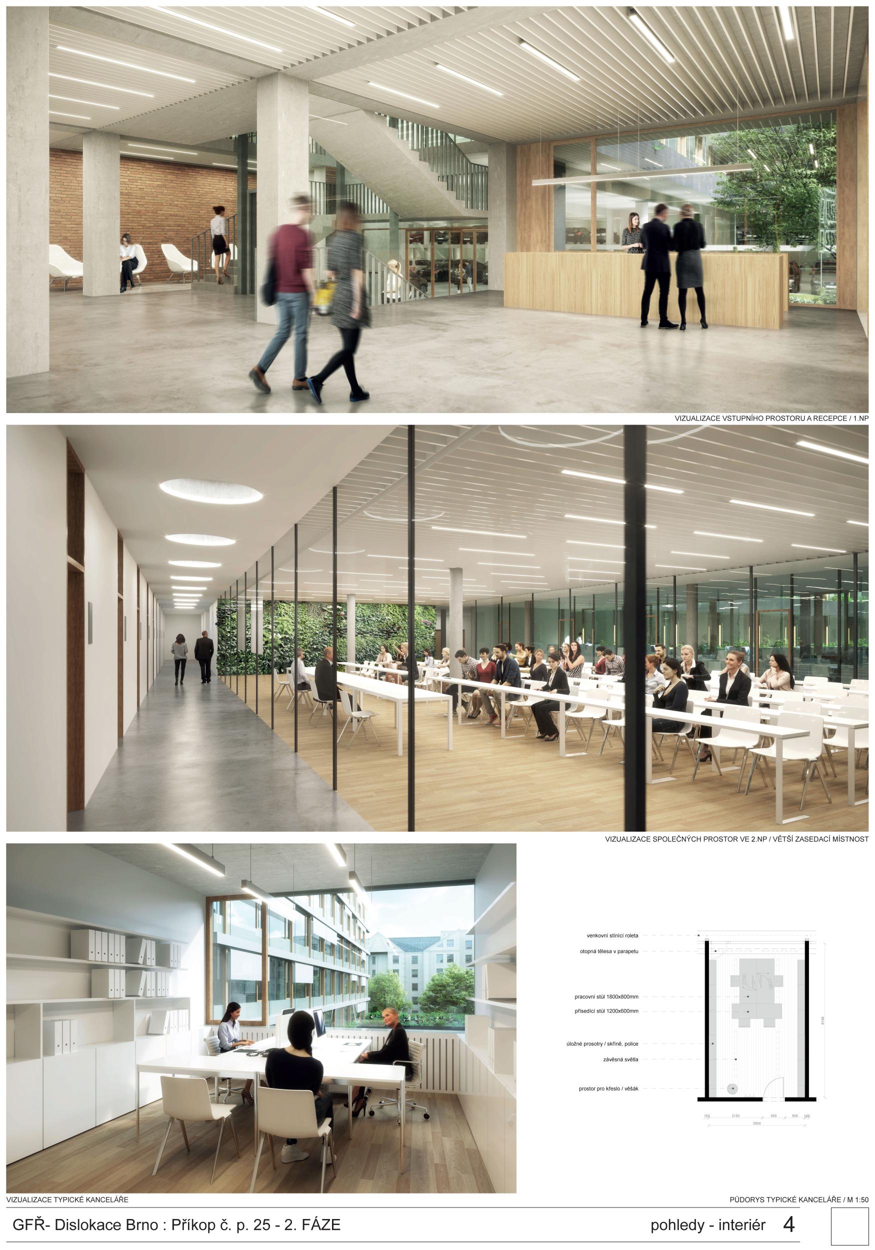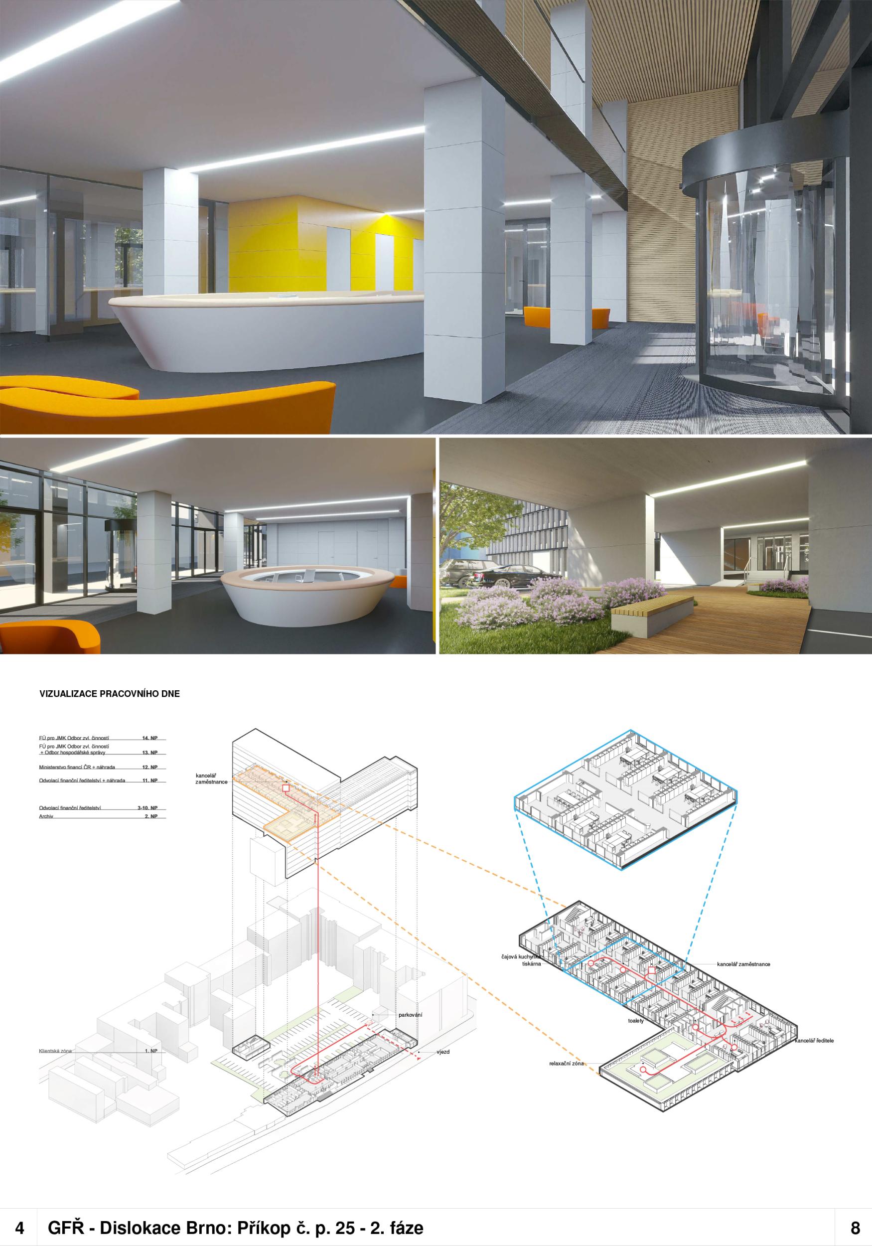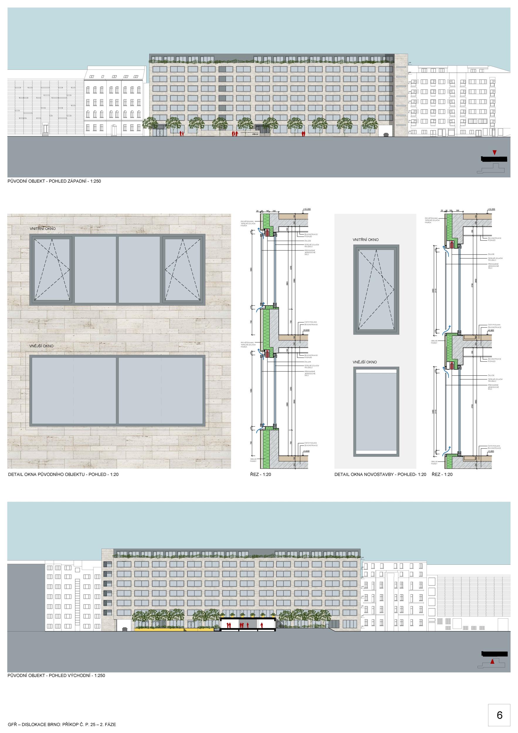 The extension has a common base at the level of the second above-ground story on the entire plot - this defines the block of new development. Above this horizontal mass, there are two 5 and 7 story parts. Both buildings are architecturally designed analogously - along the perimeter there are horizontal concrete ceiling slabs, between which are horizontal strips of windows with a regular grid of wooden windows and vertical guides of shade blinds. The common base is a fixed base with a horizontal window, the roof of the base is a rest area of the tax office staff with terraces and greenery. Part of the base is an outdoor atrium with greenery and garden furniture. Below, there are floors with parking spaces designed as an outdoor space, the facade of the parking floors is designed as a transparent steel network with climbing greenery. We designed a new facade for the original building that respects the current proportions and rhythm of the windows. The original monolithic mass was divided into two parts by recessed vertical strip in the place of stairs and elevators. The facade is lined with a durable and maintenance-free ceramic band, the windows are wooden.