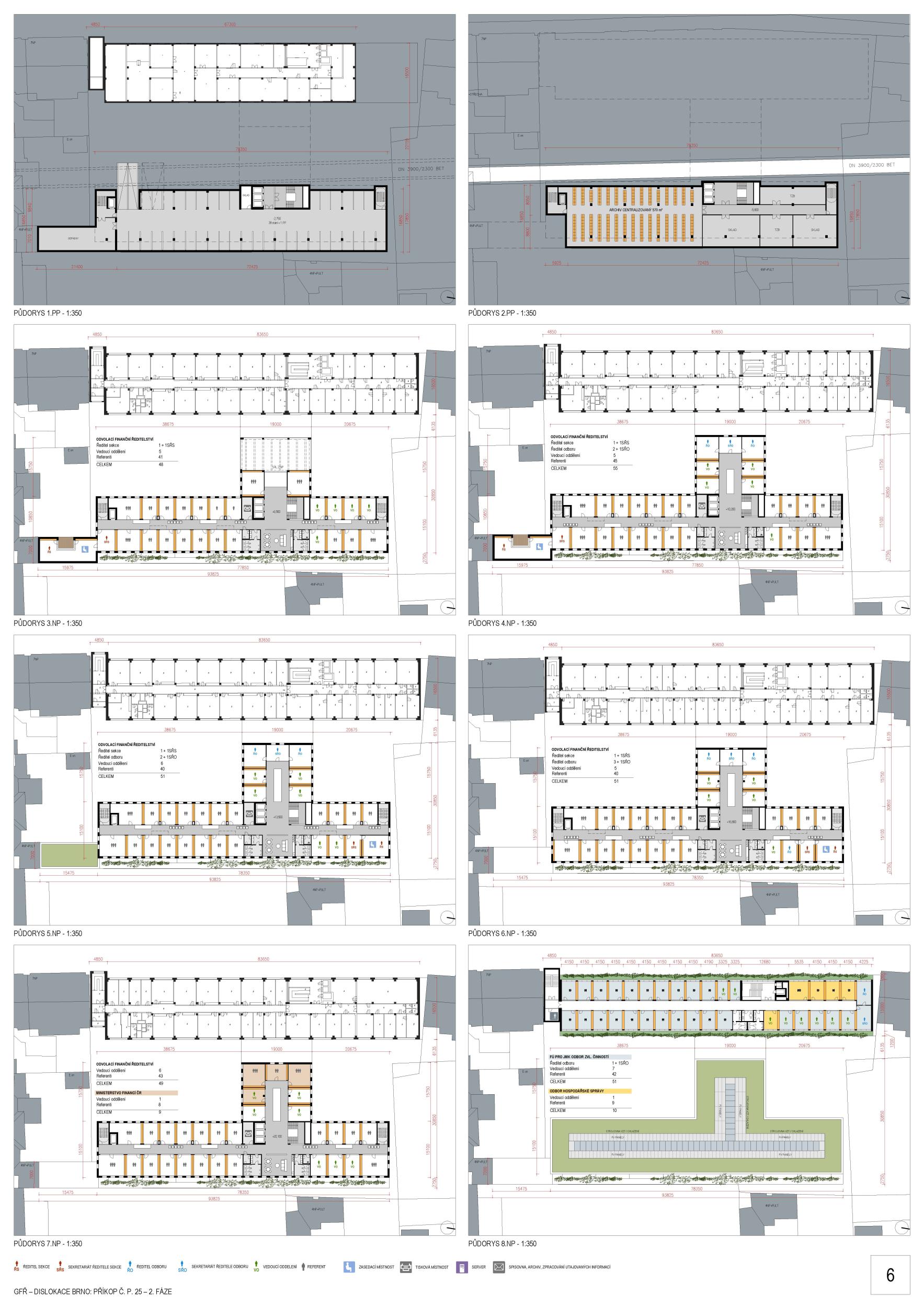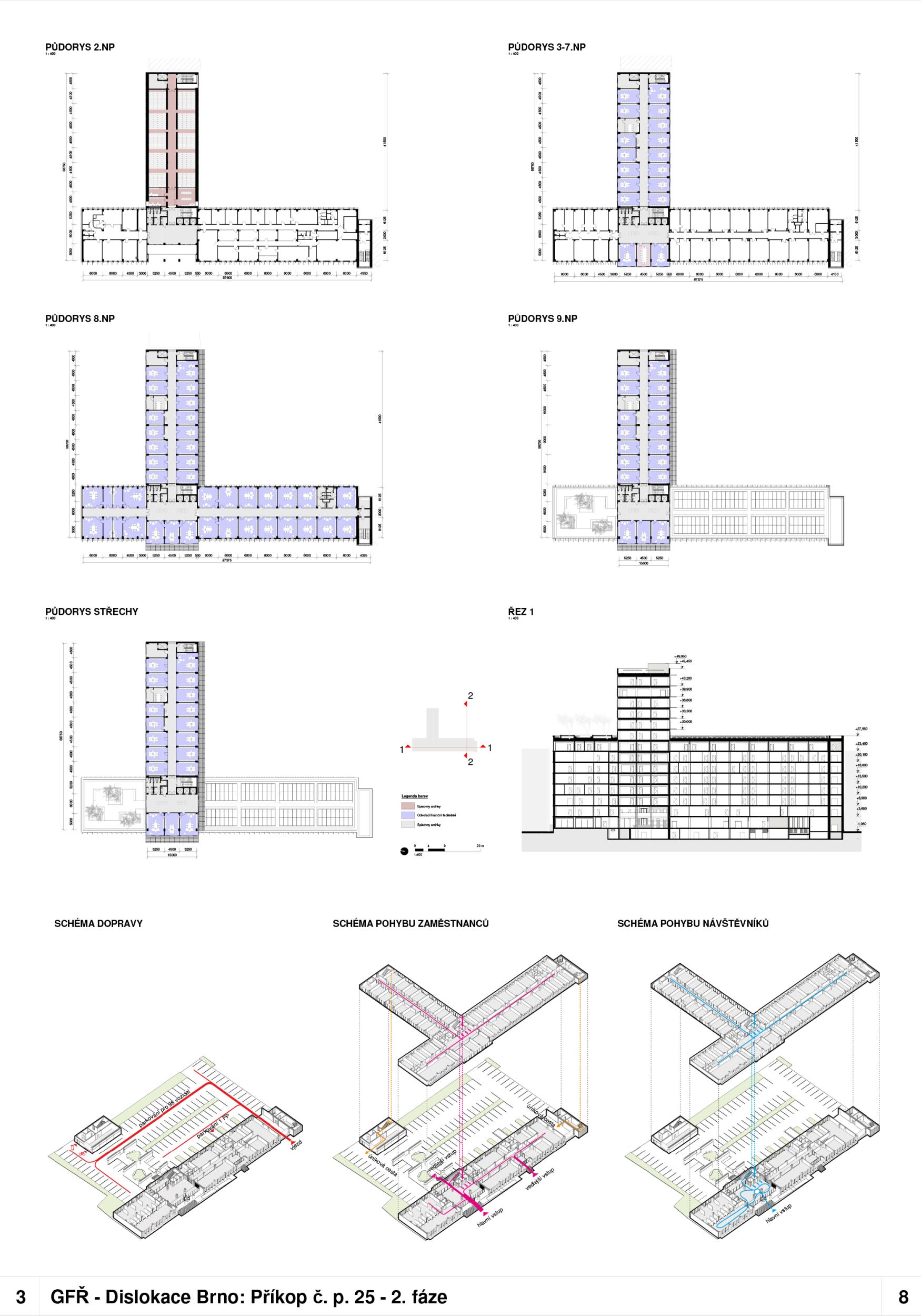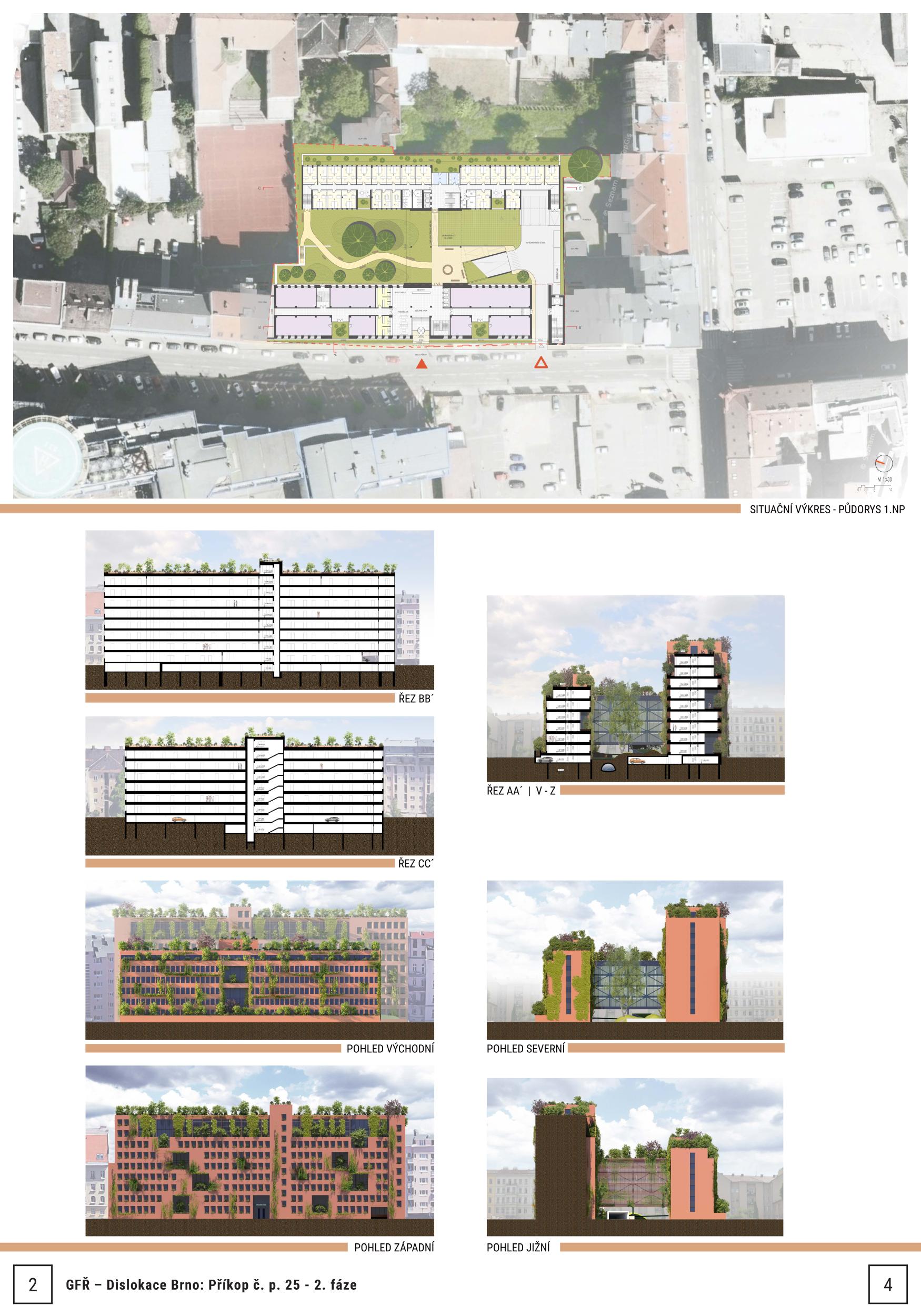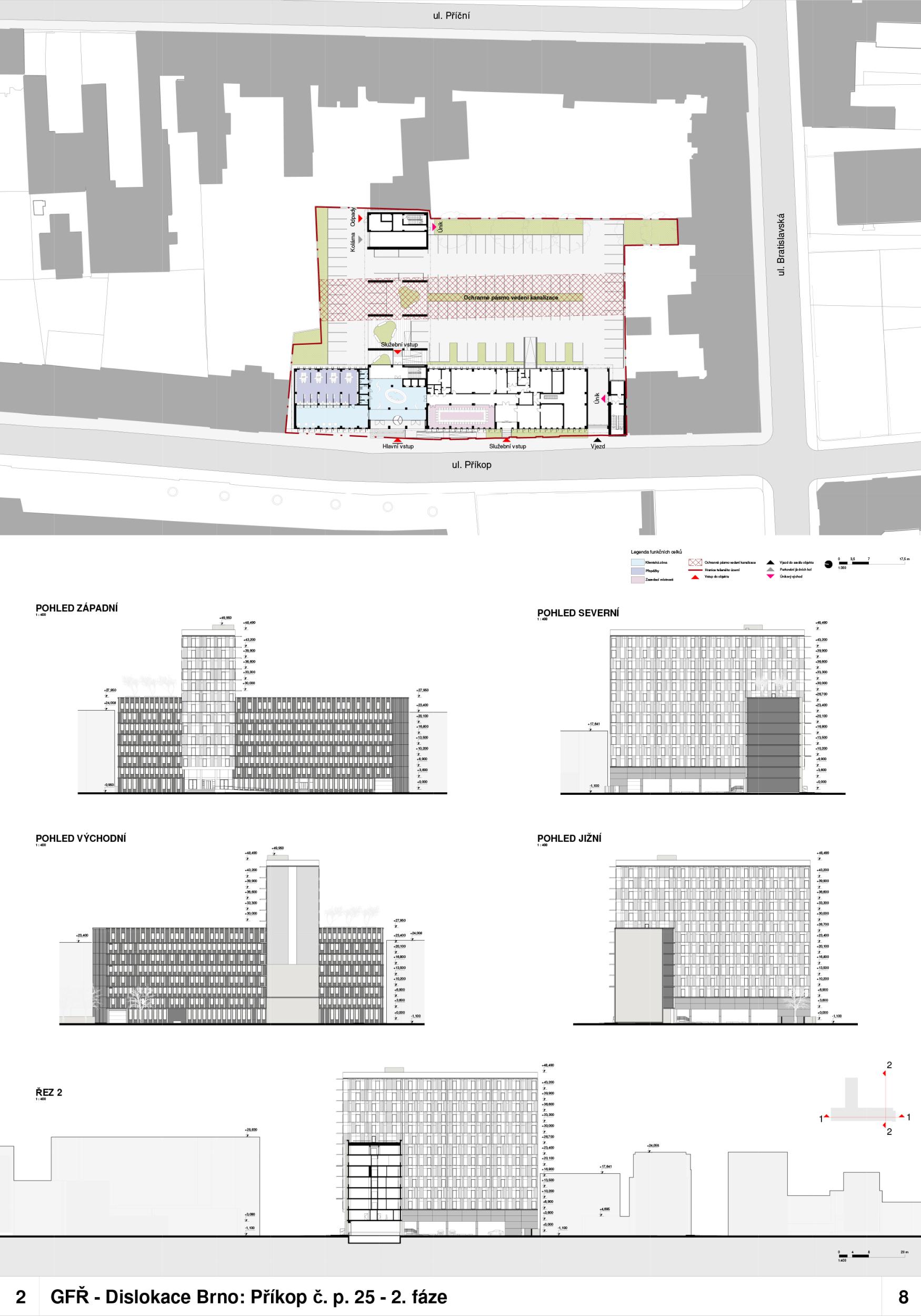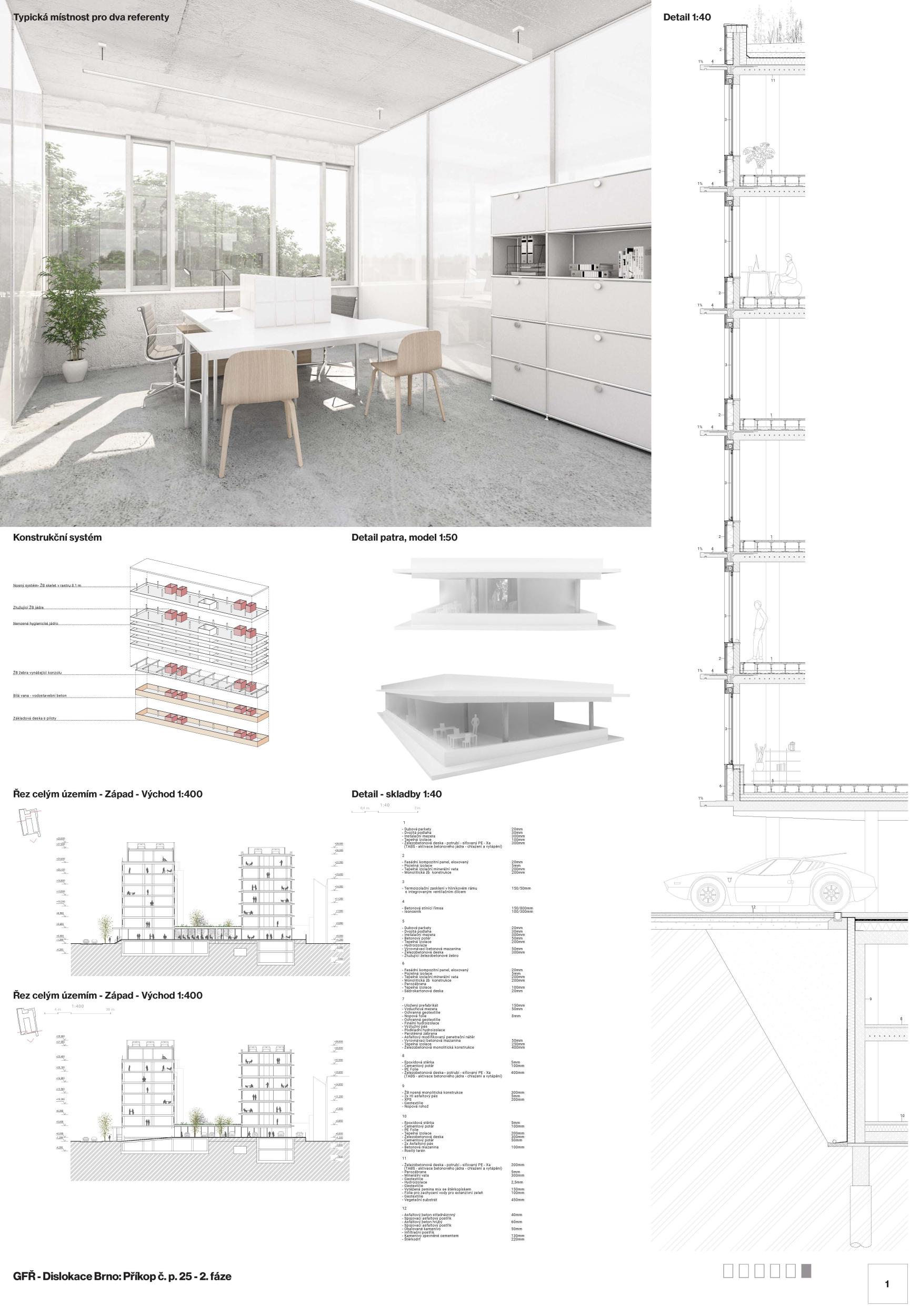 The extension has a common base at the level of the second above-ground story on the entire plot - this defines the block of new development. Above this horizontal mass, there are two 5 and 7 story parts. Both buildings are architecturally designed analogously - along the perimeter there are horizontal concrete ceiling slabs, between which are horizontal strips of windows with a regular grid of wooden windows and vertical guides of shade blinds. The common base is a fixed base with a horizontal window, the roof of the base is a rest area of the tax office staff with terraces and greenery. Part of the base is an outdoor atrium with greenery and garden furniture. Below, there are floors with parking spaces designed as an outdoor space, the facade of the parking floors is designed as a transparent steel network with climbing greenery. We designed a new facade for the original building that respects the current proportions and rhythm of the windows. The original monolithic mass was divided into two parts by recessed vertical strip in the place of stairs and elevators. The facade is lined with a durable and maintenance-free ceramic band, the windows are wooden.