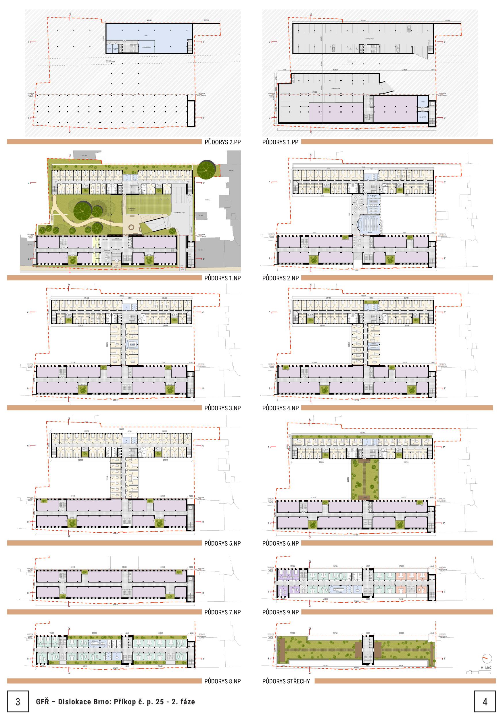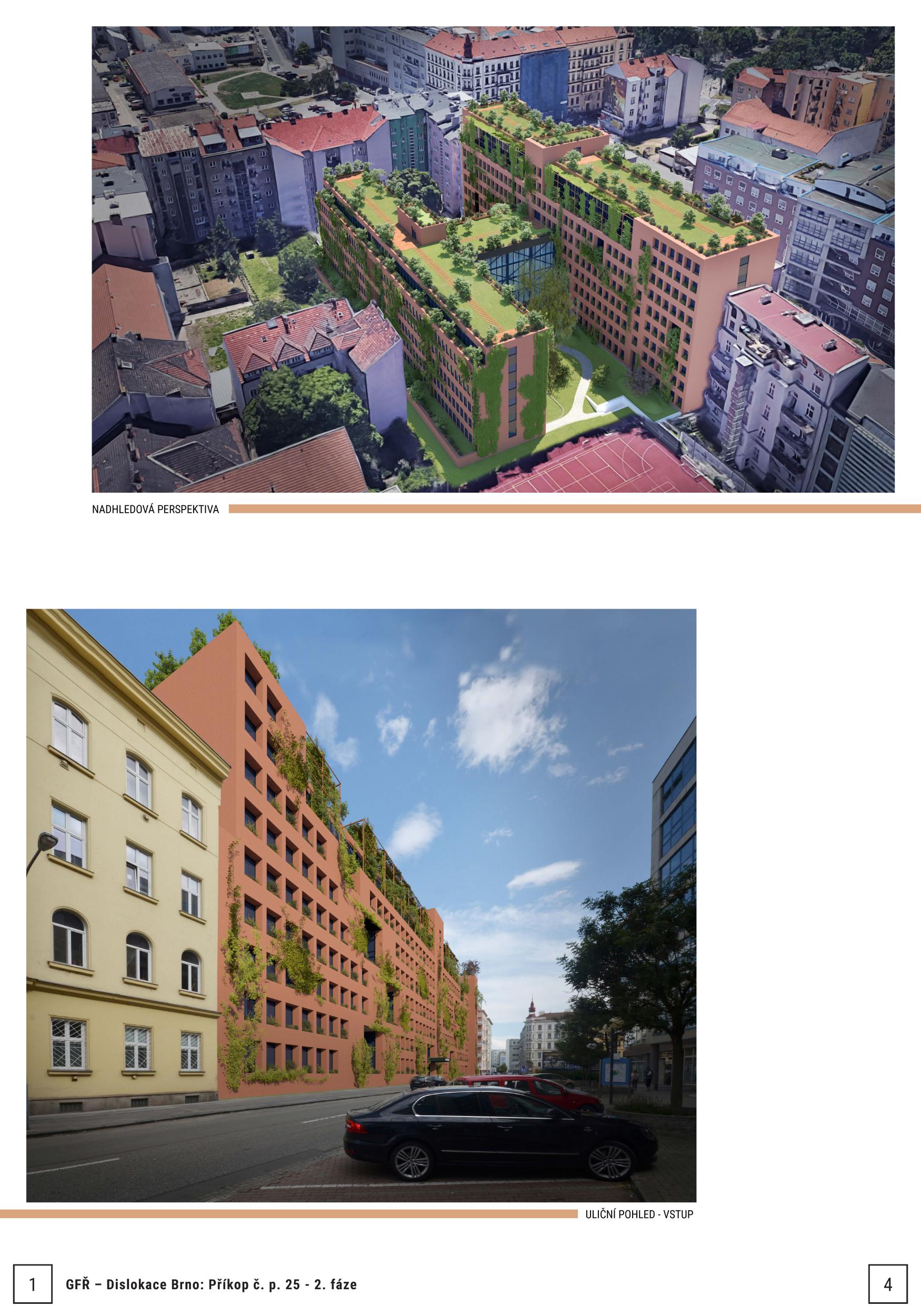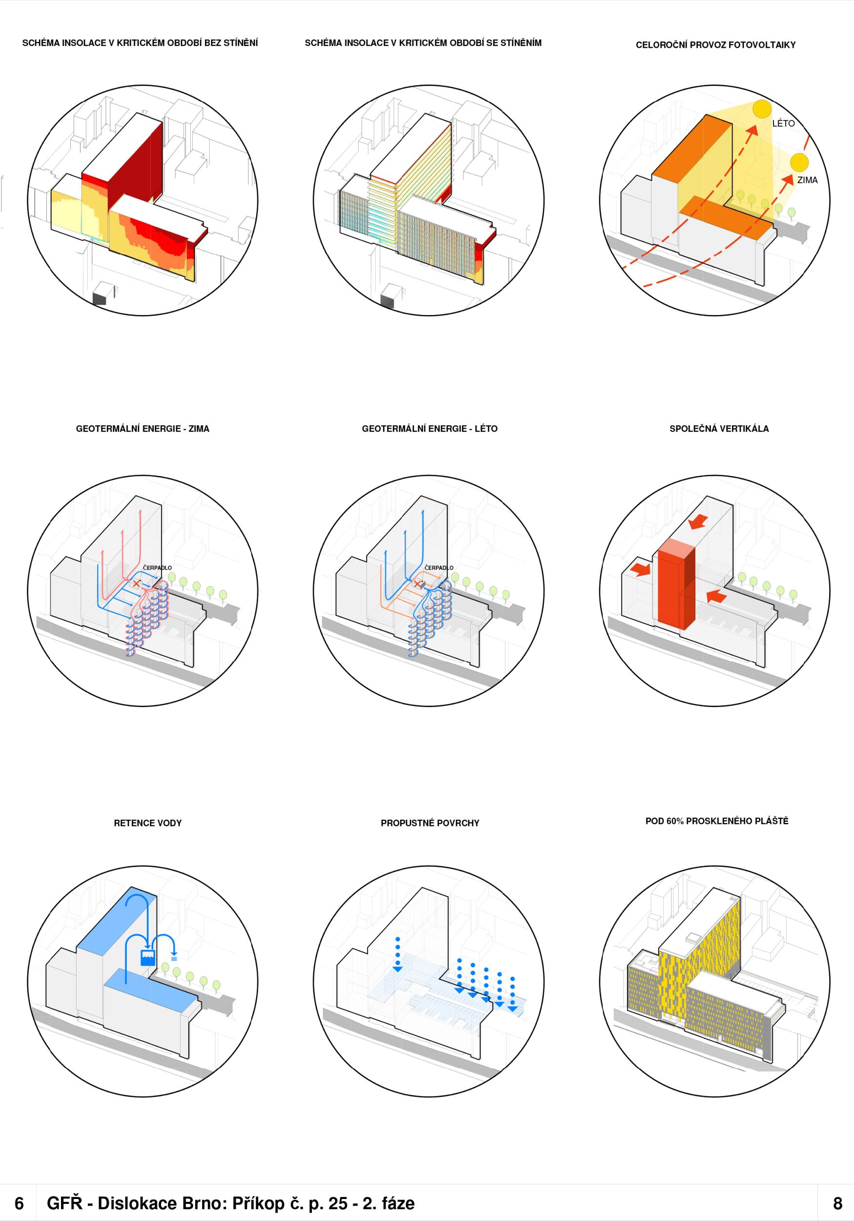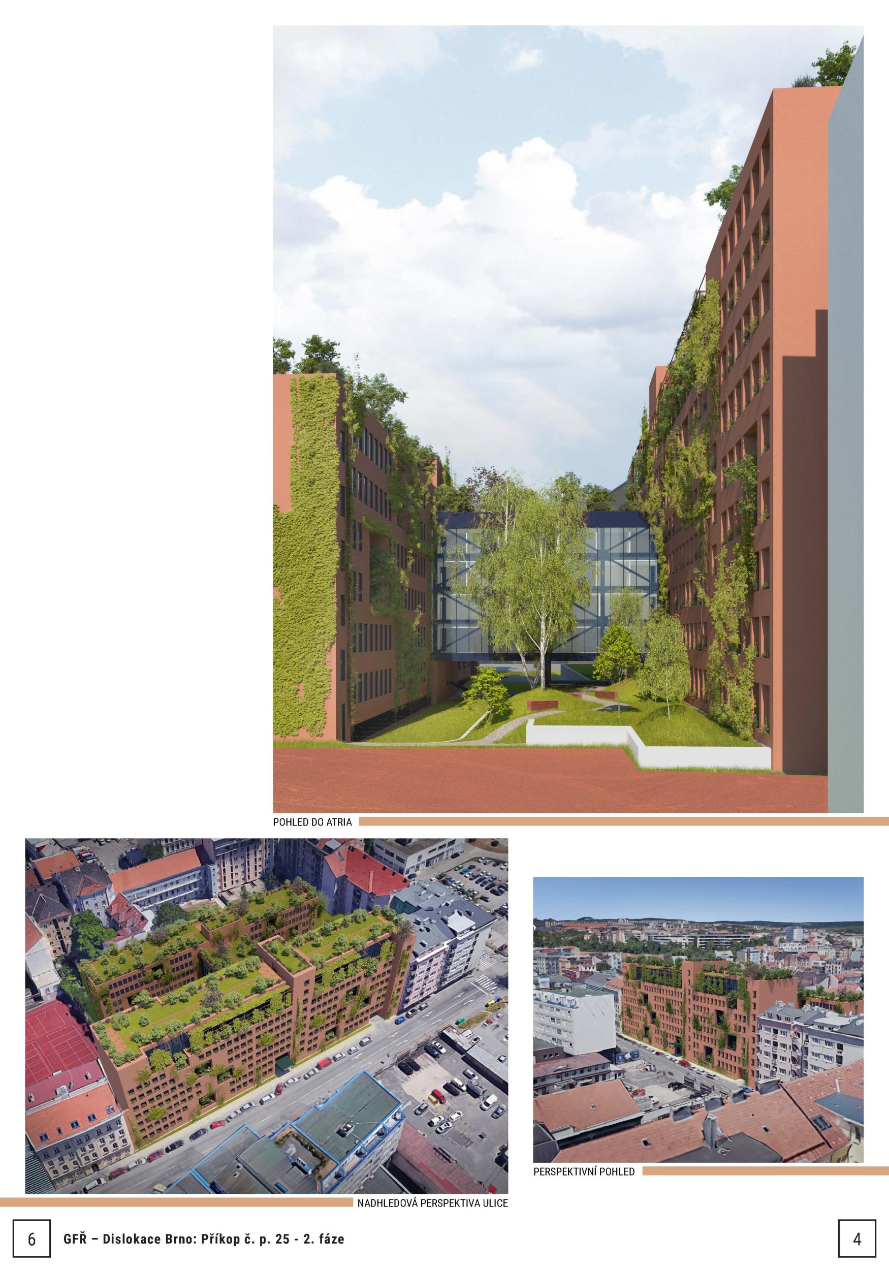 The extension has a common base at the level of the second above-ground story on the entire plot - this defines the block of new development. Above this horizontal mass, there are two 5 and 7 story parts. Both buildings are architecturally designed analogously - along the perimeter there are horizontal concrete ceiling slabs, between which are horizontal strips of windows with a regular grid of wooden windows and vertical guides of shade blinds. The common base is a fixed base with a horizontal window, the roof of the base is a rest area of the tax office staff with terraces and greenery. Part of the base is an outdoor atrium with greenery and garden furniture. Below, there are floors with parking spaces designed as an outdoor space, the facade of the parking floors is designed as a transparent steel network with climbing greenery. We designed a new facade for the original building that respects the current proportions and rhythm of the windows. The original monolithic mass was divided into two parts by recessed vertical strip in the place of stairs and elevators. The facade is lined with a durable and maintenance-free ceramic band, the windows are wooden.