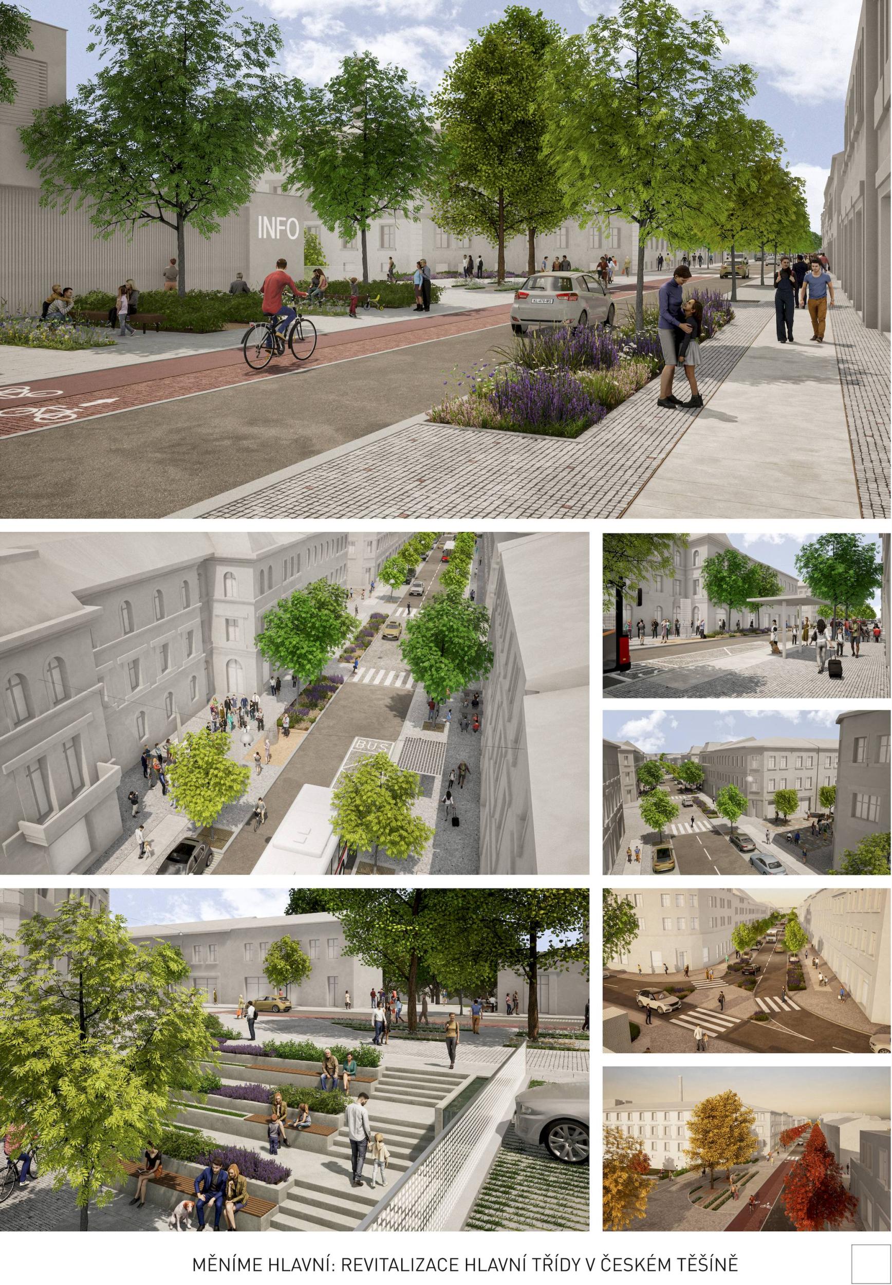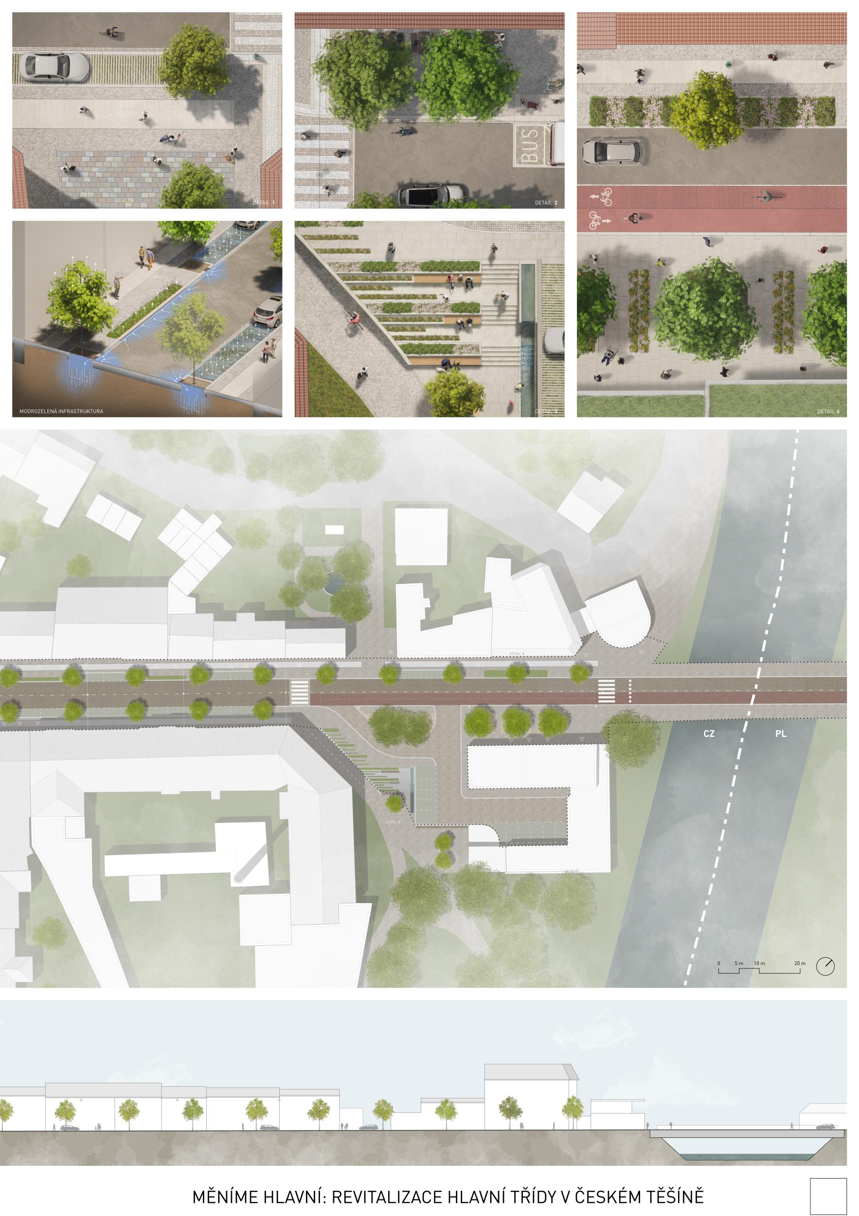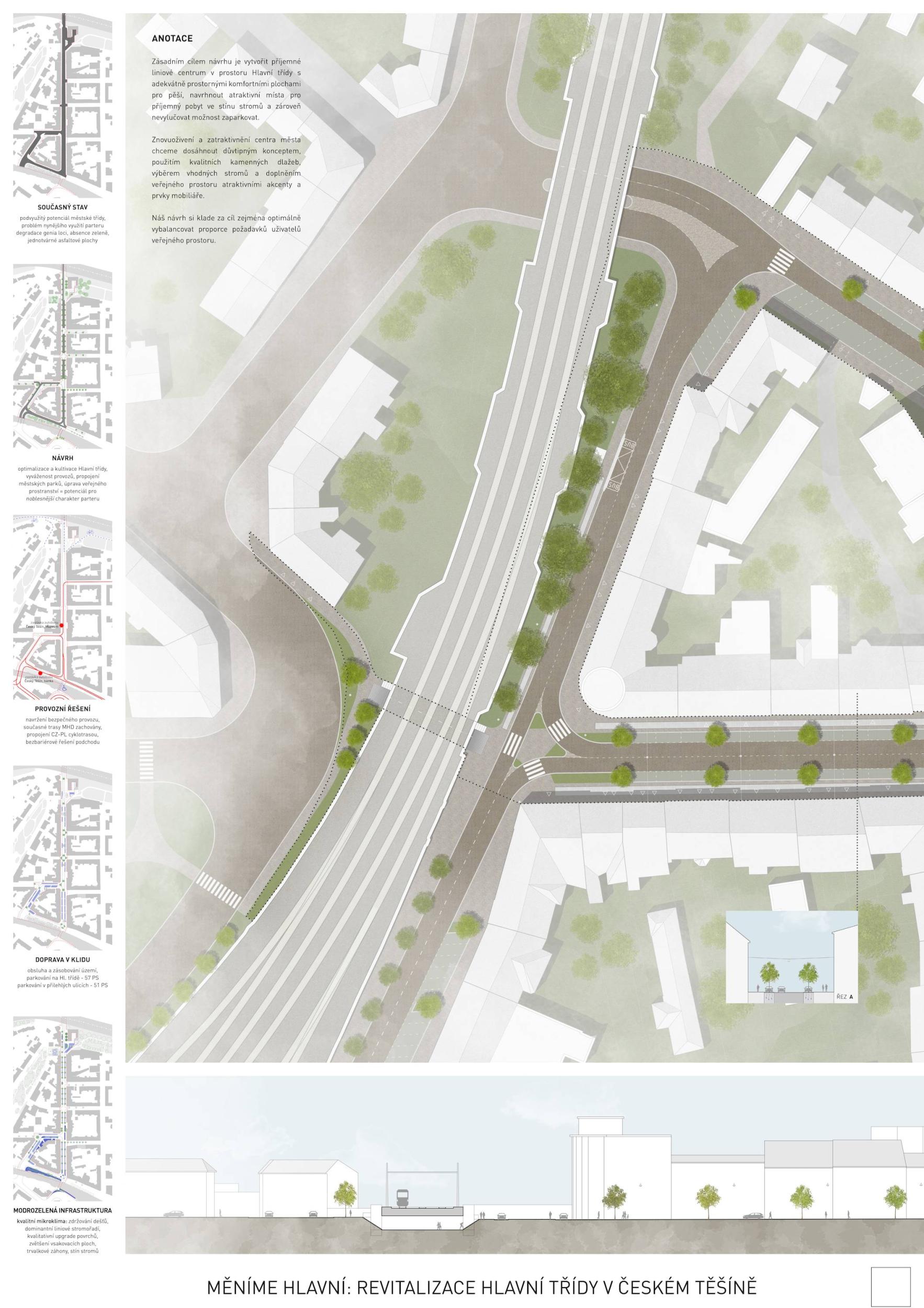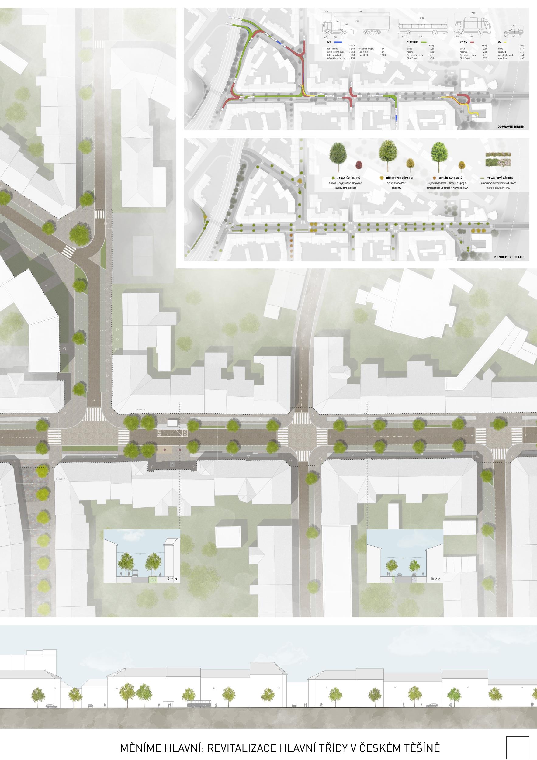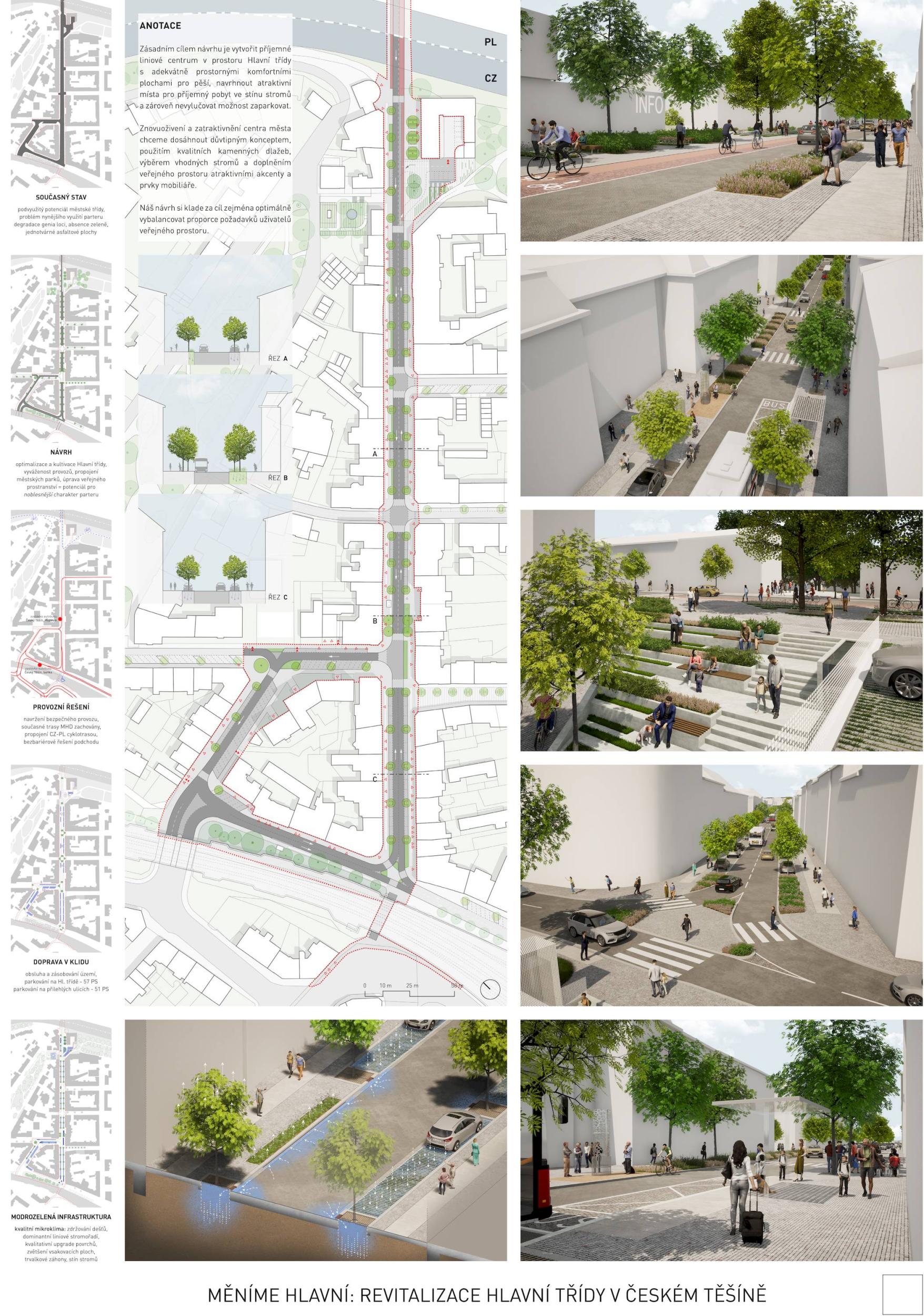 Těšínś Hlavní třída is a long street clearly defined by street fronts. However, it is not a homogeneous street. In each section it lives a different life, needs to fulfil a different function and offers different possibilities. Three parts, which by their life predetermine 3 different types of street. A confident tree line in the middle of the city. A new public space halfway between the Czech and Polish squares. Where no one expected it. Variability and a basis for the future development of the street. Connecting two parks and bringing greenery into the street. New opportunities for cyclists and safe and wide routes for pedestrians. Use of historic paving where it makes sense. Connecting the overall concept of paved areas between Český Těšín and Cieszyn. This is our proposal.