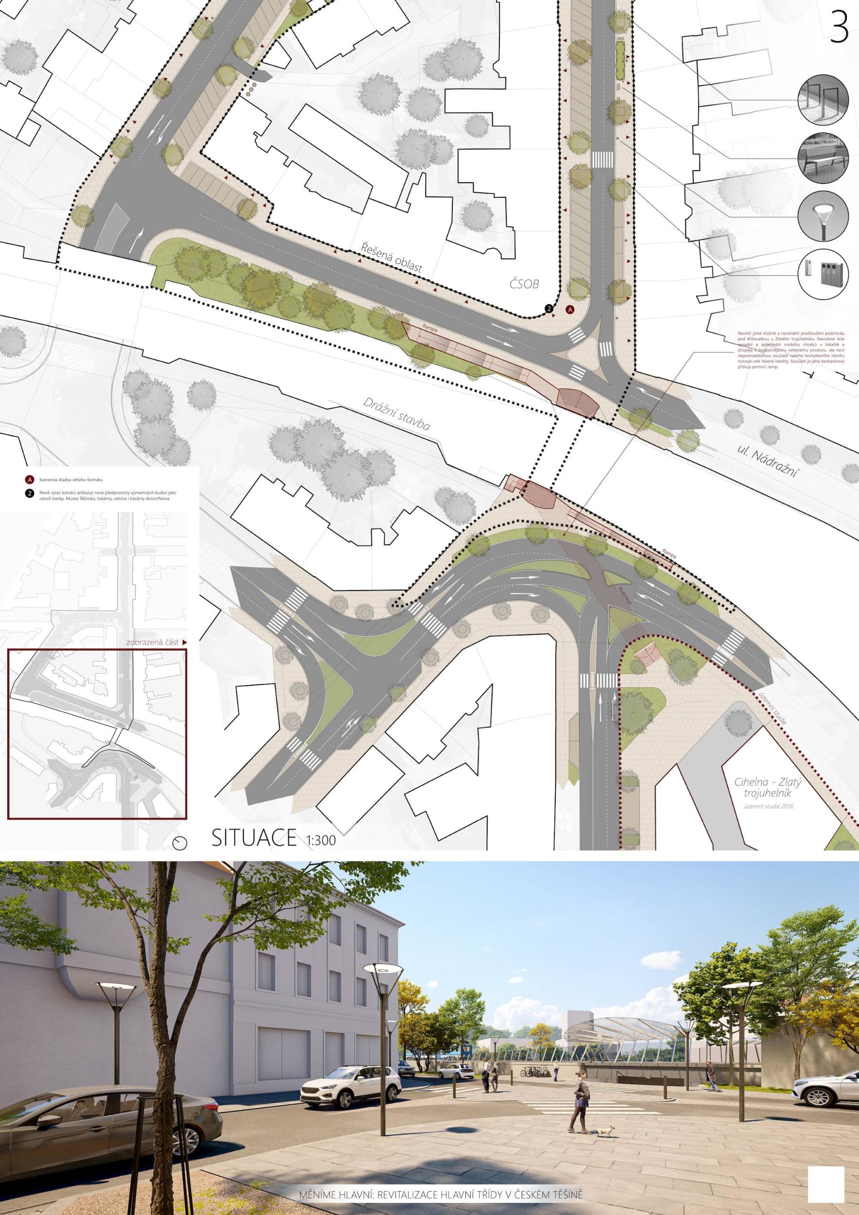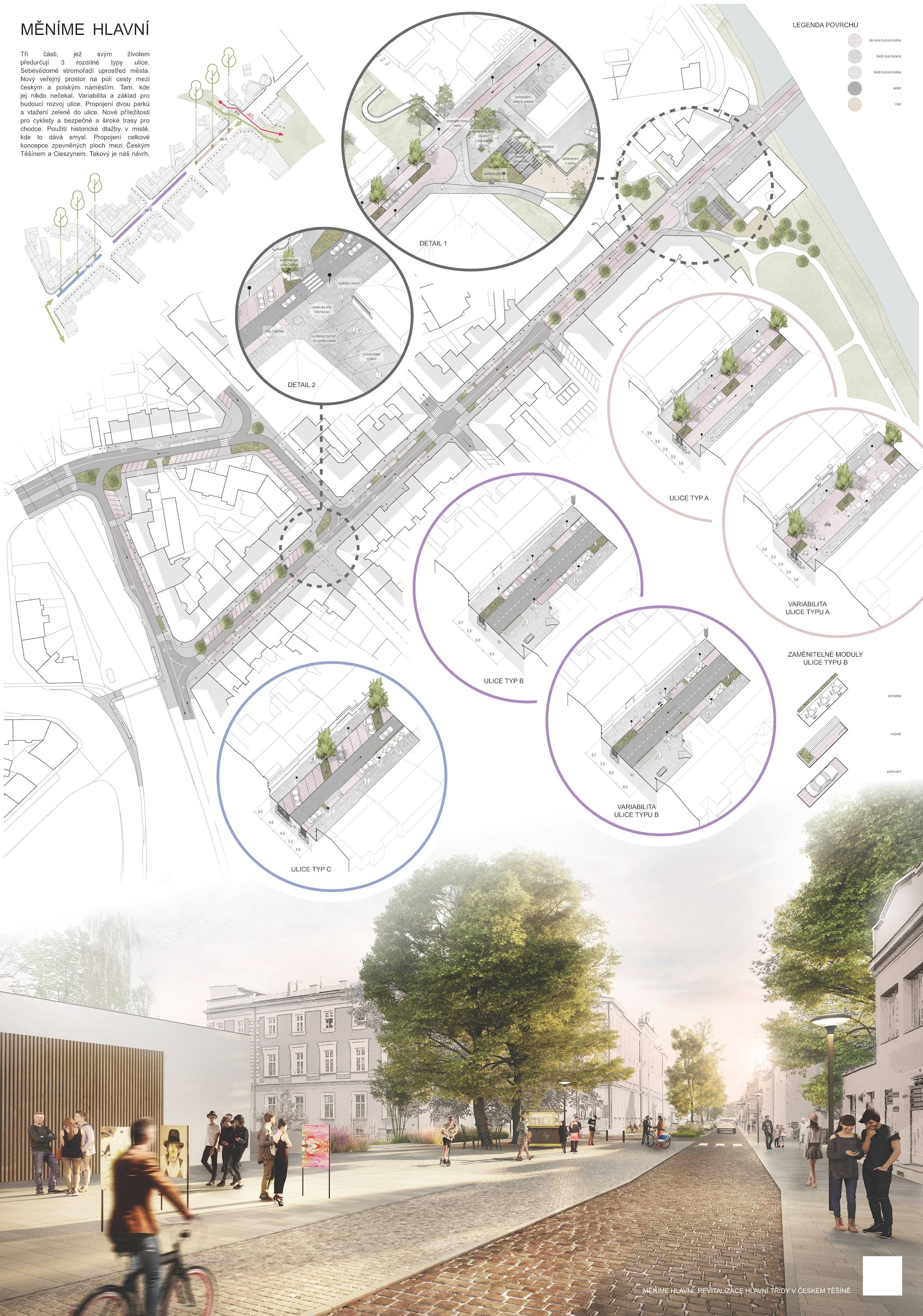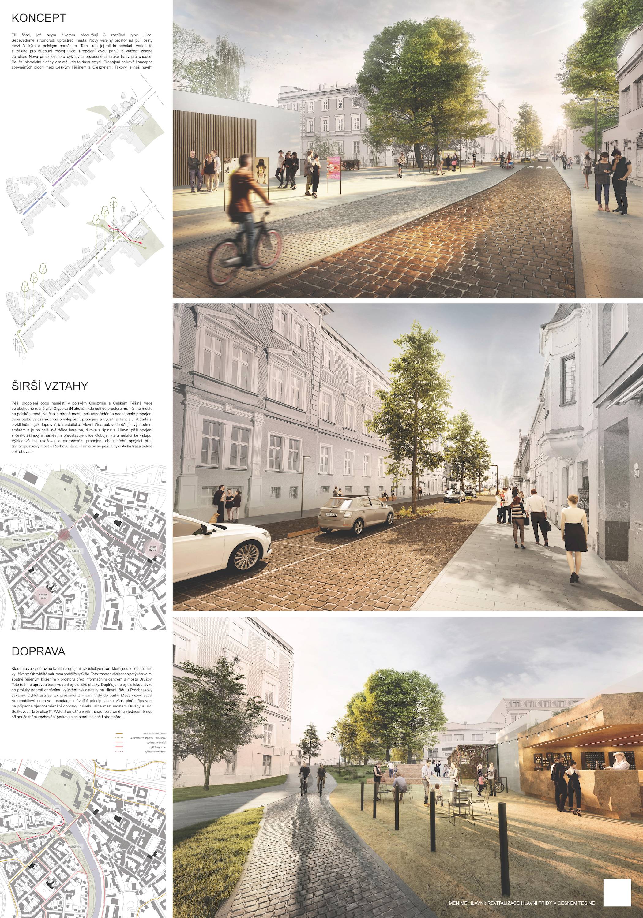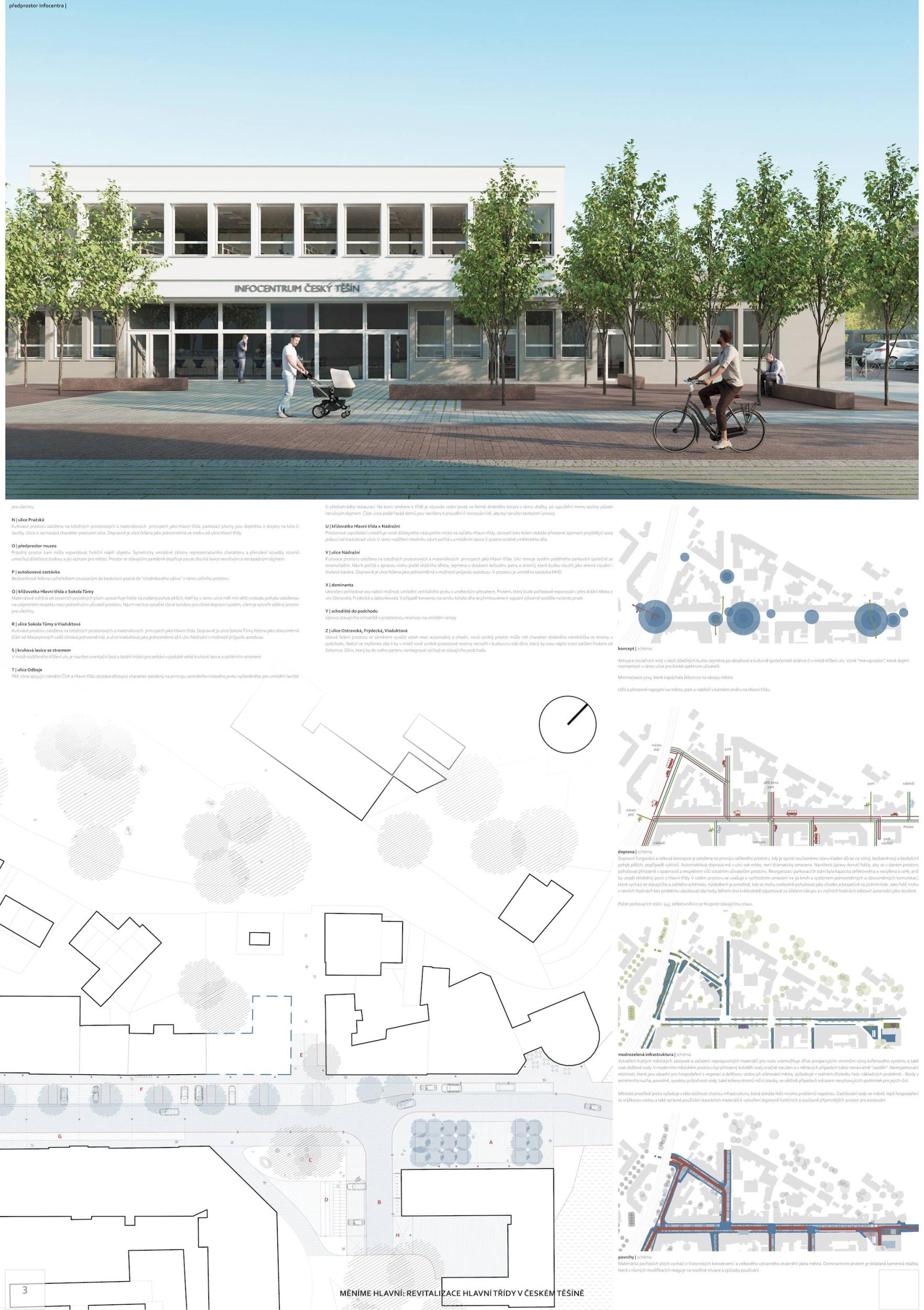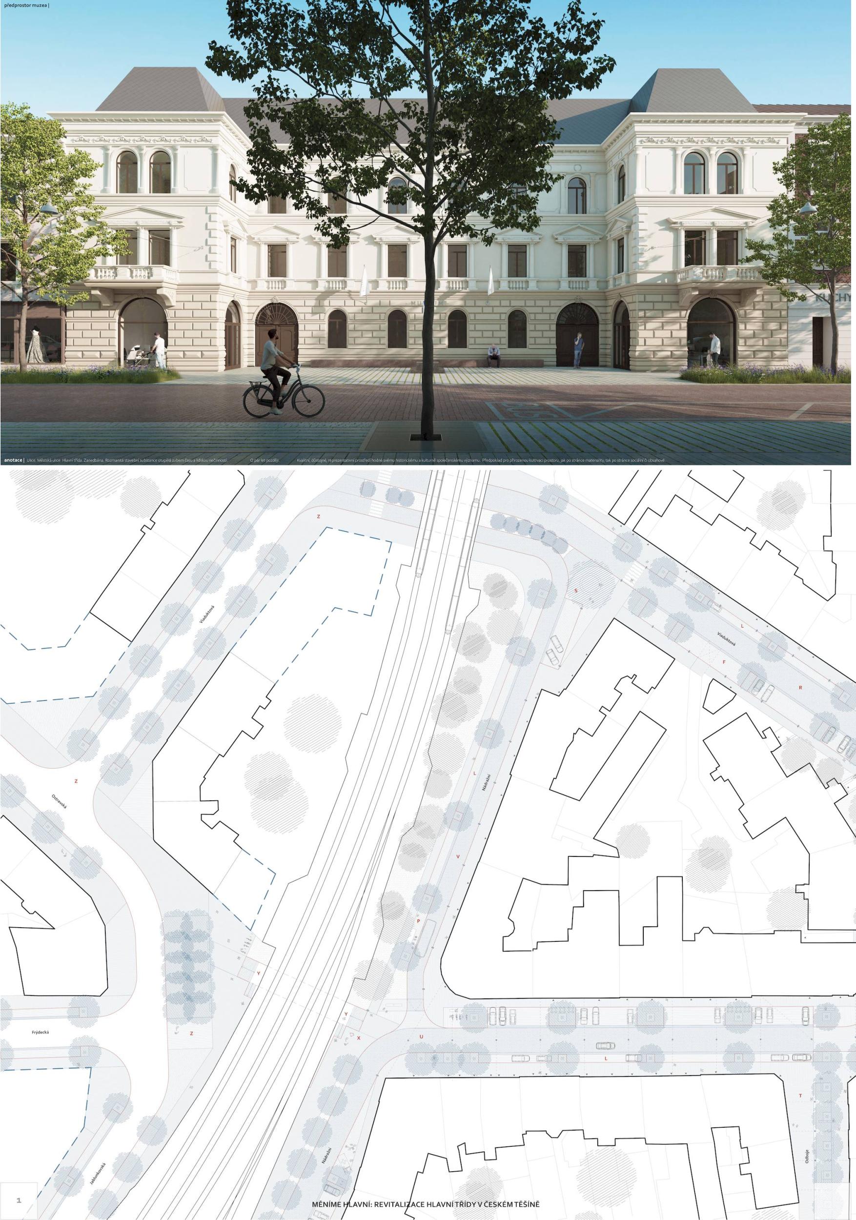 Těšínś Hlavní třída is a long street clearly defined by street fronts. However, it is not a homogeneous street. In each section it lives a different life, needs to fulfil a different function and offers different possibilities. Three parts, which by their life predetermine 3 different types of street. A confident tree line in the middle of the city. A new public space halfway between the Czech and Polish squares. Where no one expected it. Variability and a basis for the future development of the street. Connecting two parks and bringing greenery into the street. New opportunities for cyclists and safe and wide routes for pedestrians. Use of historic paving where it makes sense. Connecting the overall concept of paved areas between Český Těšín and Cieszyn. This is our proposal.