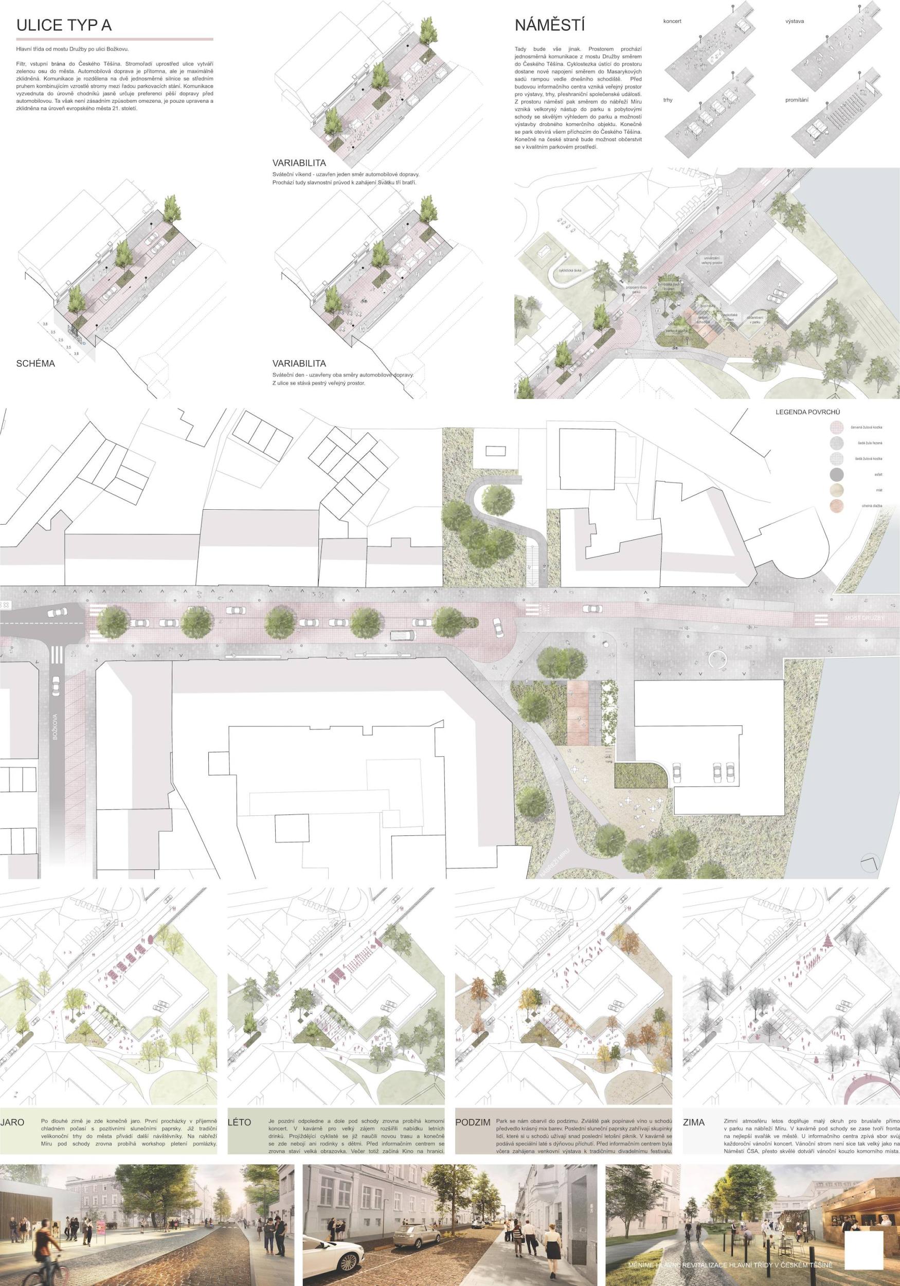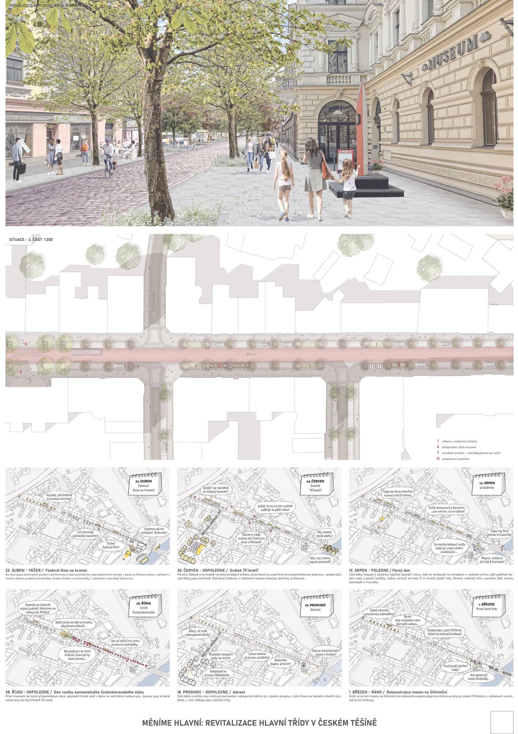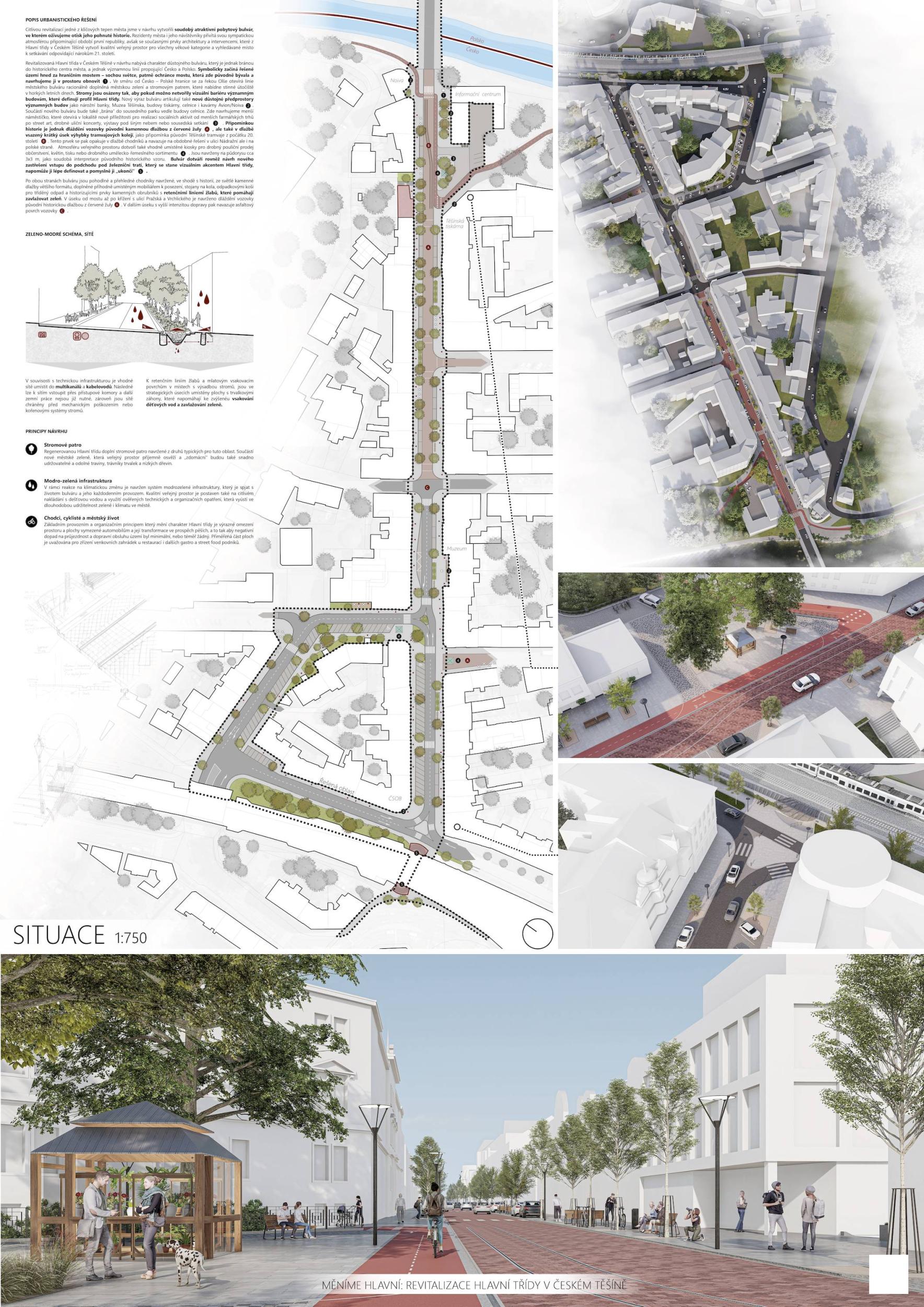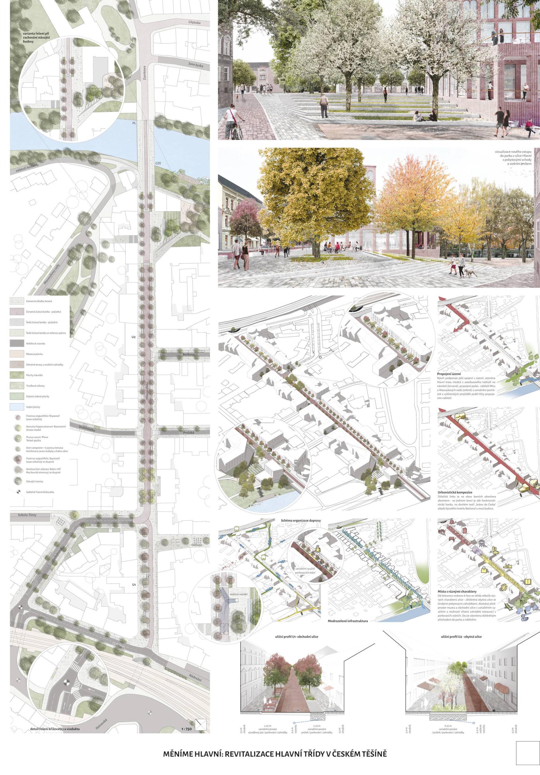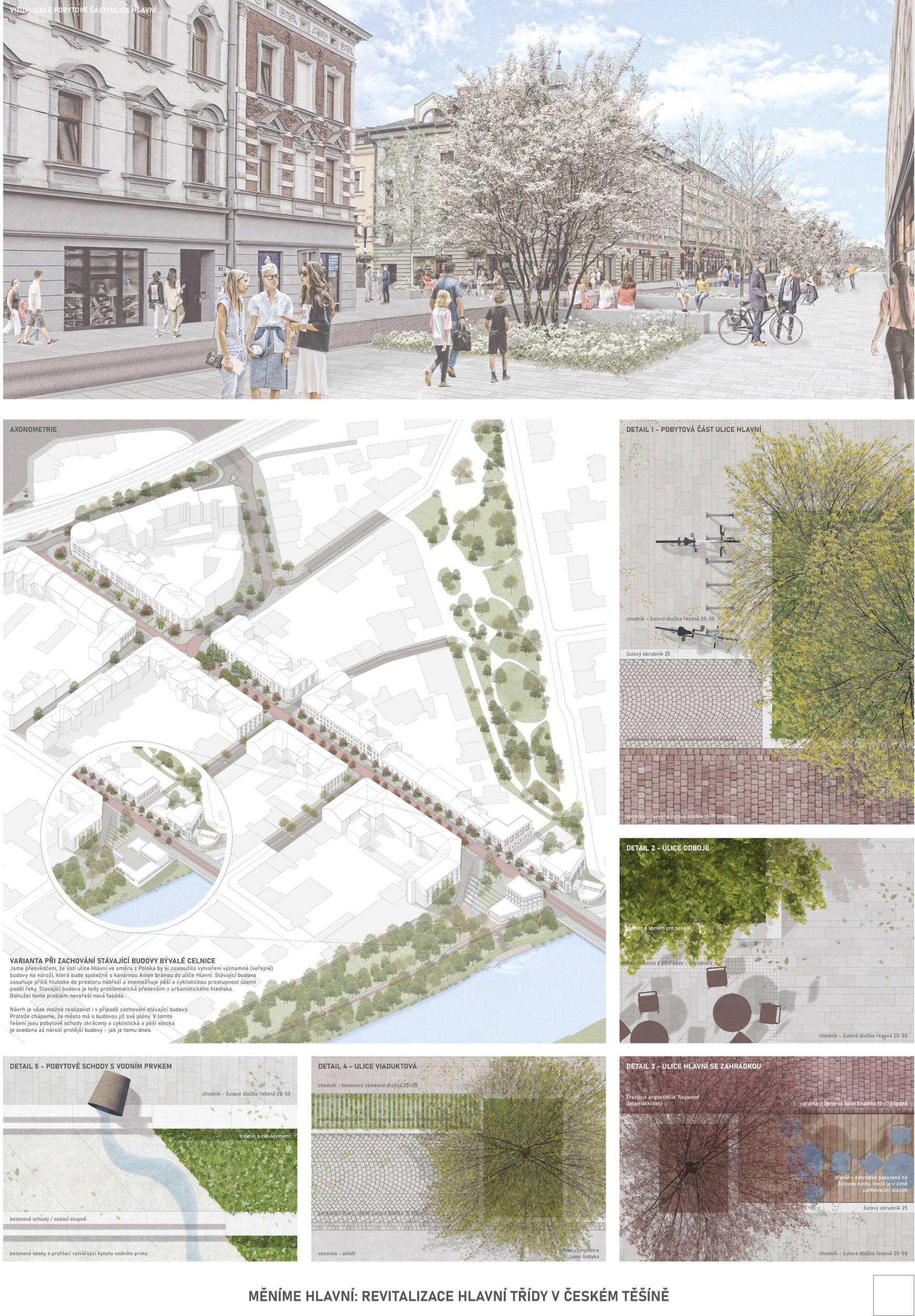 Těšínś Hlavní třída is a long street clearly defined by street fronts. However, it is not a homogeneous street. In each section it lives a different life, needs to fulfil a different function and offers different possibilities. Three parts, which by their life predetermine 3 different types of street. A confident tree line in the middle of the city. A new public space halfway between the Czech and Polish squares. Where no one expected it. Variability and a basis for the future development of the street. Connecting two parks and bringing greenery into the street. New opportunities for cyclists and safe and wide routes for pedestrians. Use of historic paving where it makes sense. Connecting the overall concept of paved areas between Český Těšín and Cieszyn. This is our proposal.