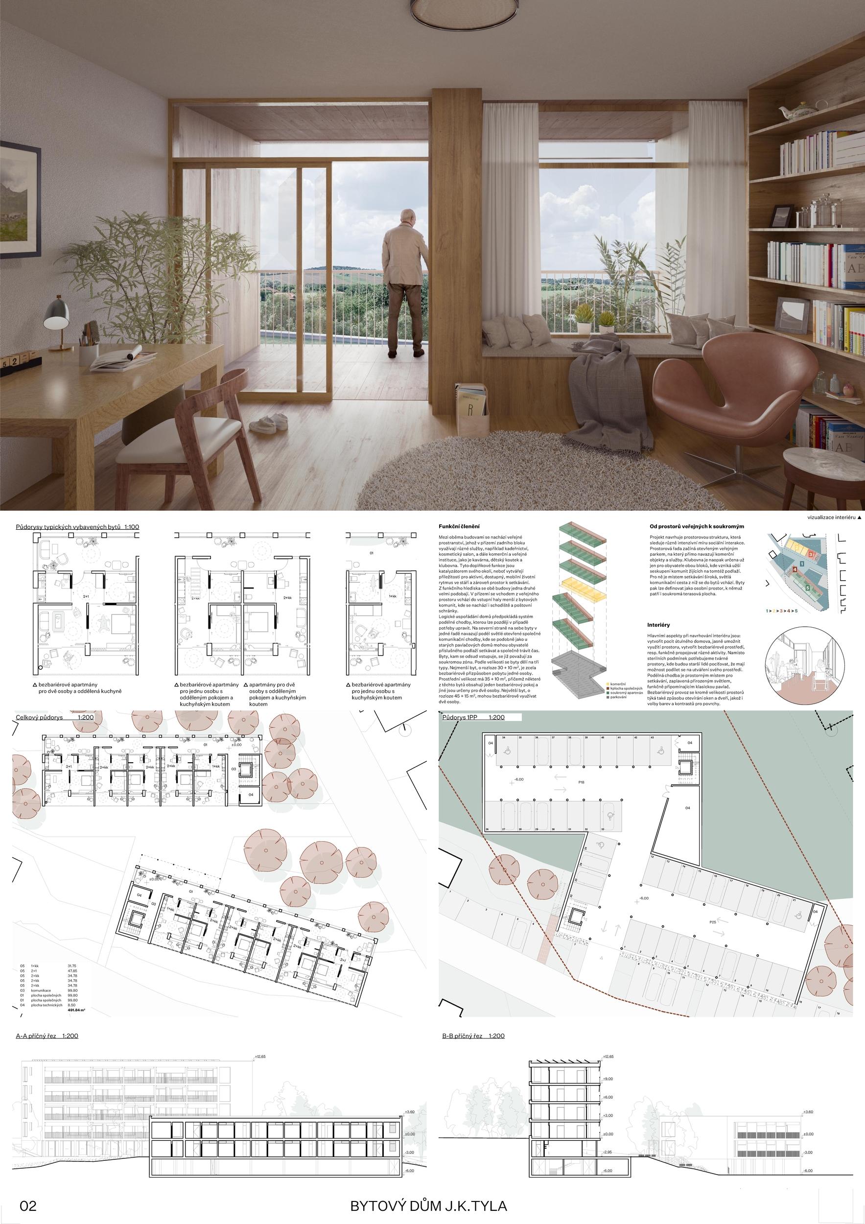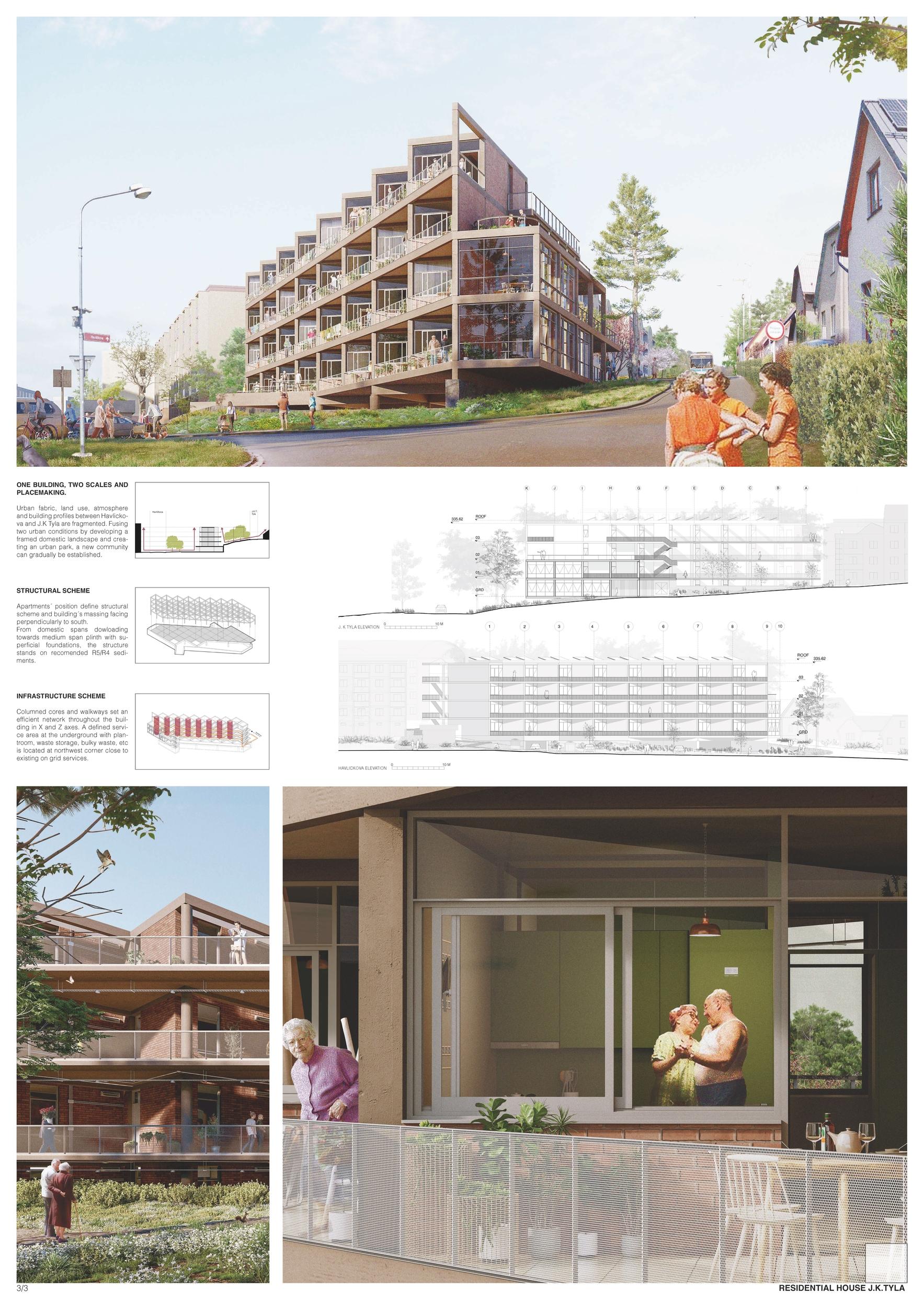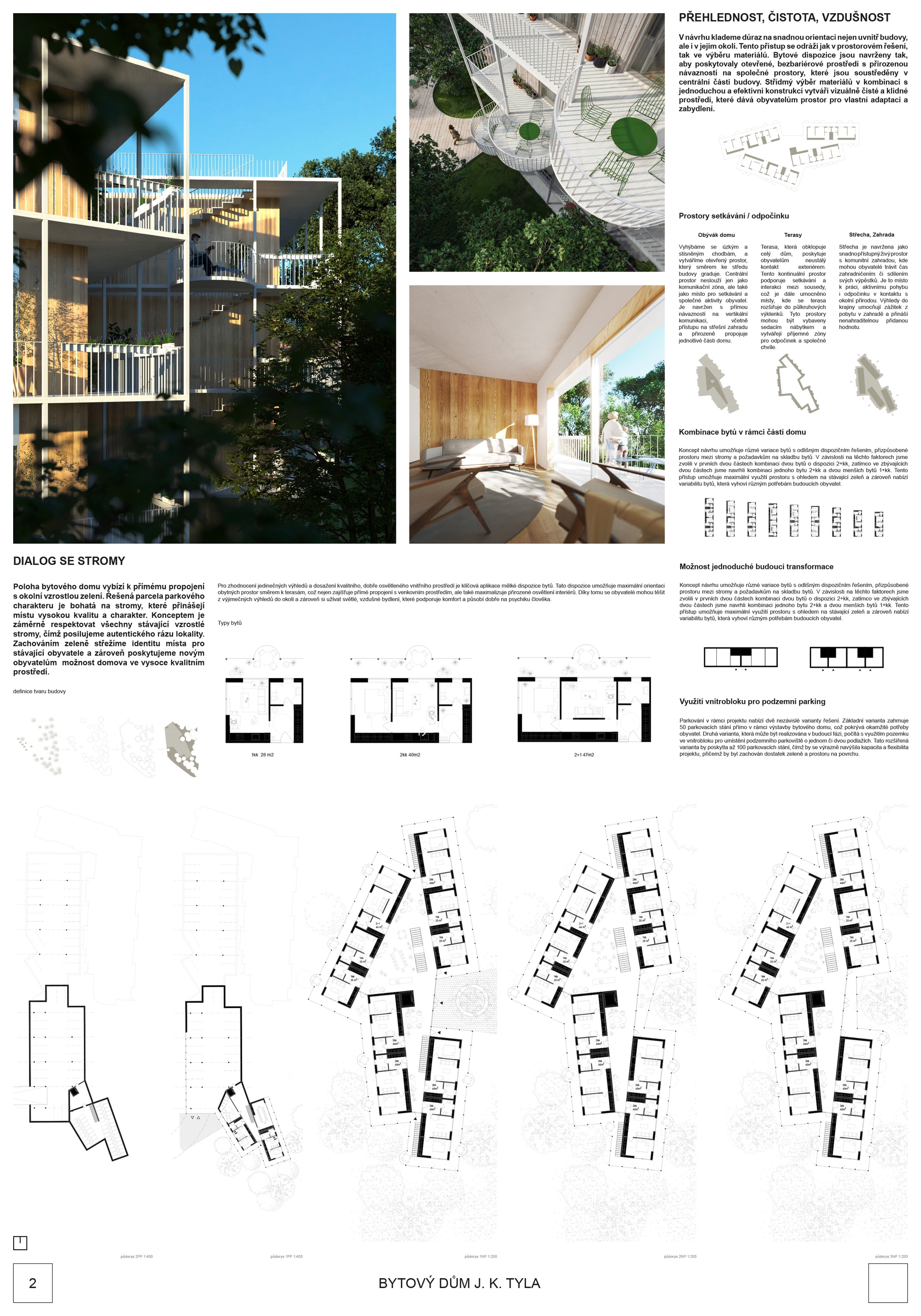 DIALOGUE WITH TREES A very discreet and well designed proposal. It is based on the notion of maximum respect for the existing greenery. It builds on it, leans on it, lets it in, uses it. It does not define the character of the spaces it connects with. It does not impose itself; the layout of the house sometimes flows into the exterior, and vice versa. The positioning of the building on the plot respects the contextual features of the locality as much as possible. It steps back from the building line of the surrounding family houses, yet maintains a certain physical connection. It allows the greenery from the upper courtyard to flow past it from the east side, subtly veiling the joint compact structure and setting it back into the second plane. At the same time, it preserves sufficient space allows views from the existing building of the same use. The geometry of the design playfully and purposefully uses its parts to maximize the comfort of use in its concentrated center. The four arms of the apartment layouts, and their connection through the central hall of the floor, are arranged to serve not only as vertical circulation, but also as a space for physical encounters and opportunities to be together, in a way that the other private environments do not suffer. The layout is clean, the grouping around the hall creates possibilities of use depending on location, intensity, right down to deciding which part of it best meets the user's ideas of where to stay at the moment. Very interesting is the creation of the possibility of communicating in the exterior (on the recreational balconies) without having to pass through the apartment. This is a very unique approach and offer created, where the rooms can remain - in this mode - private and visits take place in the semi-public exterior of the balcony or the interior of the hall. The architectural design leaves no doubt about the type of facility it represents. Its subtle expressiveness, sensory elegance, and emphasis on horizontality blend seamlessly with the vertical landscape of tree canopies, giving the impression that it has always belonged there It is a beautiful solution for the coexistence of the building’s volume with the ephemeral quality of natural growth. From the jury's point of view, this design best fulfilled the competition brief and deservedly won first place. In further development, it has the potential to refine its strengths to create a profound connection between architectural quality and its integration into the landscape We’re all keeping our fingers crossed for you (the city, the jury, and the organizers)!!!