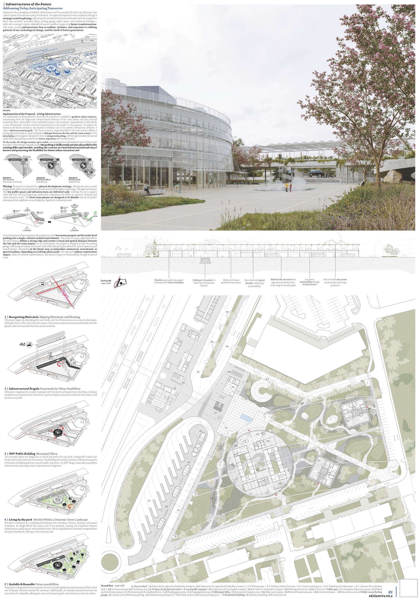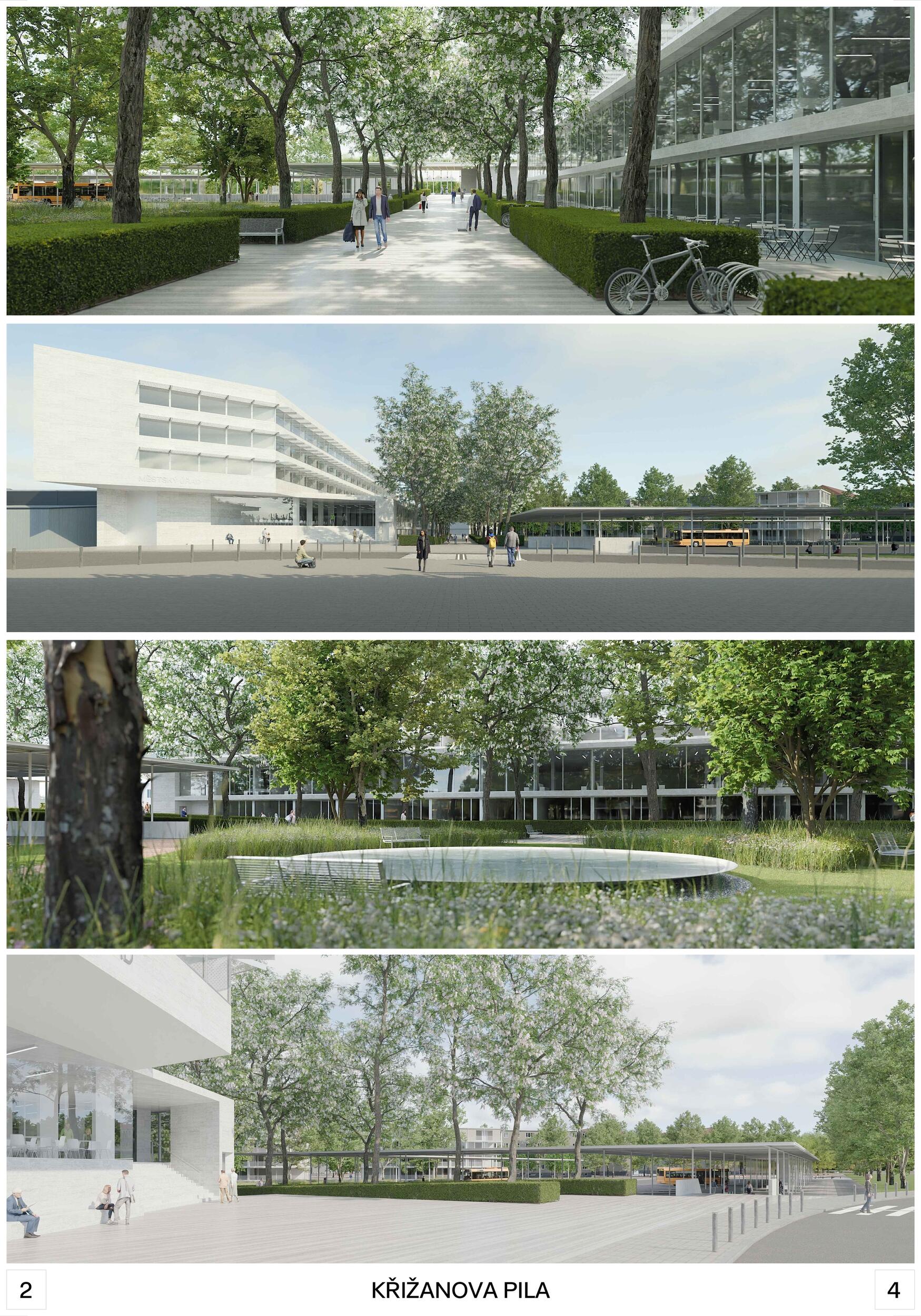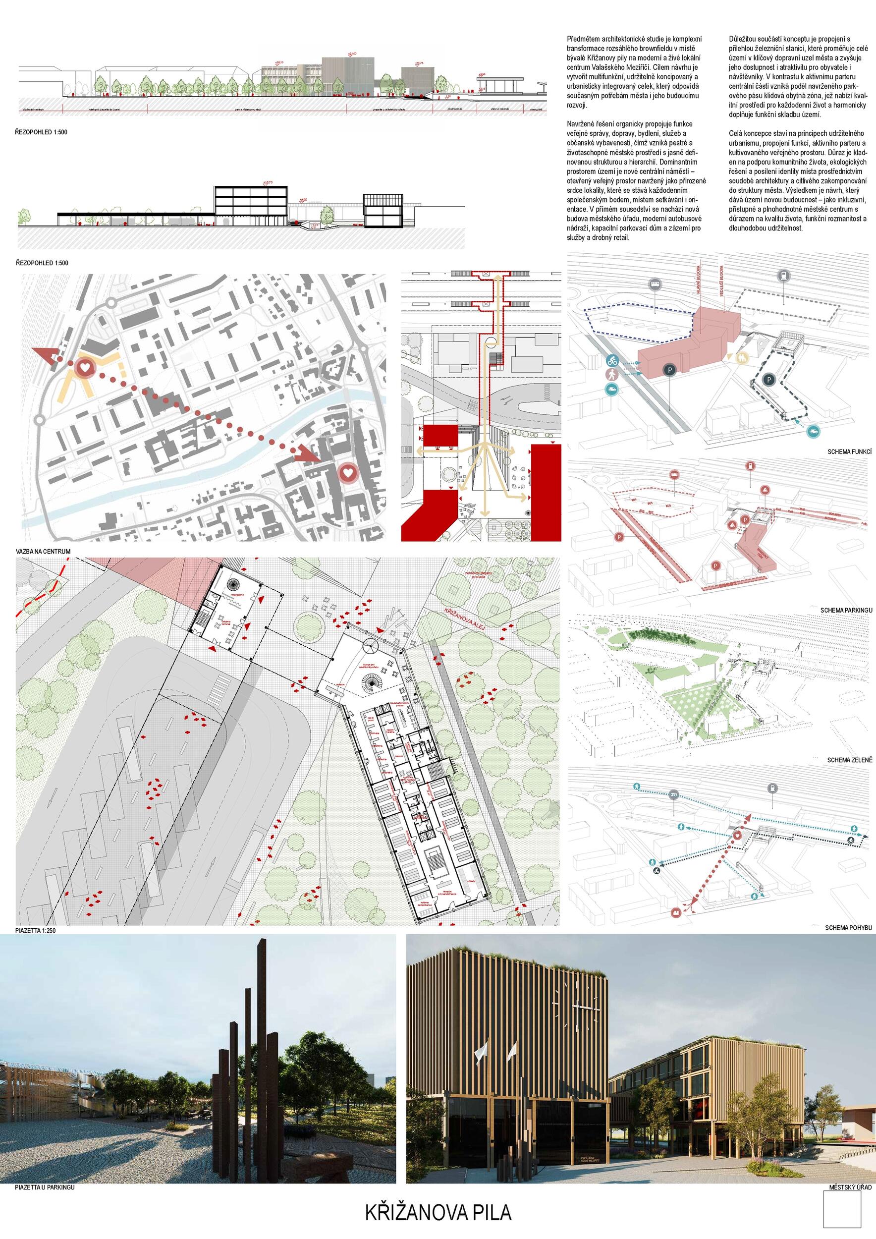 The jury appreciates the clear and well-articulated urban and architectural concept, convincingly presented by the proposal. It values the critical reassessment of the original urban study, which the design reflects upon in the context of the city’s real needs, taking into account both the current situation and the future development potential of the area. The proposal offers a contemporary approach with standalone buildings set in a park landscape, sensitively responding to the surrounding urban fabric and allowing for a straightforward phasing of construction. The clarity and architectural character of the individual buildings are seen as appropriately aligned with their intended function. The jury was particularly impressed by the bold design of the City Hall building, which successfully meets the brief’s ambition for a new identity of the site, while also fulfilling the symbolic and representative role of a major municipal institution. The building's design demonstrates energy efficiency and thoughtful sustainability strategies, aligning with today’s standards for performance and environmental responsibility. The proposal shows a high level of graphic quality and thoroughness throughout, reflecting the authors’ careful and professional approach. The landscape design is also carefully considered, especially in the clear structure and hierarchy of pedestrian routes and the integration of small-scale architectural elements. The residential buildings are well resolved and sensitively integrated into the overall character of the site. The jury further commends the consistent attention to environmental aspects across the entire proposal. The spatial layout of all buildings appears clean and functional, contributing to user comfort and overall clarity of the design. Among all submitted proposals, this entry stood out with its complex, balanced, and ambitious approach, best fulfilling the competition brief while offering a strong and inspiring vision for the site’s future development.