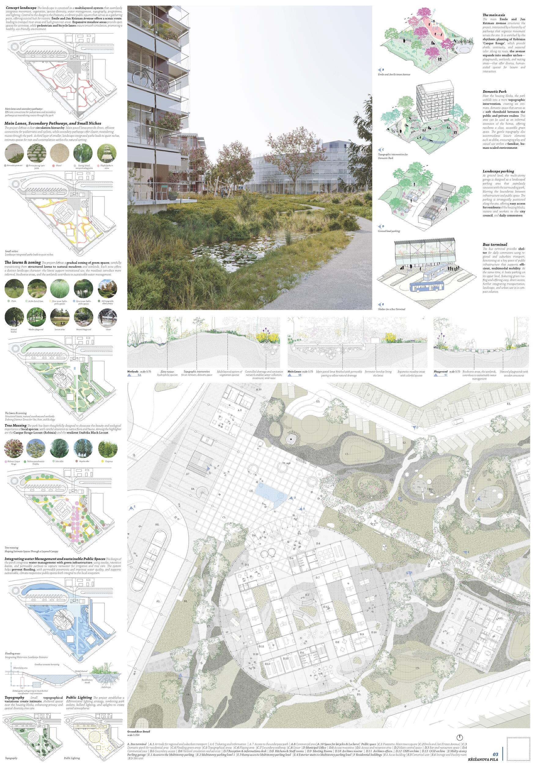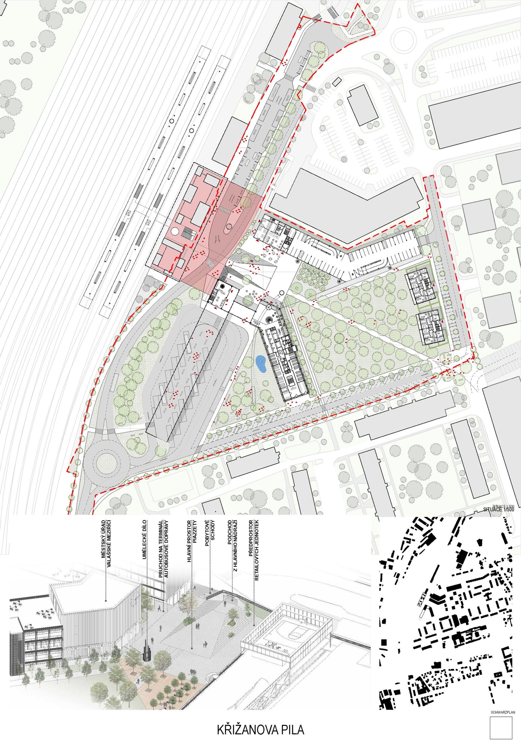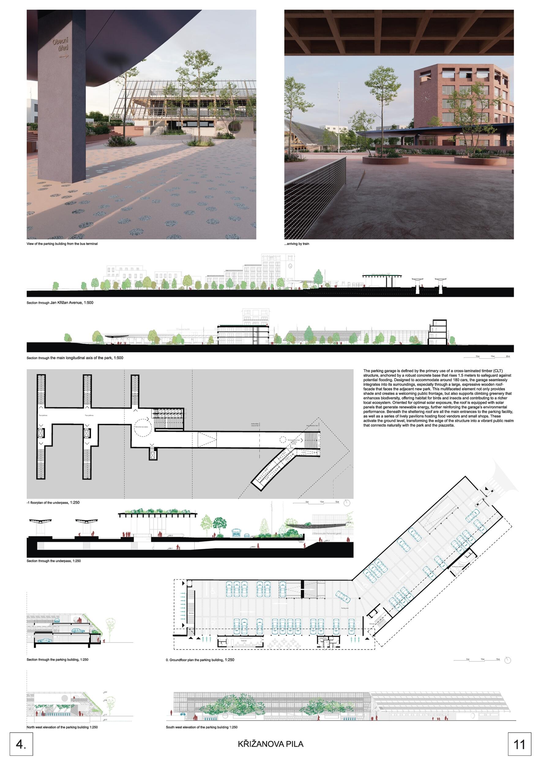 The jury appreciates the clear and well-articulated urban and architectural concept, convincingly presented by the proposal. It values the critical reassessment of the original urban study, which the design reflects upon in the context of the city’s real needs, taking into account both the current situation and the future development potential of the area. The proposal offers a contemporary approach with standalone buildings set in a park landscape, sensitively responding to the surrounding urban fabric and allowing for a straightforward phasing of construction. The clarity and architectural character of the individual buildings are seen as appropriately aligned with their intended function. The jury was particularly impressed by the bold design of the City Hall building, which successfully meets the brief’s ambition for a new identity of the site, while also fulfilling the symbolic and representative role of a major municipal institution. The building's design demonstrates energy efficiency and thoughtful sustainability strategies, aligning with today’s standards for performance and environmental responsibility. The proposal shows a high level of graphic quality and thoroughness throughout, reflecting the authors’ careful and professional approach. The landscape design is also carefully considered, especially in the clear structure and hierarchy of pedestrian routes and the integration of small-scale architectural elements. The residential buildings are well resolved and sensitively integrated into the overall character of the site. The jury further commends the consistent attention to environmental aspects across the entire proposal. The spatial layout of all buildings appears clean and functional, contributing to user comfort and overall clarity of the design. Among all submitted proposals, this entry stood out with its complex, balanced, and ambitious approach, best fulfilling the competition brief while offering a strong and inspiring vision for the site’s future development.