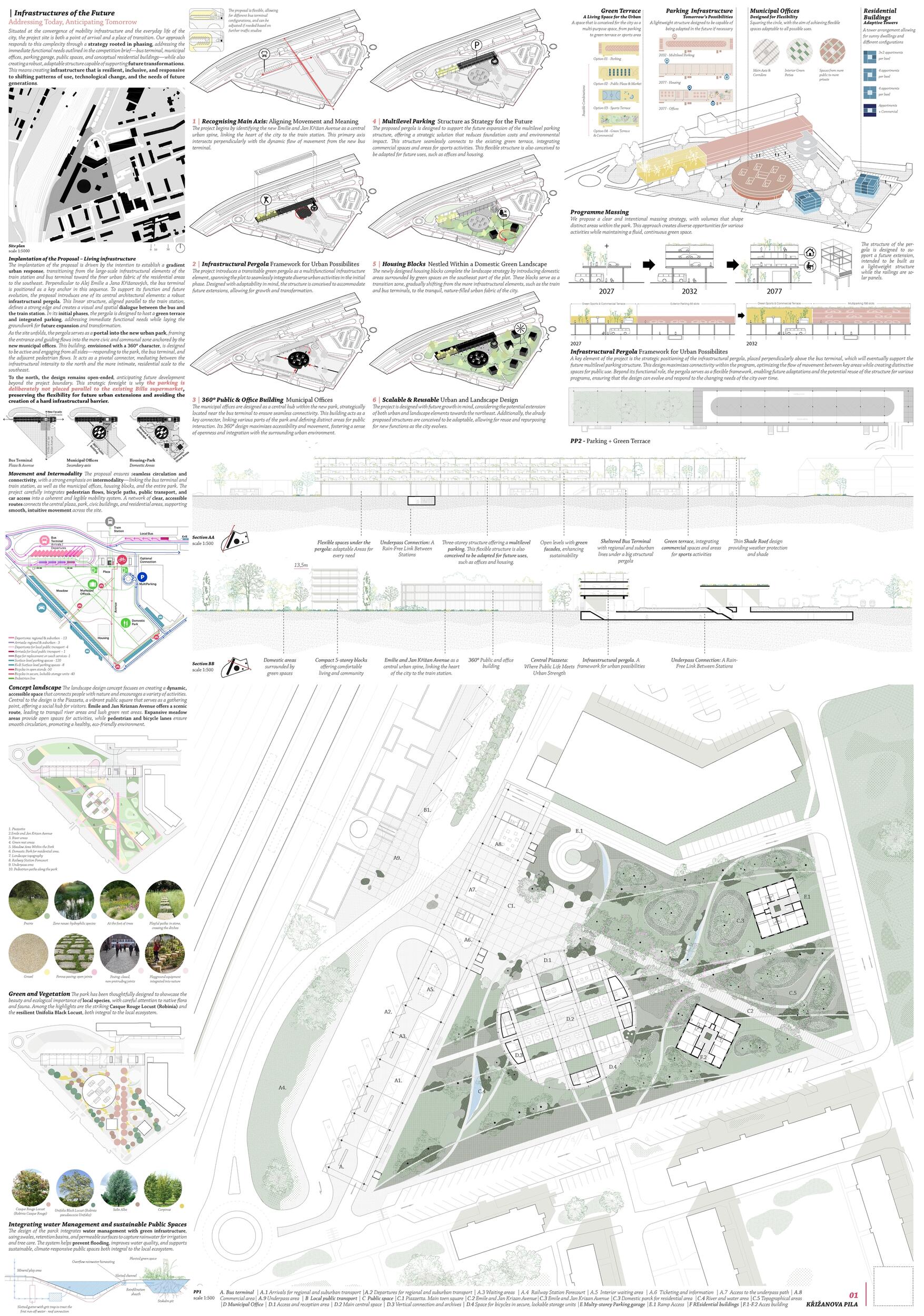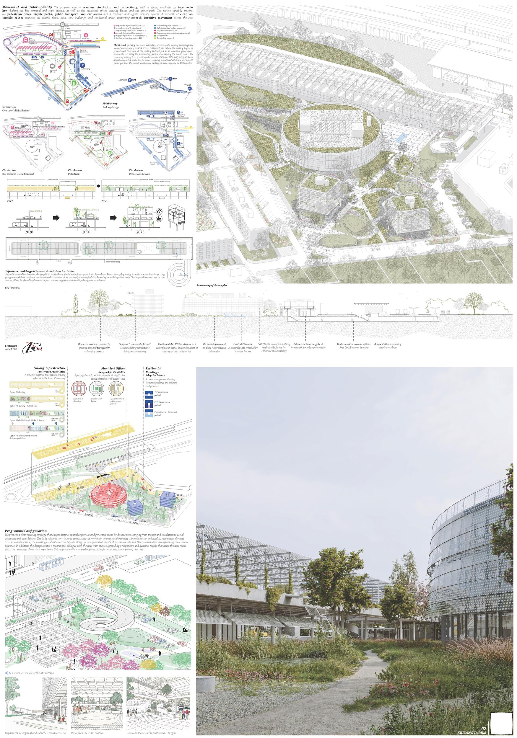 Situated at the convergence of mobility infrastructure and the everyday life of the city, the project site is both a point of arrival and a place of transition. Our approach responds to this complexity through a strategy rooted in phasing, addressing the immediate functional needs outlined in the competition brief, bus terminal, municipal offices, parking garage, public spaces, and residential buildings, while also creating a robust, adaptable structure capable of supporting future transformations. This means creating infrastructure that is resilient, inclusive, and responsive to shifting patterns of use, technological change, and the needs of future generations.