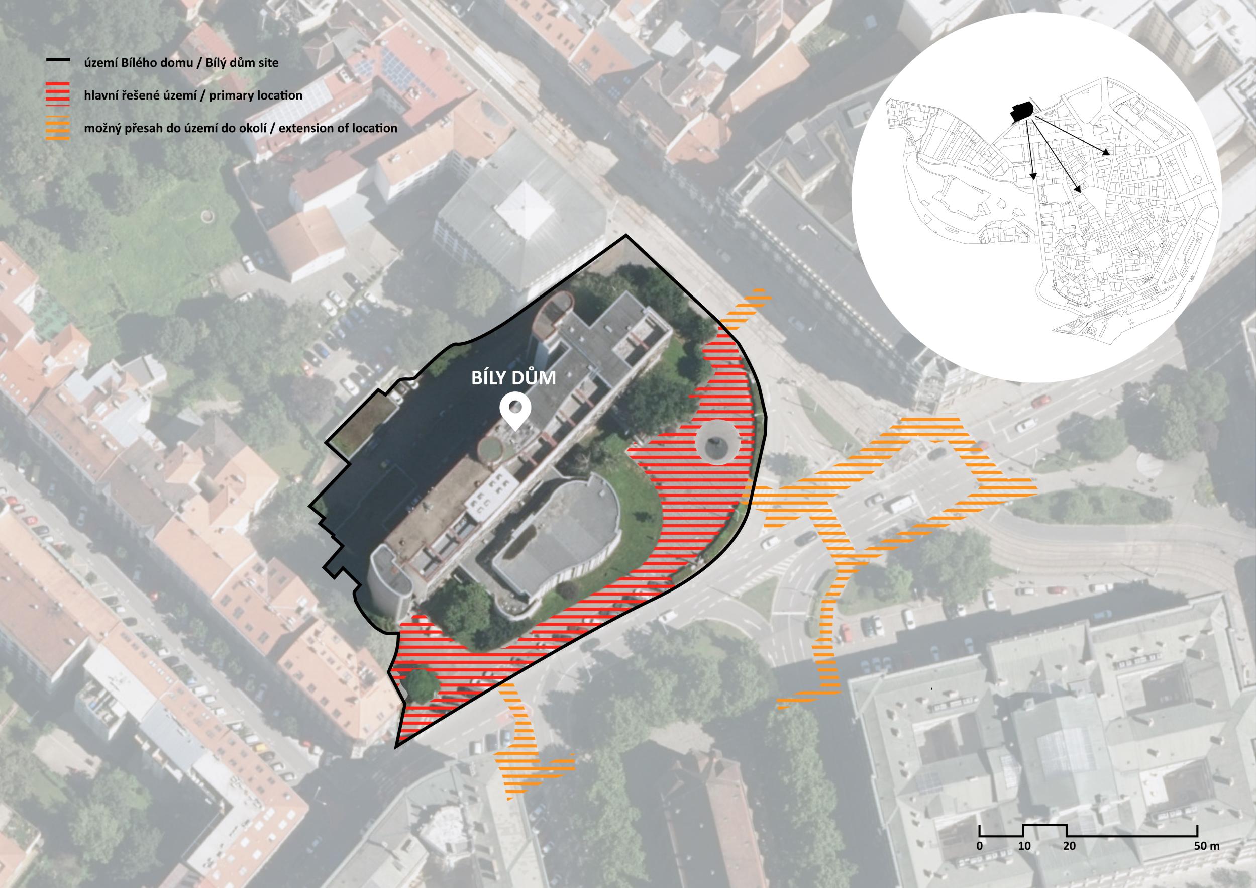 Bílý dům- White house, a unique building of post-war modernism in the city centre, formerly served as the City Committee of the communist Party of Czechoslovakia. Today it houses a children‘s polyclinic, a primary school, a 300- seat auditorium and a café. The polyclinic is supposed to move to a new building in 2027 and the future development of the White House is not yet certain. The art work is expected to serve the building until the change of its use. The aim of the artistic intervention is not only to make the public space more pleasant for the city‘s residents and direct users of the building. It should also generate a deeper interest in the building and increase public involvement in the debate about its future. It is an important building owned by the City of Brno, the transformation of which could lead to the creation of a creative and cultural hub for the city.