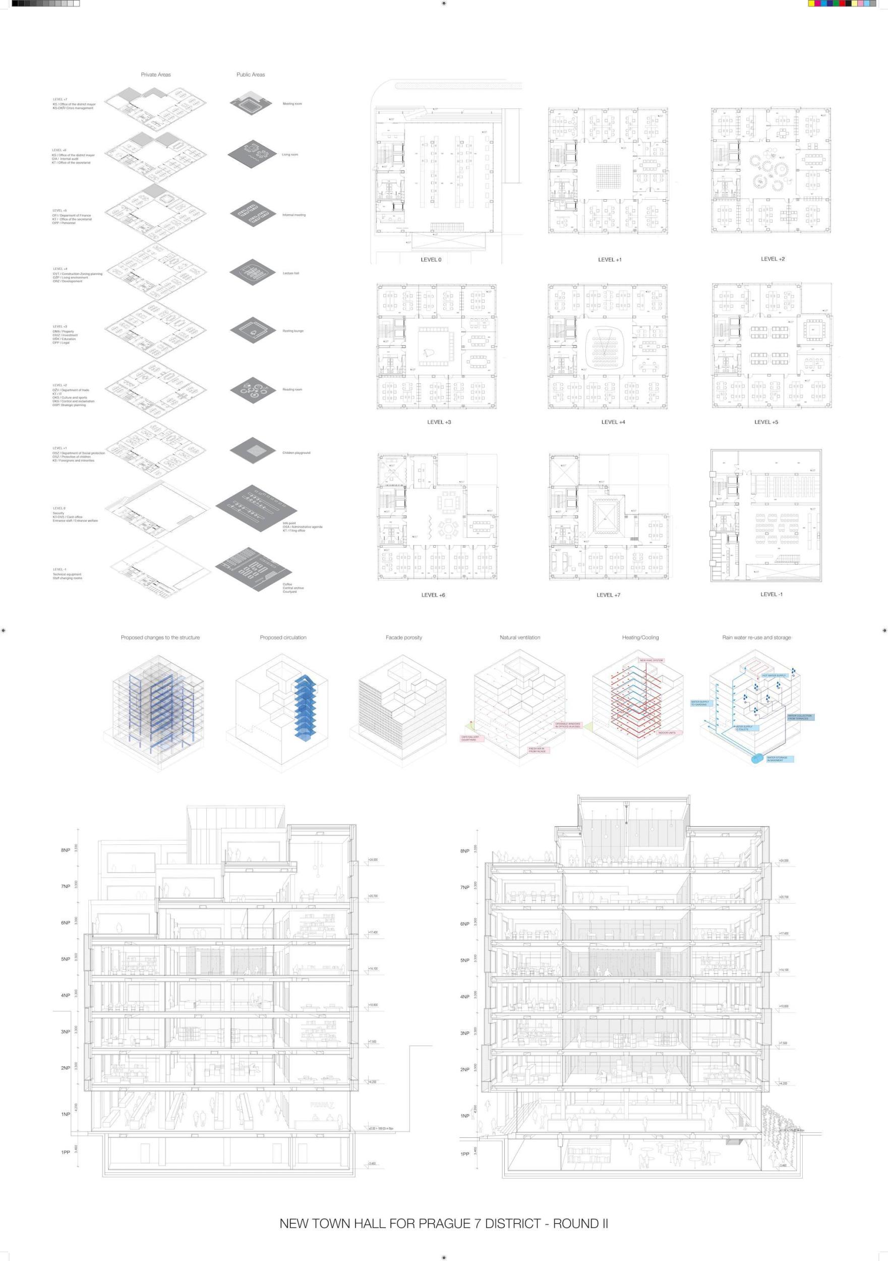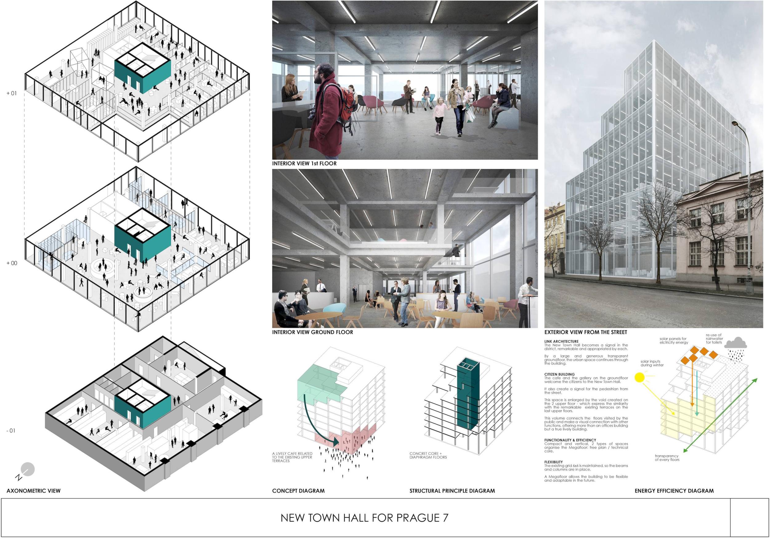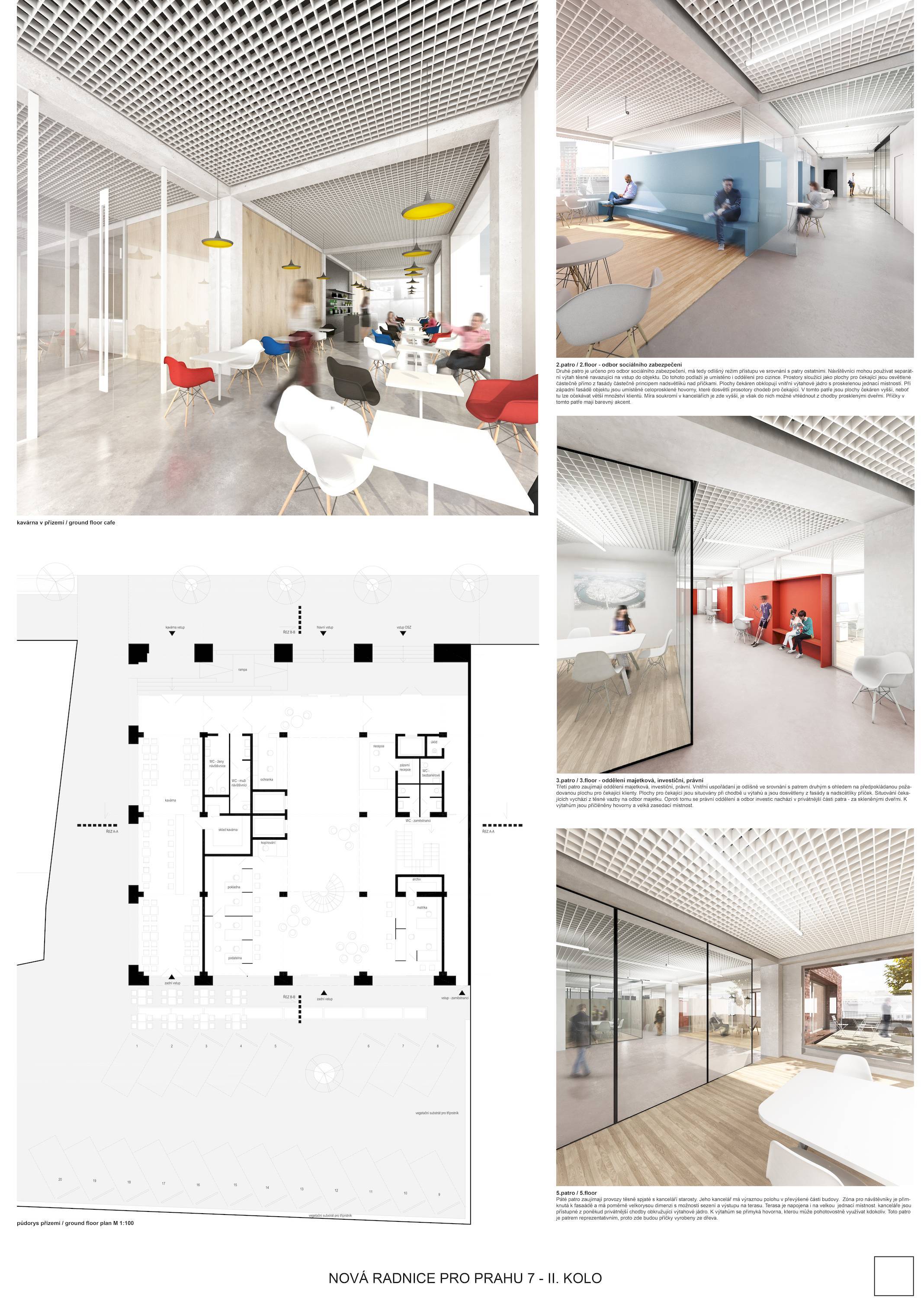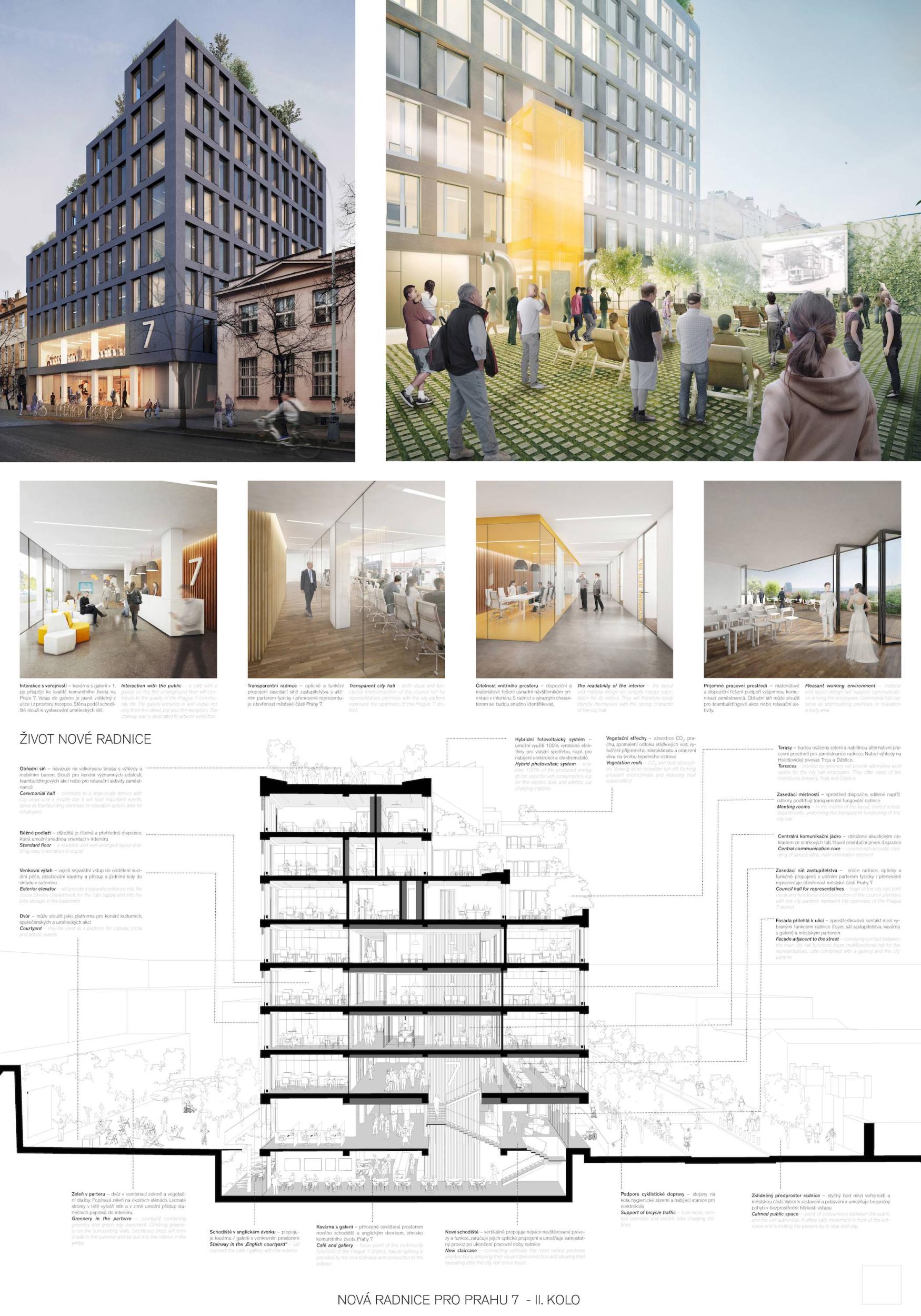 Jury evaluation: In this design, the jury particularly appreciated the simplicity and clarity of expression that aptly fits a public building, and the justified use of a basic architectural vocabulary working with contrasts of light and shadow, materiality and lightness. At the same time, it also praises the approach to reconstruction, respecting the extant structural system and the context in which the building is situated. However, the jury does have reservations regarding the conception of the ceremonial hall, which could be more generous in its expression and thus correspond better to the overall architecture of the building. Though it is a technologically standard project, it allows space for further development in terms of energy sustainability. Allowing for future technologies is itself a condition of the realisation of the project, as well as the consideration of better integration of renewable energy sources into the building’s concept. Equally important will be the investigation of the current structure, the possibility of its greater exposure and coexistence with the necessary technical equipment of the building.
