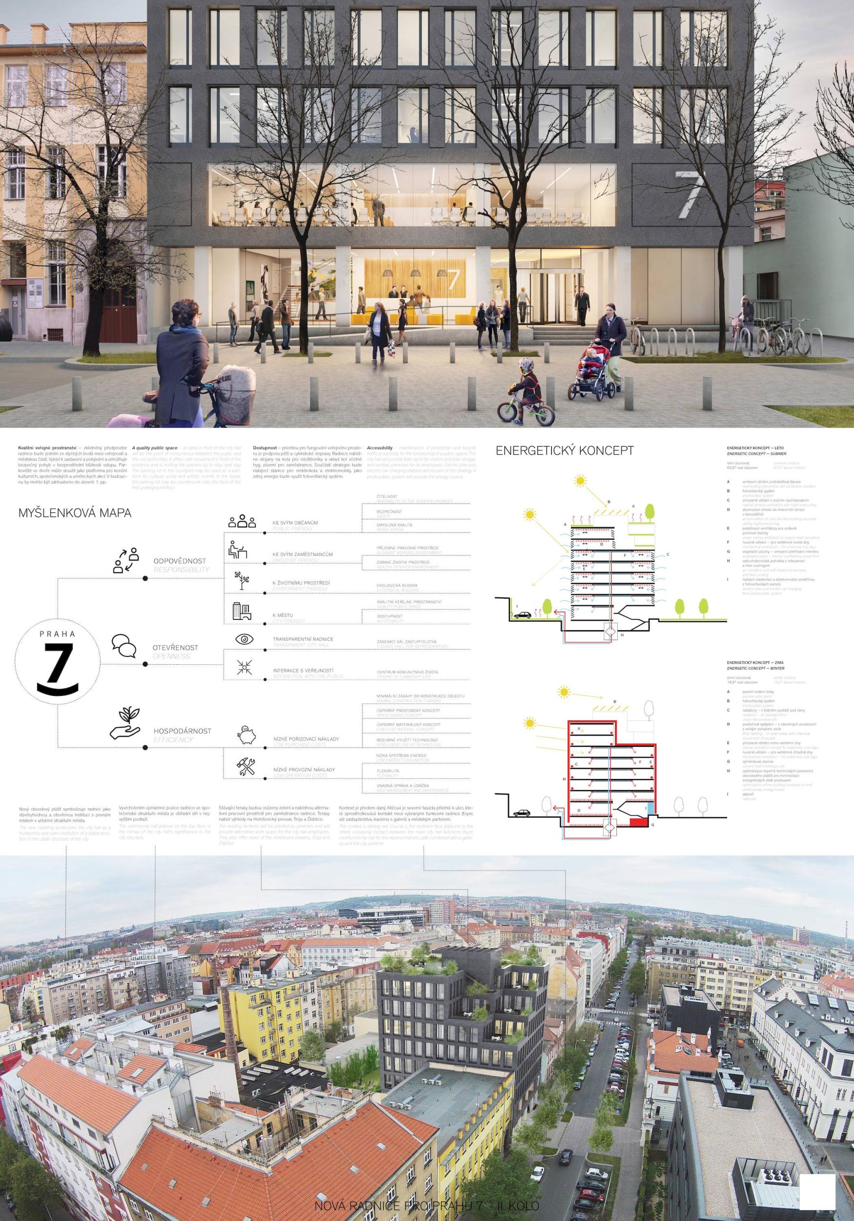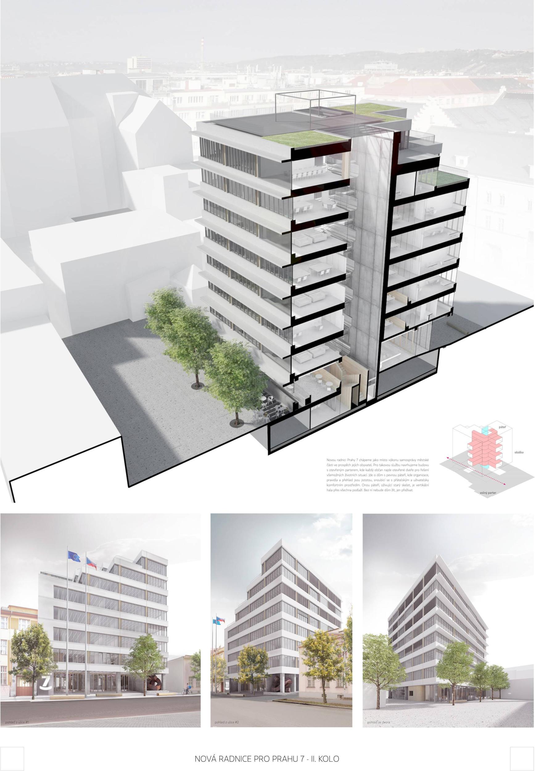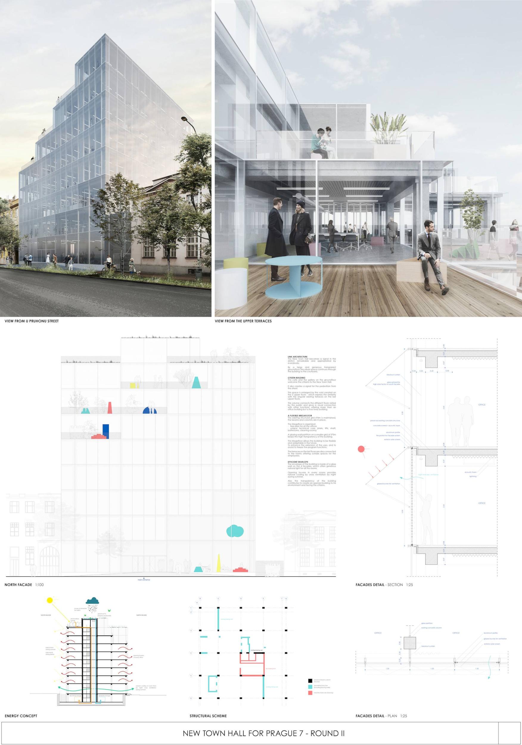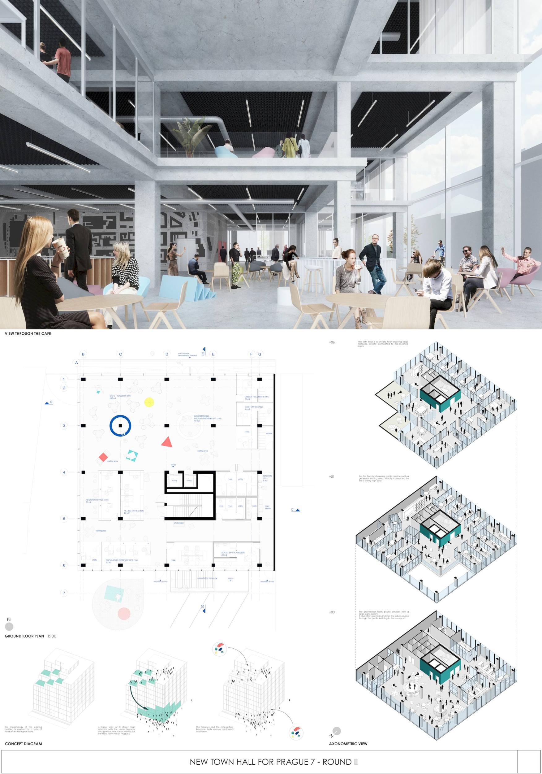 Jury evaluation: In this design, the jury particularly appreciated the simplicity and clarity of expression that aptly fits a public building, and the justified use of a basic architectural vocabulary working with contrasts of light and shadow, materiality and lightness. At the same time, it also praises the approach to reconstruction, respecting the extant structural system and the context in which the building is situated. However, the jury does have reservations regarding the conception of the ceremonial hall, which could be more generous in its expression and thus correspond better to the overall architecture of the building. Though it is a technologically standard project, it allows space for further development in terms of energy sustainability. Allowing for future technologies is itself a condition of the realisation of the project, as well as the consideration of better integration of renewable energy sources into the building’s concept. Equally important will be the investigation of the current structure, the possibility of its greater exposure and coexistence with the necessary technical equipment of the building.