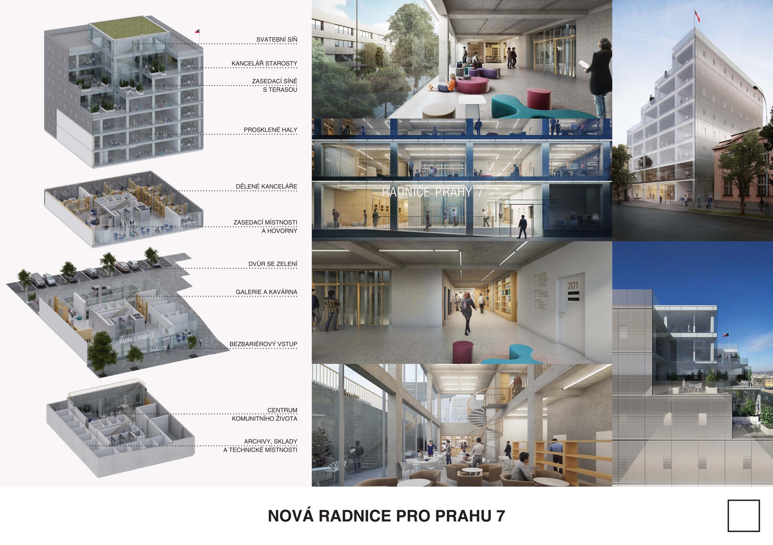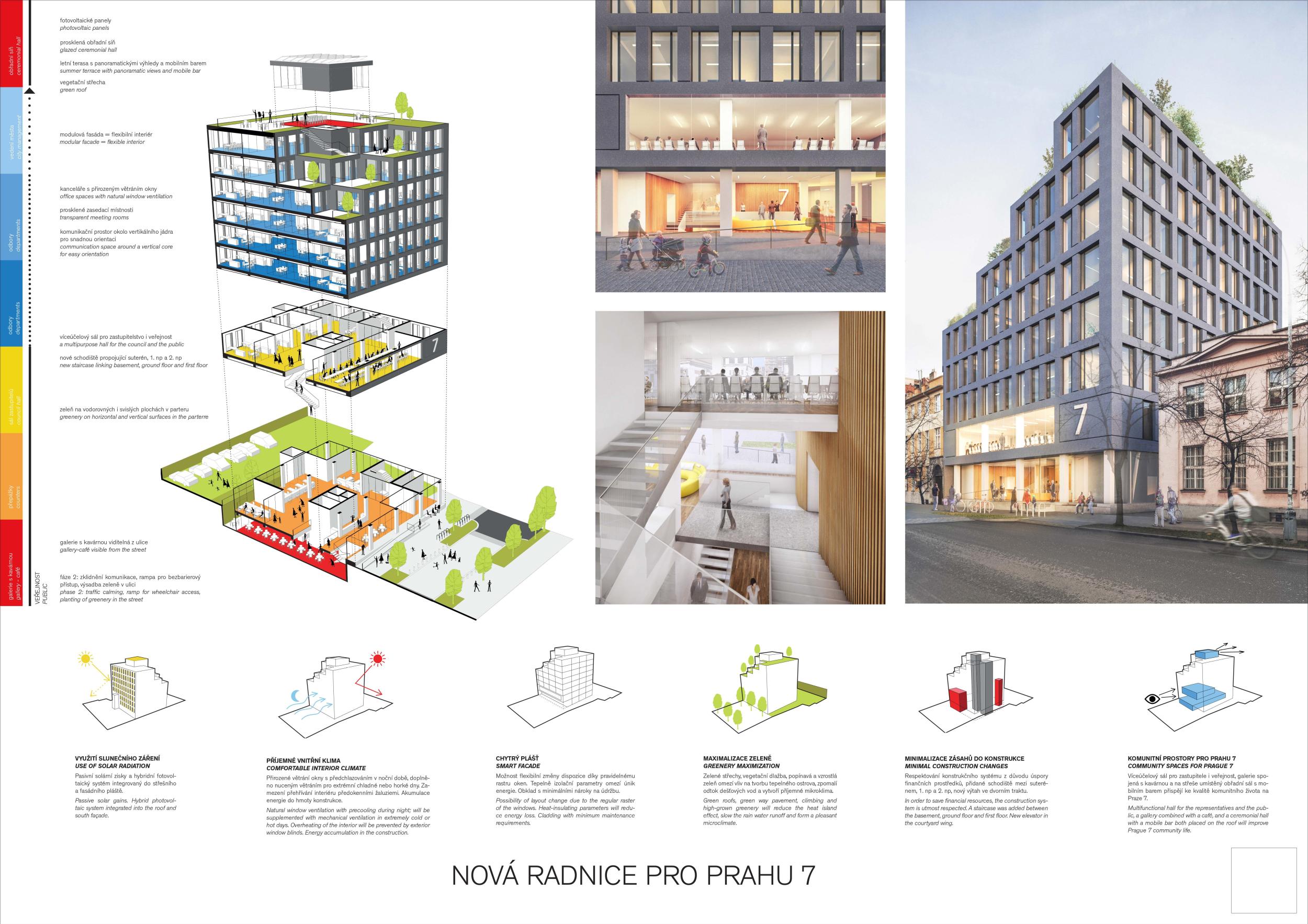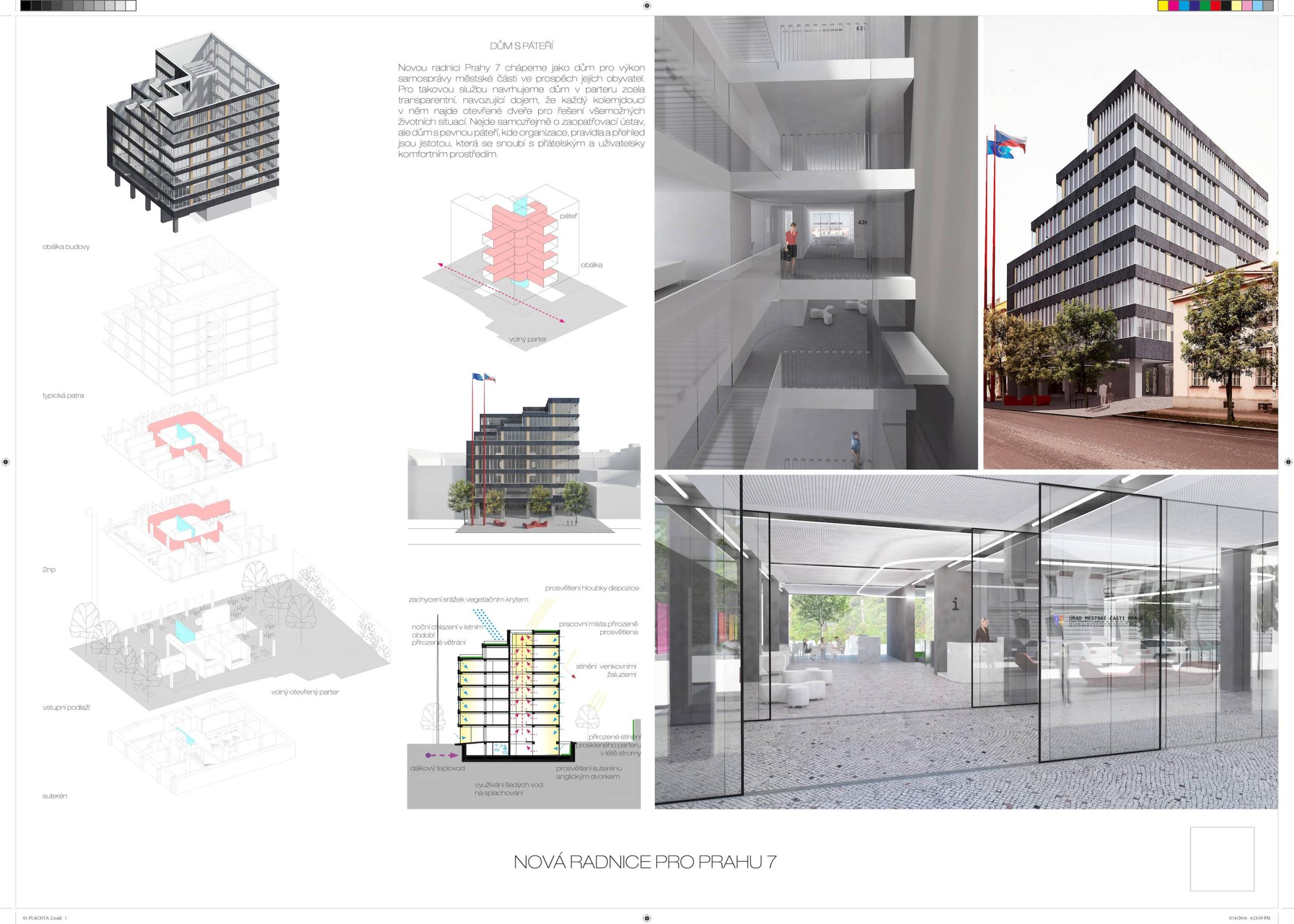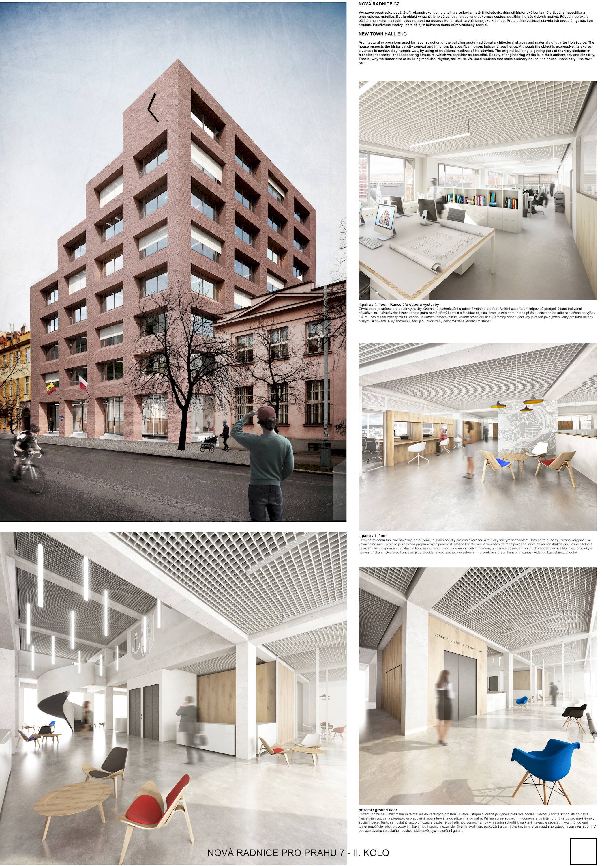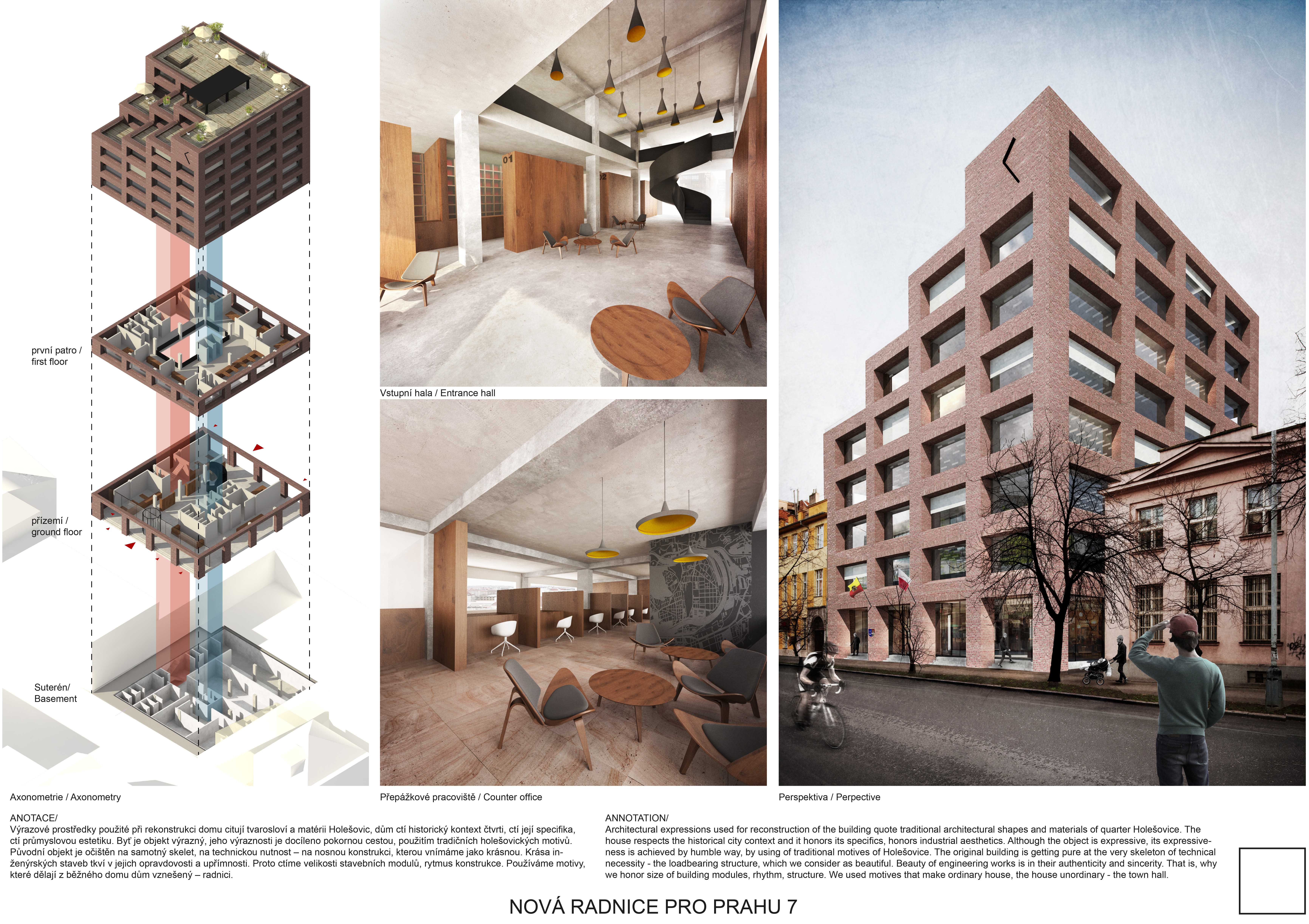 Architectural expressions used for reconstruction of the building quote traditional architectural shapes and materials of quarter Holešovice. The house respects the historical city context and it honors its specifics, honors industrial aesthetics. Although the object is expressive, its expressiveness is achieved by humble way, by using of traditional motives of Holešovice. The original building is getting pure at the very skeleton of technical necessity - the loadbearing structure, which we consider as beautiful. Beauty of engineering works is in their authenticity and sincerity. That is, why we honor size of building modules, rhythm, structure. We used motives that make ordinary house, the house unordinary - the town hall.