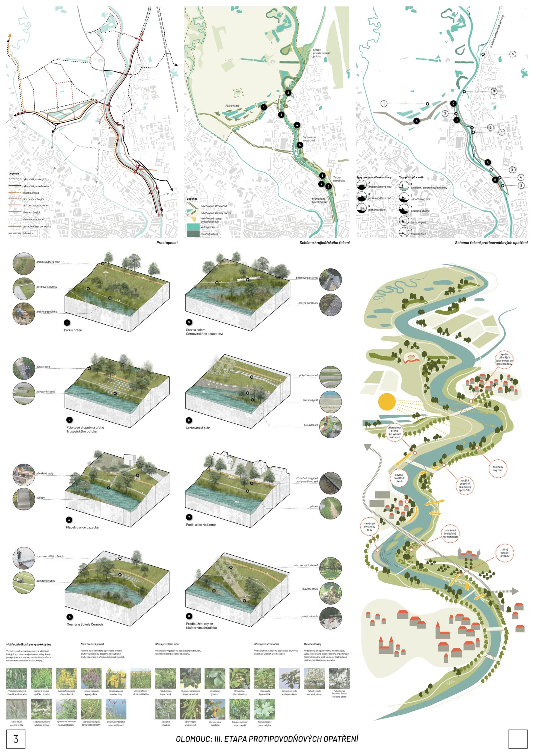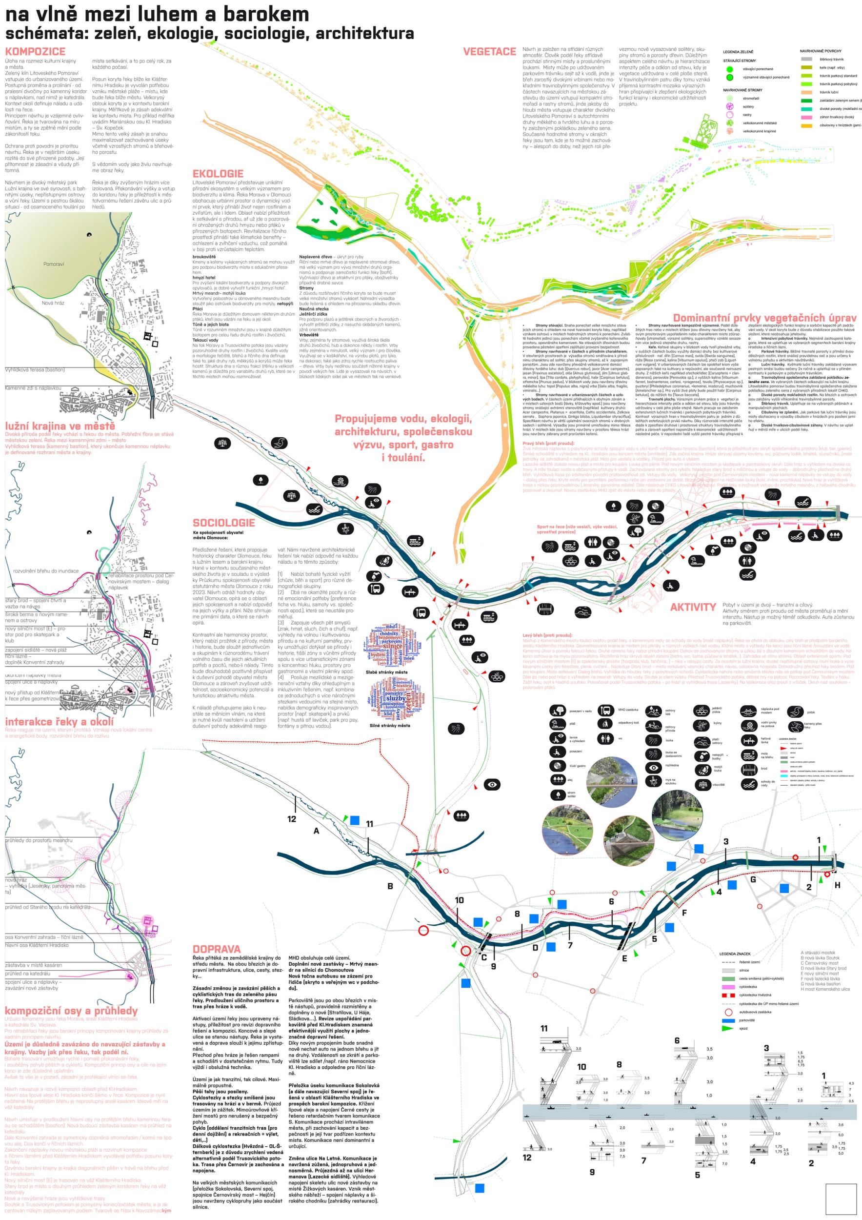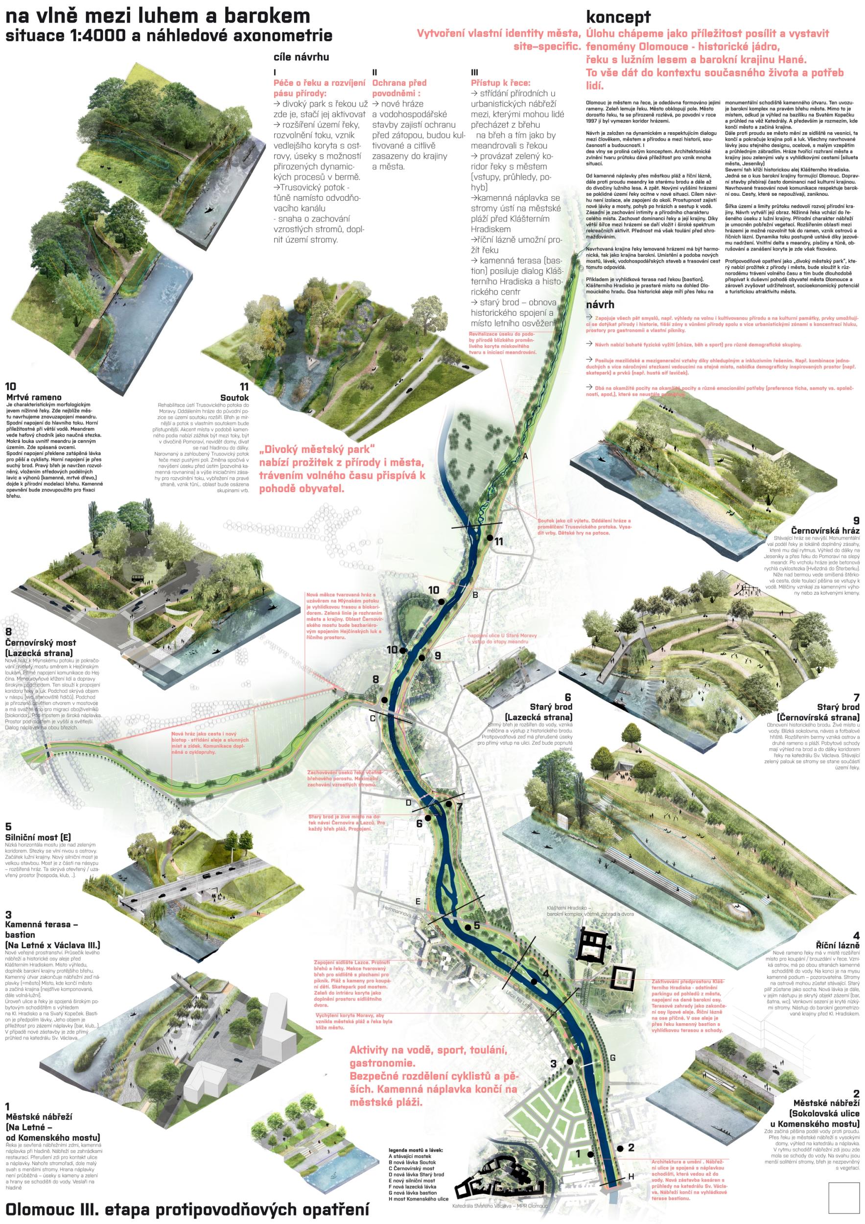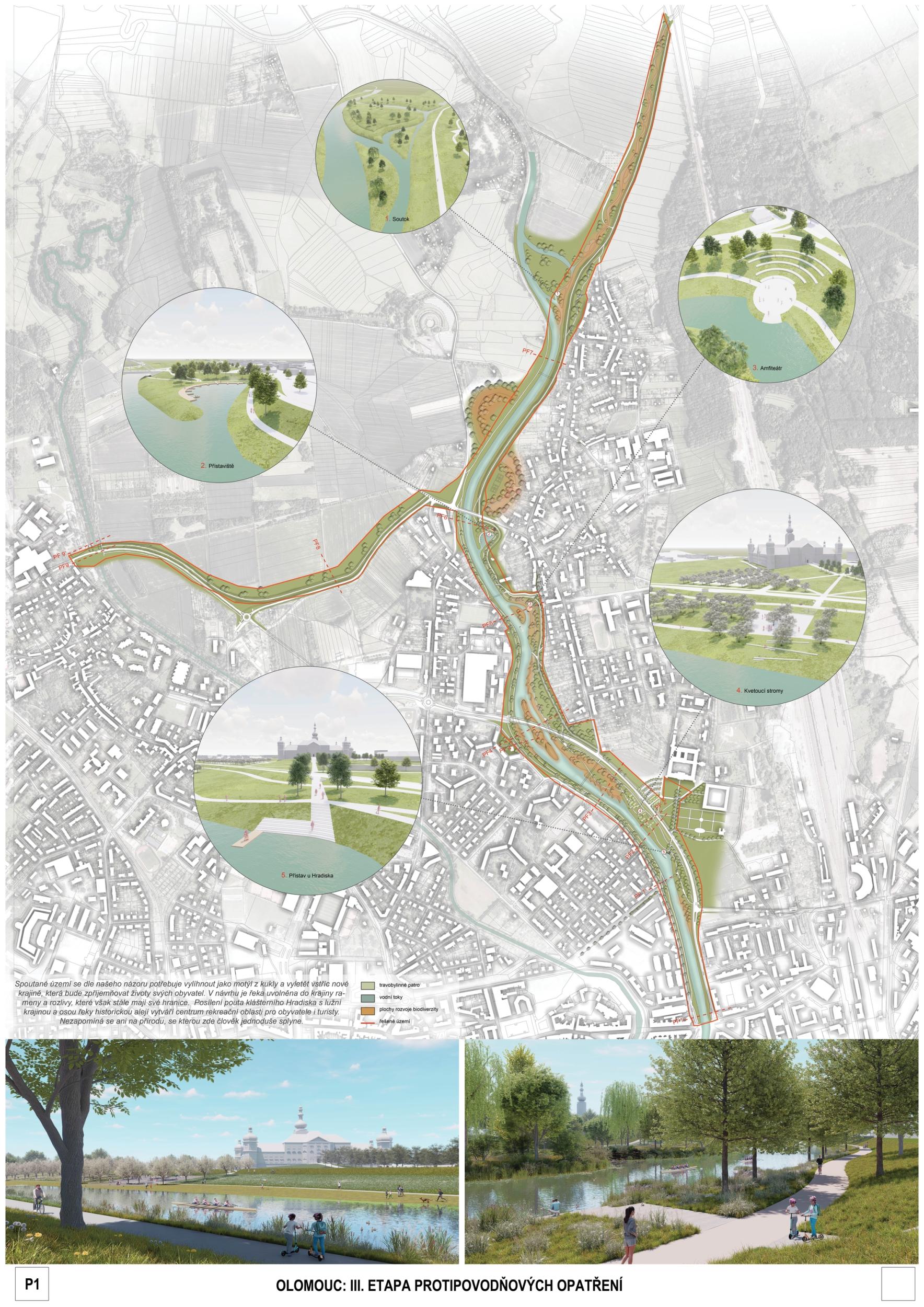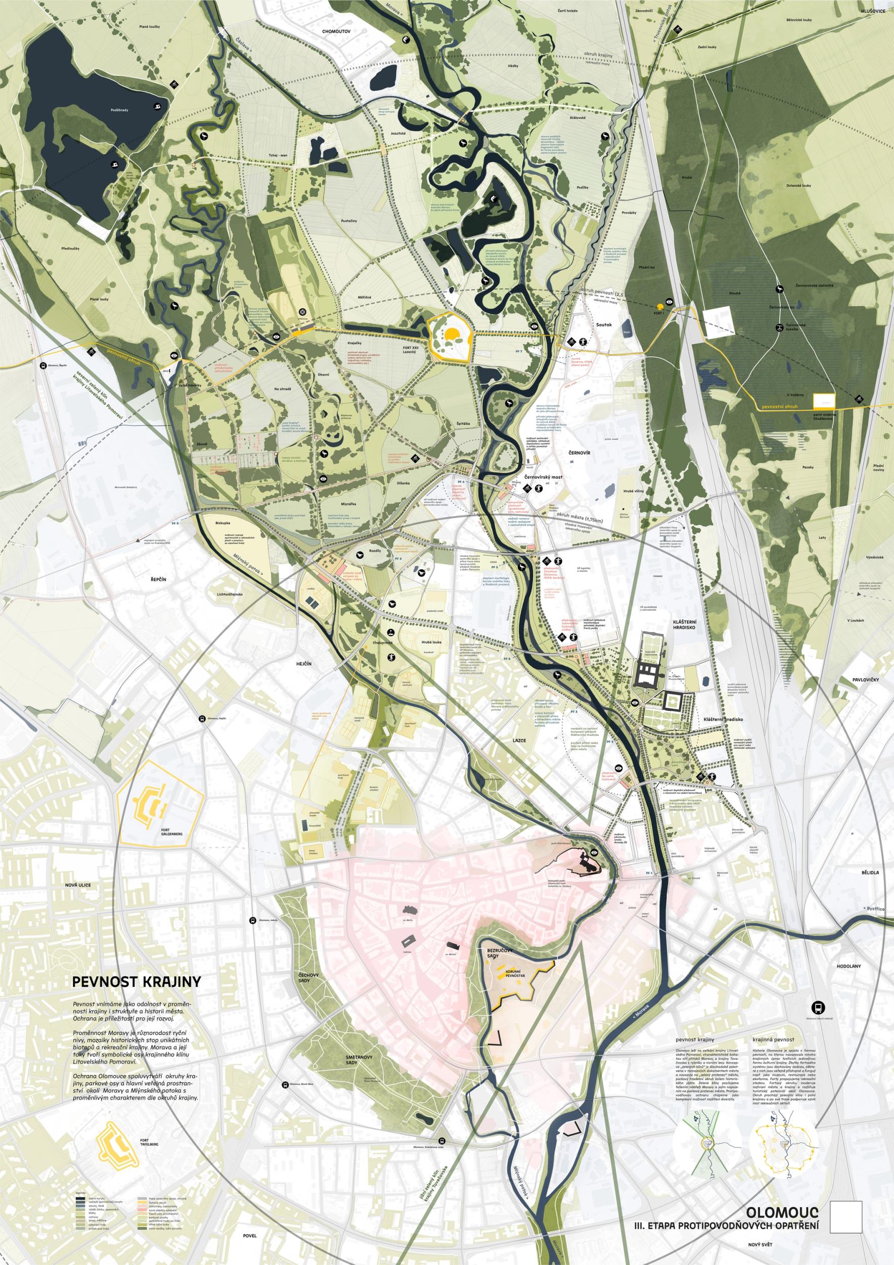 We see fortitude as resilience in the changing landscape and the city's structure and history. Conservation is an opportunity for its development. The variability of Moravia reflects the diversity of the river floodplain, the mosaic of historic traces of unique habitats and recreational landscapes. The Morava and its streams form symbolic axes of the landscape wedge of Litovel Pomoravie. The protection of Olomouc together creates landscape circuits, park axes, and the main public spaces around the Morava and the Mill Stream, which have a variable character according to the landscape circuits.