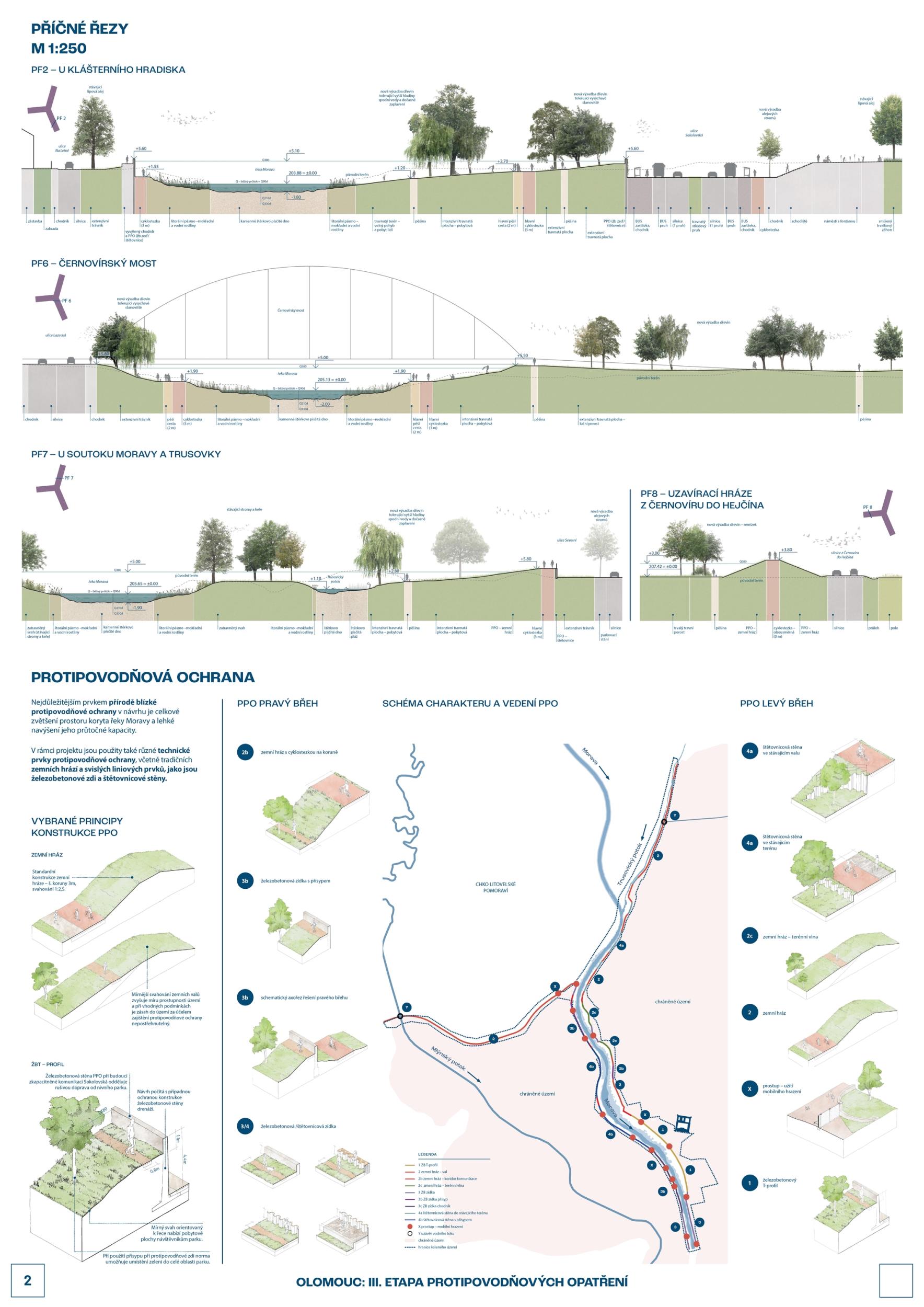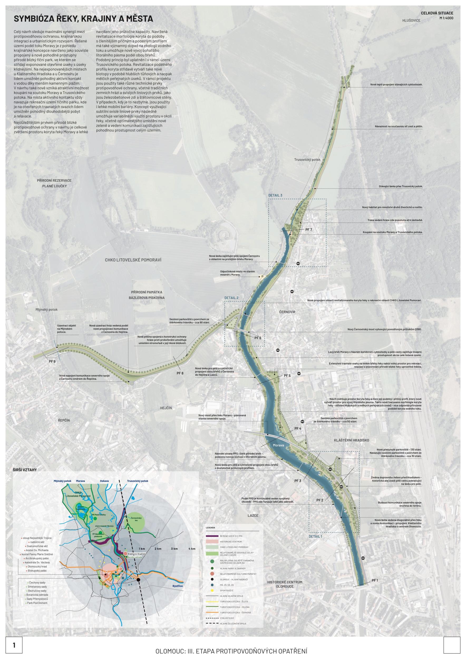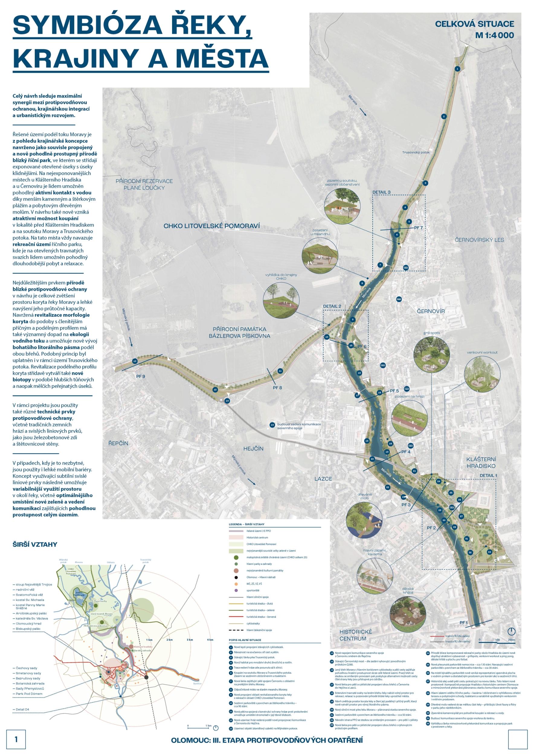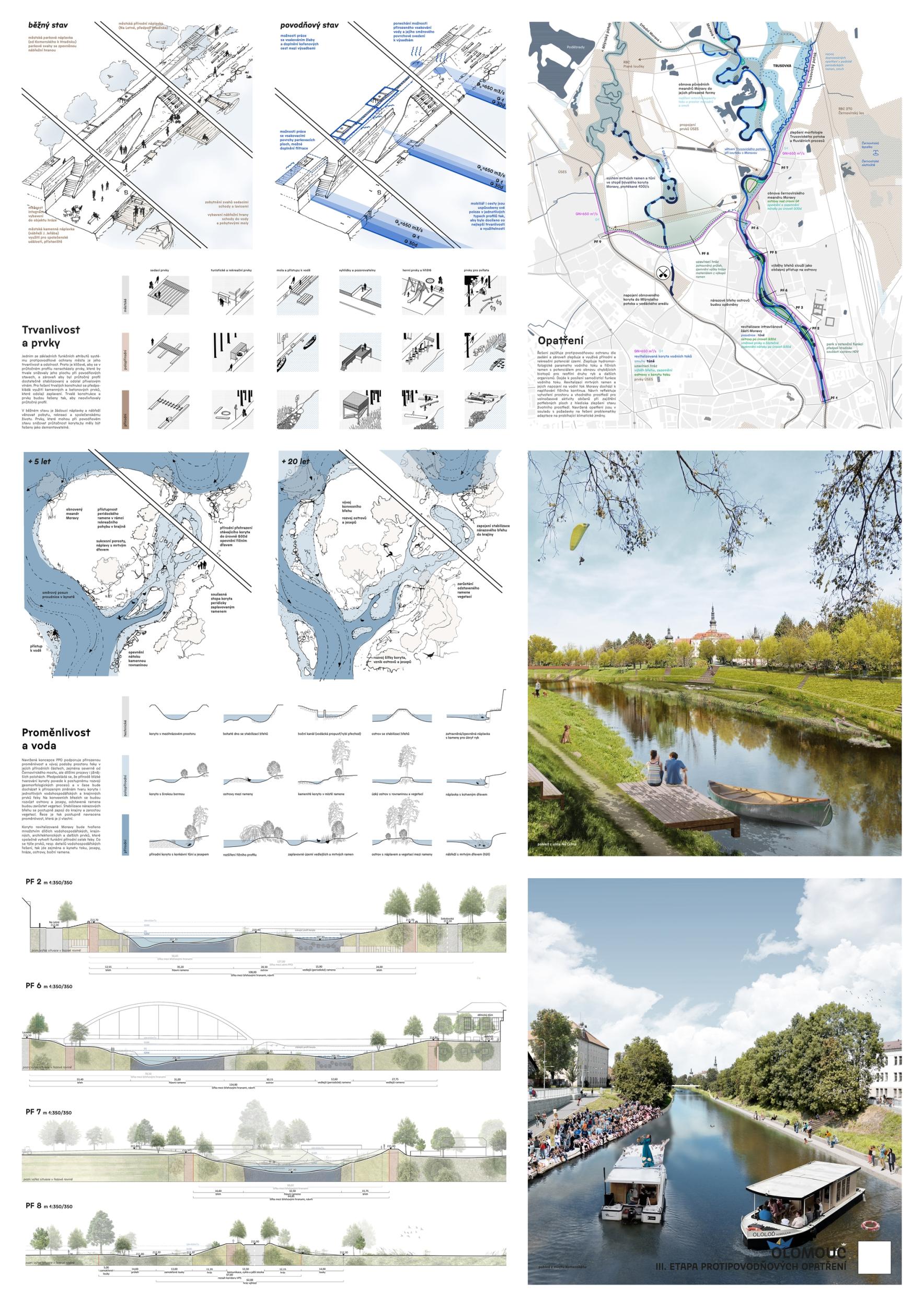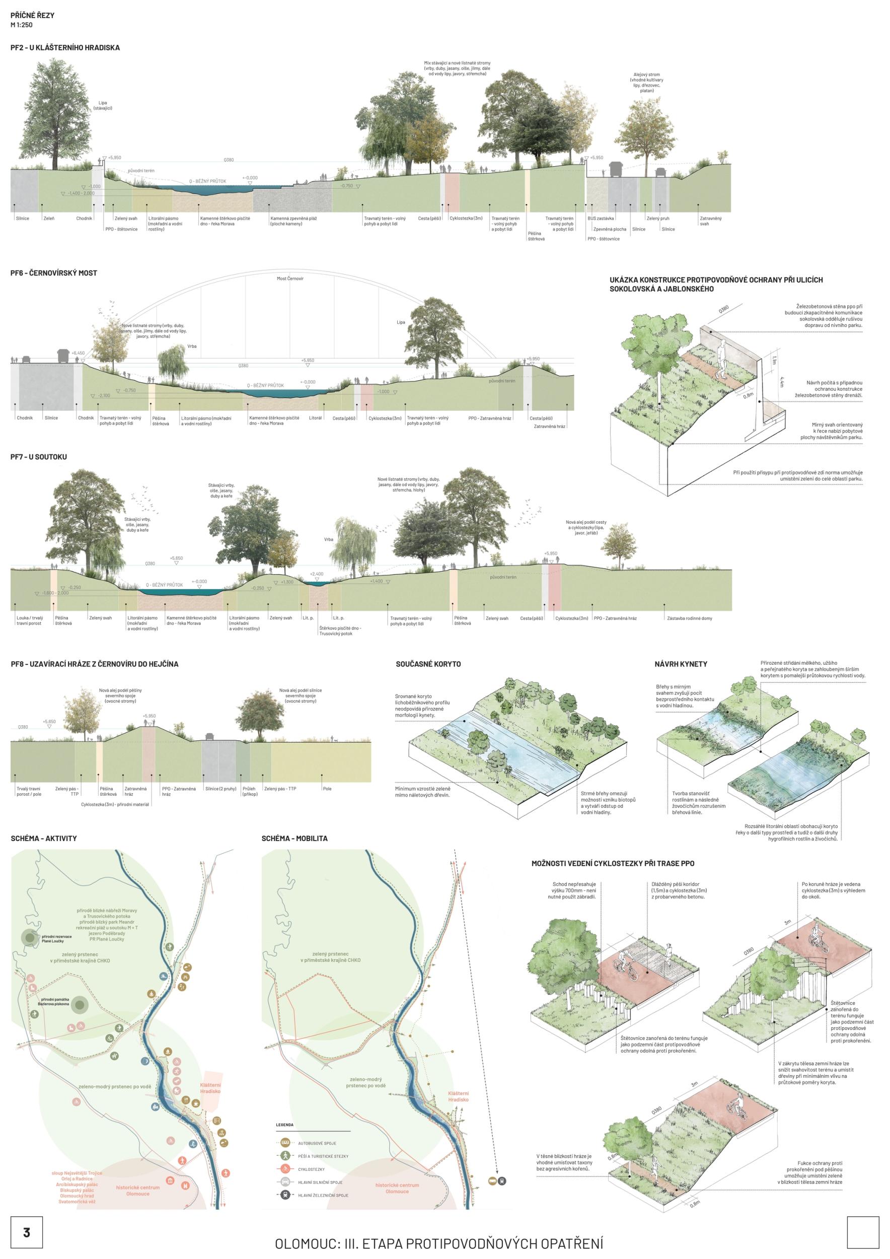We see fortitude as resilience in the changing landscape and the city's structure and history. Conservation is an opportunity for its development. The variability of Moravia reflects the diversity of the river floodplain, the mosaic of historic traces of unique habitats and recreational landscapes. The Morava and its streams form symbolic axes of the landscape wedge of Litovel Pomoravie. The protection of Olomouc together creates landscape circuits, park axes, and the main public spaces around the Morava and the Mill Stream, which have a variable character according to the landscape circuits.