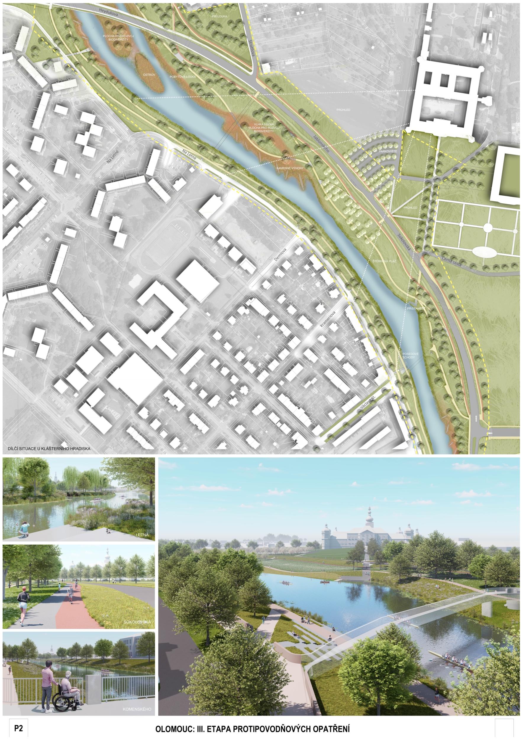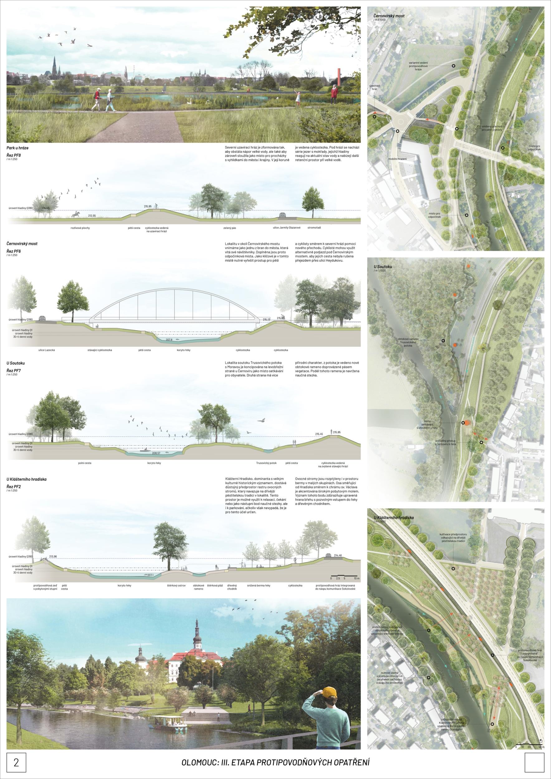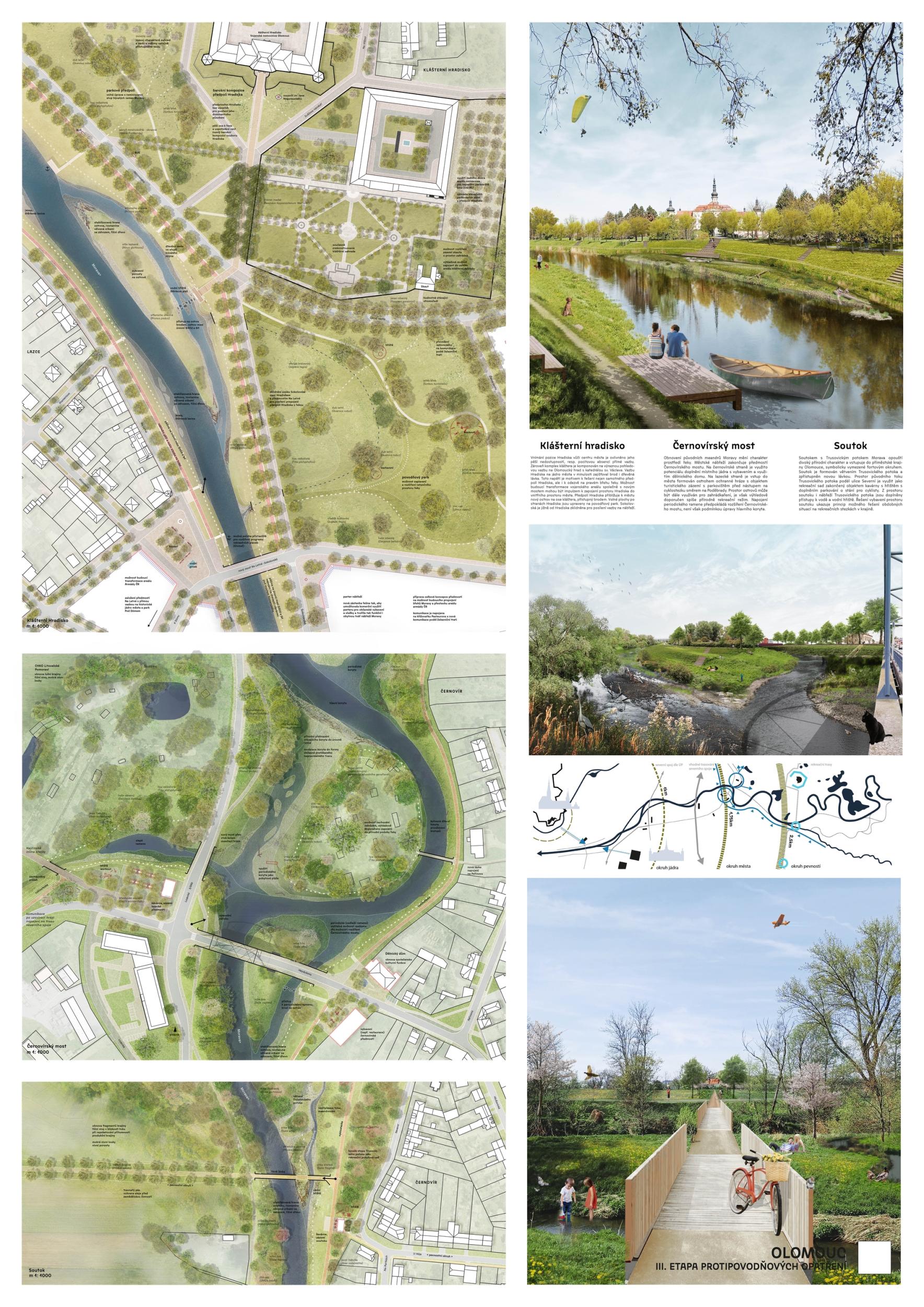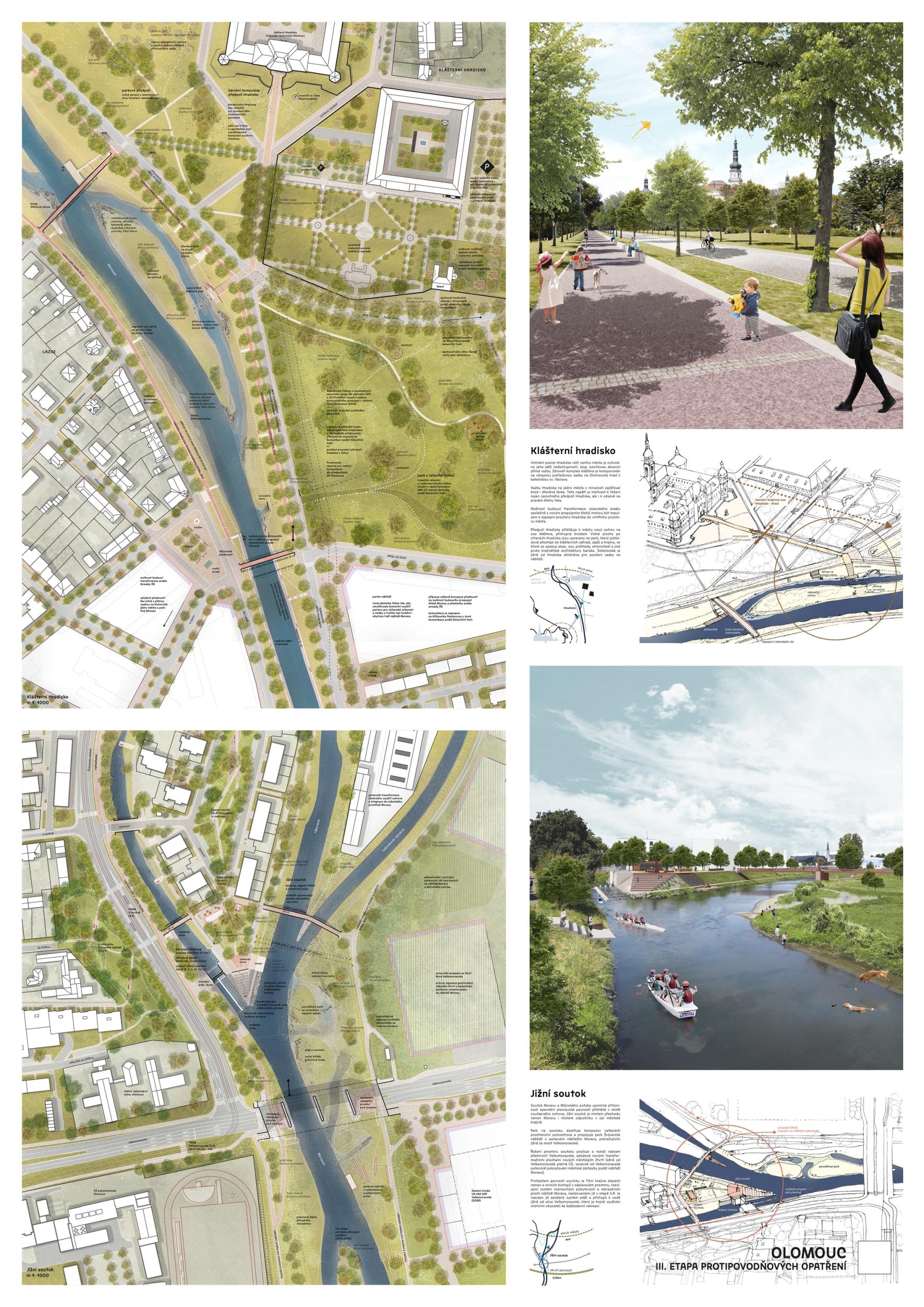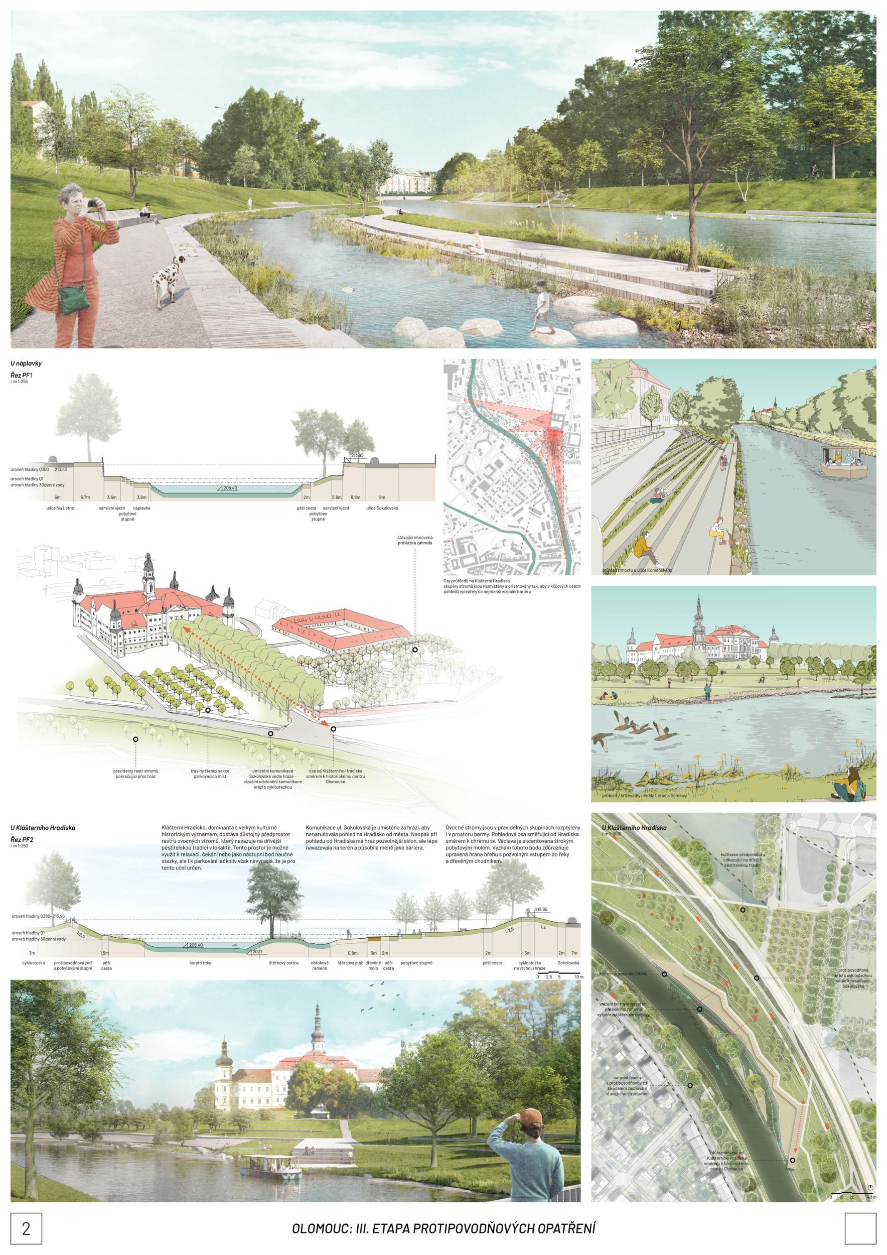 The first prize-winning design impressed the jury with its broad conceptual grasp of the area and its interconnectedness with the wider surroundings. It convincingly defines the centre, its relationship to the city, and its connection to other urban and natural structures. Its strength is also its argumentative base, which provides a solid basis for future implementation. The detailed phasing of the proposal allows for its gradual implementation and advocates wider intervention beyond the study area. From a functional point of view, the proposal is well thought out, although some elements are controversial. The transport solution is ambitious and works with a horizon of more than 50 years, but this will have to be adapted to the current conditions; the transport proposal does not correspond to the current master plan. With a more conservative approach to transportation, the proposal appears to be the clear favorite. However, slowing down through town and not limiting highway throughput may also be perceived as a disadvantage in terms of functional efficiency. From a compositional point of view, there is an apparent attempt to reinterpret the Baroque structure, particularly in the routing of the roads and the figure of the crossing of the avenues and tree lines below the Castle. This solution may seem incomprehensible and does not fully correspond to contemporary urban planning principles. Still, at the same time, it has the potential to support the logic of the traffic design. The proposal shows some reserves that can be used with different scales and characters of the territory. The transition between the natural and urban environment is handled relatively homogeneously in the proposal, leading to a lack of nuance between the different parts; the urban contact is not considered. The concept of biodiversity is questionable in some places - in specific locations, it appears to be an artificially implanted element without sufficient logic. One of the most significant risks of the proposal is its design in the most critical location - the response to flood risk is not yet sufficiently thought out. Positioning the main elements perpendicular to the flood can be problematic. However, the redesign may also lead to savings and a better logical layout. Another critical point is the conceptual and hydraulic non-functionality of the solution in the area in front of Hradisko - especially concerning the biodiversity island, whose location on the opposite bank would make more sense. The amphitheater's location in the biodiversity development area is also a question. In spite of these reservations, the proposal remains the best developed solution overall. Its high level of detail and elaboration makes it a convincing basis for the area's future development.