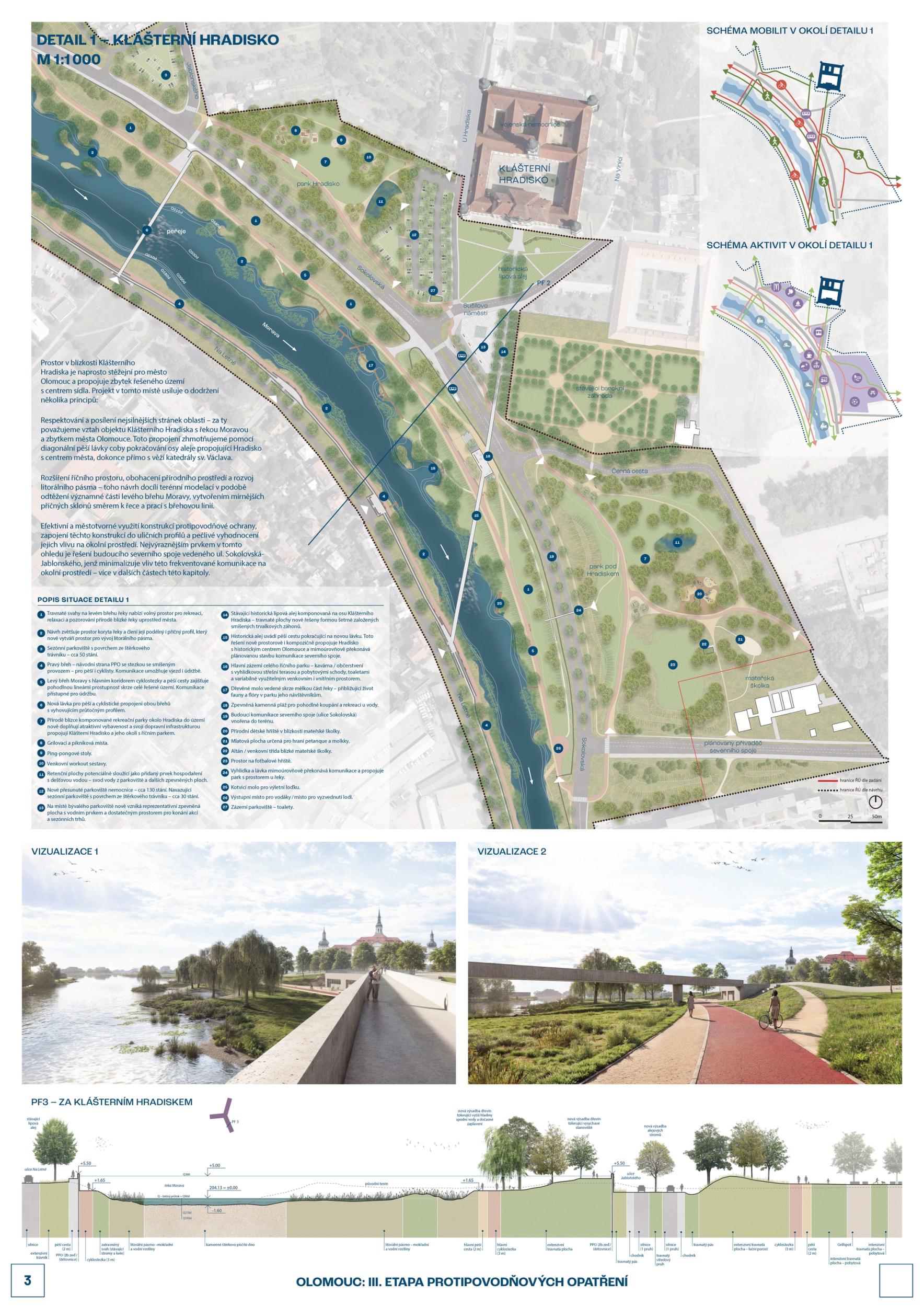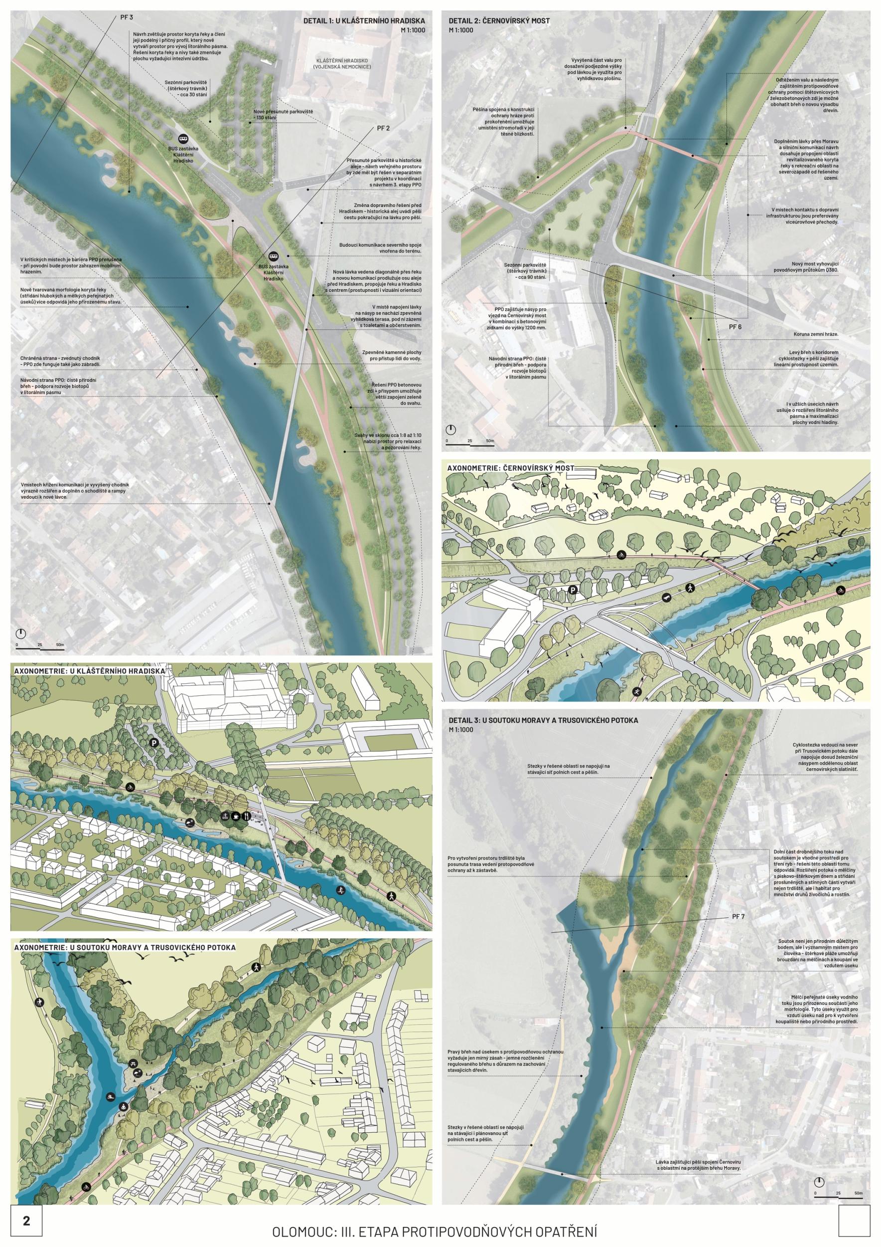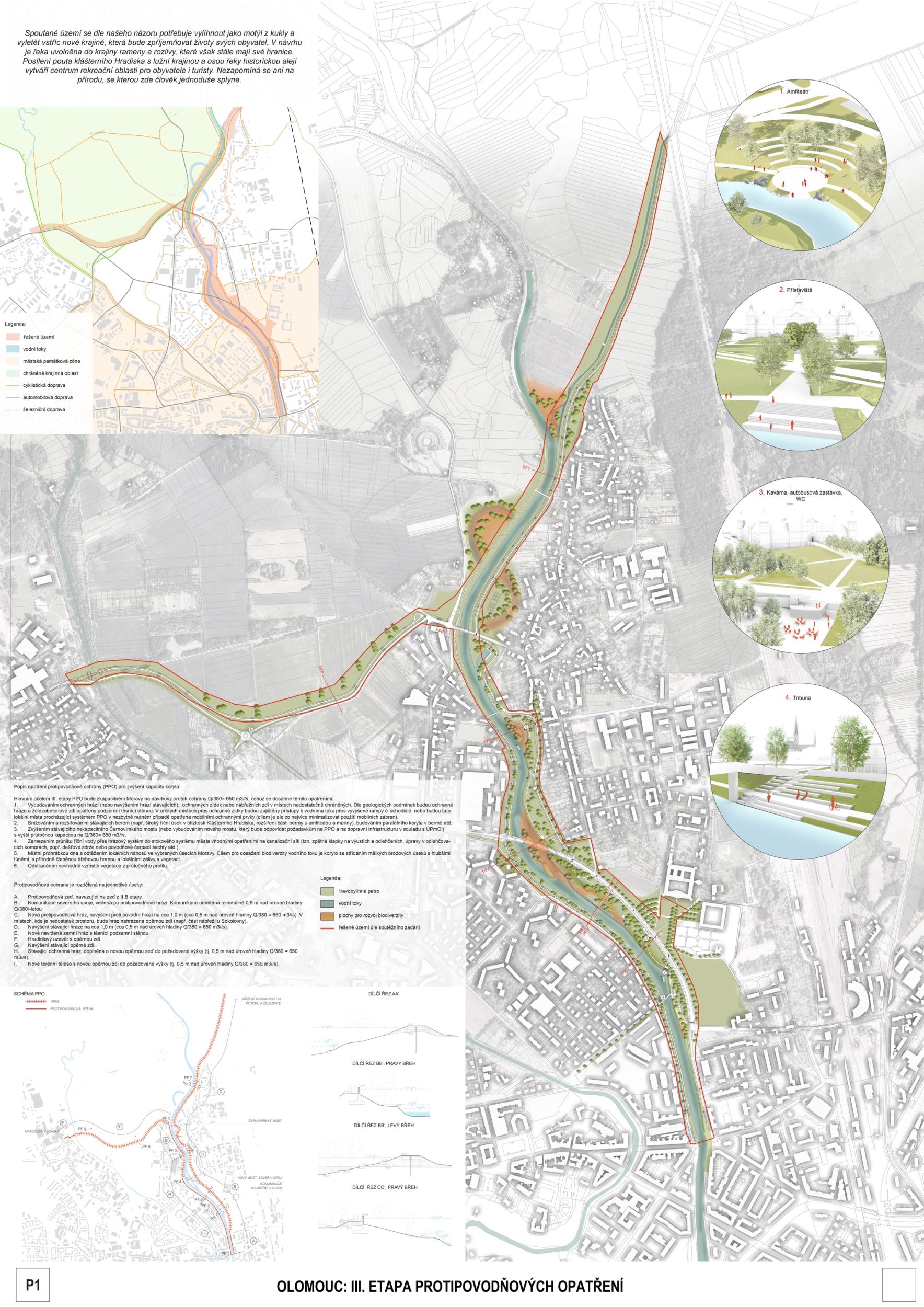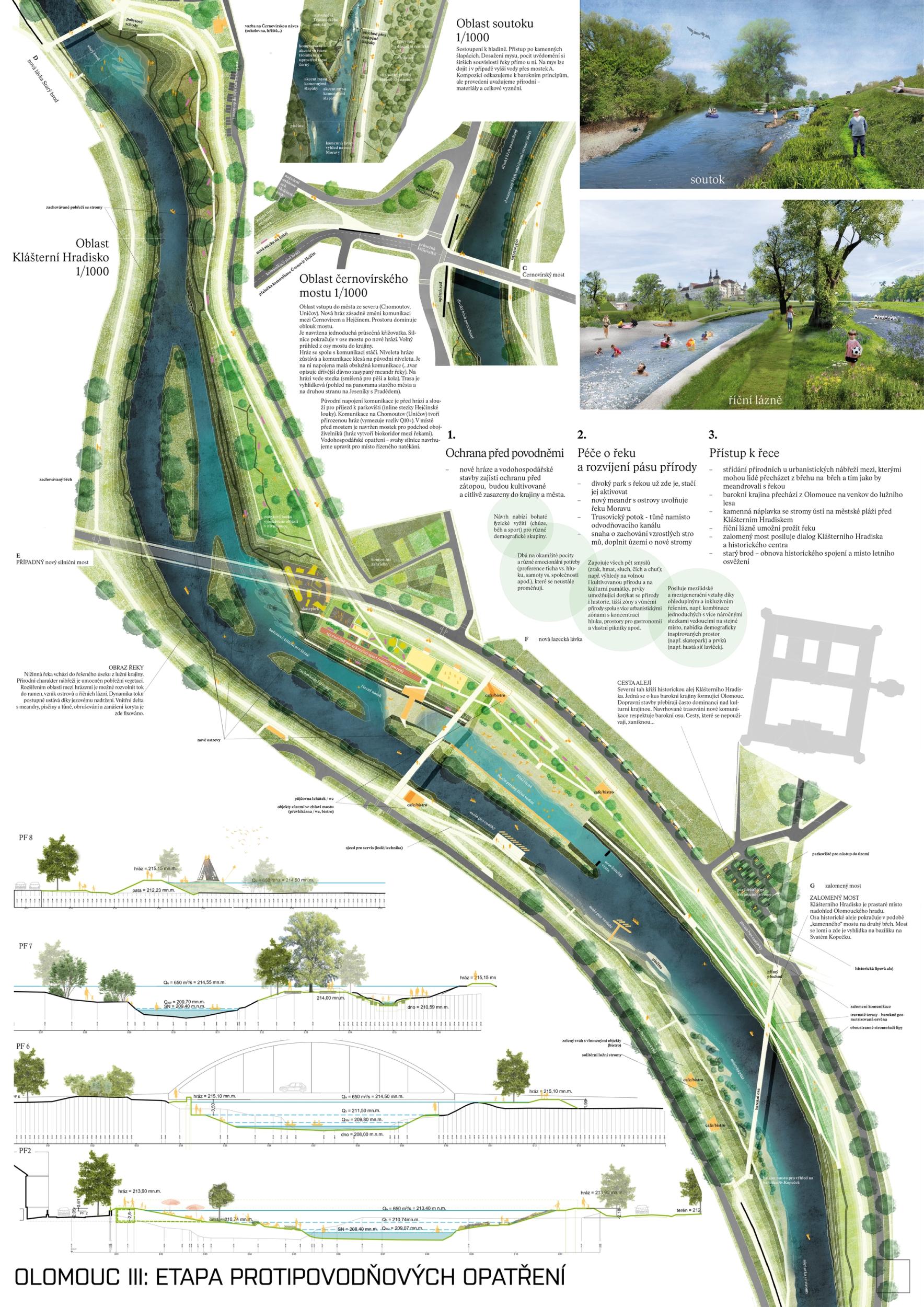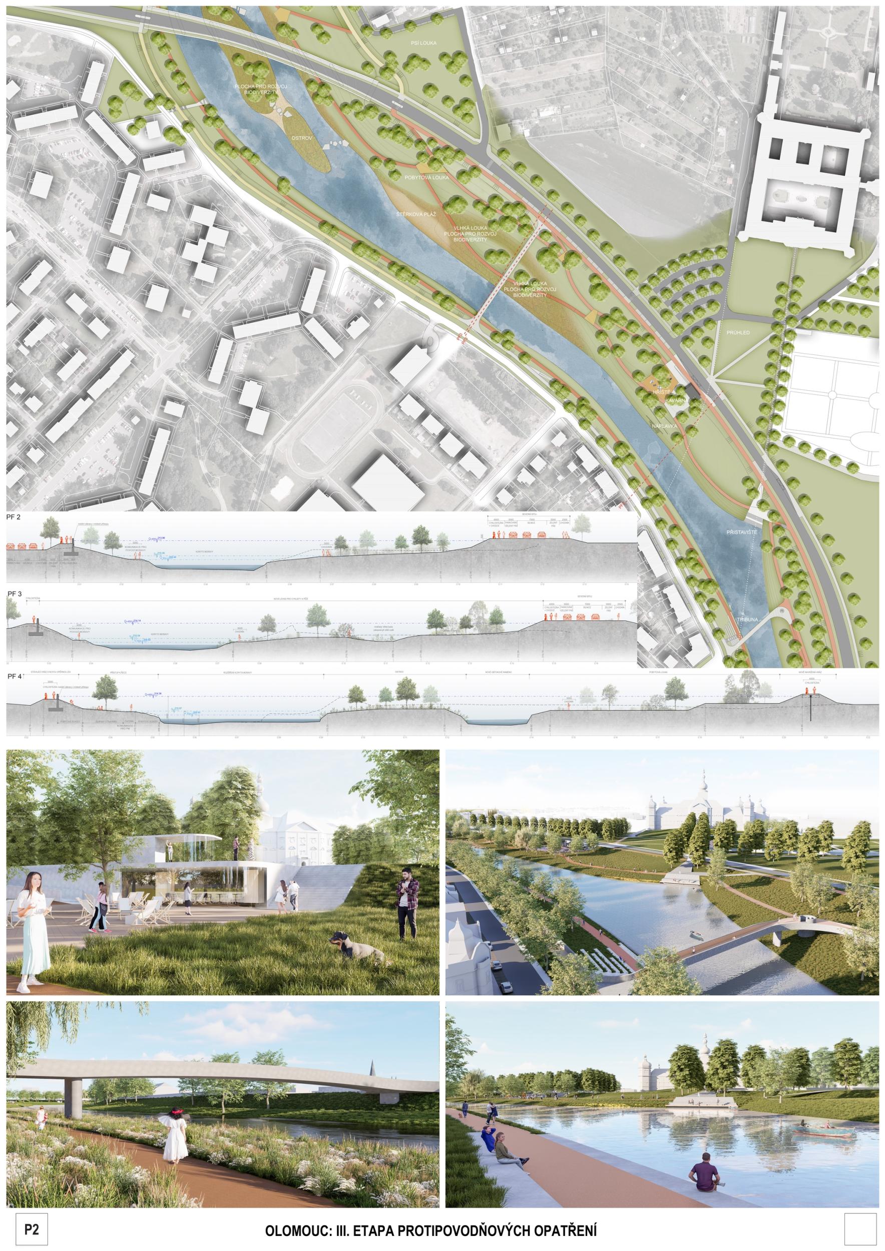 The first prize-winning design impressed the jury with its broad conceptual grasp of the area and its interconnectedness with the wider surroundings. It convincingly defines the centre, its relationship to the city, and its connection to other urban and natural structures. Its strength is also its argumentative base, which provides a solid basis for future implementation. The detailed phasing of the proposal allows for its gradual implementation and advocates wider intervention beyond the study area. From a functional point of view, the proposal is well thought out, although some elements are controversial. The transport solution is ambitious and works with a horizon of more than 50 years, but this will have to be adapted to the current conditions; the transport proposal does not correspond to the current master plan. With a more conservative approach to transportation, the proposal appears to be the clear favorite. However, slowing down through town and not limiting highway throughput may also be perceived as a disadvantage in terms of functional efficiency. From a compositional point of view, there is an apparent attempt to reinterpret the Baroque structure, particularly in the routing of the roads and the figure of the crossing of the avenues and tree lines below the Castle. This solution may seem incomprehensible and does not fully correspond to contemporary urban planning principles. Still, at the same time, it has the potential to support the logic of the traffic design. The proposal shows some reserves that can be used with different scales and characters of the territory. The transition between the natural and urban environment is handled relatively homogeneously in the proposal, leading to a lack of nuance between the different parts; the urban contact is not considered. The concept of biodiversity is questionable in some places - in specific locations, it appears to be an artificially implanted element without sufficient logic. One of the most significant risks of the proposal is its design in the most critical location - the response to flood risk is not yet sufficiently thought out. Positioning the main elements perpendicular to the flood can be problematic. However, the redesign may also lead to savings and a better logical layout. Another critical point is the conceptual and hydraulic non-functionality of the solution in the area in front of Hradisko - especially concerning the biodiversity island, whose location on the opposite bank would make more sense. The amphitheater's location in the biodiversity development area is also a question. In spite of these reservations, the proposal remains the best developed solution overall. Its high level of detail and elaboration makes it a convincing basis for the area's future development.