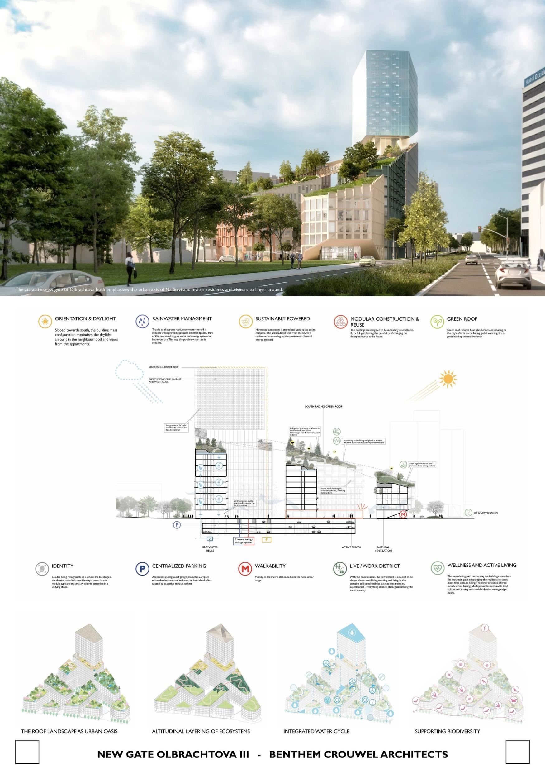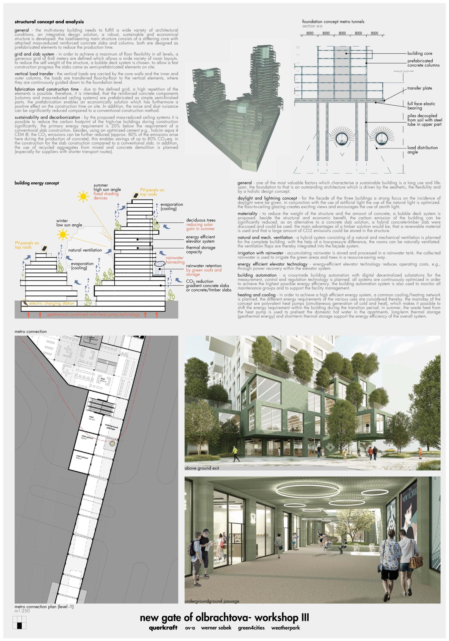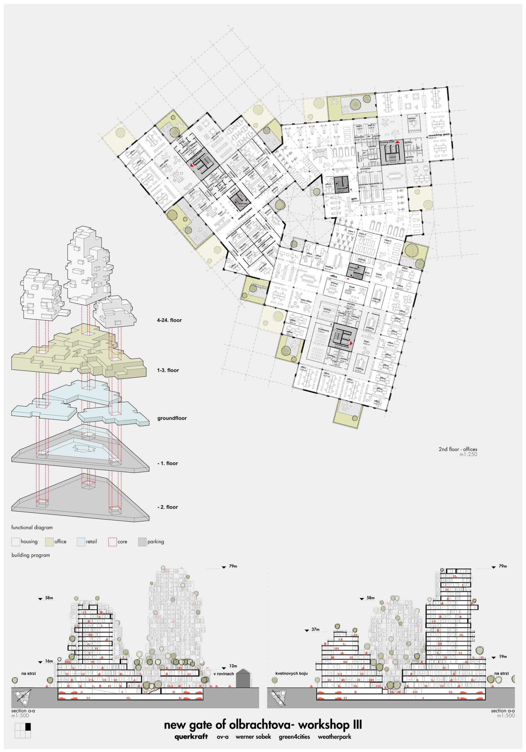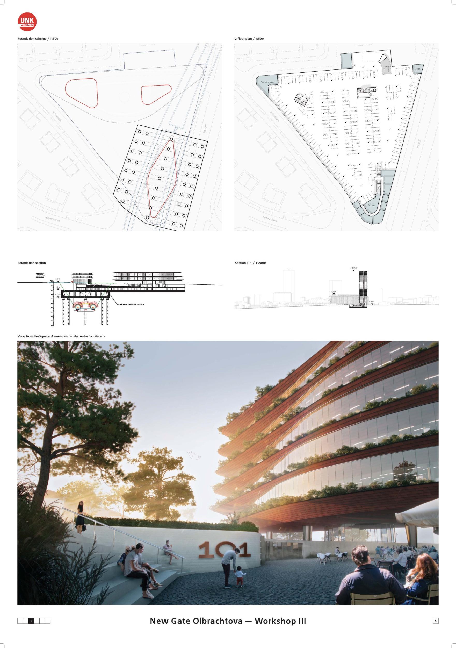 A very popular scheme, raising great expectations. However, the finalization was not convincing enough to be chosen as a reliable basis for further cooperation. Doubts were raised about the difficulty of continuing (disordered basic geometry of the three modular grids, unspecified use of space on the 1st floor in connection with the exit from the metro, the relationship to street lines, etc.). The use effectiveness of areas and public spaces in the three-story plinth was not clear to us. The lush articulation of the facades and the unconvincing placement of greenery on the structures, which do not reflect its placement in the documentation (sections, elevations do not reflect soil thickness, i.e. impact on overall impression), did not give the jury the sufficiency of the information to recommend the concept.