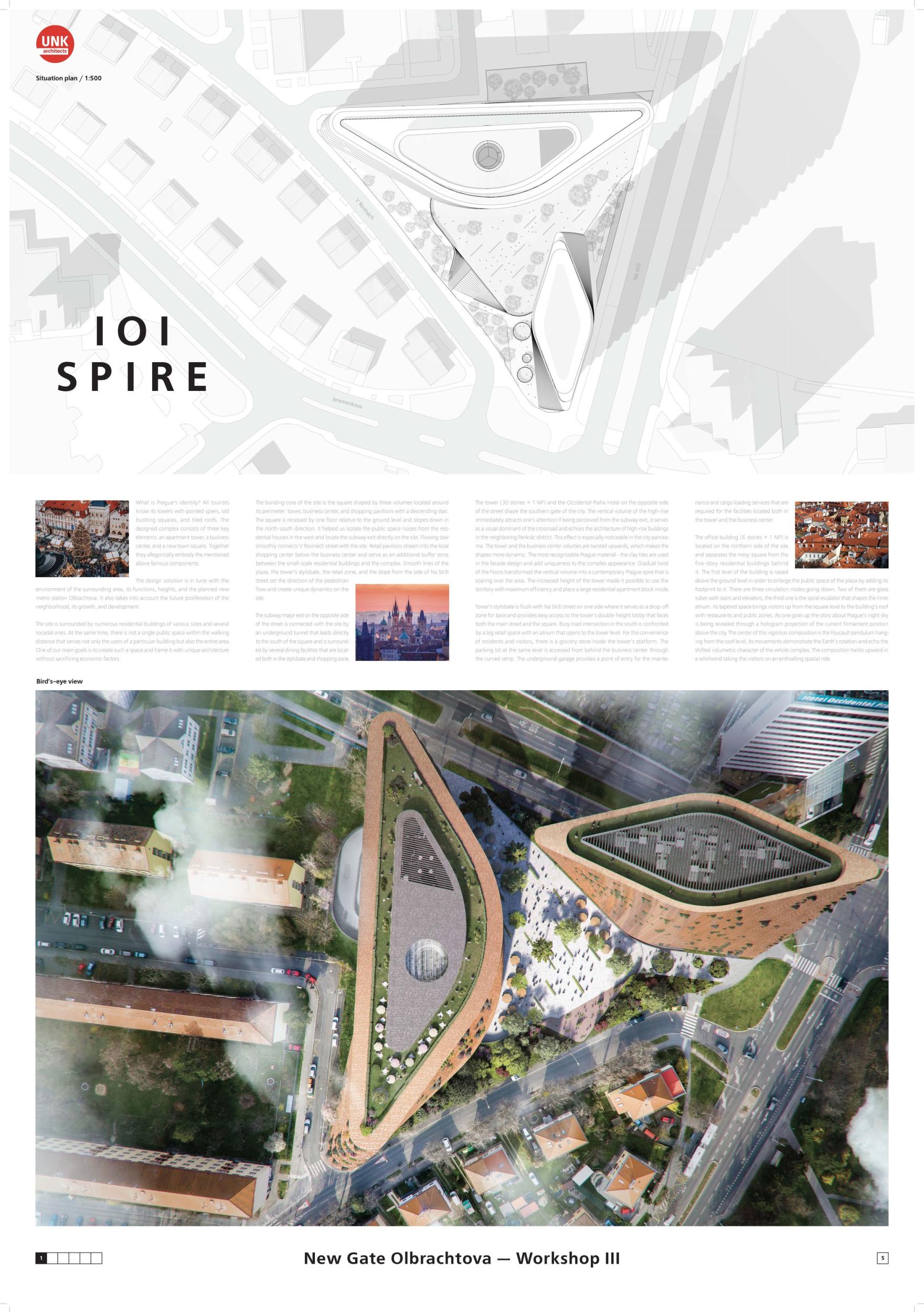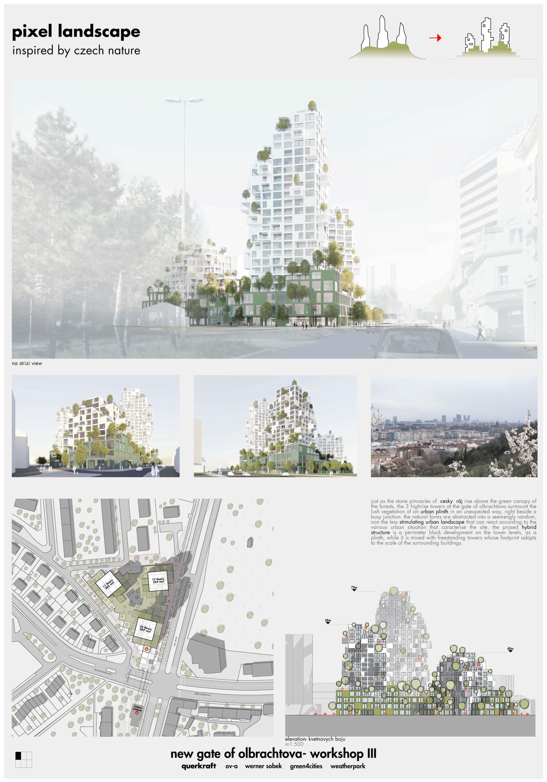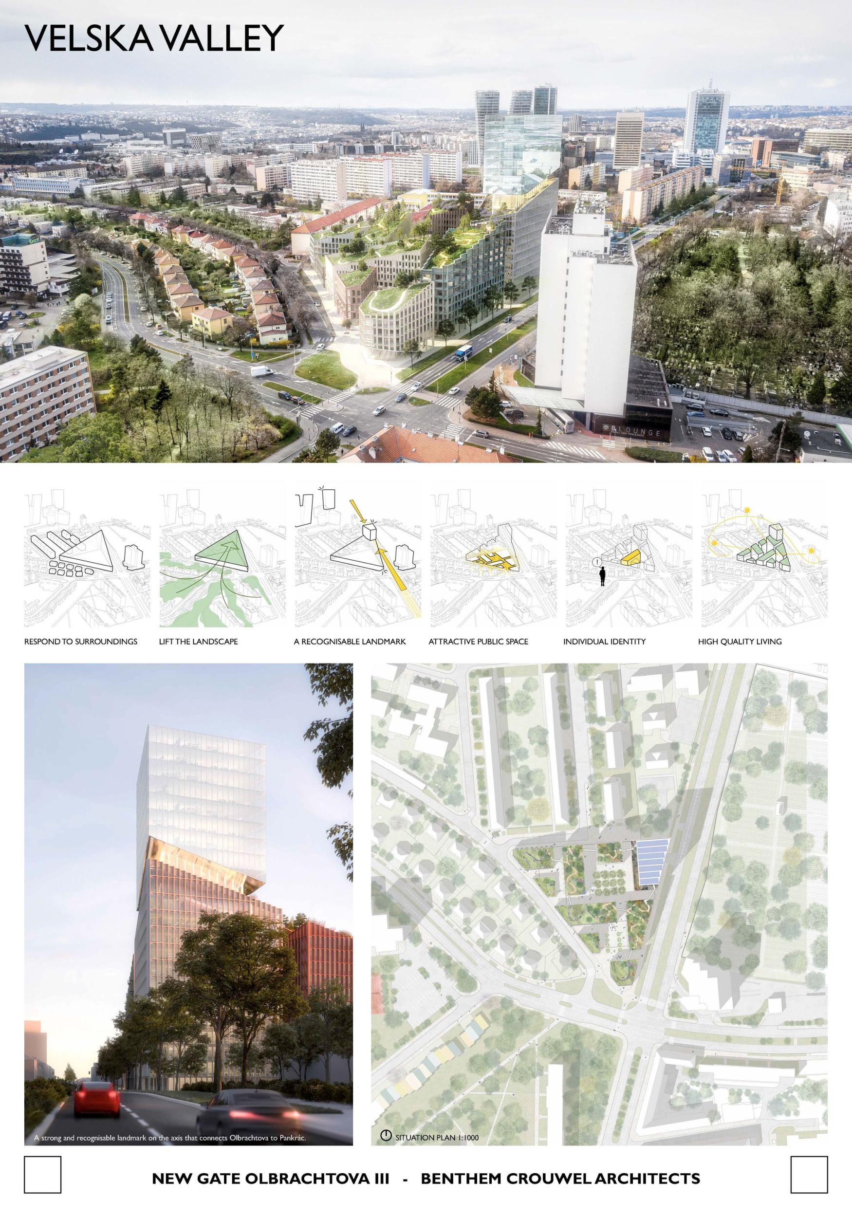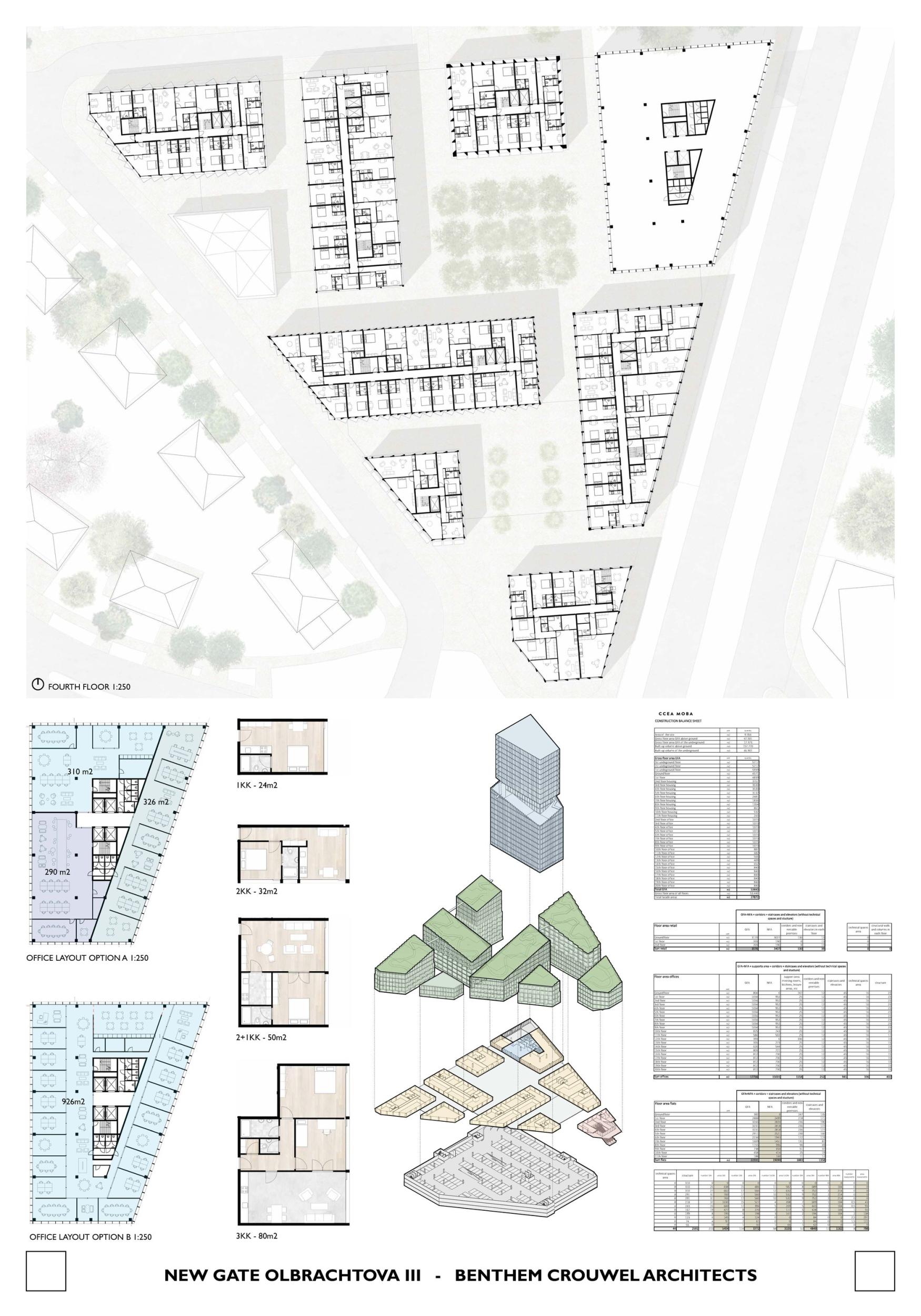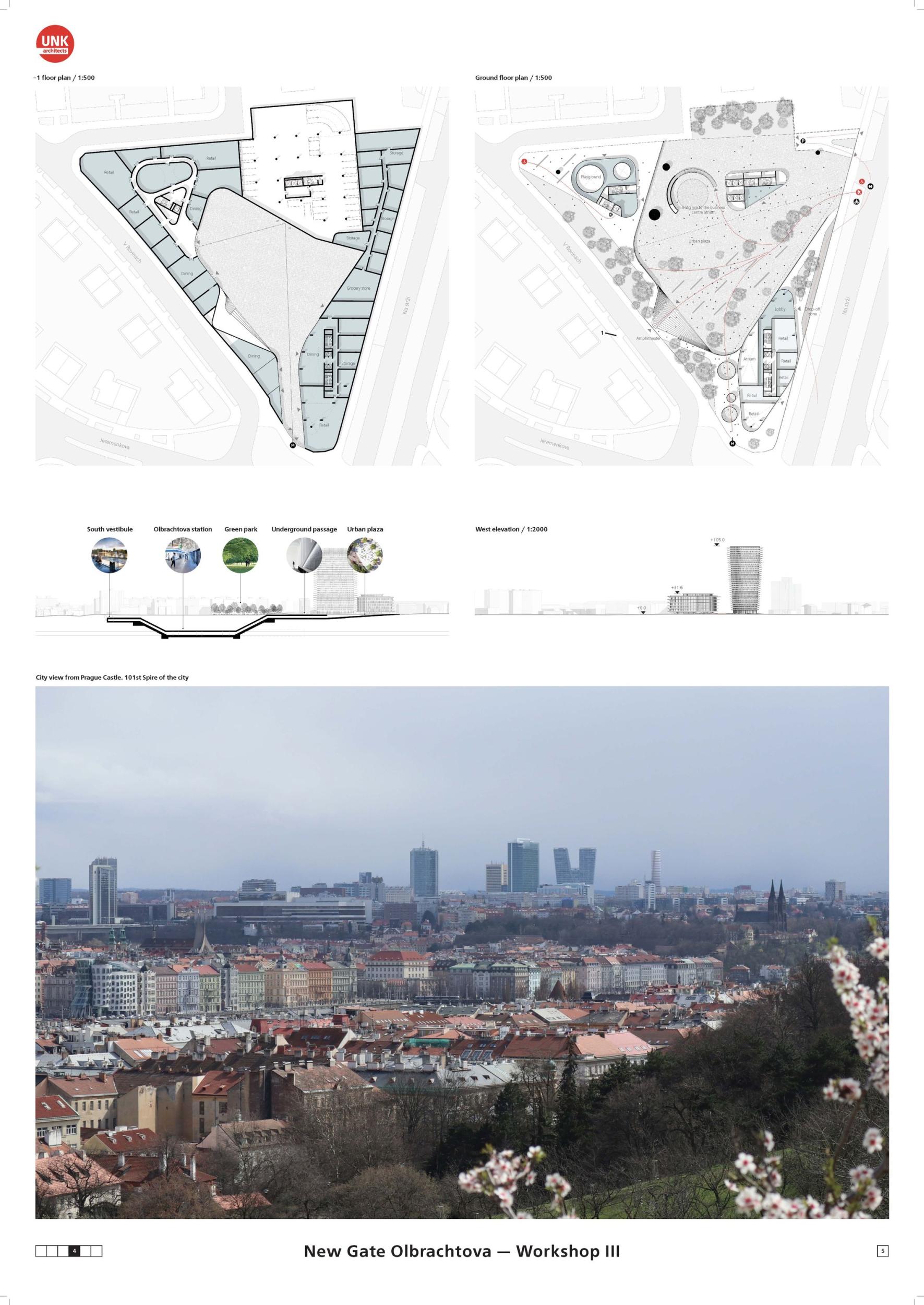 A very popular scheme, raising great expectations. However, the finalization was not convincing enough to be chosen as a reliable basis for further cooperation. Doubts were raised about the difficulty of continuing (disordered basic geometry of the three modular grids, unspecified use of space on the 1st floor in connection with the exit from the metro, the relationship to street lines, etc.). The use effectiveness of areas and public spaces in the three-story plinth was not clear to us. The lush articulation of the facades and the unconvincing placement of greenery on the structures, which do not reflect its placement in the documentation (sections, elevations do not reflect soil thickness, i.e. impact on overall impression), did not give the jury the sufficiency of the information to recommend the concept.