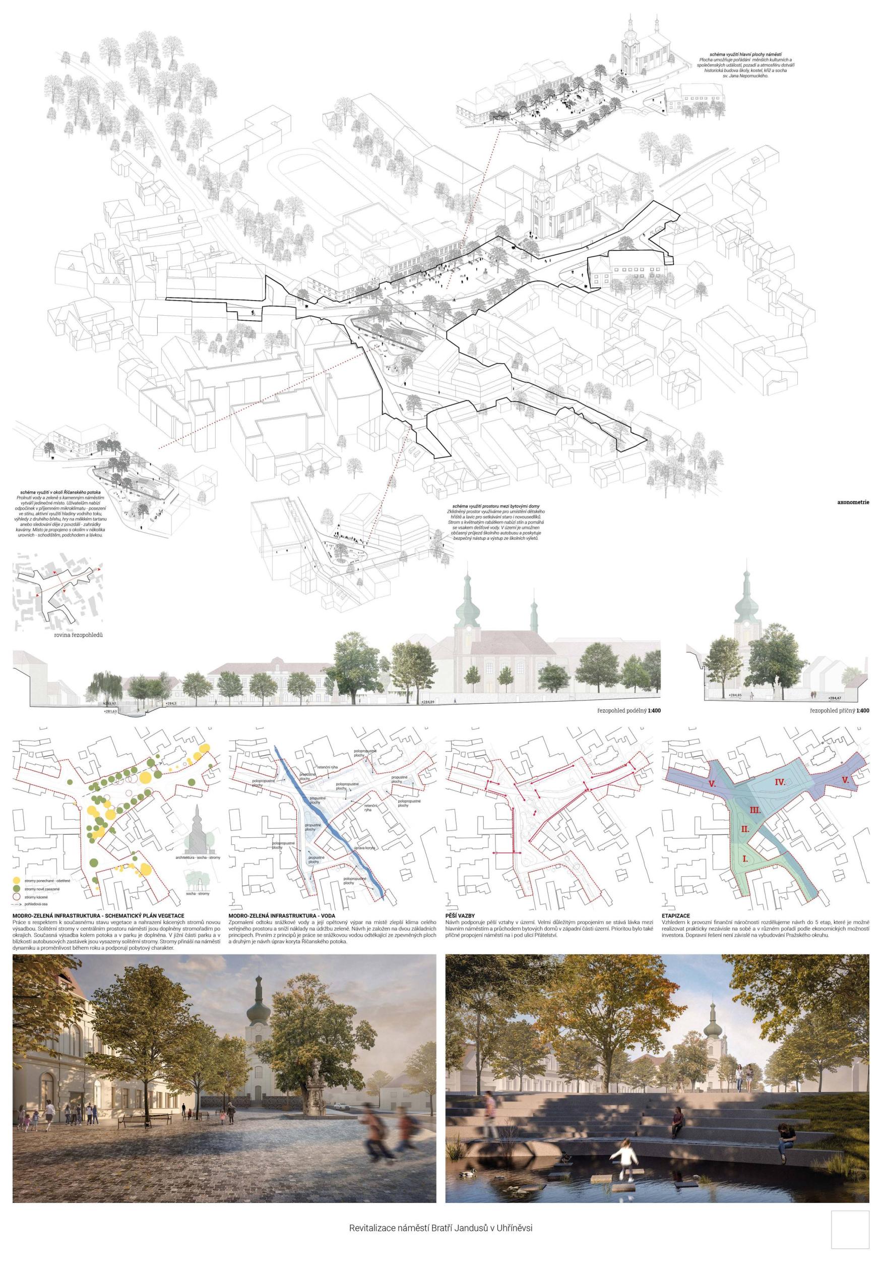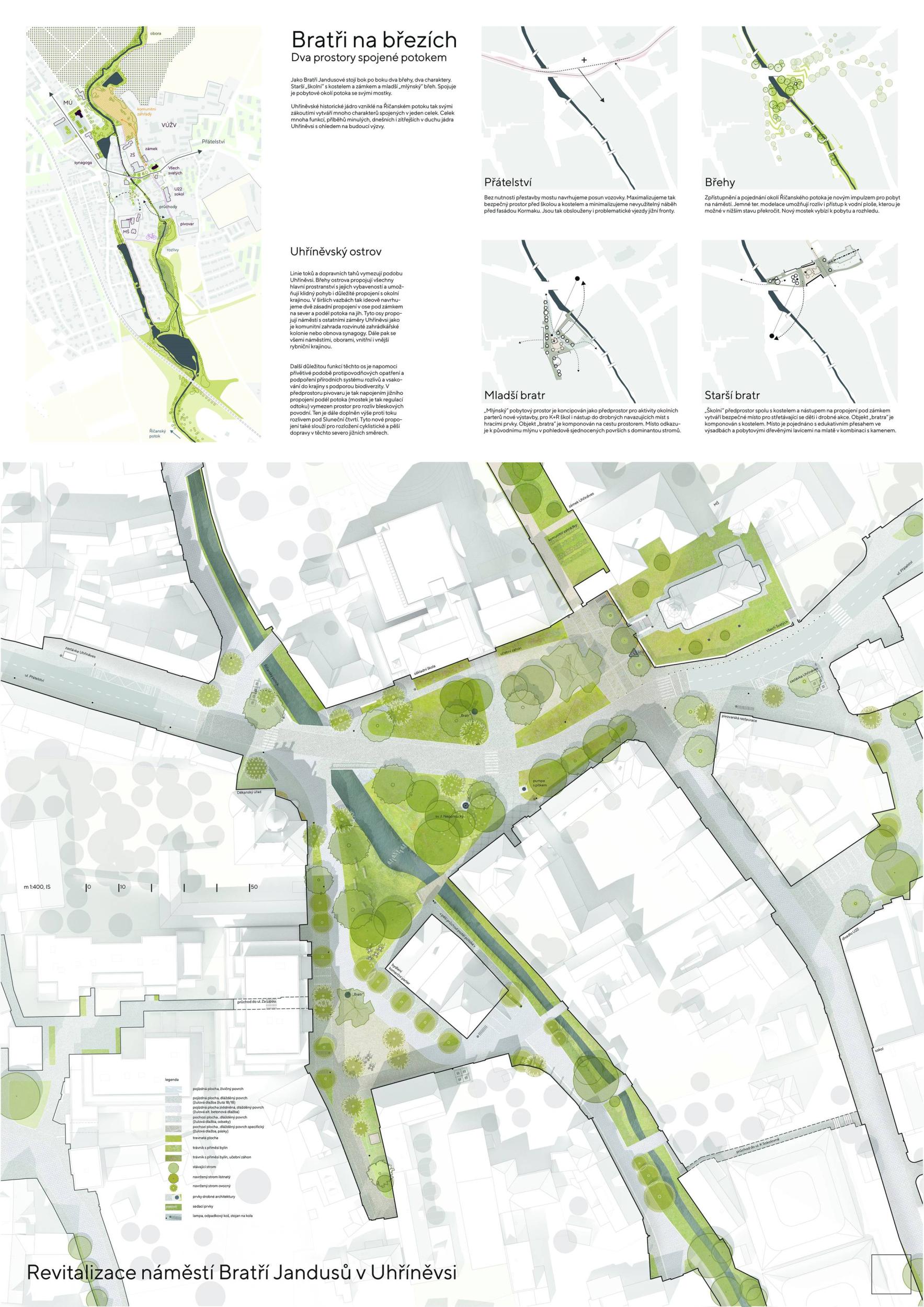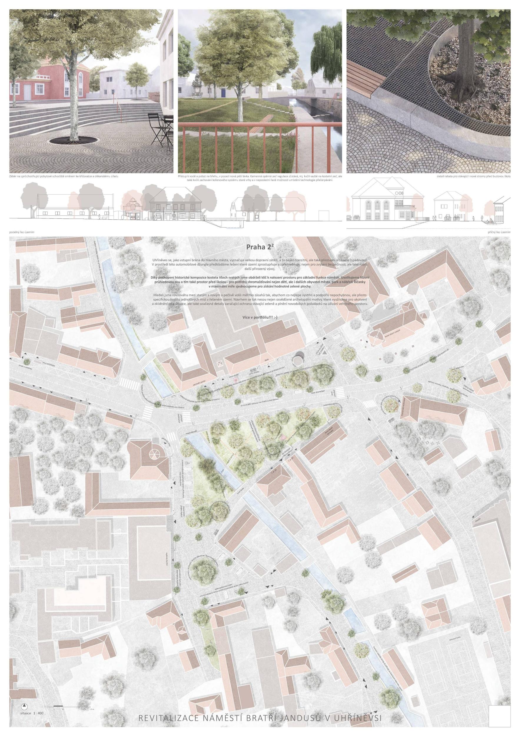 One square - three different characters. The historical center of Uhříněves is naturally divided into three parts by the Říčanka stream; we develop them in the design with conceptual, material and landscape solutions. Emphasis is placed on calming traffic, strengthening pedestrian links, composition of use, the relationship between historical and new and landscaping accompanied by blue-green infrastructure. The central public space in front of the school and the church is expanded by changing the tracing of Přátelství Street. The dominant feature is the statue of St. Jan Nepomucký in the focus of compositional views The central space is connected to a quiet place by a stream under the treetops, which is newly involved in the organism of the square. The last part is a landscaped playground.