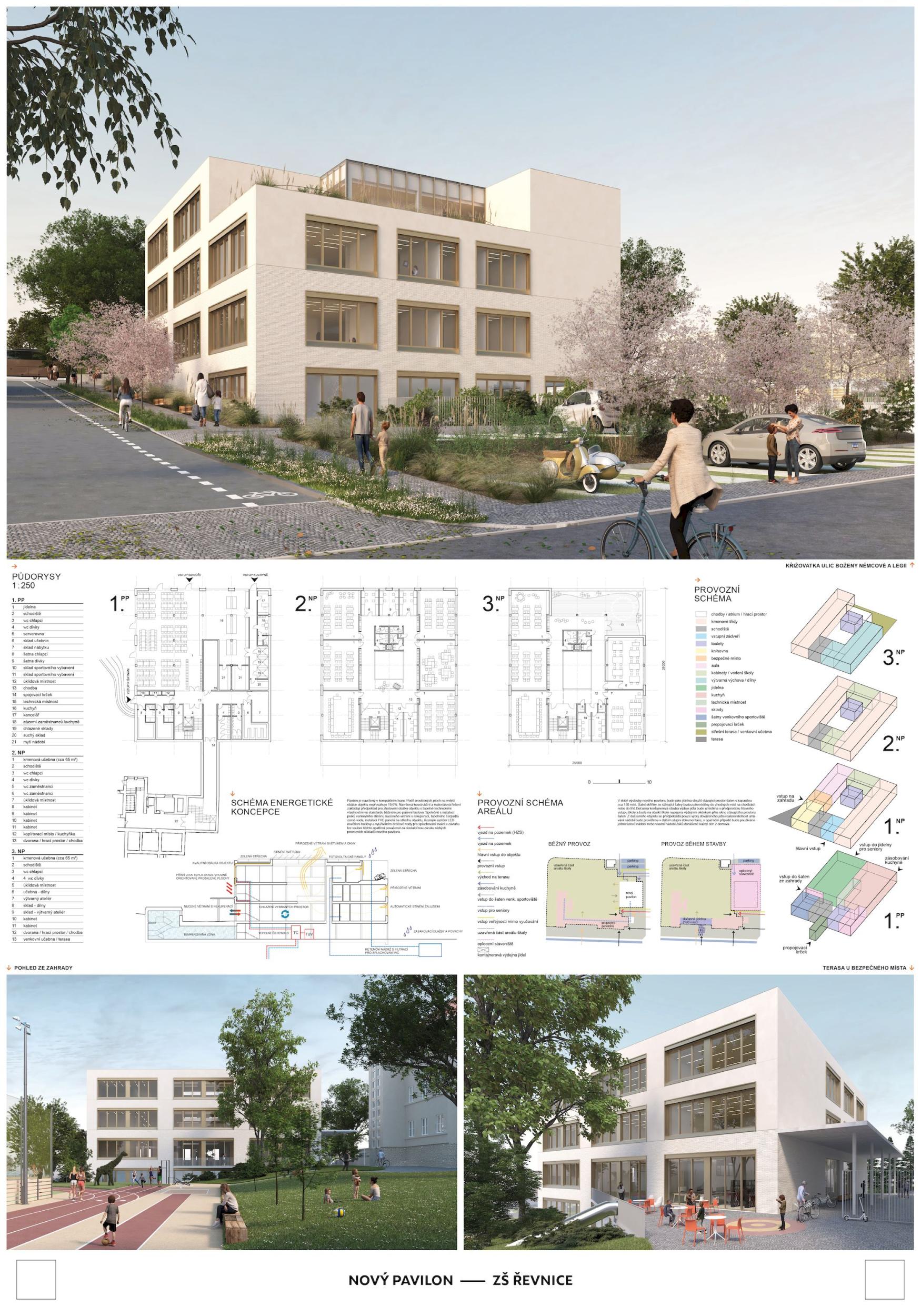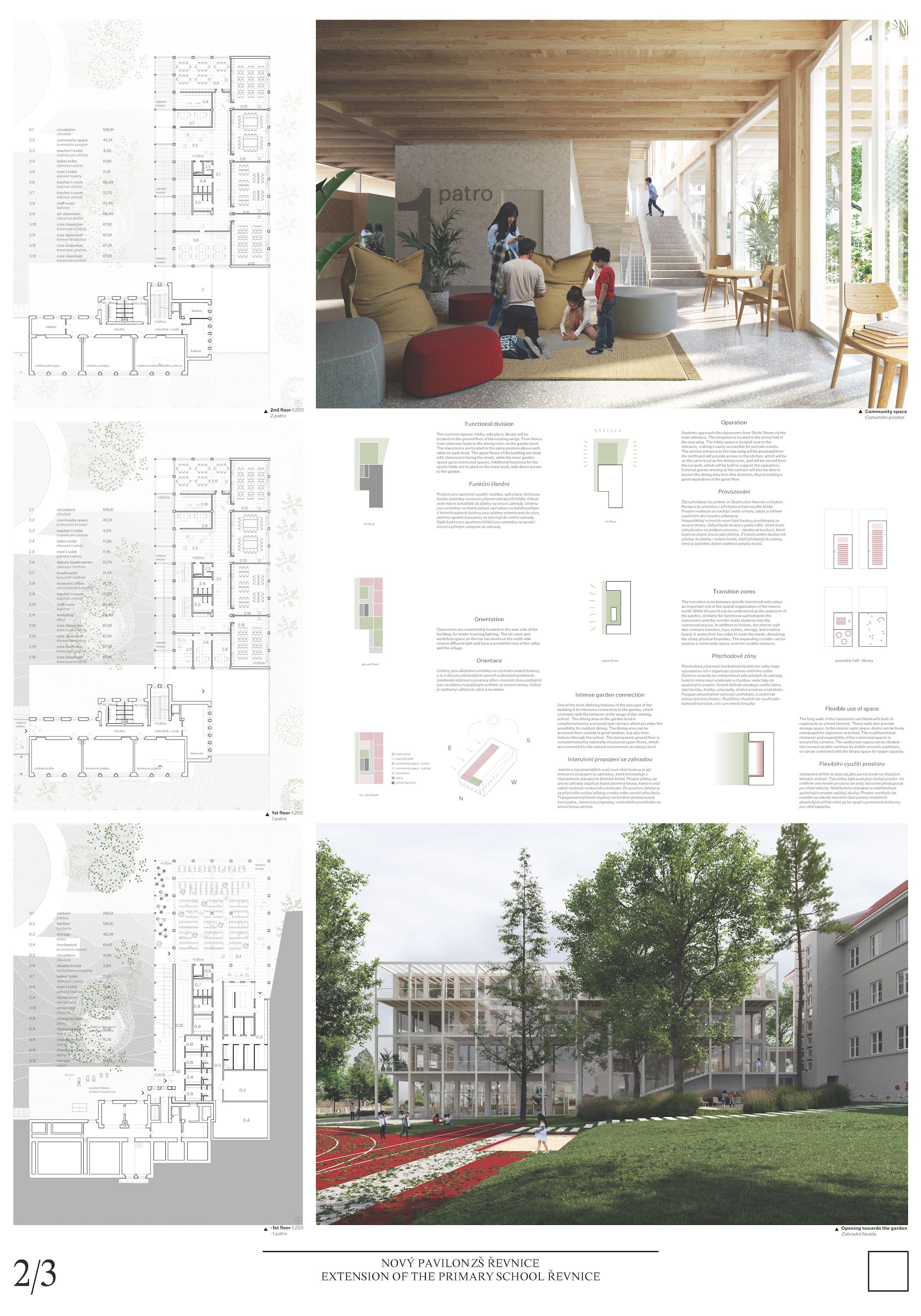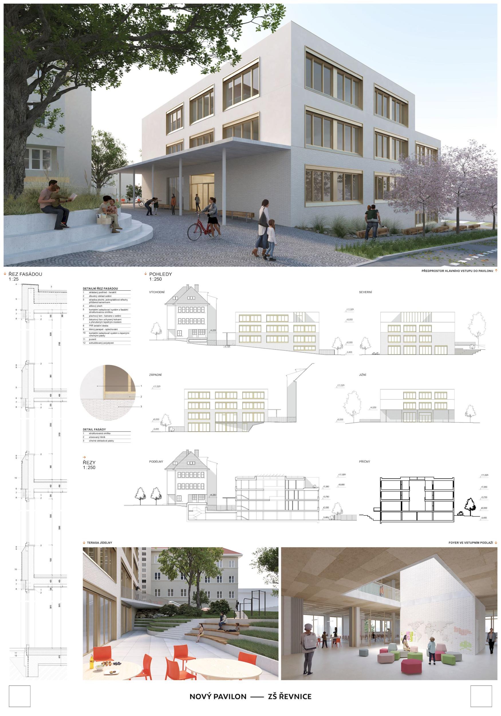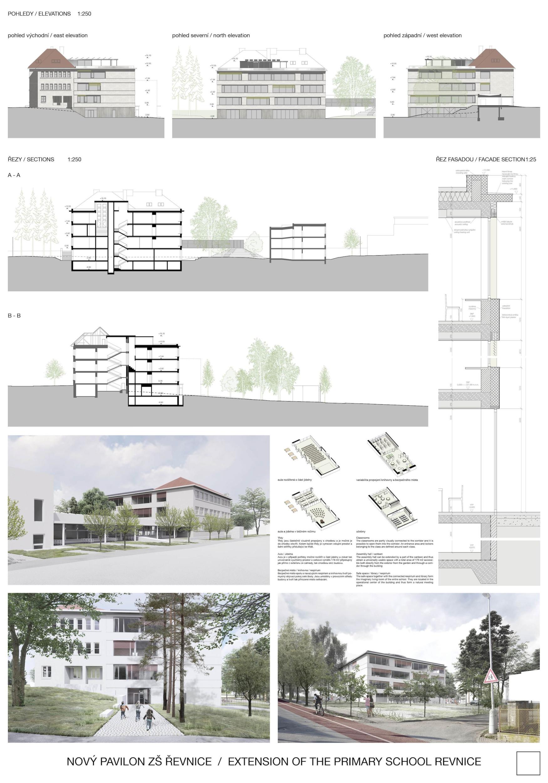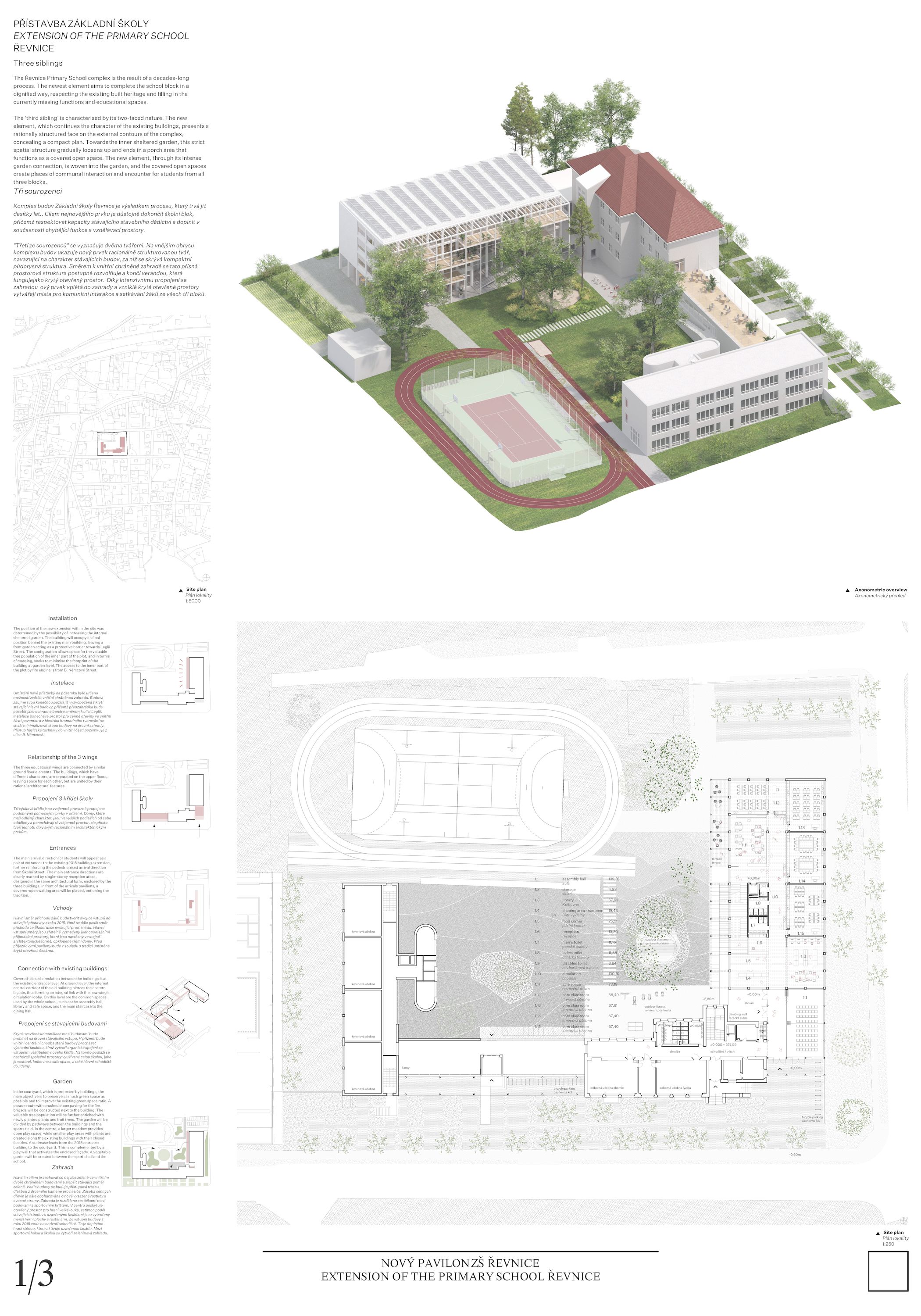 The Řevnice Primary School complex is the result of a decades-long process. The newest element aims to complete the school block in a dignified way, respecting the existing built heritage and filling in the currently missing functions and educational spaces. The 'third sibling' is characterized by its twofaced nature. The new element, which continues the character of the existing buildings, presents a rationally structured face on the external contours of the complex, concealing a compact pian. Toward the inner sheltered garden, this strict spatial structure gradually loosens up and ends in a porch area that functions as a covered open space. The new element, through its intense garden connection, is woven into the garden, and the covered open spaces create places of communal interaction and encounter for students from all three blocks.