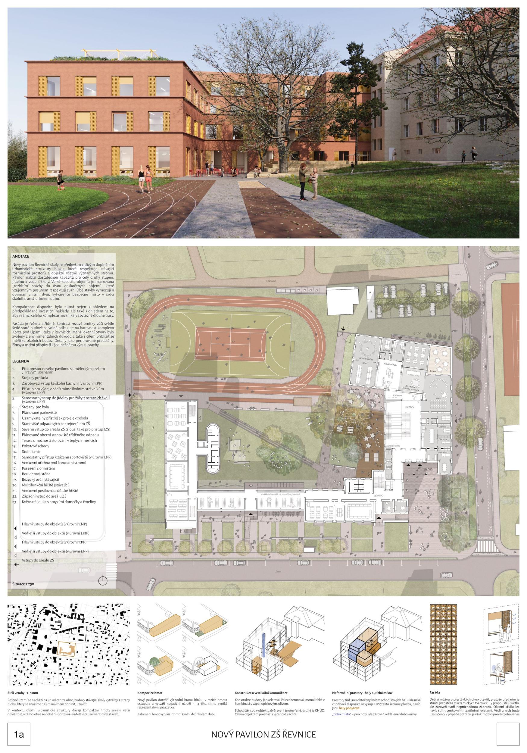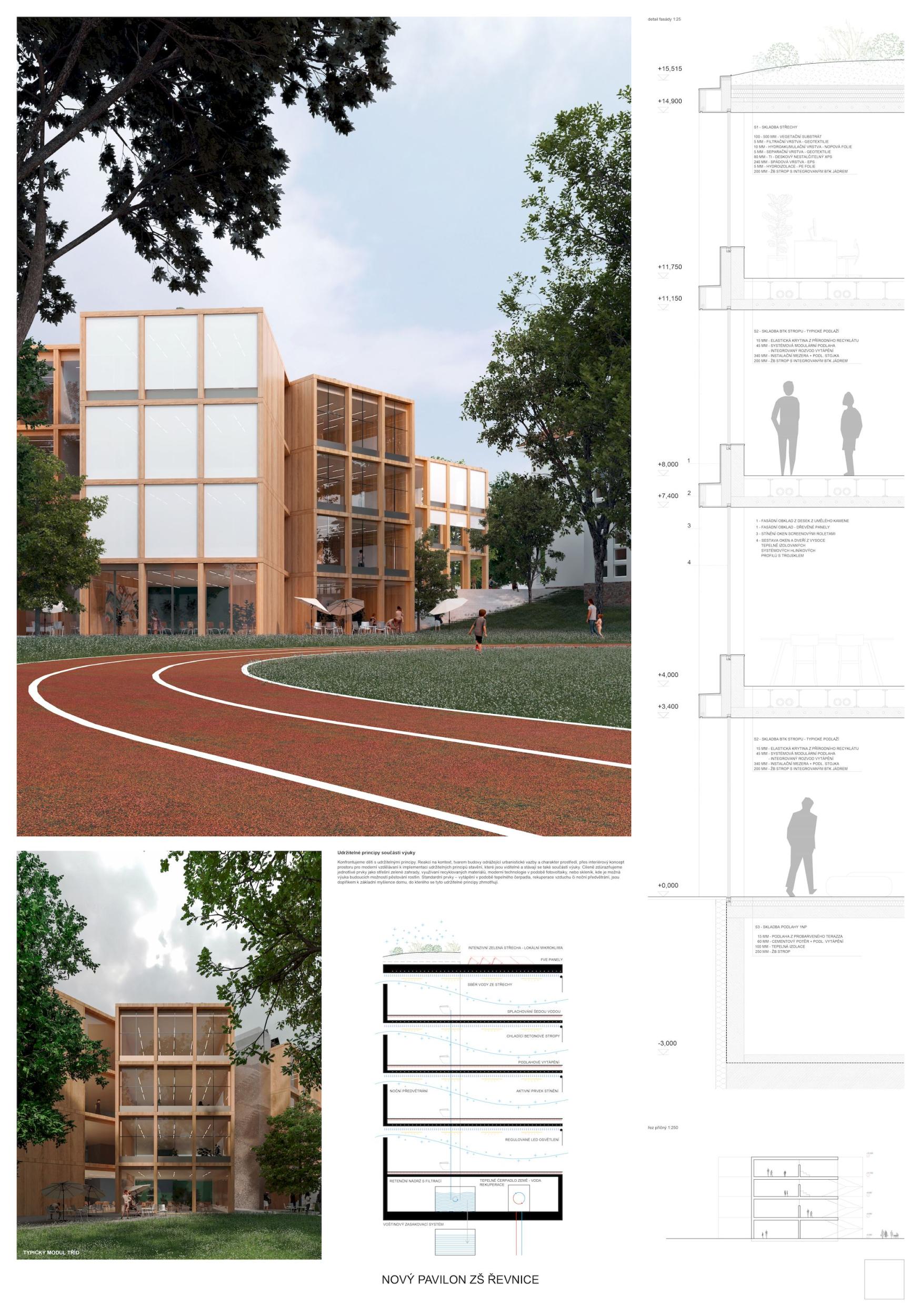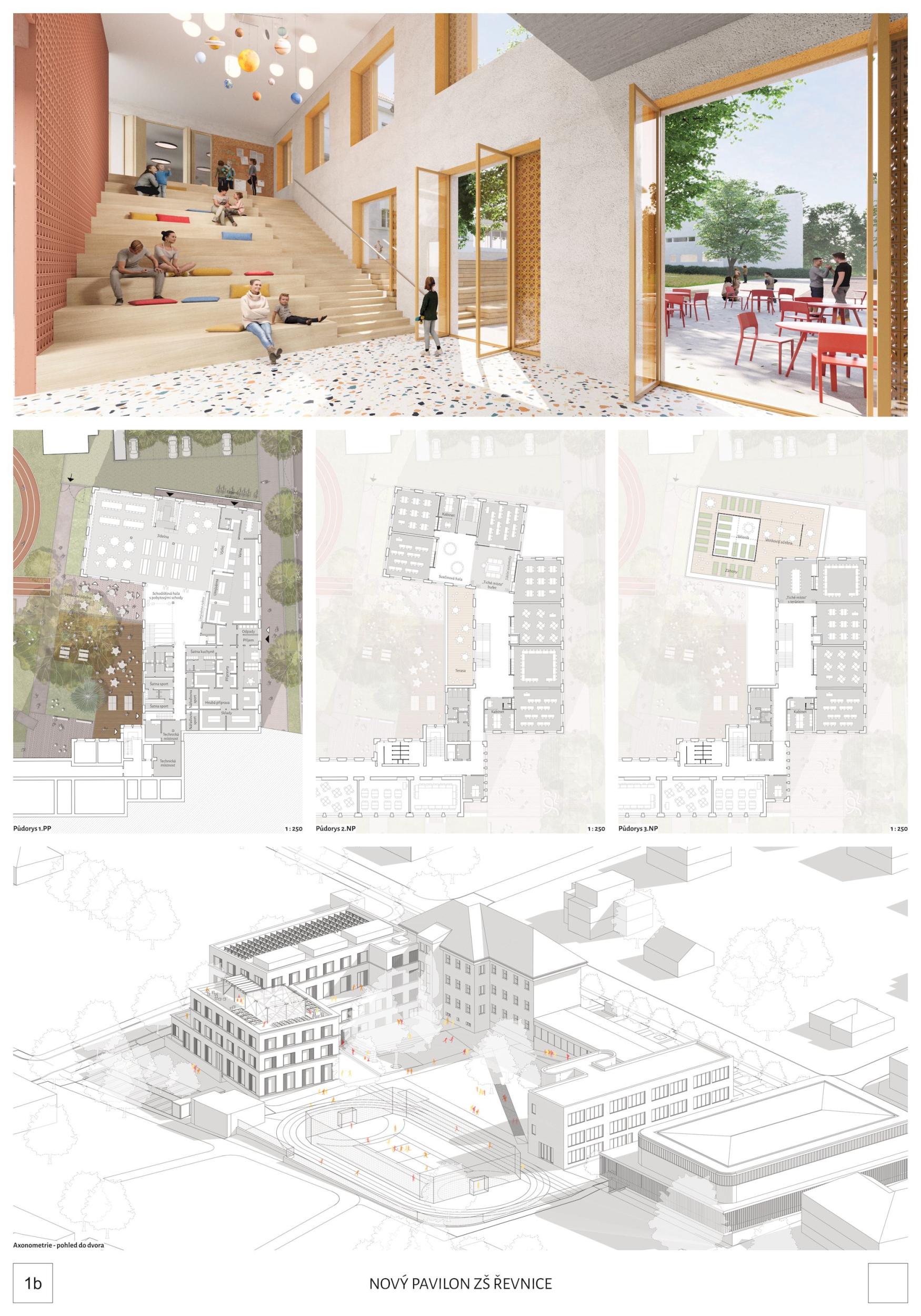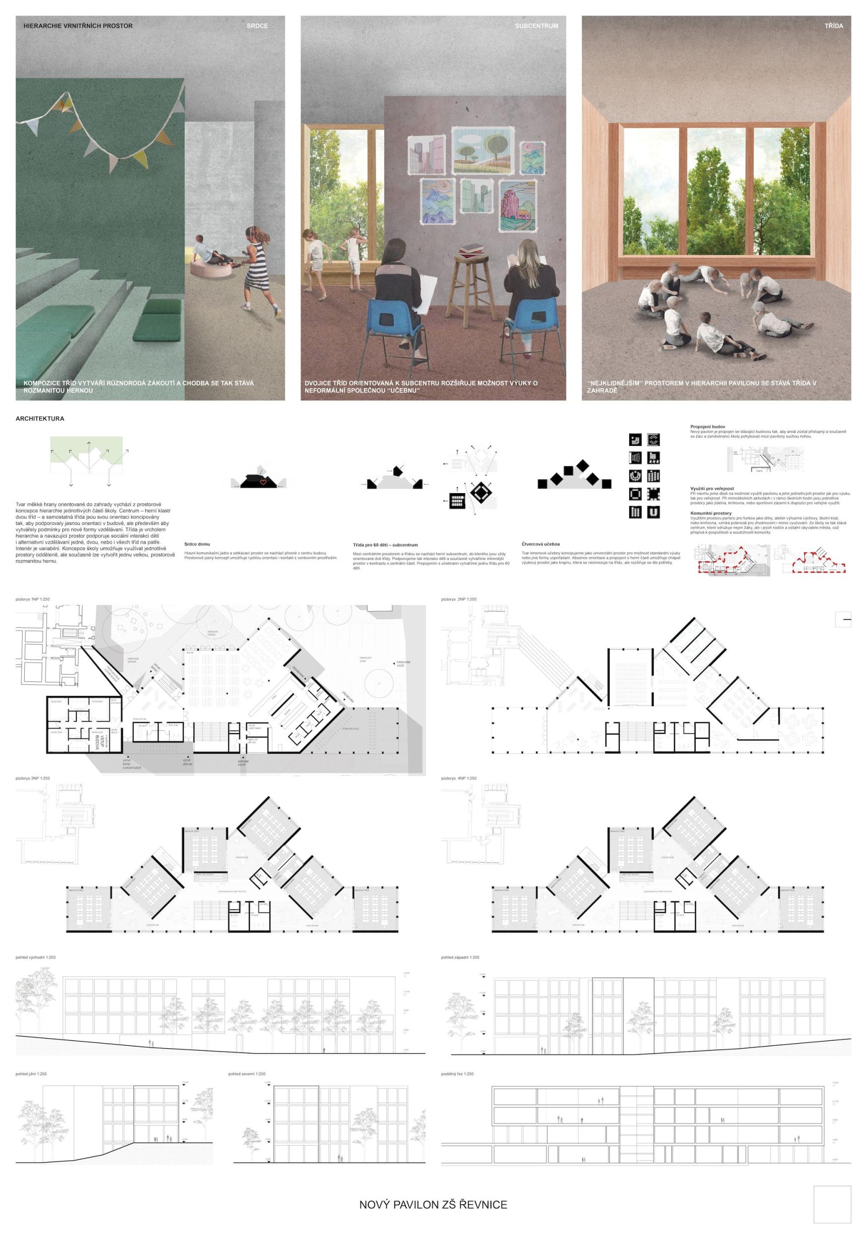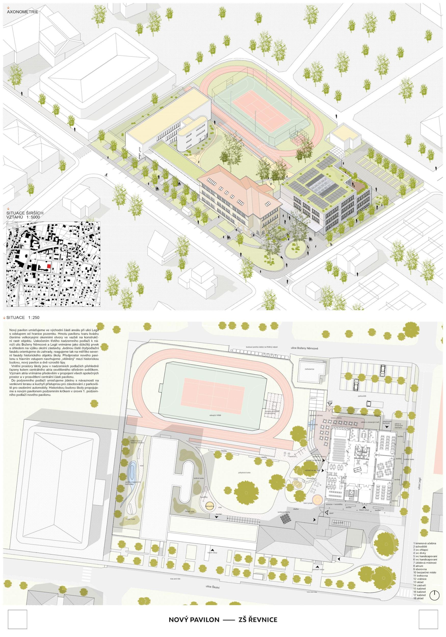 The Řevnice Primary School complex is the result of a decades-long process. The newest element aims to complete the school block in a dignified way, respecting the existing built heritage and filling in the currently missing functions and educational spaces. The 'third sibling' is characterized by its twofaced nature. The new element, which continues the character of the existing buildings, presents a rationally structured face on the external contours of the complex, concealing a compact pian. Toward the inner sheltered garden, this strict spatial structure gradually loosens up and ends in a porch area that functions as a covered open space. The new element, through its intense garden connection, is woven into the garden, and the covered open spaces create places of communal interaction and encounter for students from all three blocks.