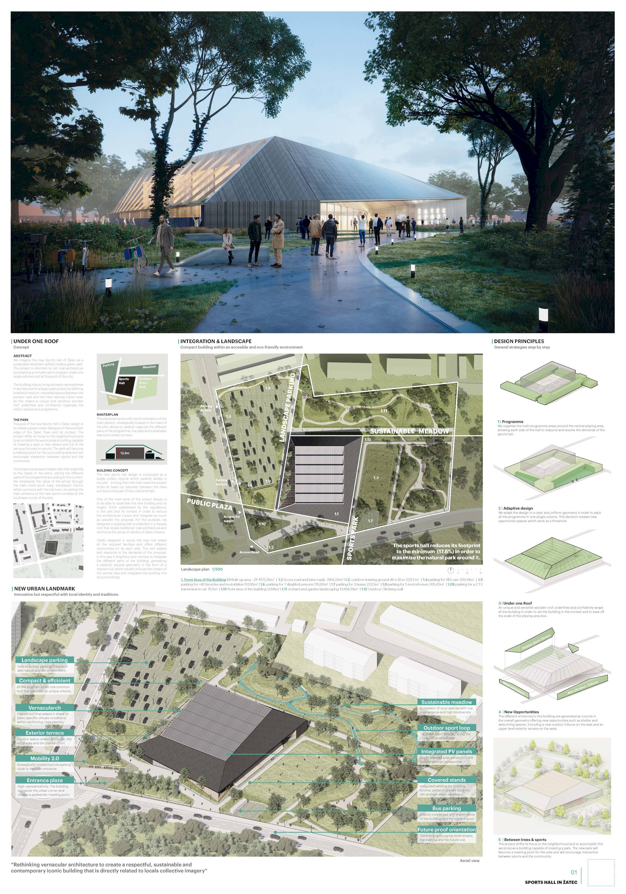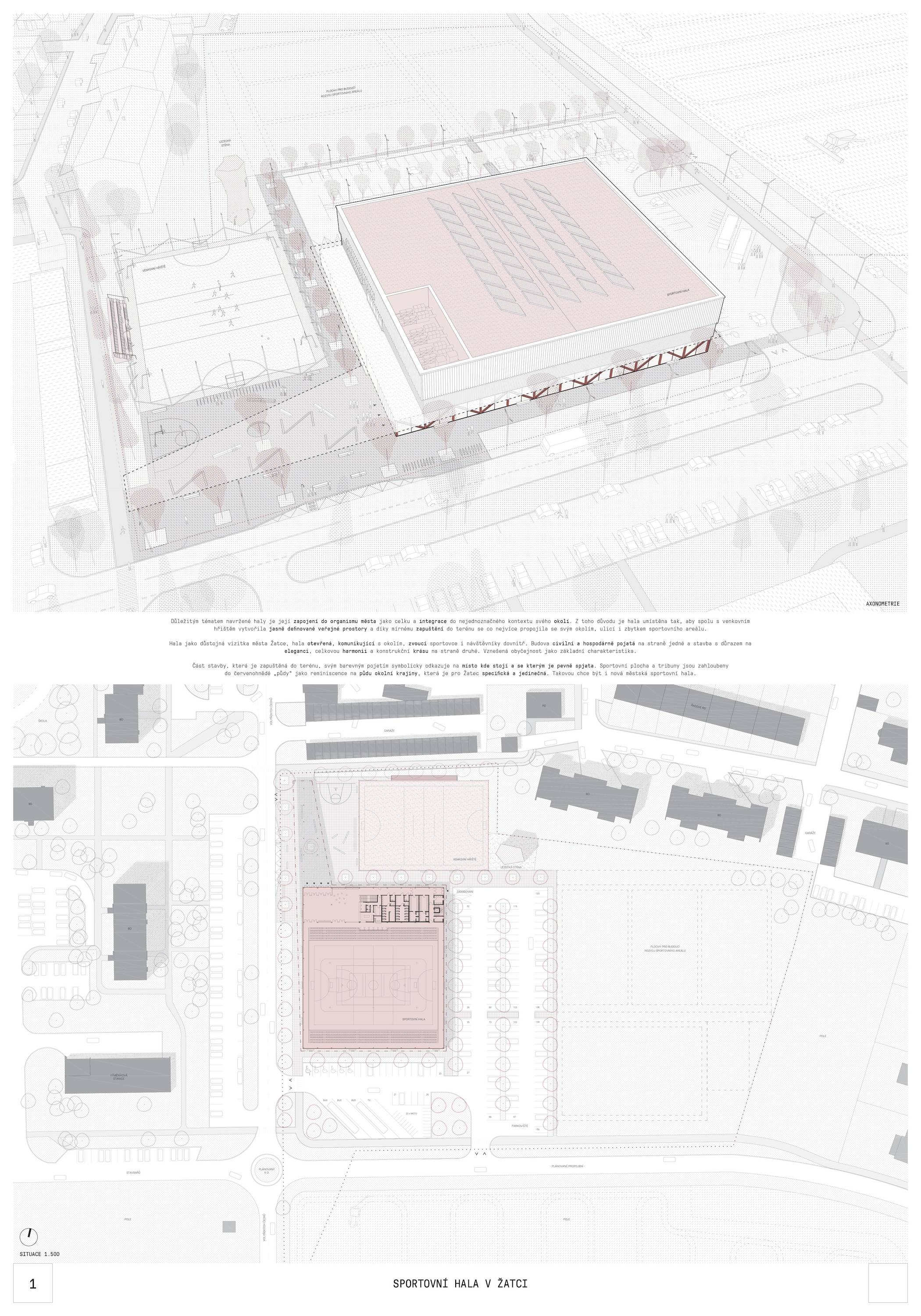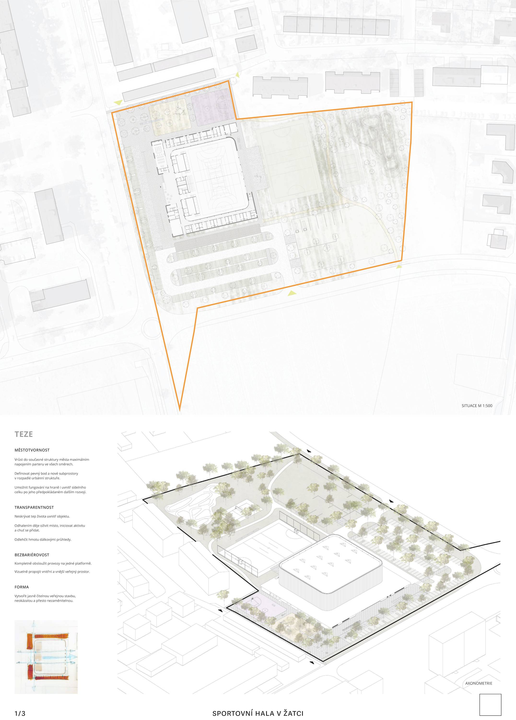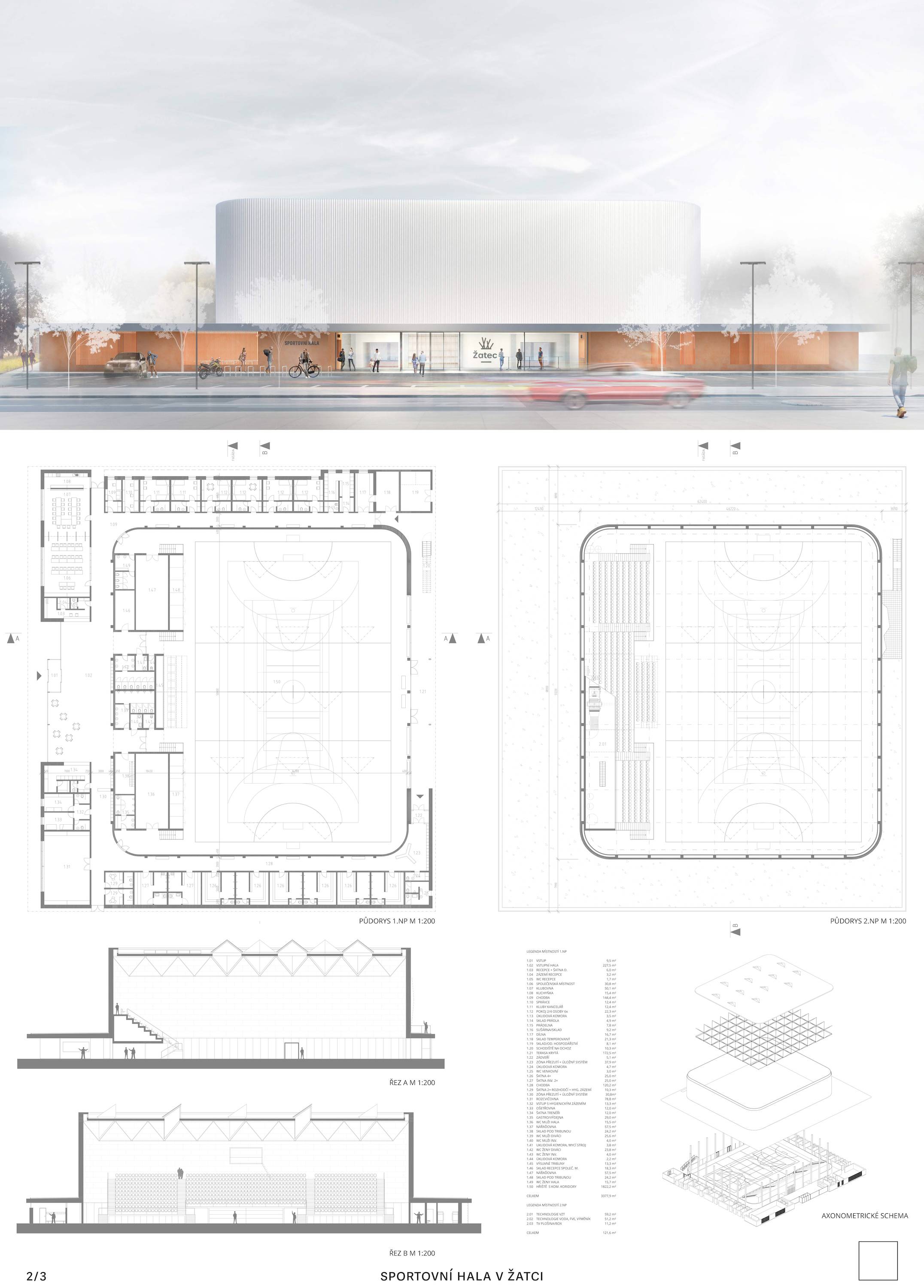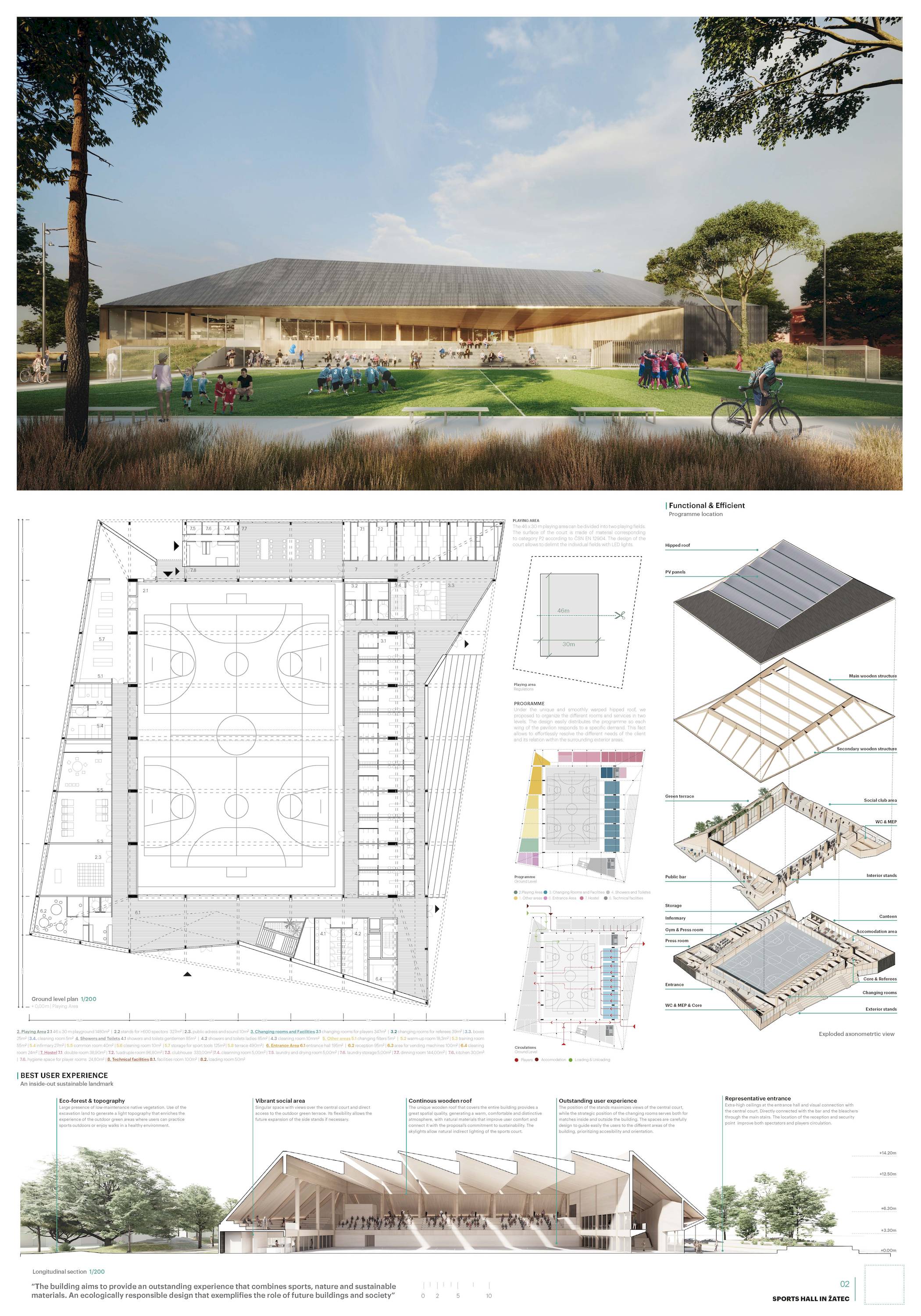 The proposal is detailed in all its parts and we highly appreciate the effort that the author's team has put into it. We appreciate the distinctive, landscape and architectural concept, the close connection with the adjacent public space and park. A green campus, a magnet in a park deliberately different from the rectangular plan of the adjacent housing estate. The emphasis on the local community is a positive, seeking interaction between athletes and park visitors. The pitched roofs, with reference to local architecture, give the hall a pleasing scale, the cut-outs in the massing for the various entrances will be a strong visual element and have interesting spatial potential. The layout is designed clearly, in functional blocks, with a well thought-out movement of athletes and visitors, with logical placement of all entrances. The structural design of the hall is easy to understand and we positively evaluate the use of prefabricated wooden and concrete elements. The energy concept of the building is also detailed with an emphasis on sustainability. In this respect, the design is the most sophisticated of all, and also provides for international certification. The design of the hall is so strongly linked to the surrounding park that the construction of the hall is difficult to imagine without the simultaneous implementation of the surrounding new landscape. It is recommended that the pedestrian and vehicle connectivity of the edges of the site to the surrounding urban fabric be considered. We see a risk in the location of the large car park on the city street Volyňských Čechů - it forms a barrier. We recommend rethinking the material of the external cladding in relation to local climatic conditions, durability and maintenance. We draw the attention of the contest team to, in our opinion, underestimated construction costs.