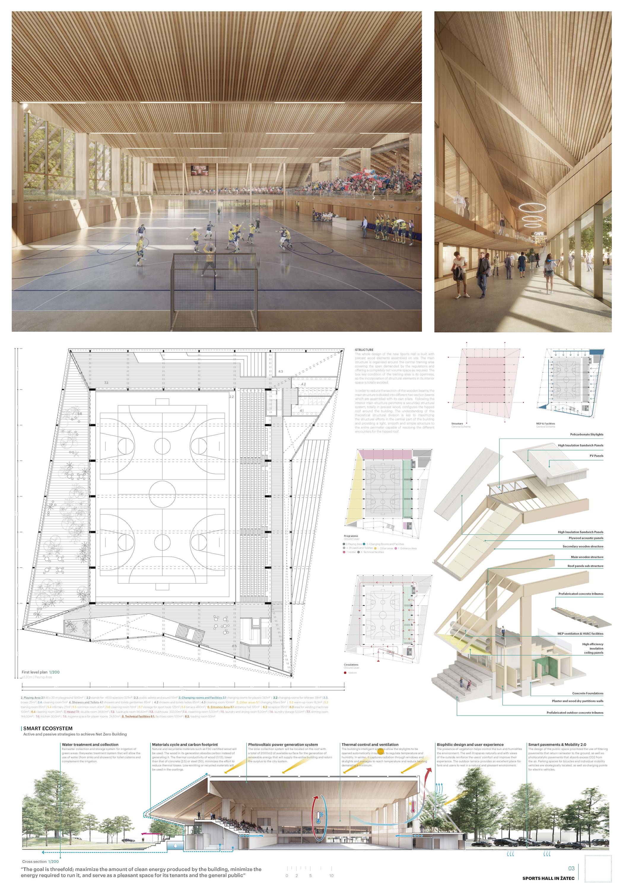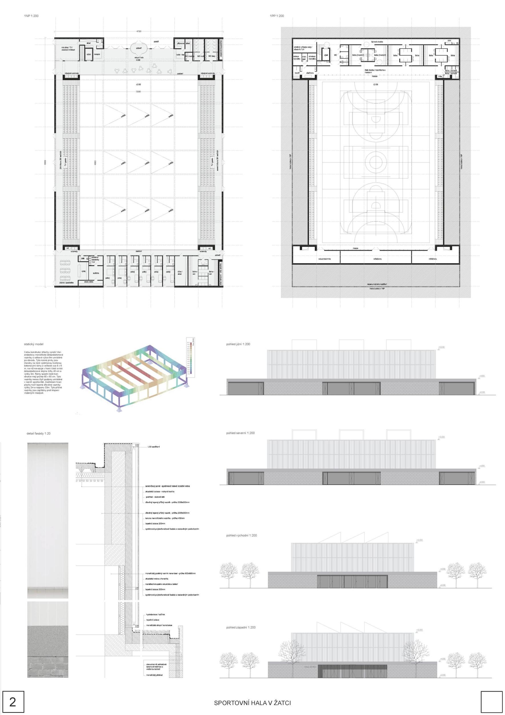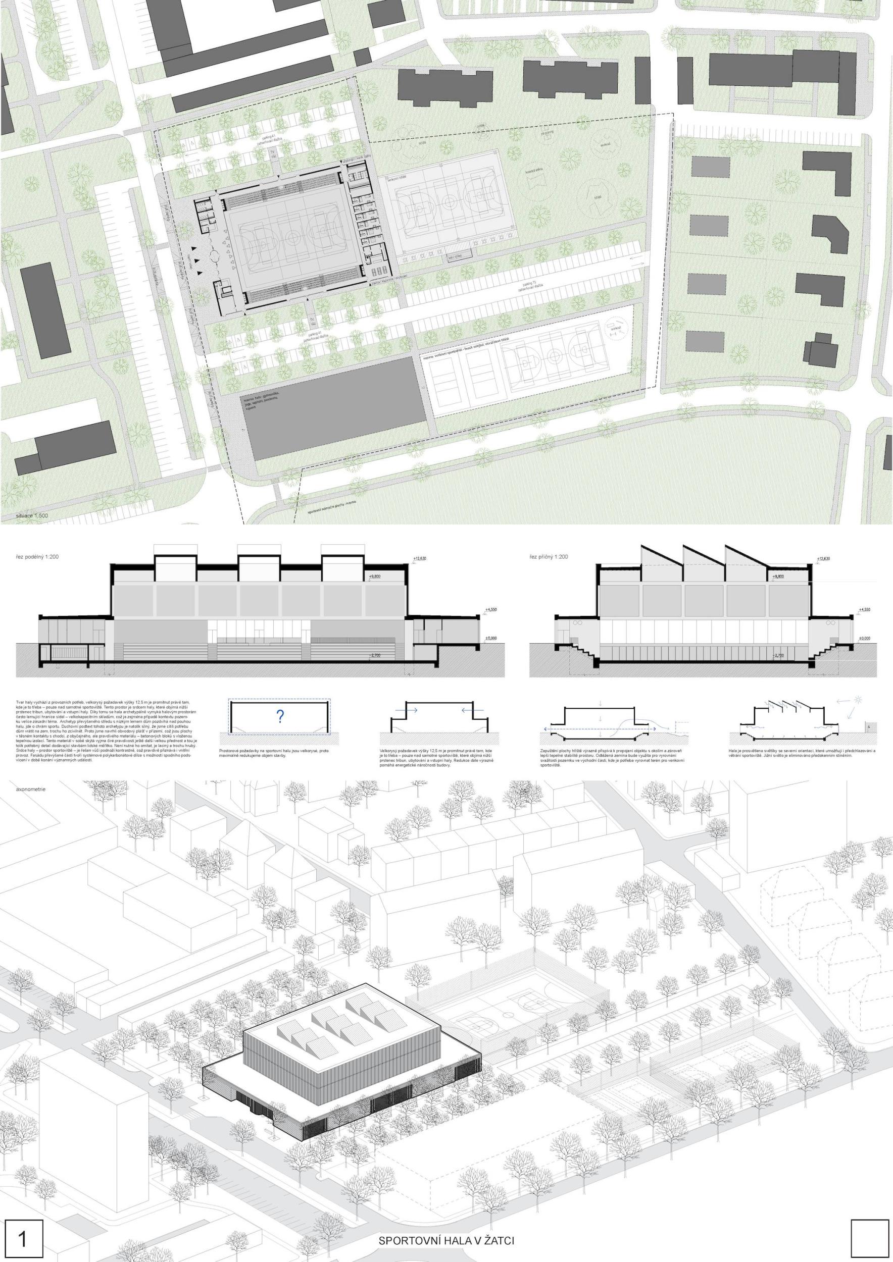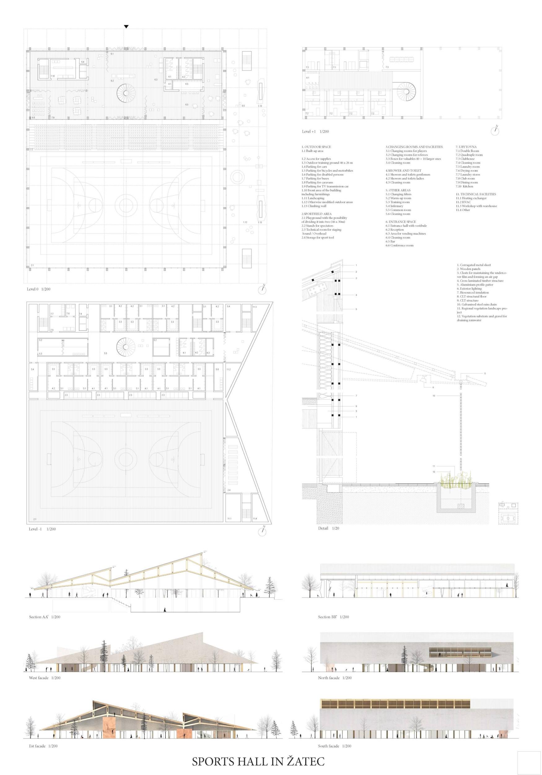 We imagine the new Sports Hall of Žatec as a sustainable landmark settled inside a green park. The project is informed by old rural architecture by wrapping a complex sport program under one single pitched roof at this point of the city of Žatec. The building tries to bring domestic atmospheres in architecture to a large scale project by defining small and medium interstitial spaces between the outdoor park and the main training indoor area. By this means a unique and sensitive wooden roof underlines and confidently organizes the indoor spaces and programme.