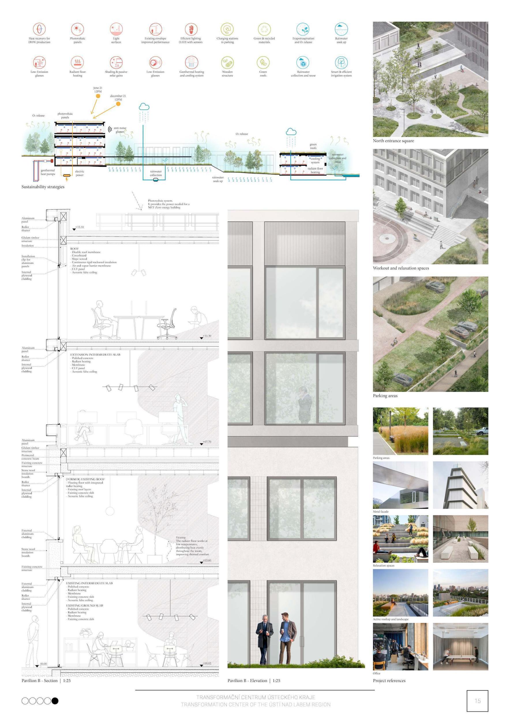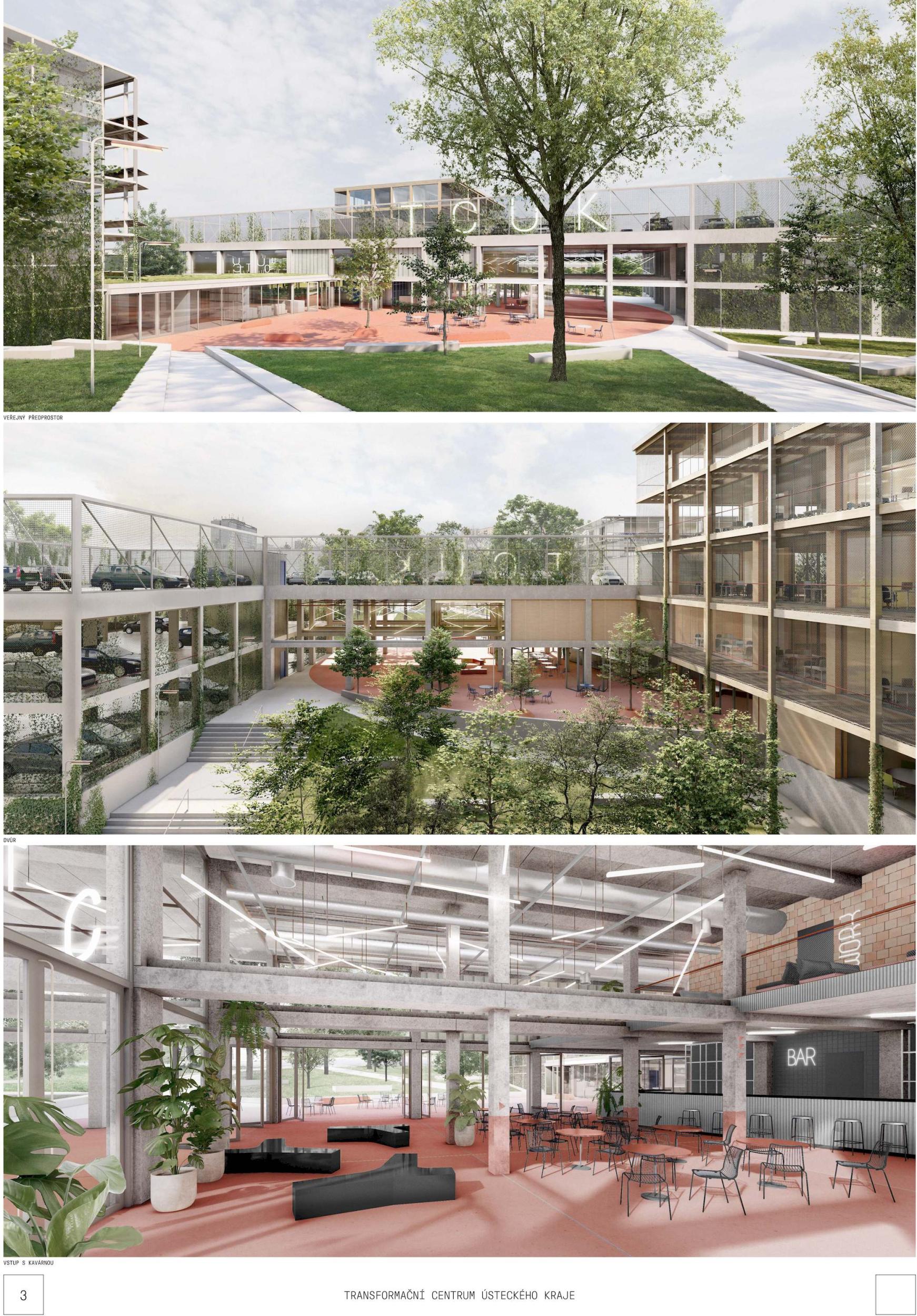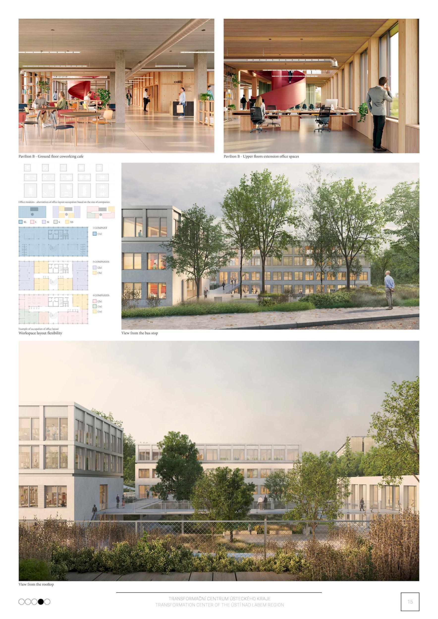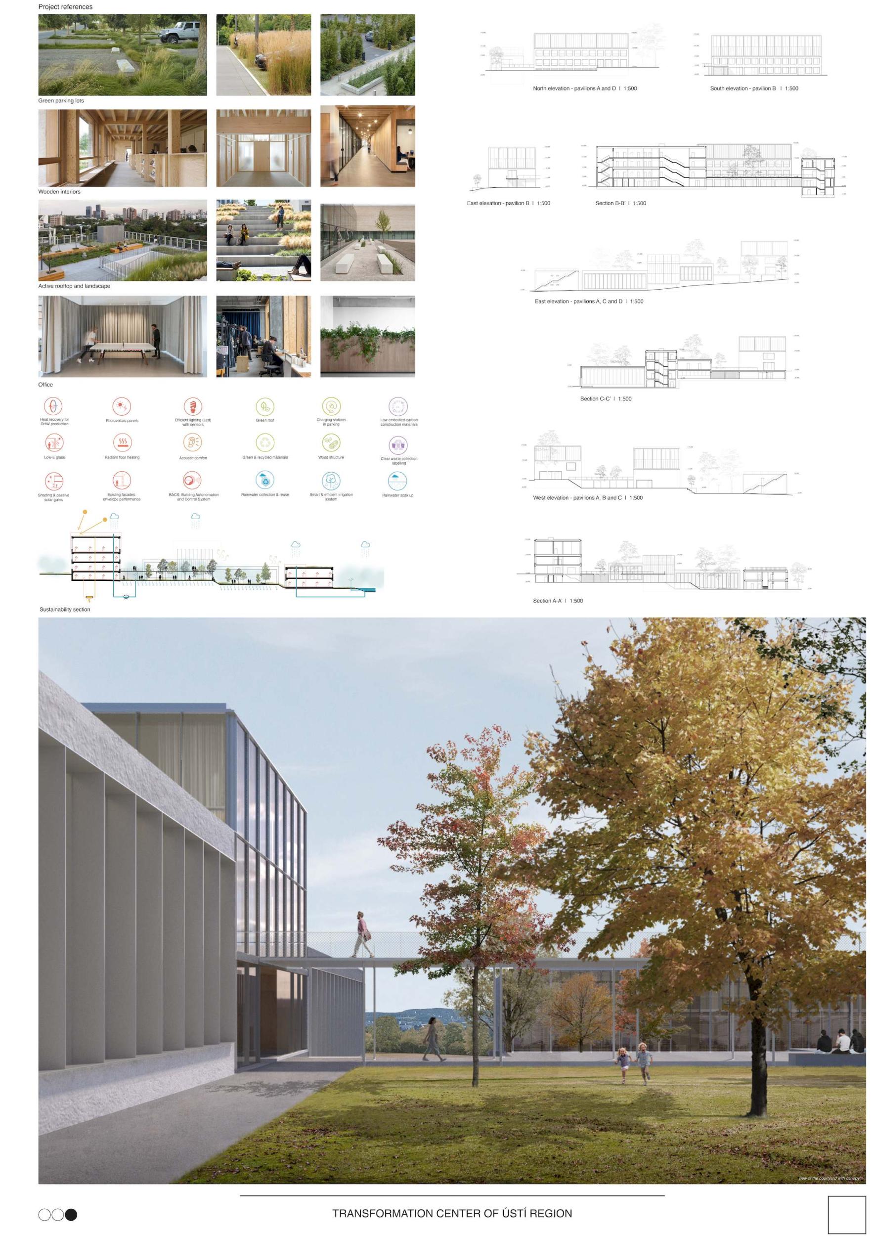 The persuasiveness of the design is evident at first glance with its rational approach to the architectural transformation of the existing site. The legibility of the new building modifications, the minimization of the built-up area, the easy phasing, and the adequacy of the investment costs combine to form an effective development strategy. Respect for the qualities of the original architectural aesthetic is given in contrast to the newly designed volumes added to the existing structure. The extensions thus create another layer of the building, and their expression harmoniously complements the image of the resulting mass. The material solution of the existing volumes sensitively interprets the original form of the façade. The new extensions are subtly differentiated in terms of material and substance. The central motif of the design is a simple walkway that connects the individual buildings and frames the outdoor space - the three courtyards that form the heart of the plan. The public spaces are conceived generously but proportionately to their use. The question is whether the inner courtyards between pavilions A, B and D duplicate each other in character and thus offer the same possibilities of use unnecessarily. There is a clear hierarchy in the layout and operation of the buildings, and the emphasis is on the flexibility of space, as demonstrated by the office use scenarios presented. All common meeting spaces flow into outdoor courtyards and naturally link the entire site into a functioning whole. A strong point of the design is the convincing concept of phasing, which allows for gradually redeveloping the buildings without significantly disrupting the site's operation. The jury highly appreciates the reflection of the criticism from the first round and the consistent refinement of the design for the second round, which gives a strong partner for the upcoming project development and its successful implementation.