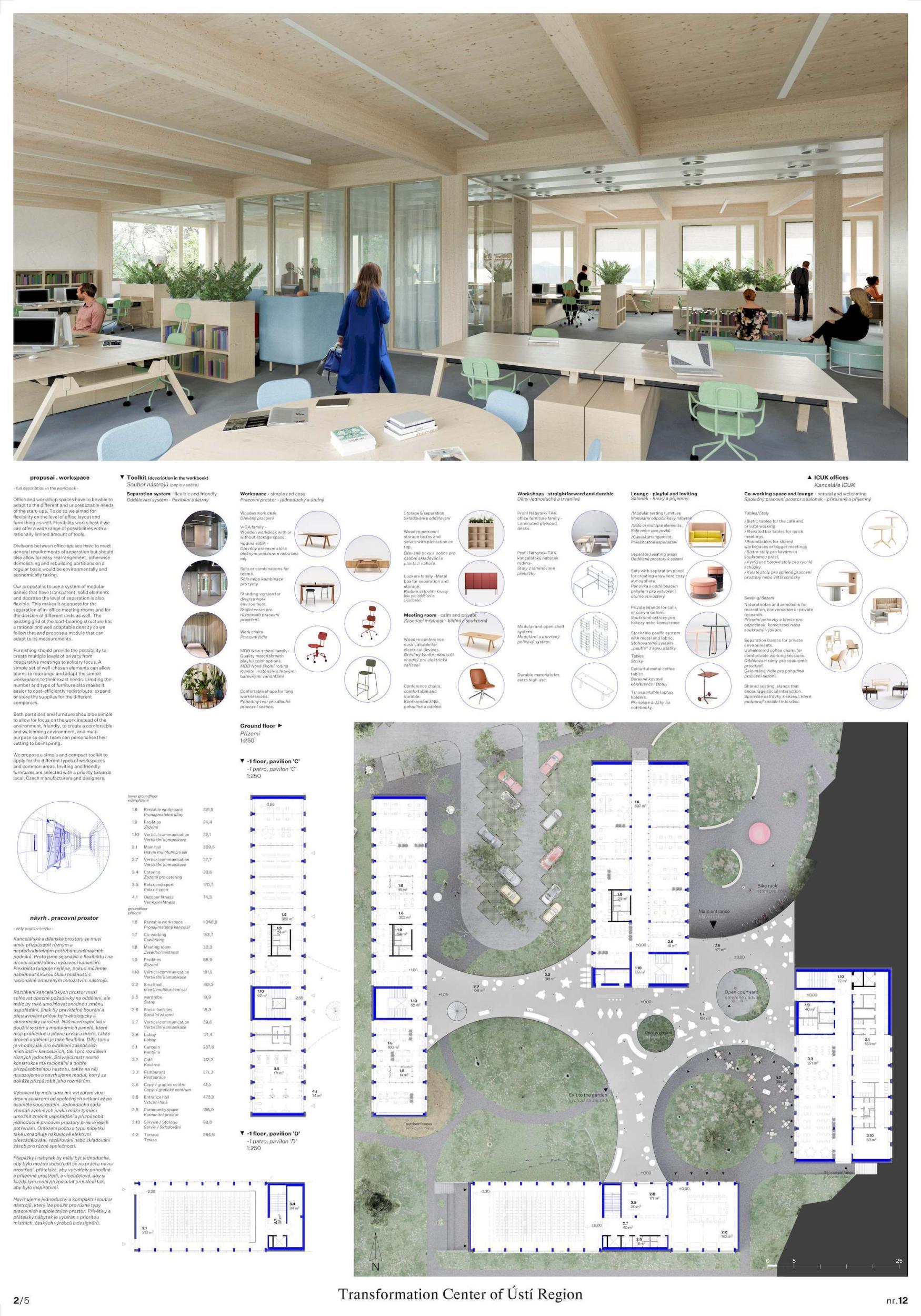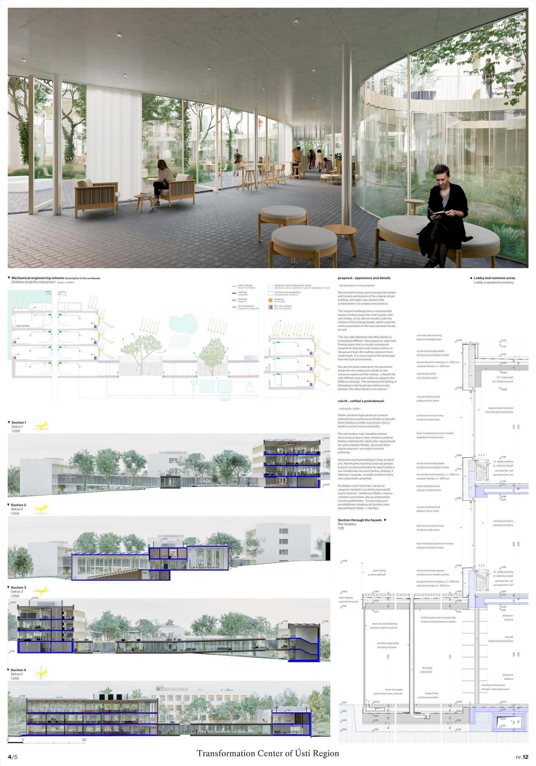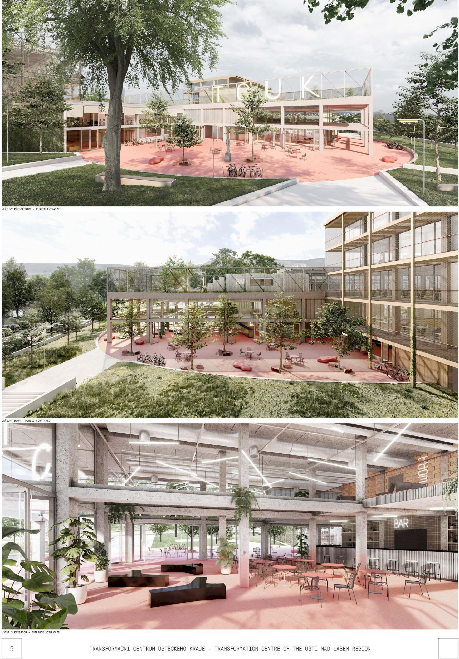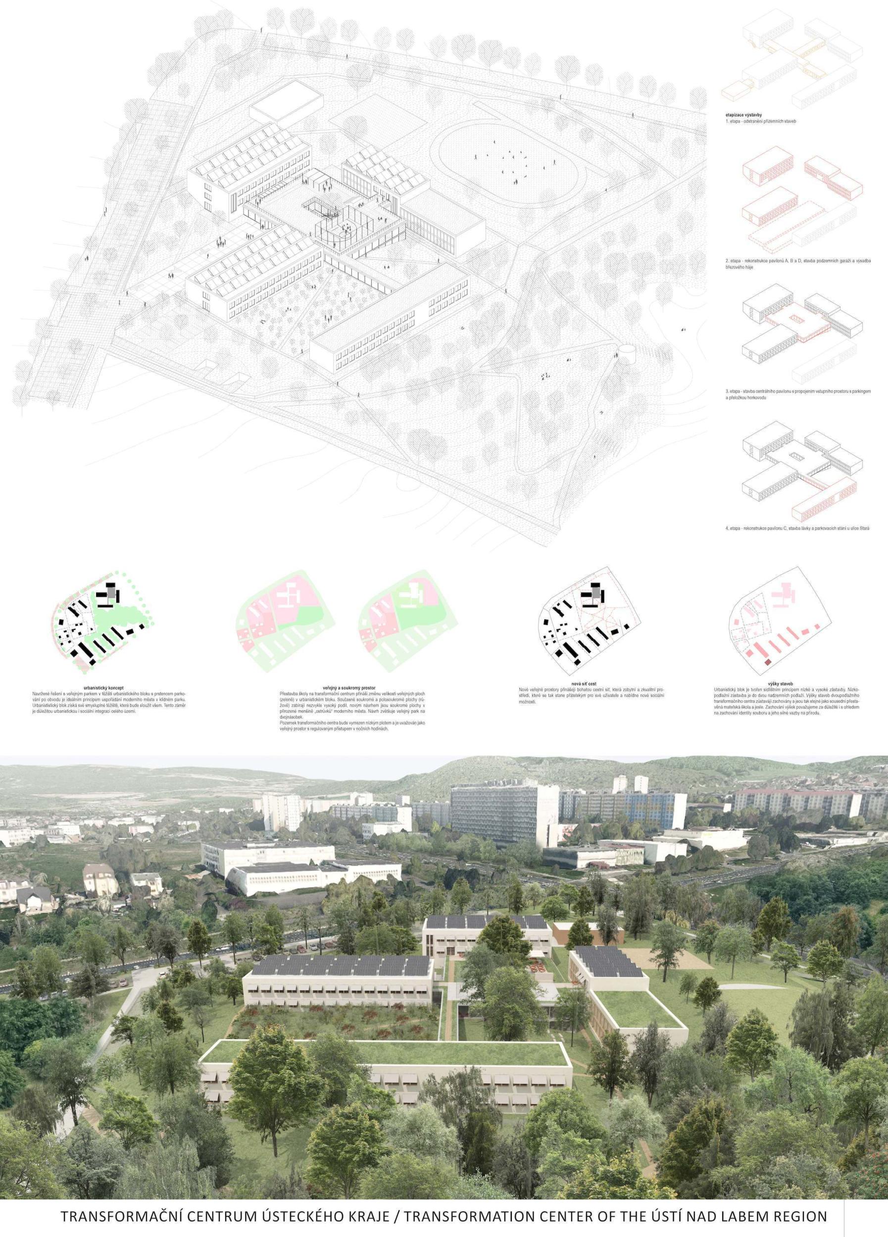 The persuasiveness of the design is evident at first glance with its rational approach to the architectural transformation of the existing site. The legibility of the new building modifications, the minimization of the built-up area, the easy phasing, and the adequacy of the investment costs combine to form an effective development strategy. Respect for the qualities of the original architectural aesthetic is given in contrast to the newly designed volumes added to the existing structure. The extensions thus create another layer of the building, and their expression harmoniously complements the image of the resulting mass. The material solution of the existing volumes sensitively interprets the original form of the façade. The new extensions are subtly differentiated in terms of material and substance. The central motif of the design is a simple walkway that connects the individual buildings and frames the outdoor space - the three courtyards that form the heart of the plan. The public spaces are conceived generously but proportionately to their use. The question is whether the inner courtyards between pavilions A, B and D duplicate each other in character and thus offer the same possibilities of use unnecessarily. There is a clear hierarchy in the layout and operation of the buildings, and the emphasis is on the flexibility of space, as demonstrated by the office use scenarios presented. All common meeting spaces flow into outdoor courtyards and naturally link the entire site into a functioning whole. A strong point of the design is the convincing concept of phasing, which allows for gradually redeveloping the buildings without significantly disrupting the site's operation. The jury highly appreciates the reflection of the criticism from the first round and the consistent refinement of the design for the second round, which gives a strong partner for the upcoming project development and its successful implementation.