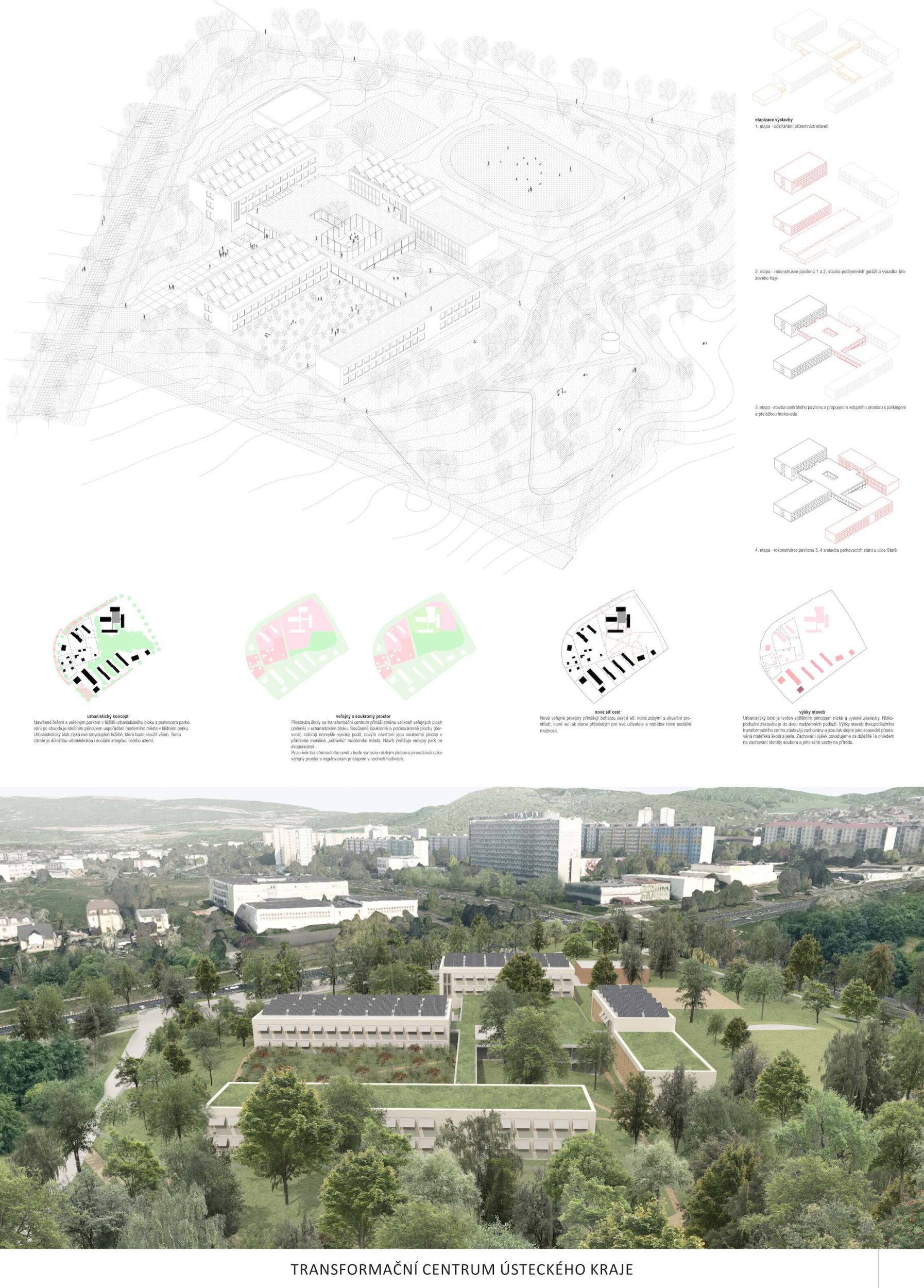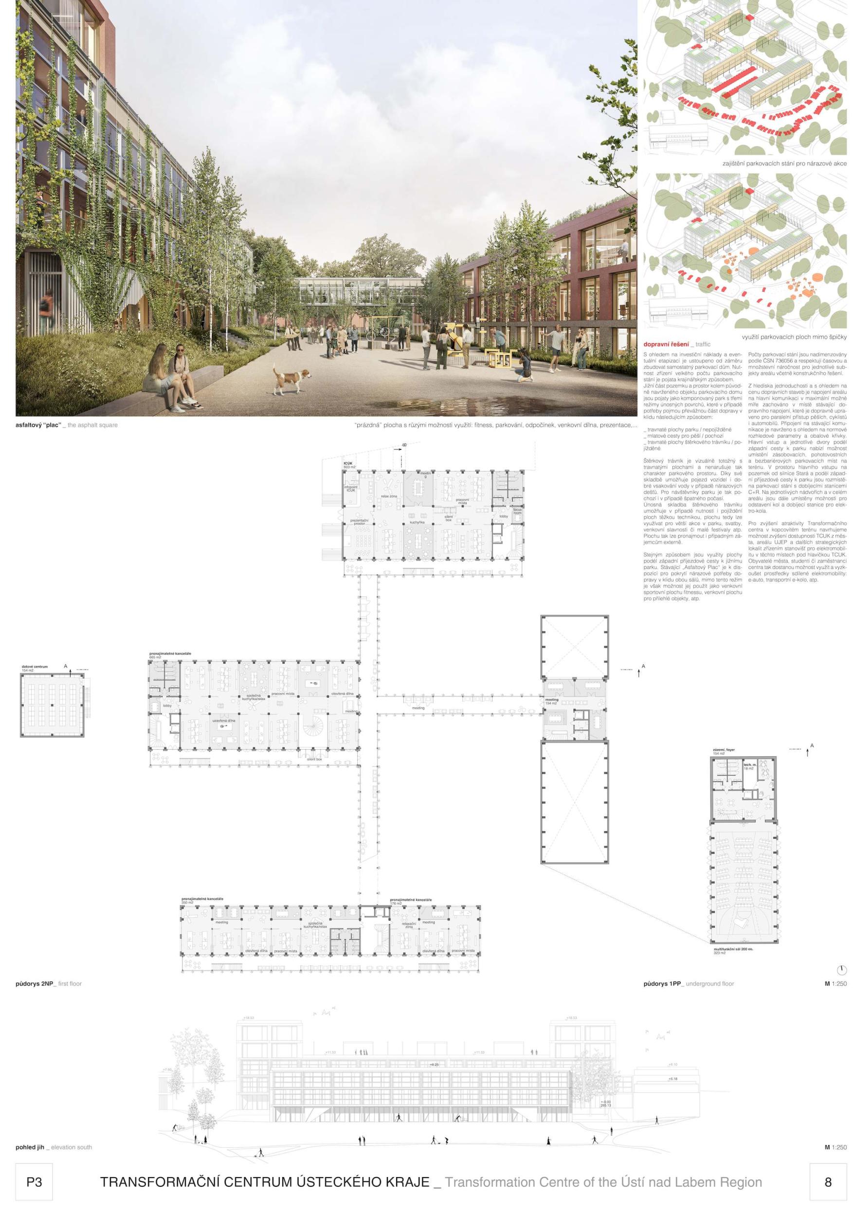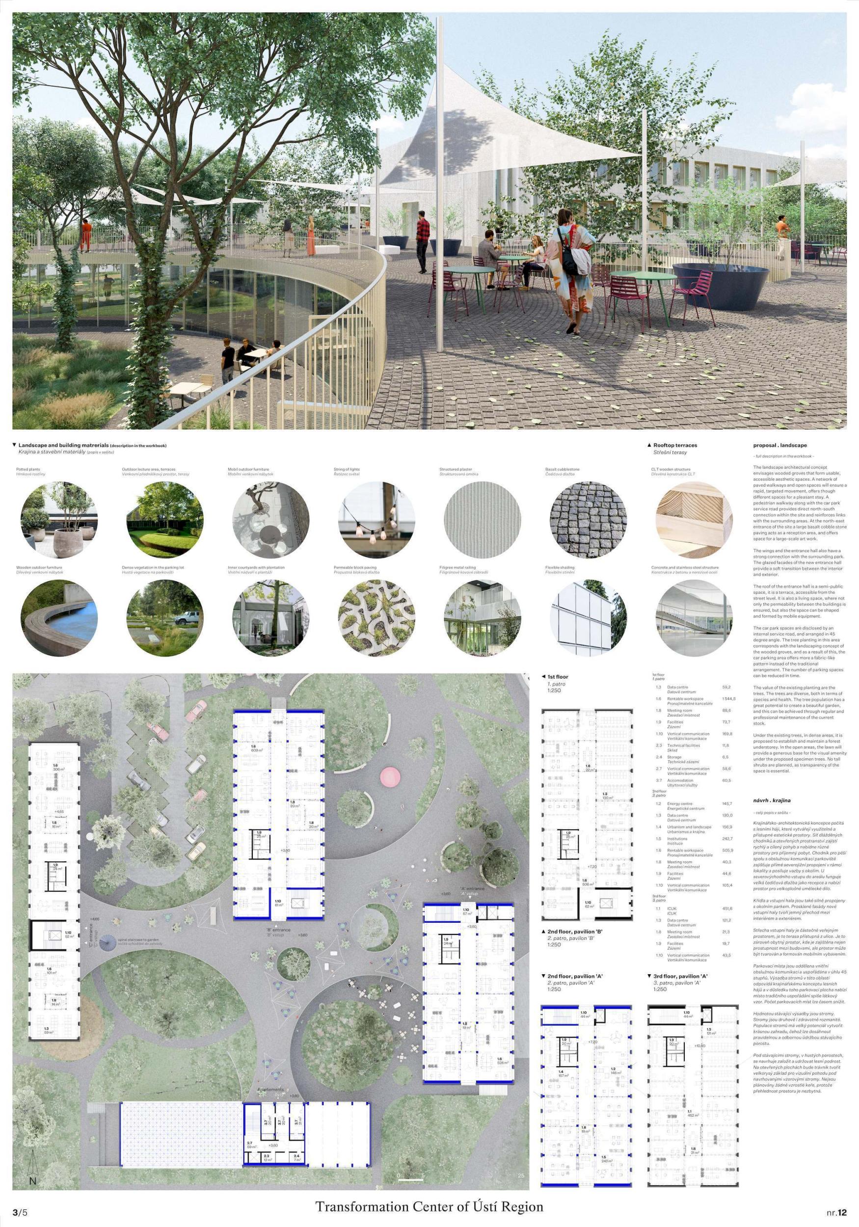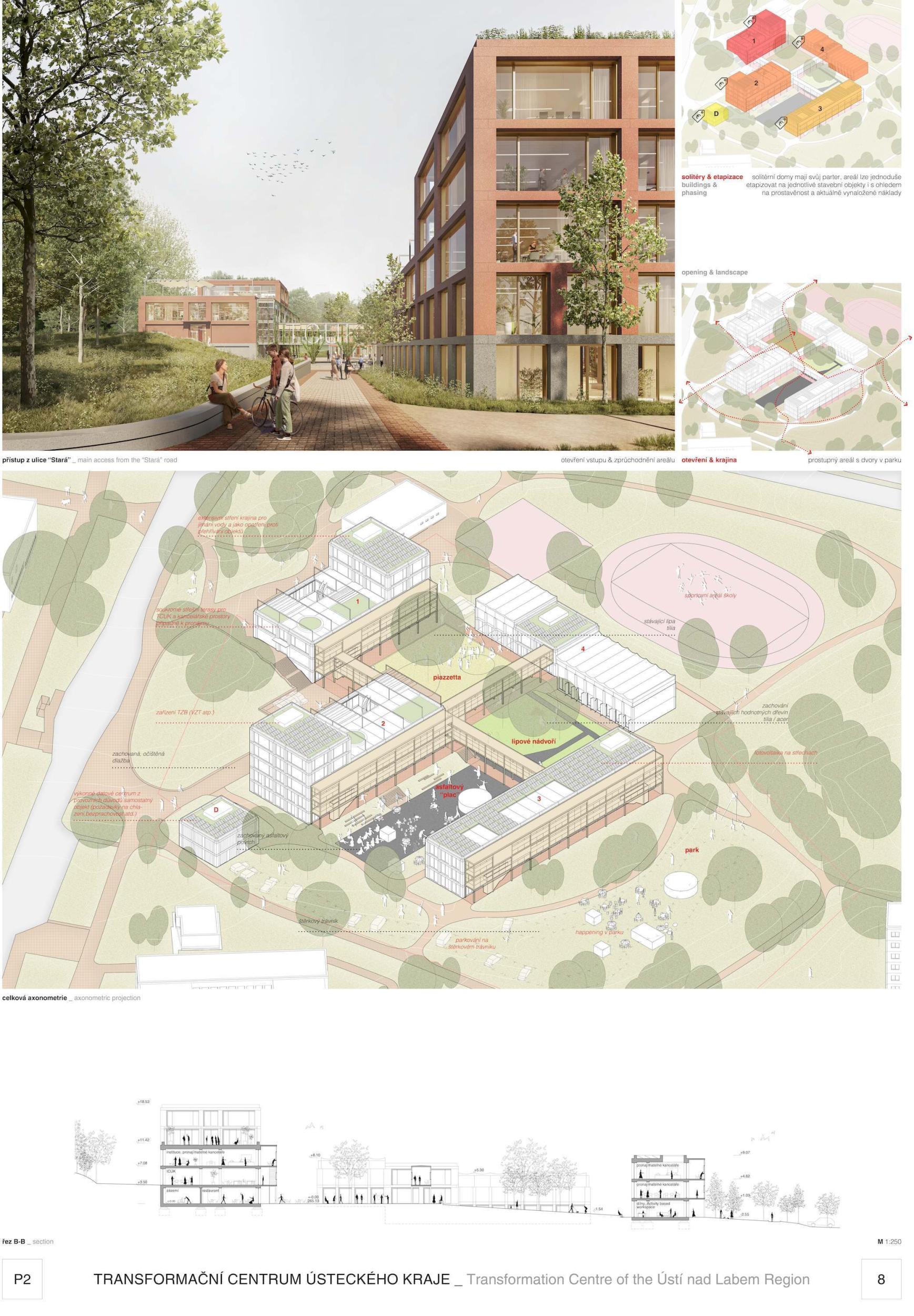 The persuasiveness of the design is evident at first glance with its rational approach to the architectural transformation of the existing site. The legibility of the new building modifications, the minimization of the built-up area, the easy phasing, and the adequacy of the investment costs combine to form an effective development strategy. Respect for the qualities of the original architectural aesthetic is given in contrast to the newly designed volumes added to the existing structure. The extensions thus create another layer of the building, and their expression harmoniously complements the image of the resulting mass. The material solution of the existing volumes sensitively interprets the original form of the façade. The new extensions are subtly differentiated in terms of material and substance. The central motif of the design is a simple walkway that connects the individual buildings and frames the outdoor space - the three courtyards that form the heart of the plan. The public spaces are conceived generously but proportionately to their use. The question is whether the inner courtyards between pavilions A, B and D duplicate each other in character and thus offer the same possibilities of use unnecessarily. There is a clear hierarchy in the layout and operation of the buildings, and the emphasis is on the flexibility of space, as demonstrated by the office use scenarios presented. All common meeting spaces flow into outdoor courtyards and naturally link the entire site into a functioning whole. A strong point of the design is the convincing concept of phasing, which allows for gradually redeveloping the buildings without significantly disrupting the site's operation. The jury highly appreciates the reflection of the criticism from the first round and the consistent refinement of the design for the second round, which gives a strong partner for the upcoming project development and its successful implementation.