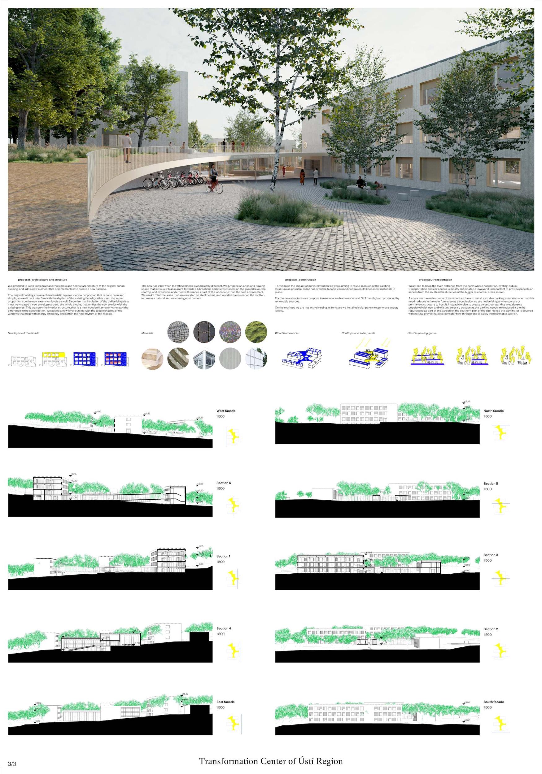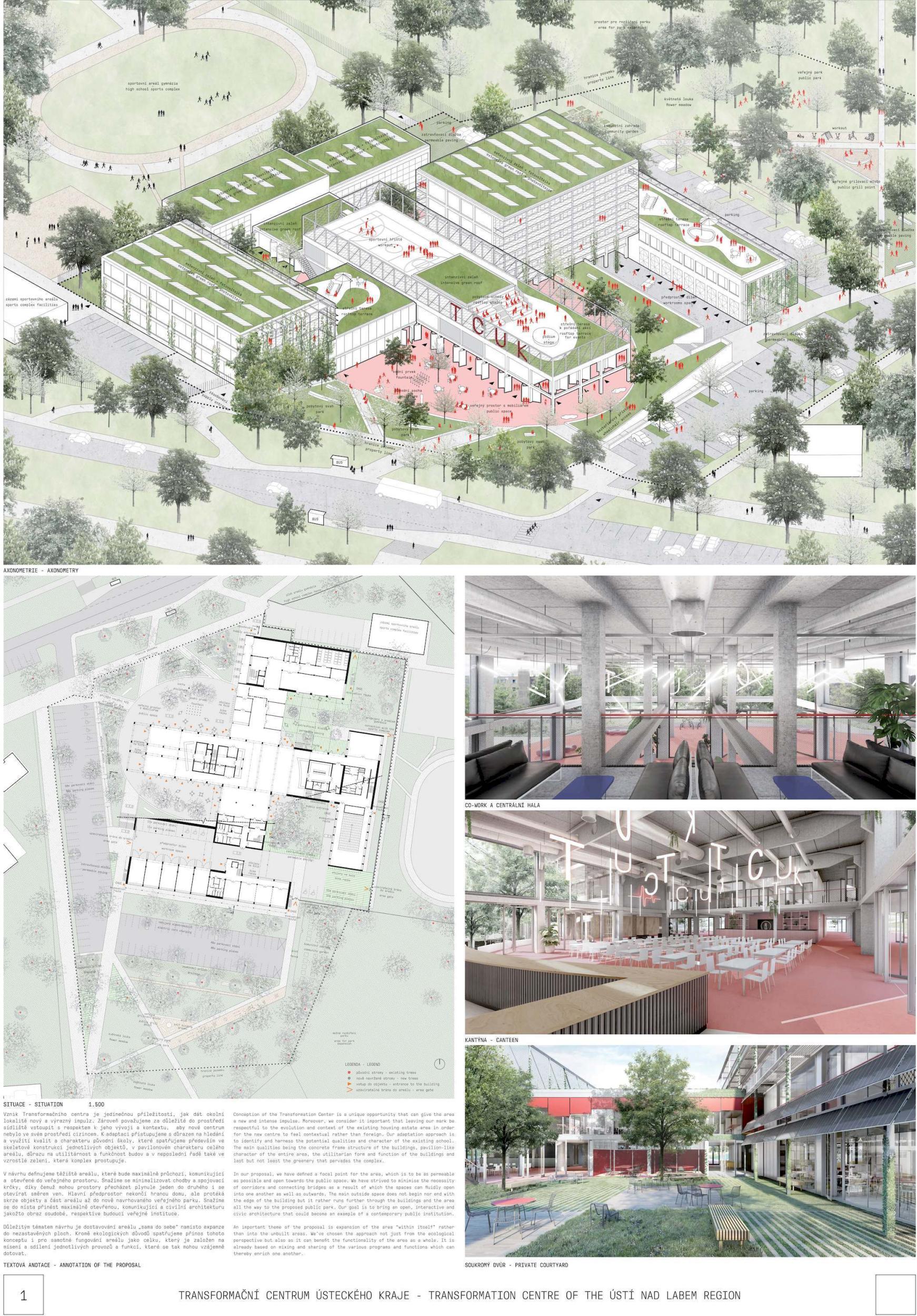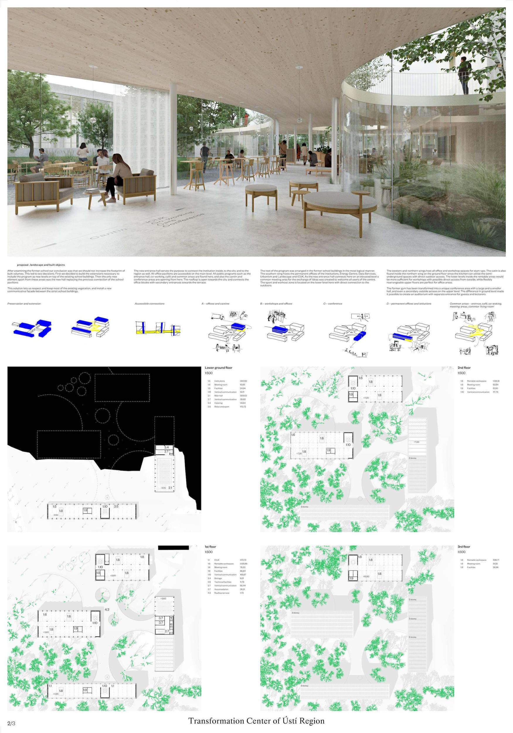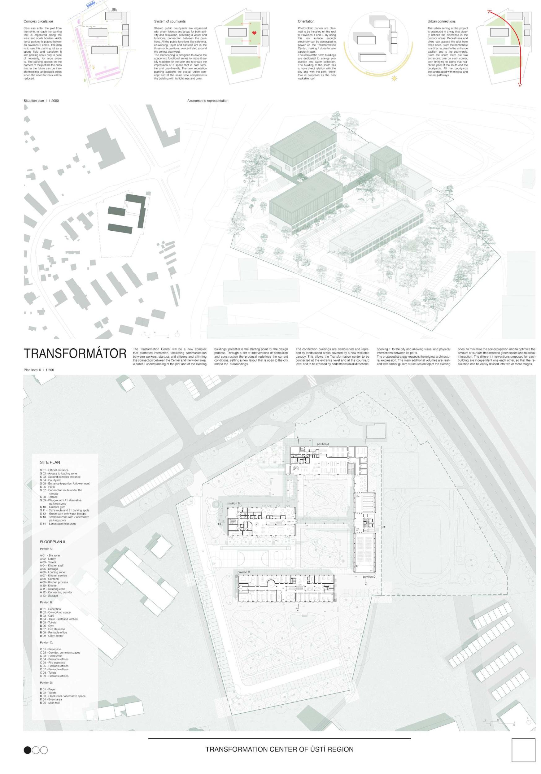 The Trasformation center will be a new complex that promotes interaction, facilitating communication between workers, startups and citizens and affirming the connection between the citycenter and the wider area. A careful understanding of the plot and of the existing buildings’ potential is the starting point for the design process. Through a set of interventions of demolition and construction the proposal redefines the current conditions, setting a new layout that is open to the city and to the surroundings. The existing connection buildings are demolished and replaced by landscaped areas covered by a new walkable canopy. This allows the Transformation center to be connected at the entrance level and at the courtyard level and to be crossed by pedestrians in all directions, opening it to the city and allowing visual and physical interactions between its parts. The proposed strategy respects the original architectural expression. The main additional volumes are realized with timber glulam structures on top of the existing concrete ones, to minimize the soil occupation and to optimize the amount of surface dedicated to green space and to social interaction. The different interventions proposed for each building are independent one each other, so that the realization can be easily divided in stages