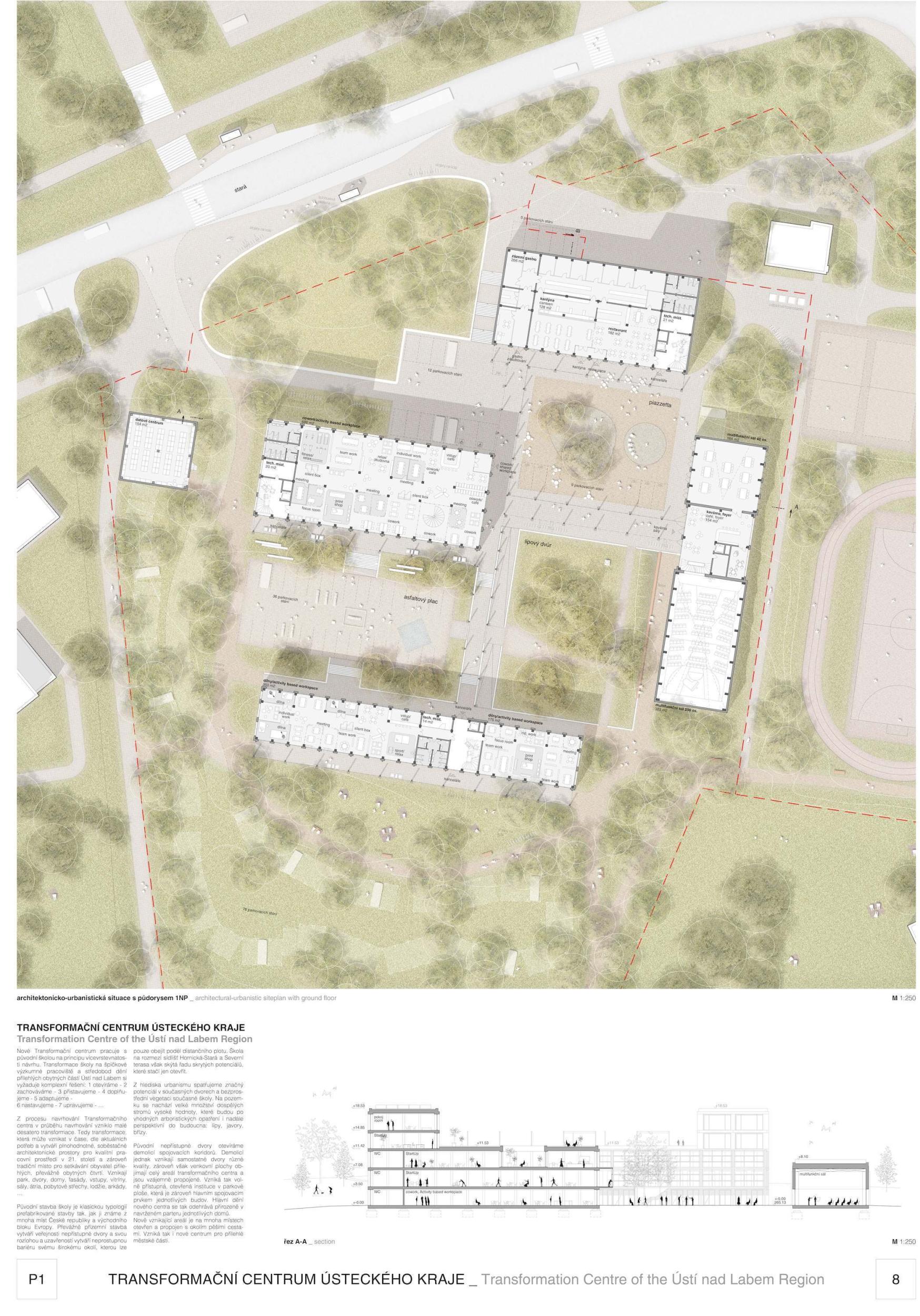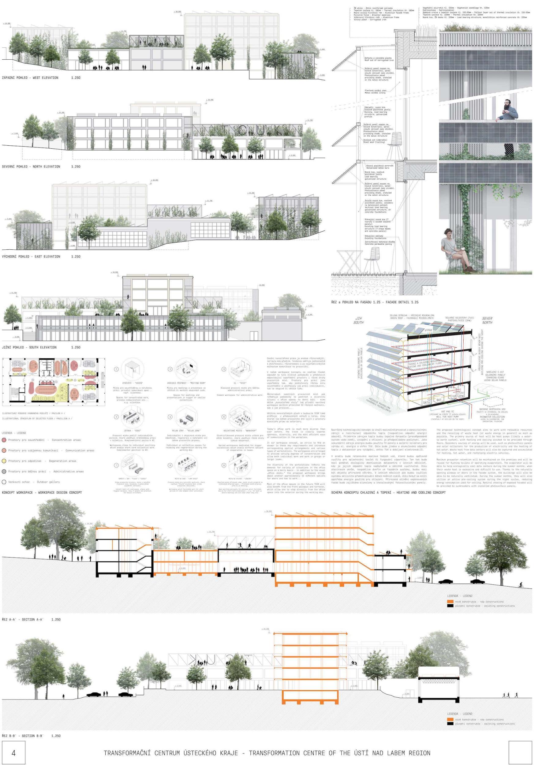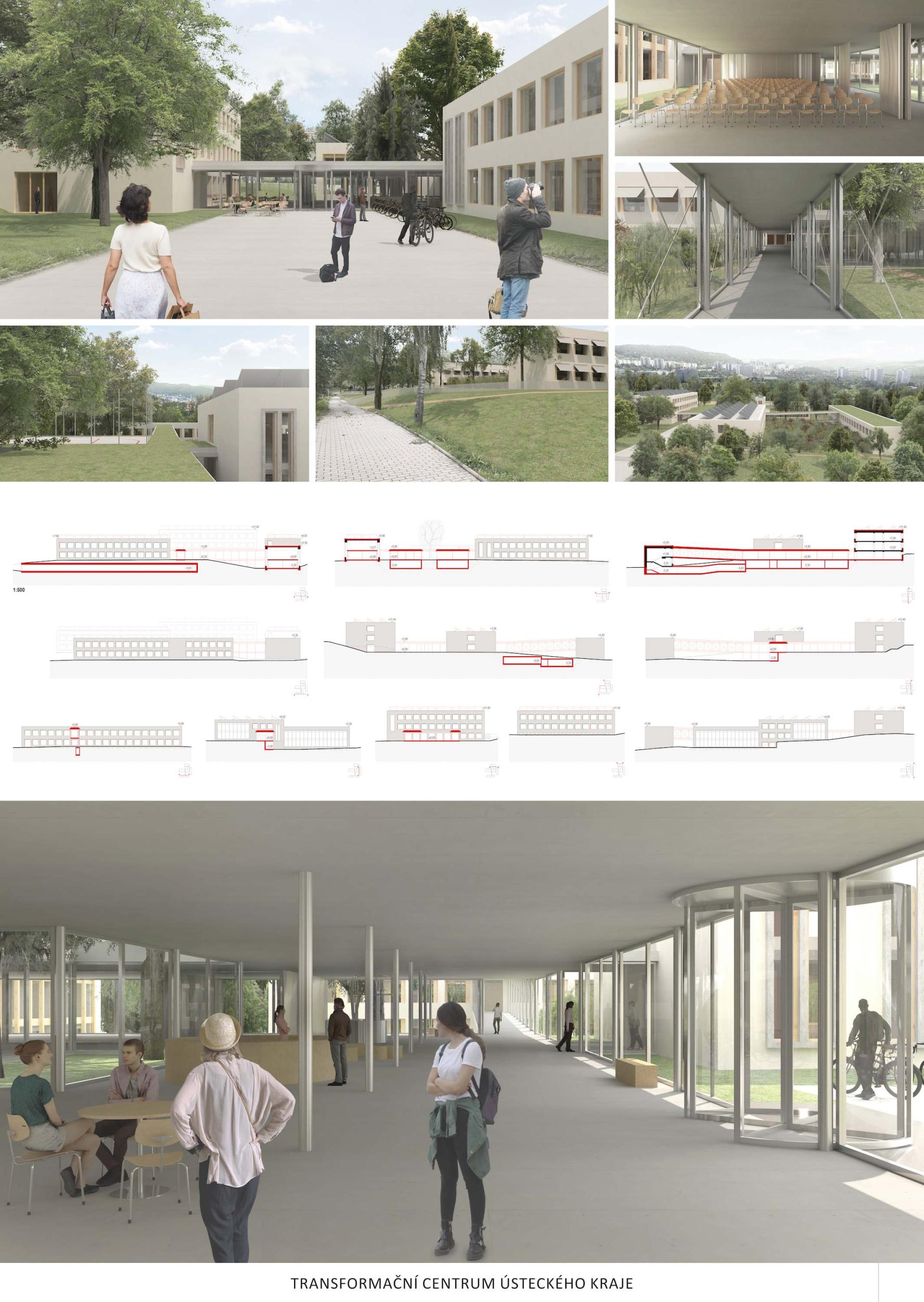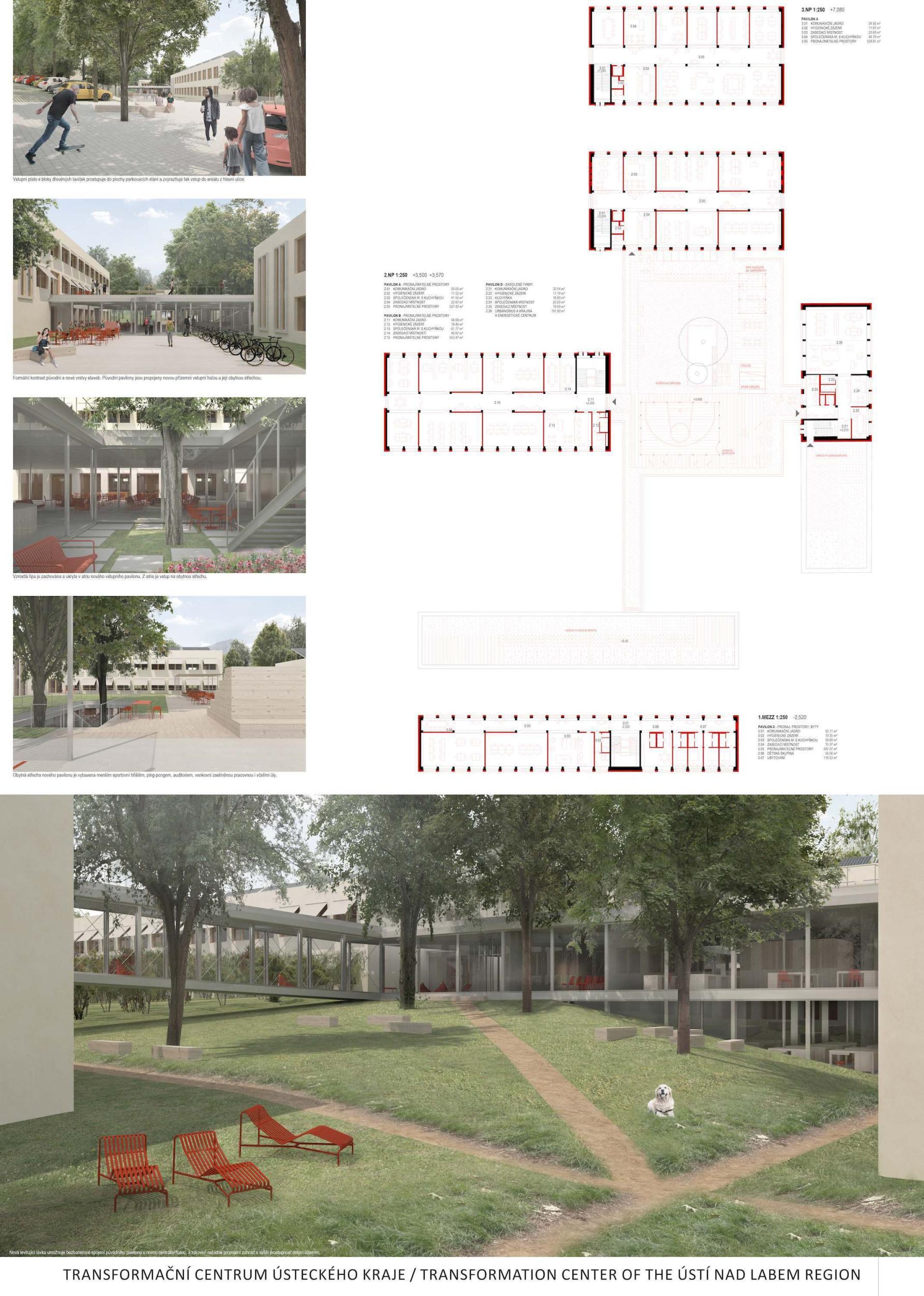 The Trasformation center will be a new complex that promotes interaction, facilitating communication between workers, startups and citizens and affirming the connection between the citycenter and the wider area. A careful understanding of the plot and of the existing buildings’ potential is the starting point for the design process. Through a set of interventions of demolition and construction the proposal redefines the current conditions, setting a new layout that is open to the city and to the surroundings. The existing connection buildings are demolished and replaced by landscaped areas covered by a new walkable canopy. This allows the Transformation center to be connected at the entrance level and at the courtyard level and to be crossed by pedestrians in all directions, opening it to the city and allowing visual and physical interactions between its parts. The proposed strategy respects the original architectural expression. The main additional volumes are realized with timber glulam structures on top of the existing concrete ones, to minimize the soil occupation and to optimize the amount of surface dedicated to green space and to social interaction. The different interventions proposed for each building are independent one each other, so that the realization can be easily divided in stages