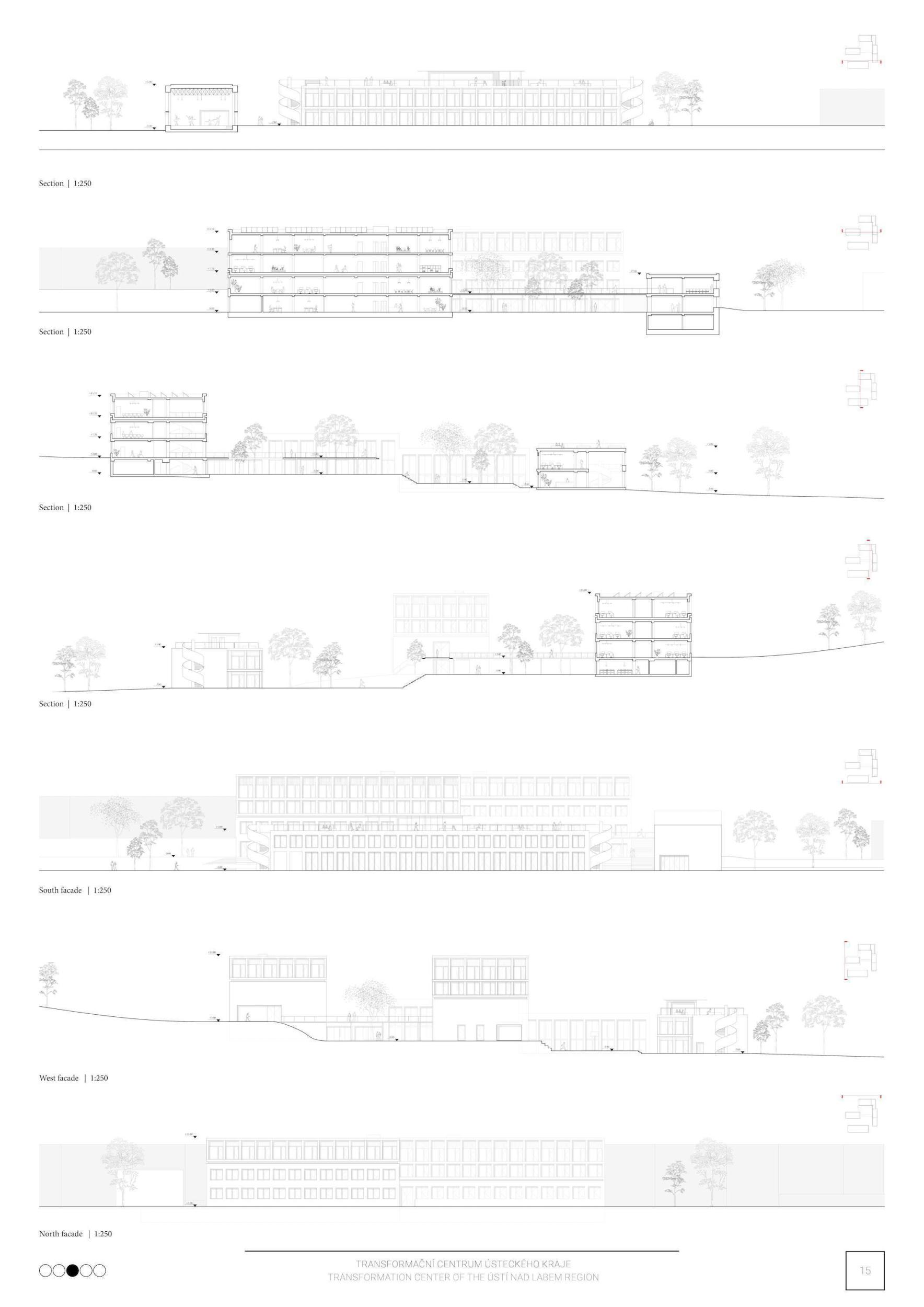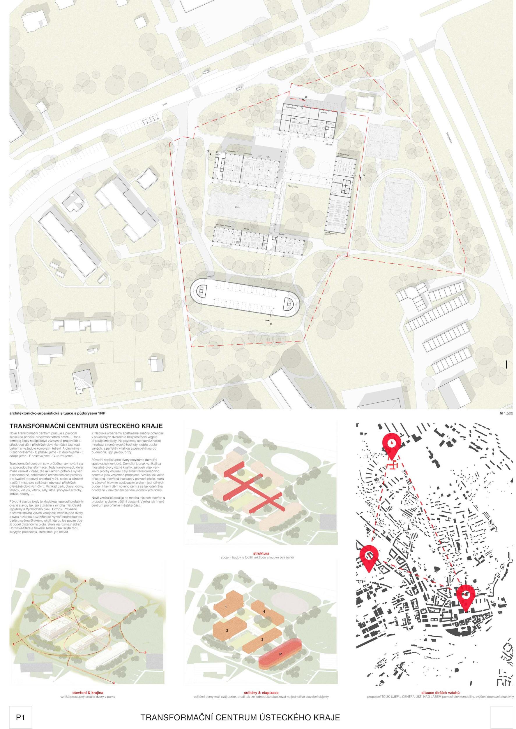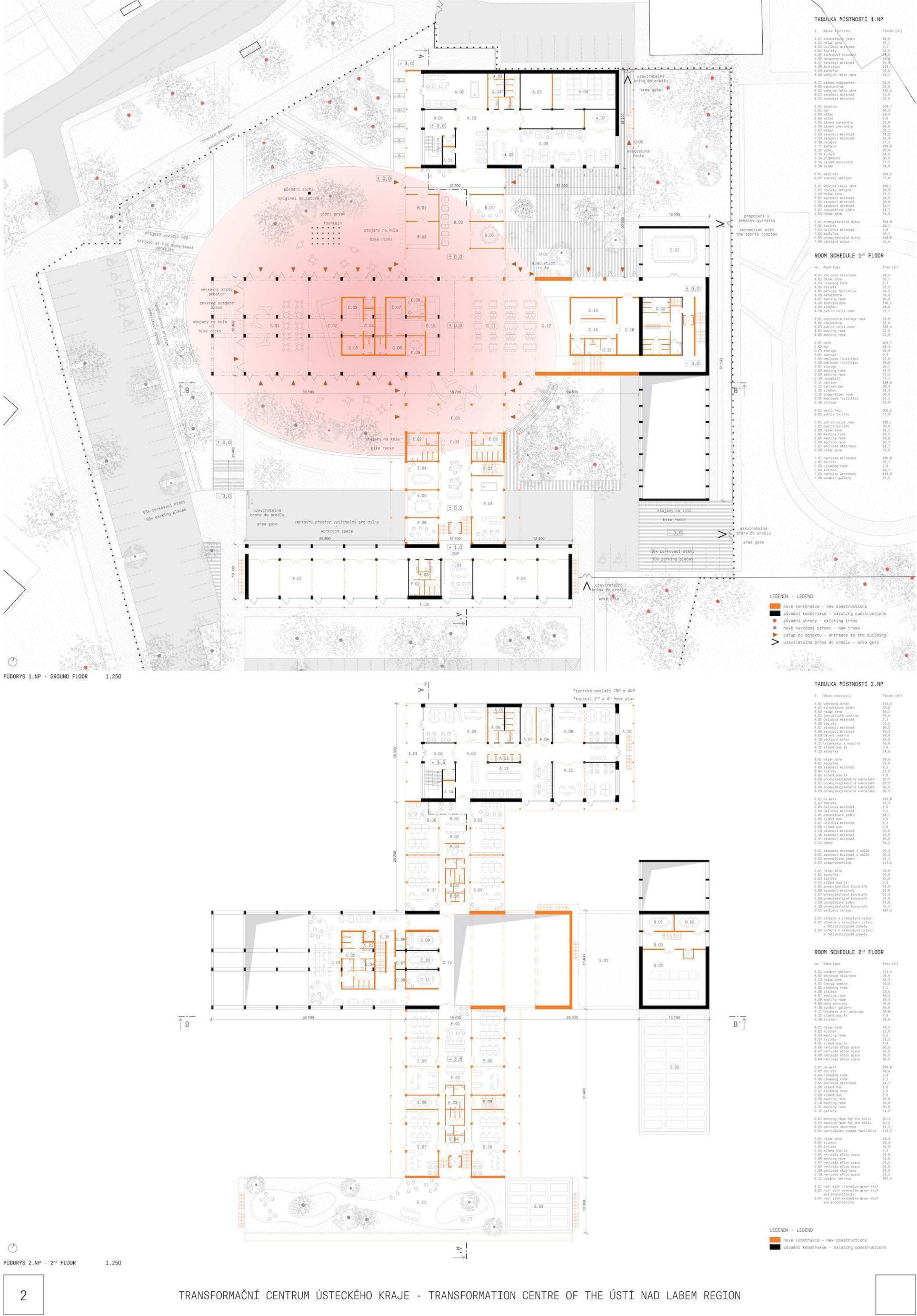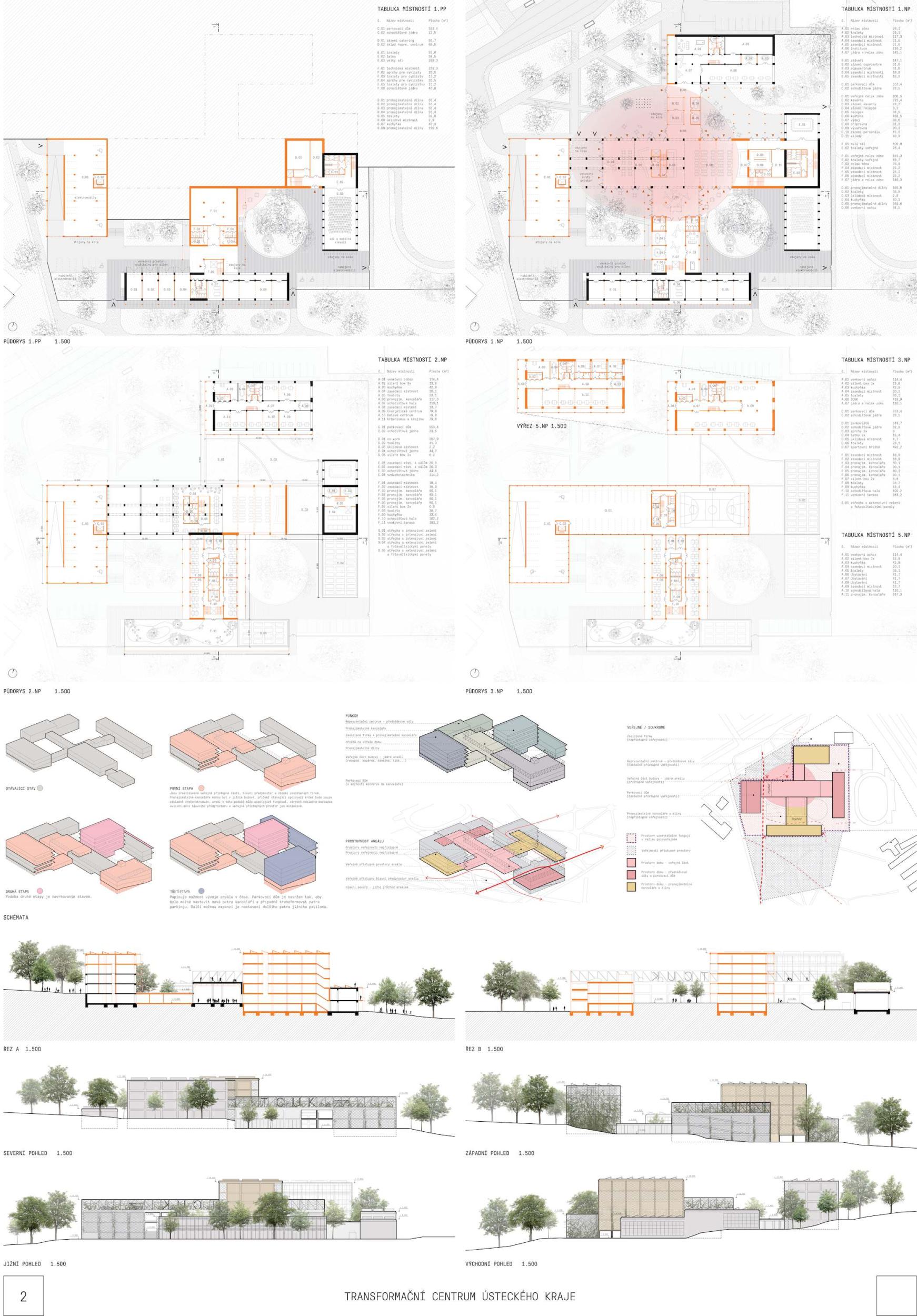 The Trasformation center will be a new complex that promotes interaction, facilitating communication between workers, startups and citizens and affirming the connection between the citycenter and the wider area. A careful understanding of the plot and of the existing buildings’ potential is the starting point for the design process. Through a set of interventions of demolition and construction the proposal redefines the current conditions, setting a new layout that is open to the city and to the surroundings. The existing connection buildings are demolished and replaced by landscaped areas covered by a new walkable canopy. This allows the Transformation center to be connected at the entrance level and at the courtyard level and to be crossed by pedestrians in all directions, opening it to the city and allowing visual and physical interactions between its parts. The proposed strategy respects the original architectural expression. The main additional volumes are realized with timber glulam structures on top of the existing concrete ones, to minimize the soil occupation and to optimize the amount of surface dedicated to green space and to social interaction. The different interventions proposed for each building are independent one each other, so that the realization can be easily divided in stages