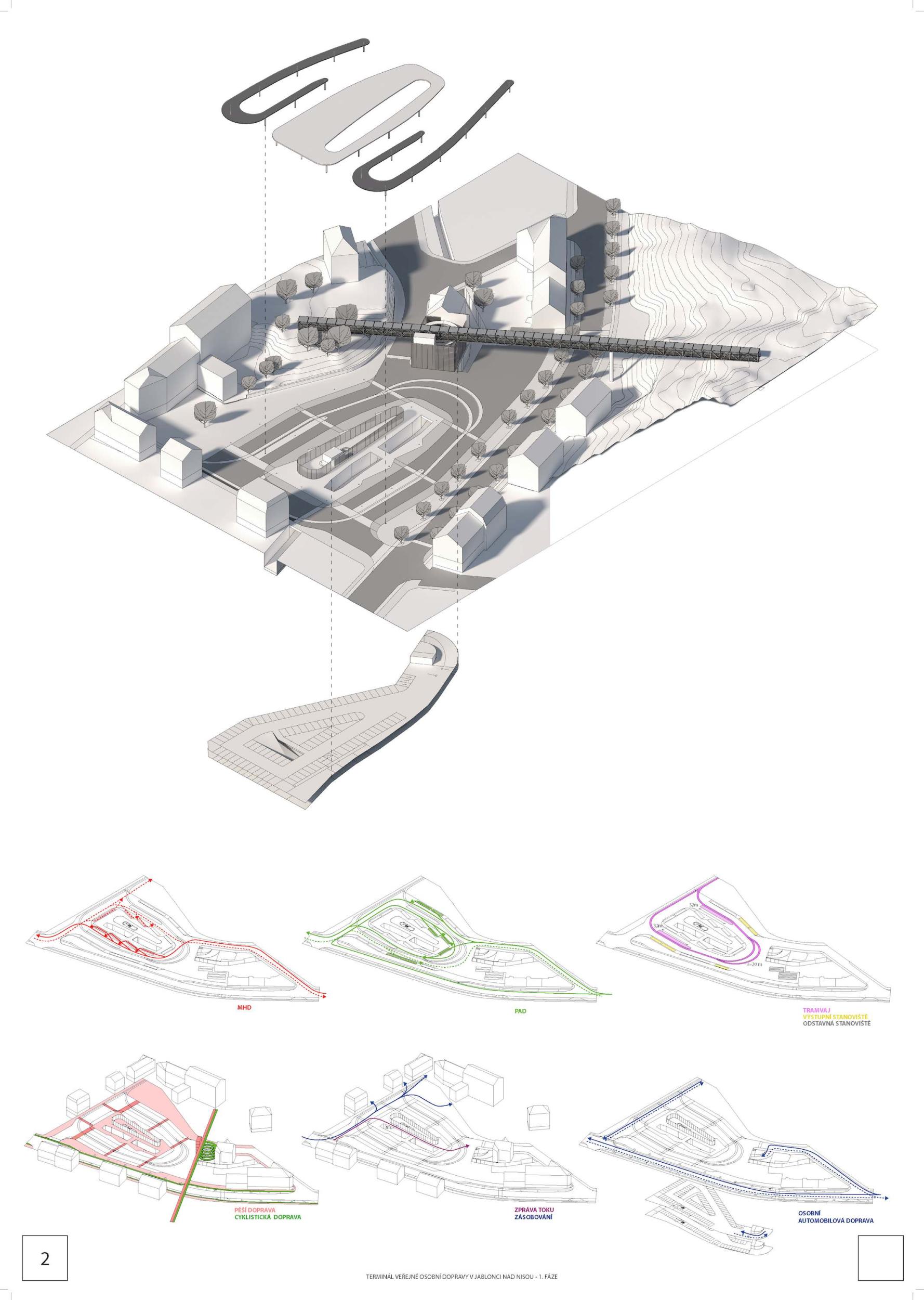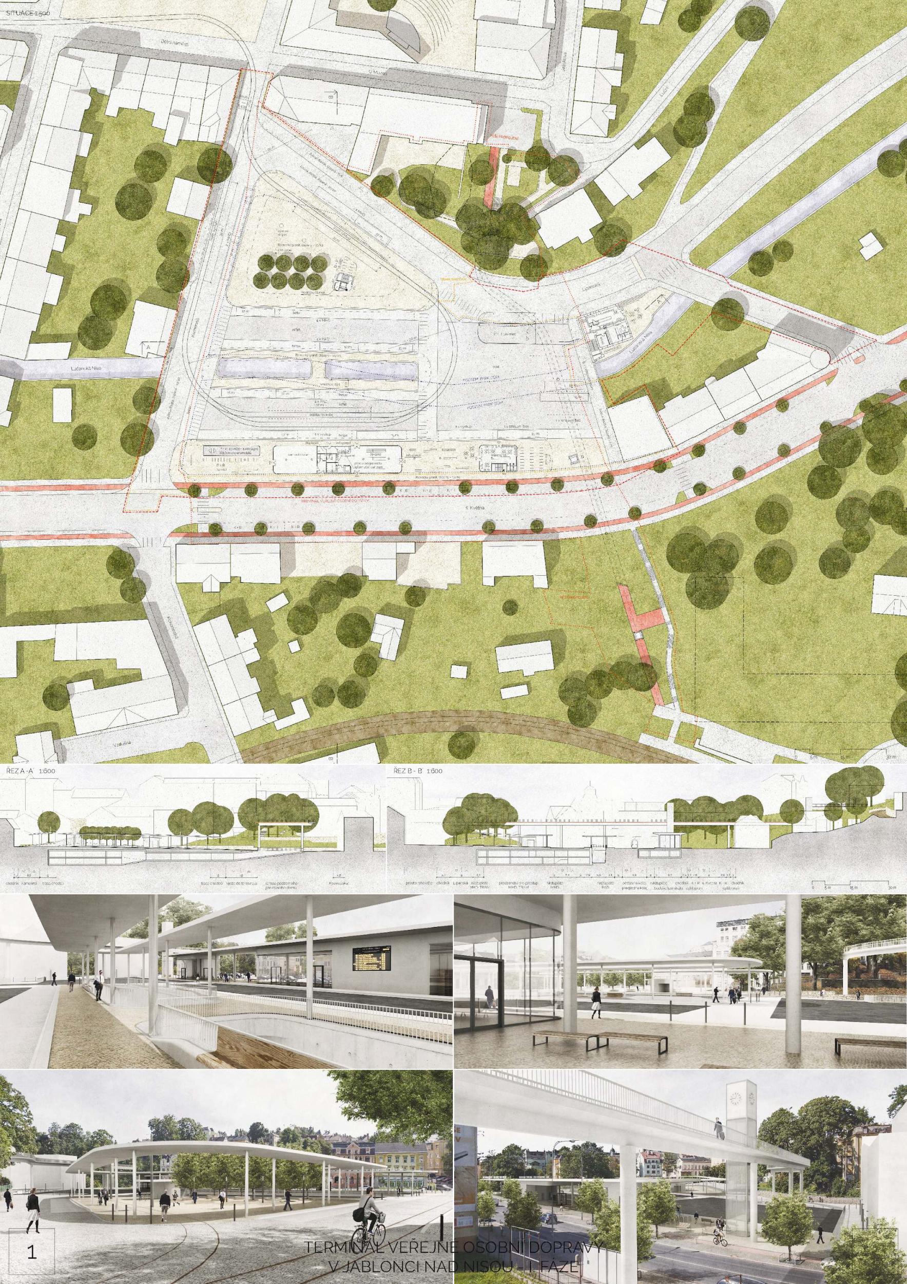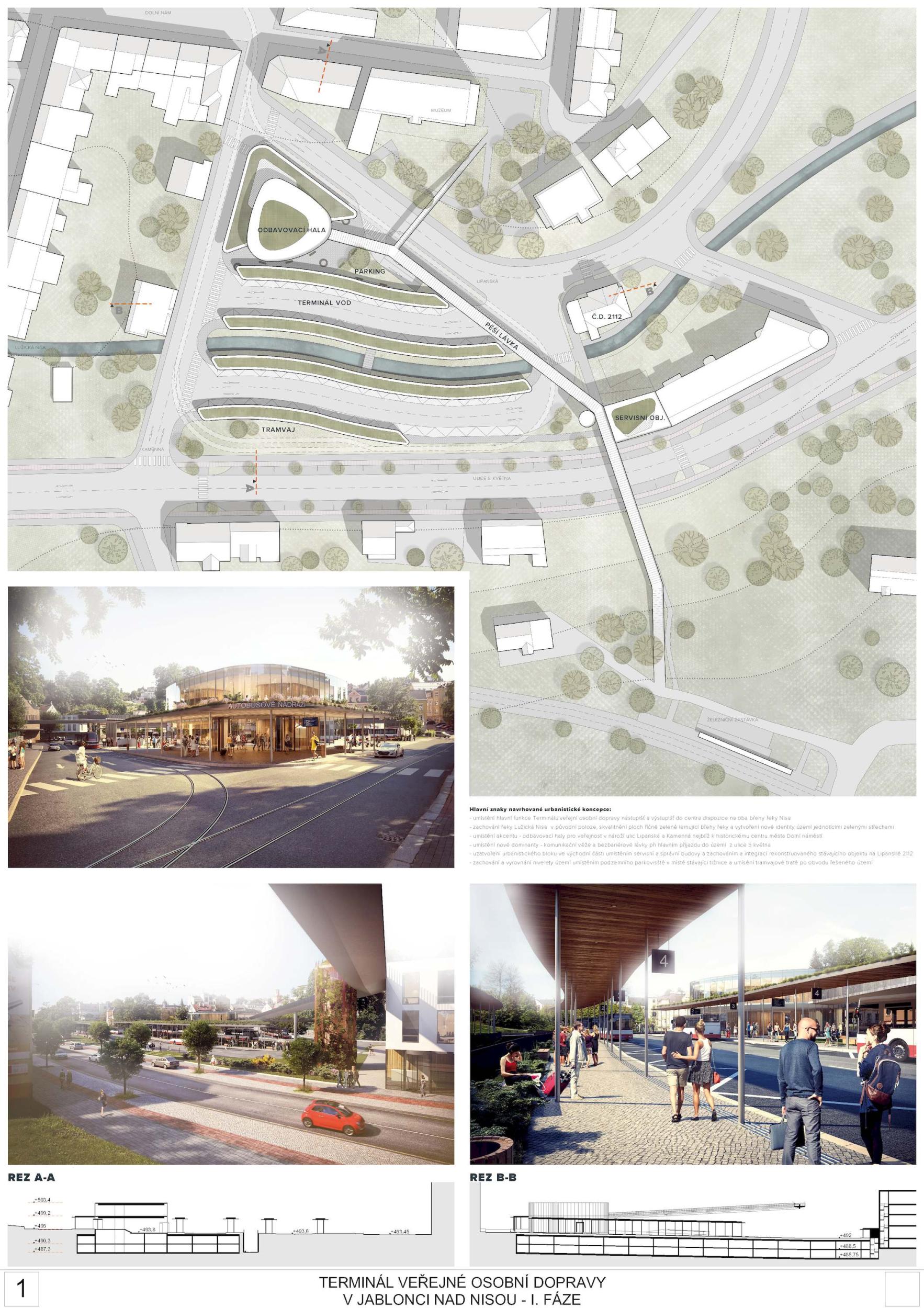 According to the criterion Architectural and urban values of the design, the jury appreciated especially the central design of the arrival hall, covered areas for pedestrian movement, the design of the watercourse and, last but not least, the preservation of views of the museum building According to the criterion Quality of public space, the jury appreciated especially the compact design of the platforms, enabling safe pedestrian movement and the emphasis on minimizing the areas of traffic corridors. According to the criterion Amount of construction and investment costs and operating costs of the buildings, the jury appreciated the credibility of the established unit prices of the declared costs, economy in areas for heavy traffic. According to the criterion Traffic and technical design of the proposal, the jury particularly appreciated the design of the tram stop outside the main terminal, clear and compact platforms and straight platform edges.