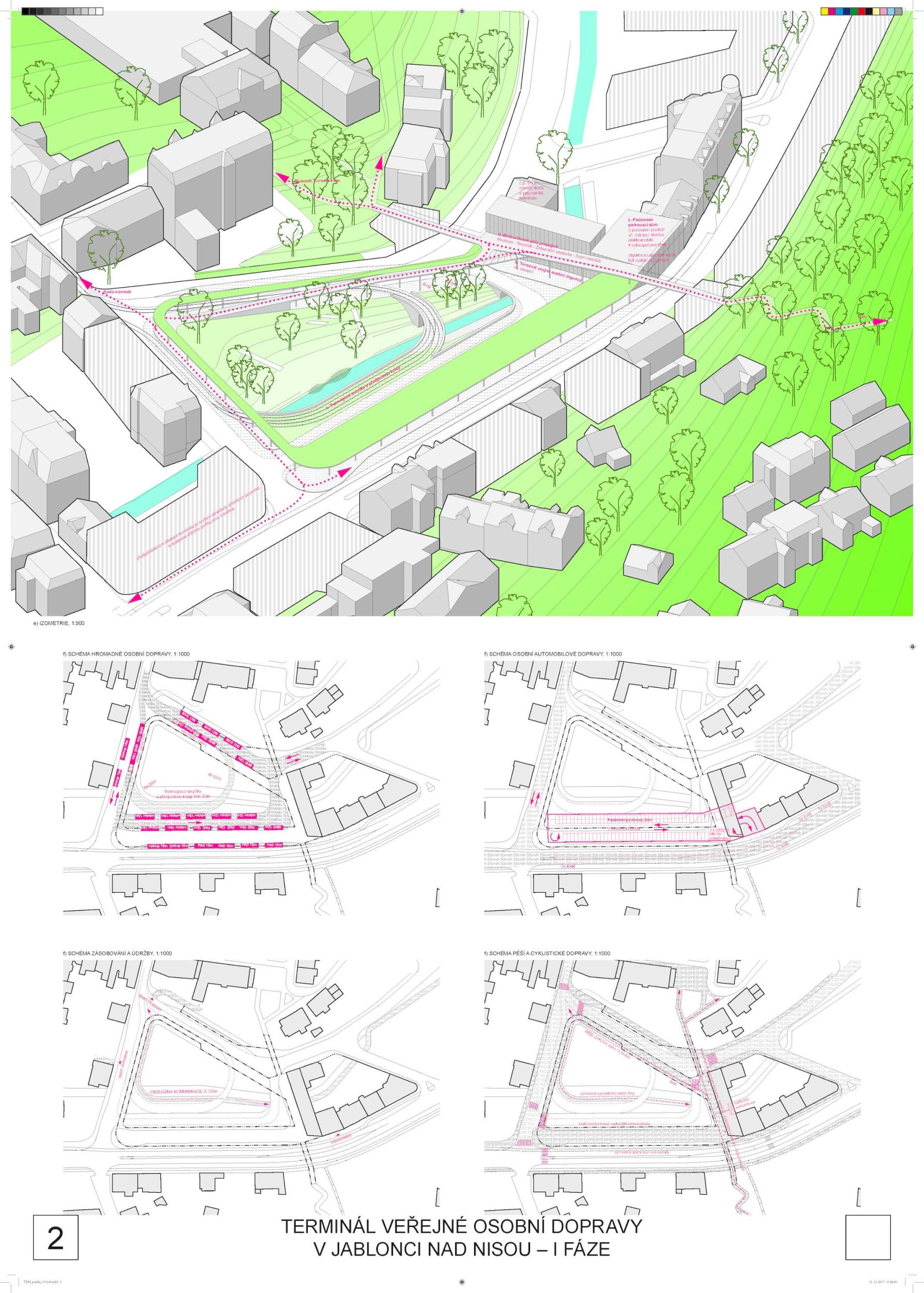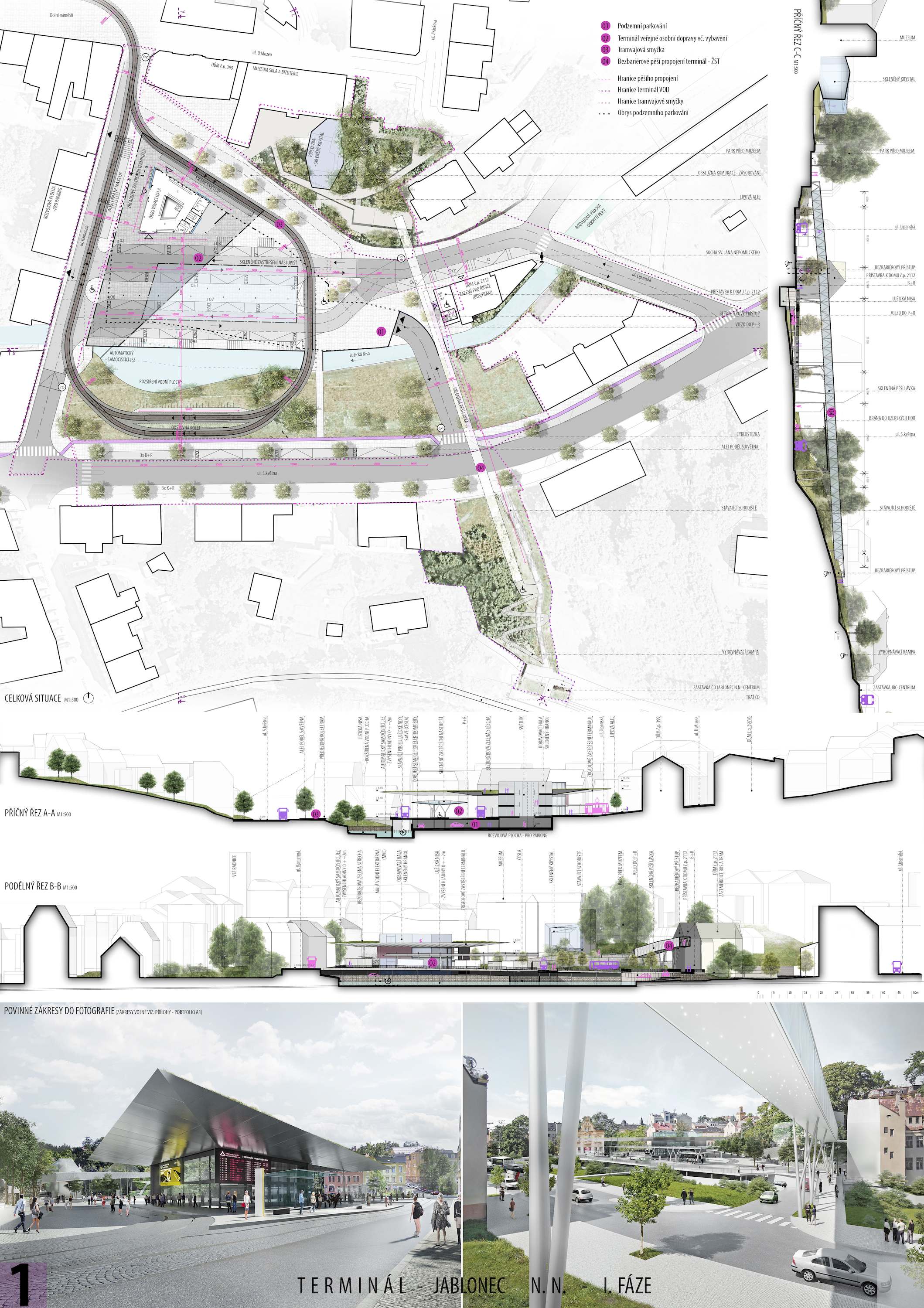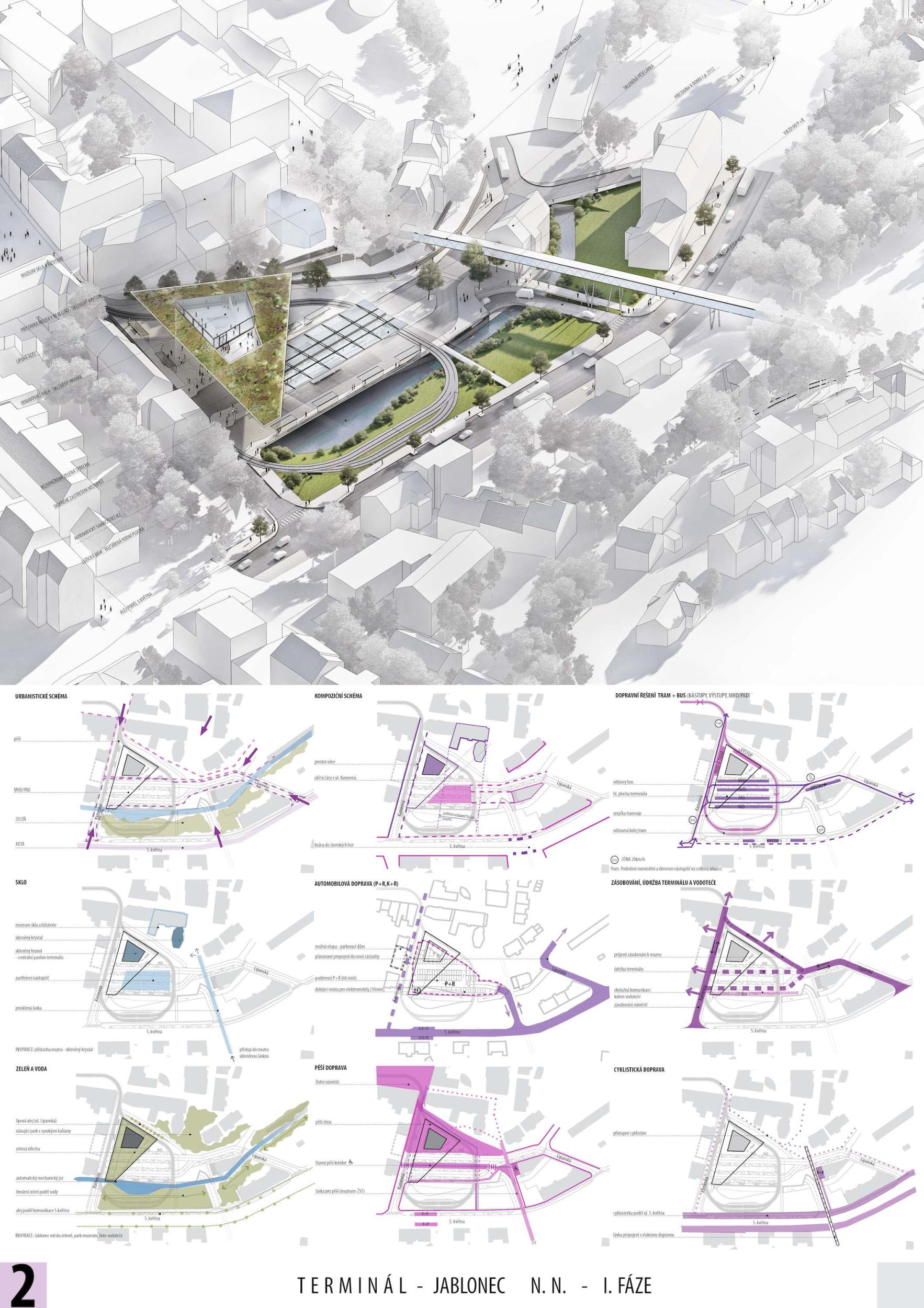 The inspiration for the proposed solution is glass, water, glitter and greenery. The design complements the existing fabric of the city. The terminal is designed as a transparent glass prism that echoes the new extension to the Museum of Glass and Jewellery and penetrates the 'flying' roof of the terminal, which completes the street frontage of Kamenná Street. This closes the historical form of the street network - the Jablonec "ladder". The public spaces have been extended. The watercourse including greenery is accentuated. Transport is designed efficiently, clearly and safely.