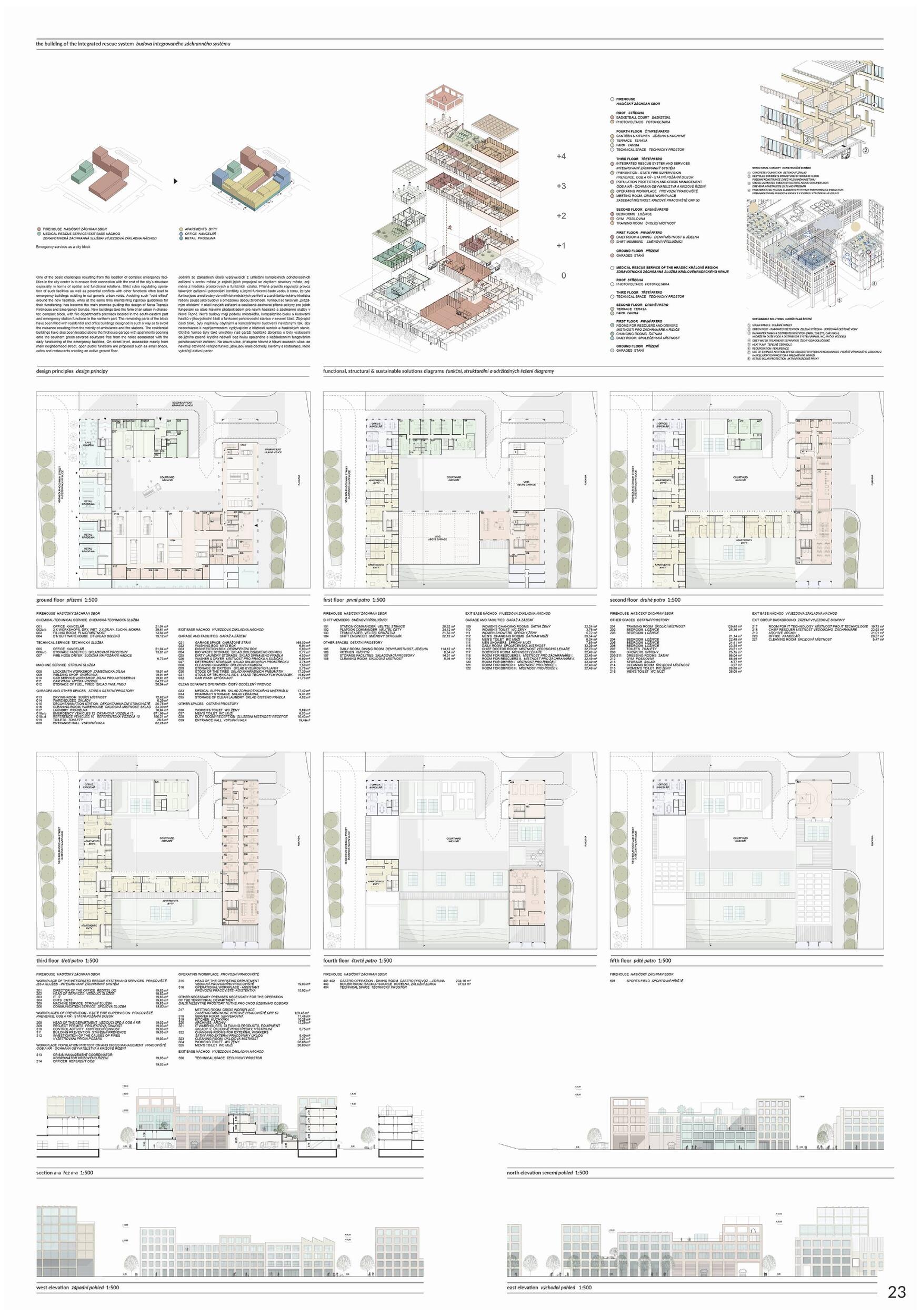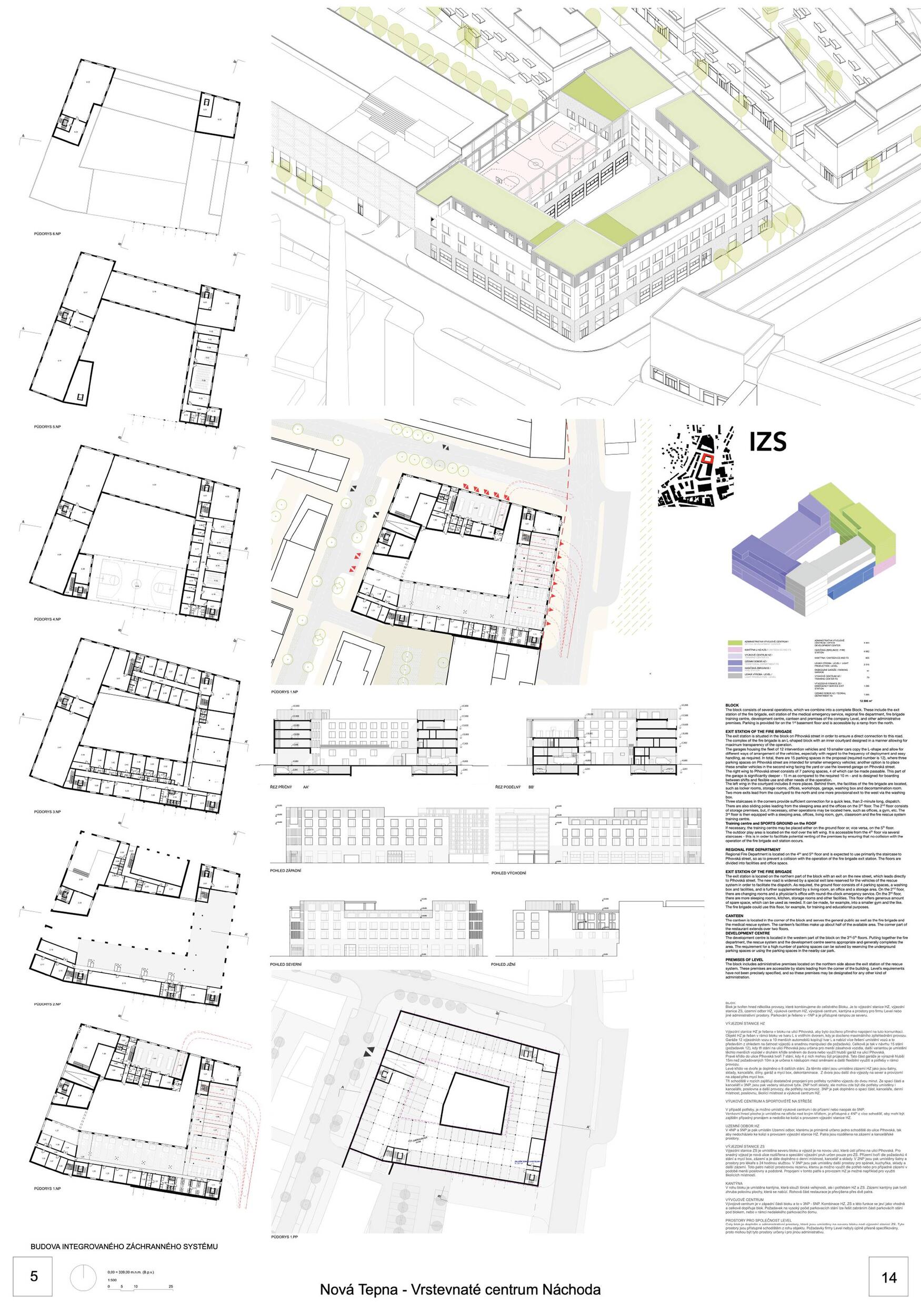 The authors of the proposal divide the area into larger building blocks, which are practical for various types of use and can better respond to more complex property conditions. For example, the block where the LIDL is located may offer more possible scenarios for future use than if it were divided into smaller ones. The strong point of the design is also the space along the castle park, where a nice edge of public space is created. In this sense, however, the proposal would be suitable for the modification of private garages, which, however, is difficult to imagine in the foreseeable future. In the overall spatial rendering of the streets and squares, the proposal, unfortunately, is no longer so convincing and does not fully exploit the potential of the place. Square U Přádelny is less legible in shape and breaks up into more free spaces without a clear hierarchy and shaping. Similarly, the square near the historic center does not have enough facades to surround it, so that one can really mark it as a square. The tracing of the street axes raised questions for the jury. The connection to Charles Square heading to U Přádelny Square was obvious. From here, however, the leading streets lack continuity. It usually ends with a facade and a T junction. The natural road from the Plhov housing estate to Masaryk Square is led at the foot of the castle hill, de facto by the current road. It is therefore not clear what will bring pedestrians to the newly defined center. The selected scale of building materials is user-friendly. Long facades along the border of the solved area could sometimes be enriched with a view, especially at the complex of the parking house and the IRS. The bird's eye view reveals the delicate shaping and dodging of the roofs, creating terraces belonging to the apartments on the highest floors. However, the jury considers the shaping and subtle play to be more formal, which is also indicated by the flat stretching of the roofs with a green carpet, which is not convincingly presented and its usability for the residents of the upper flats and not for anyone else. The only exception is the multi-purpose playground in the Integrated Rescue System building.