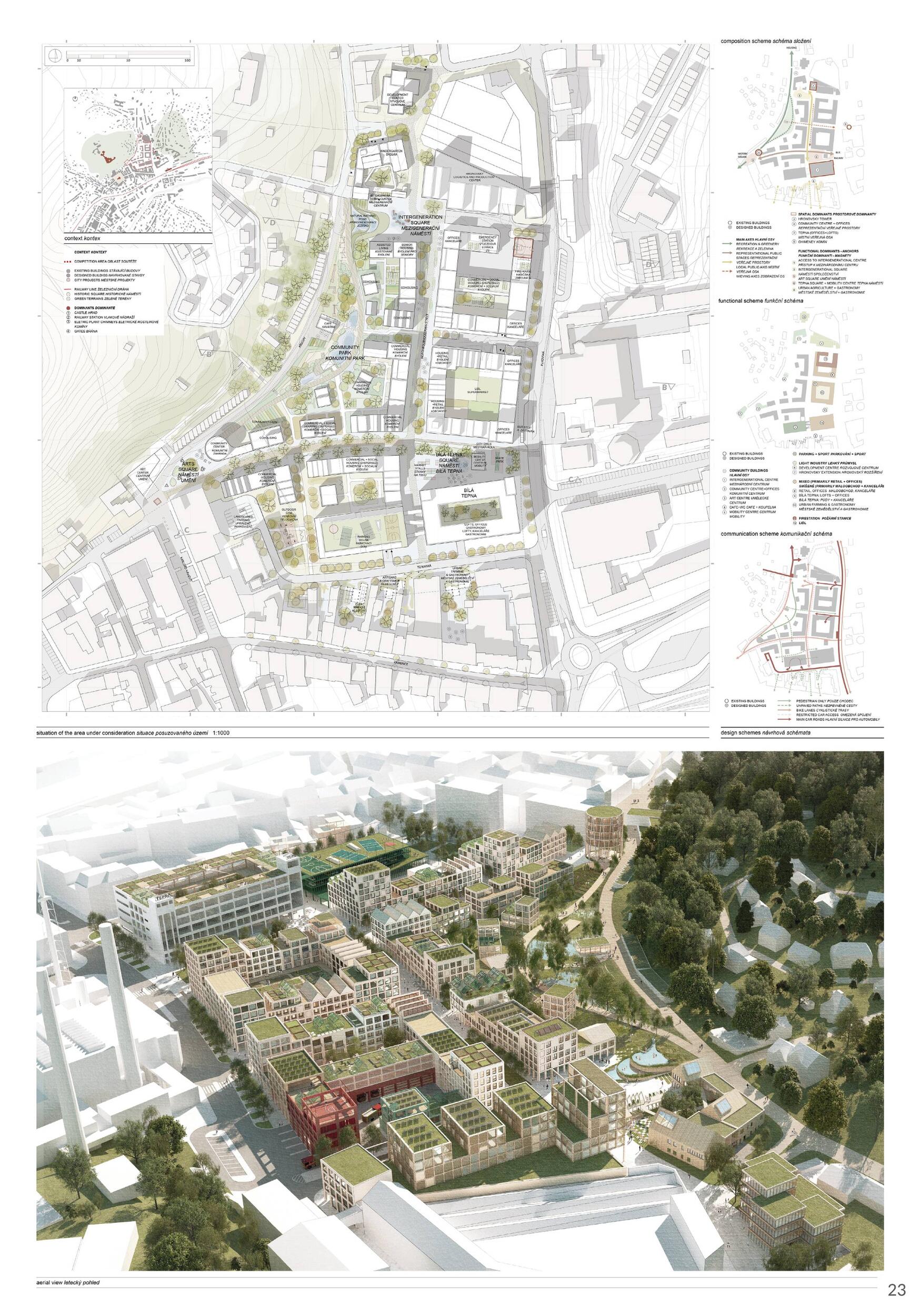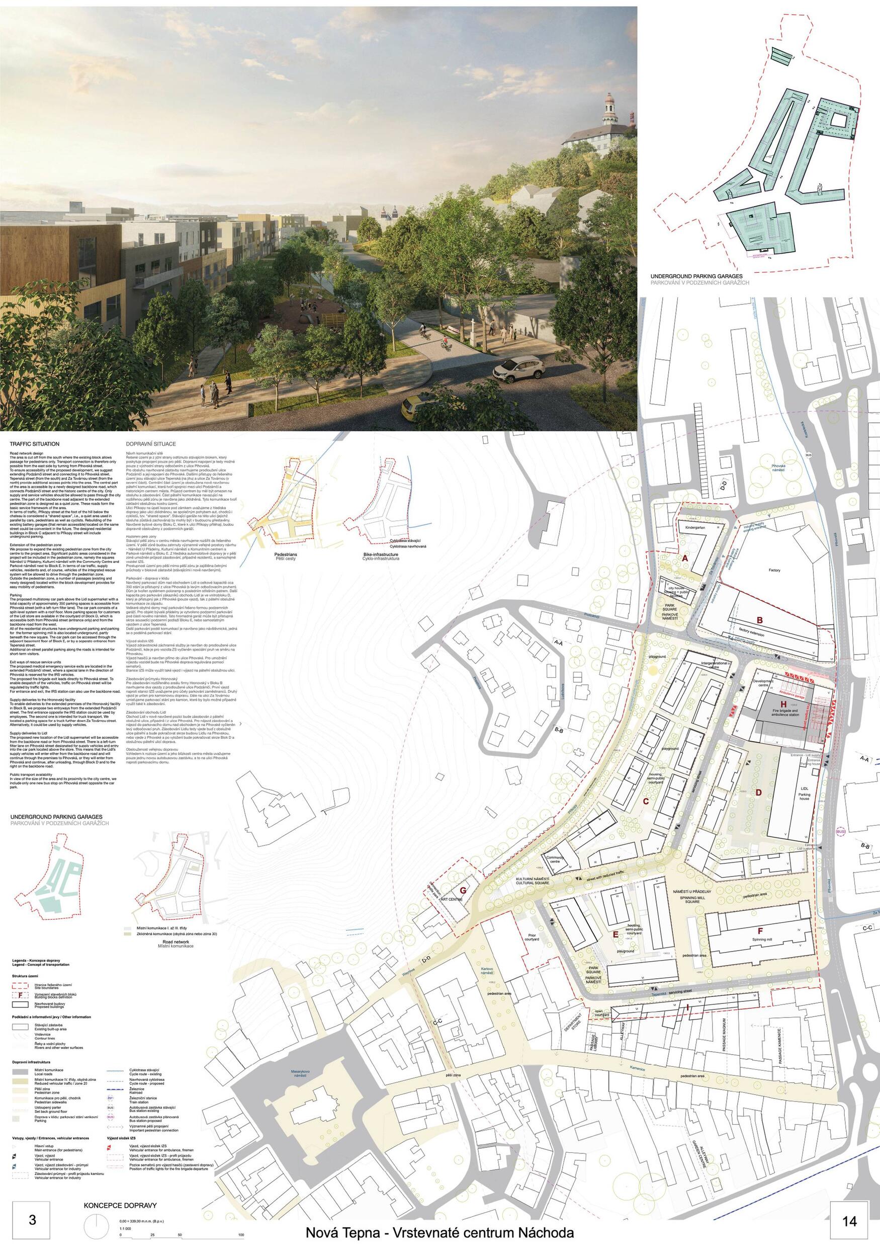 The proposal deserves first place in all respects, because its authors best understood the relations in the territory and solved their addition by a new layer. The establishment of two axes, which start from the proposed square near Tepna, logically and clearly divides the area into urban blocks. The fundamental phenomenon of these axes is that they lead somewhere, that they have a beginning and an end in places of other inserted meanings. The axis from the historic core, which is formed into a pleasant soft curve and opens into the new square near Tepna, offers a beautiful view of the castle tower and on the other side of the industrial buildings with a massive chimney. The northern connection leads to a smaller community square, from where there is a connection to the main street and buildings under the castle. The secondary dividing street is also not located by chance and visually connects to the core of the newly established park on one side and a high chimney on the other. The new park complements the massif of mature greenery under the castle and enhances its impression. The plan is simple and clear, largely respects the existing buildings and property conditions in the place. Individual building blocks can be gradually filled in time and it is not necessary to build them as a whole at once. This is absolutely decisive for further consideration of how to improve this neglected place in the immediate vicinity of the center. The plan contains a clear system of centers, defines the field of spatial effect of the urban atmosphere and works with thoughtful gradation. In a more detailed elaboration, we recommend considering the connection to the park, because its more precise delimitation by buildings could further enhance its spatial quality and at the same time offer the best plots with a view of the park and the castle at the same time. A significant element of the design is working with water. Although the degree of landscape conception of the northwestern design sector is surprisingly high (due to the already existing phenomenon of Regnerovy sady), this concept works well in contrast to the compact urban structure of the rest of the design. The design is good for the image of the city, its graininess and picturesqueness, as well as for the existing and supplemented landmarks. A clear and comprehensible answer to the very important question of how the integration of a new part of the city into the structure of the city will work when viewed from the surrounding hills. The contemporary structure gives a non-violent impression and is almost as if it has always been here. The roof design creates a kind of fifth façade, playfully and plastically shaped, perhaps with references to the previous industrial aesthetics of the place. High above the streets, it highlights another layer of semi-public space with an incredibly diverse range of uses, which is an indisputable bonus for future users.