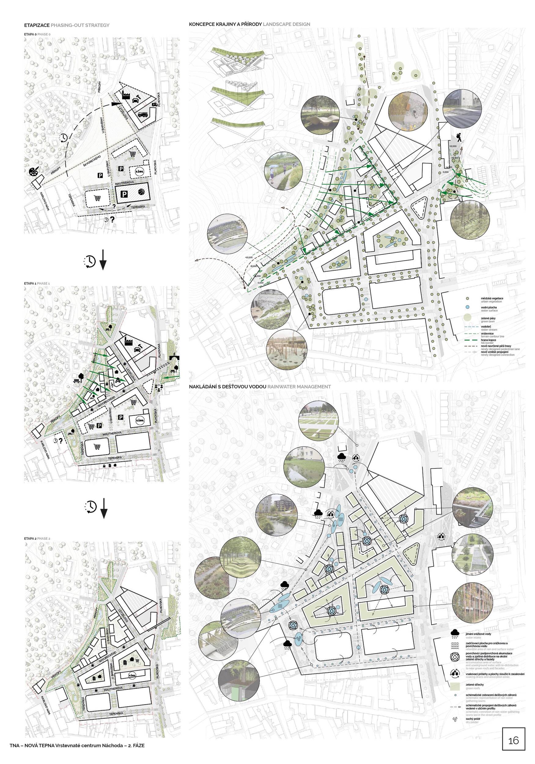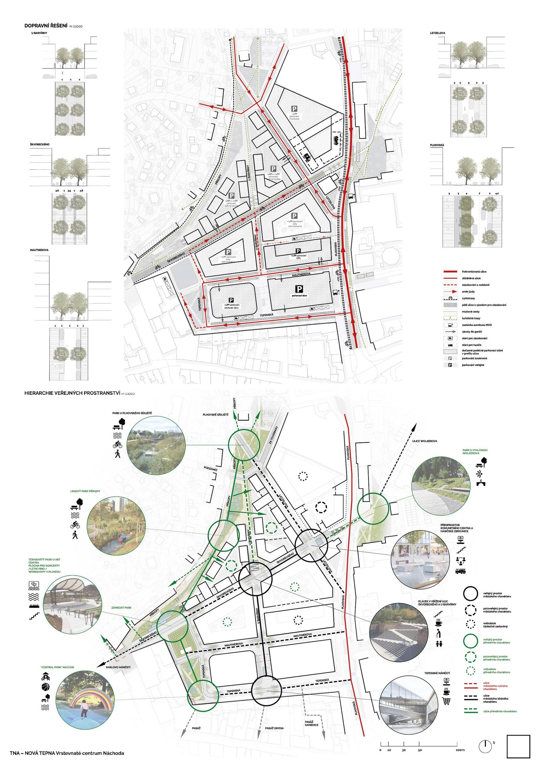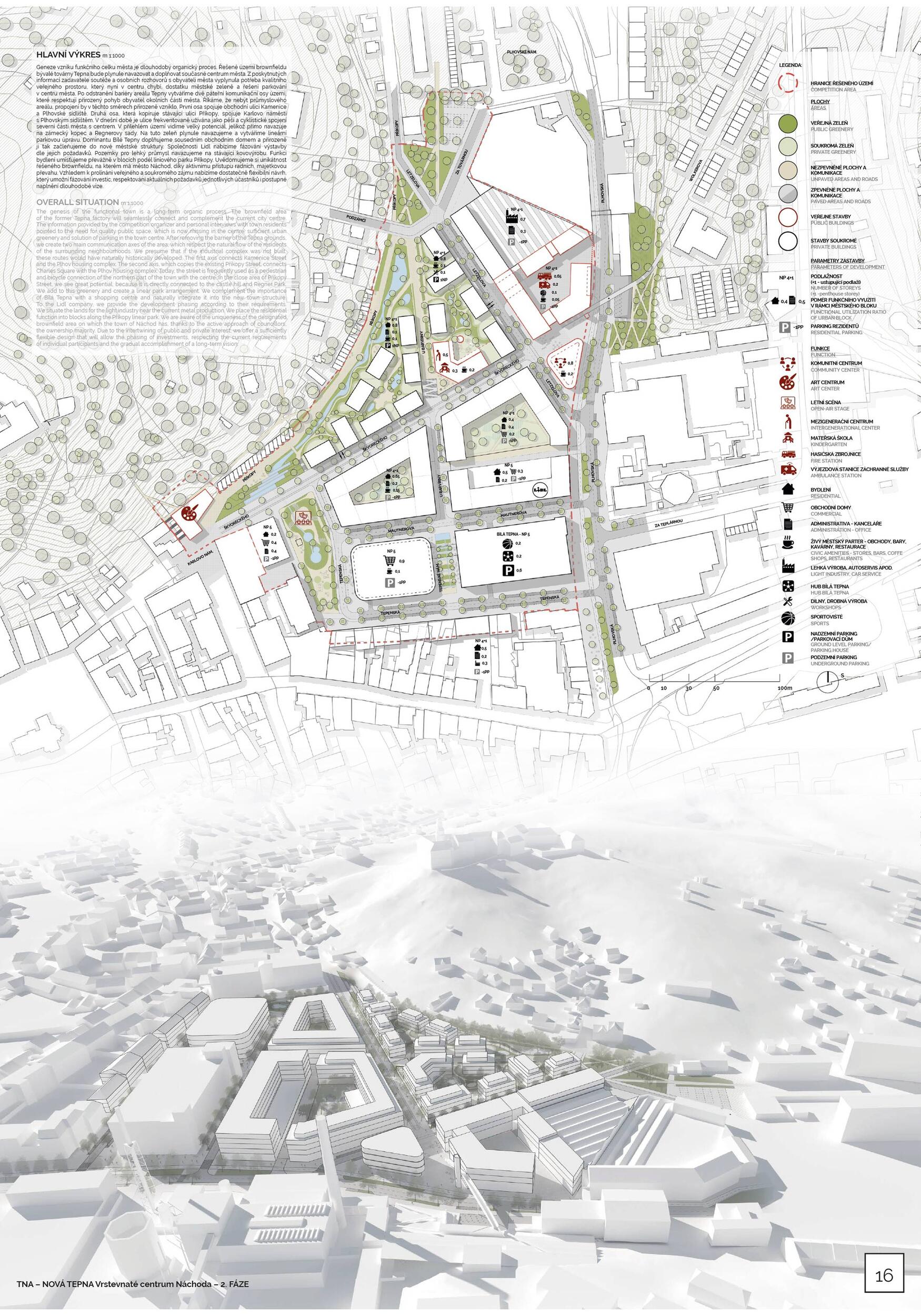 The genesis of the functional town is a long-term organic process. The brownfield area of the former Tepna factory will seamlessly connect and complement the current city center. The information provided by the competition organizer and personal interviews with town residents pointed to the need for quality public space, which is now missing in the center, sufficient urban greenery and solution of parking in the town center. After removing the barrier of the Tepna grounds, we create two main communication axes of the area, which respect the natural flow of the residents of the surrounding neighborhoods. We presume that if the industrial complex was not built, these routes would have naturally historically developed. The first axis connects Kamenice Street and the Plhov housing complex. The second axis, which copies the existing Příkopy Street, connects Charles Square with the Plhov housing complex. Today, the street is frequently used as a pedestrian and bicycle connection of the northern part of the town with the center. In the close area of Příkopy Street, we see great potential, because it is directly connected to the castle hill and Regner Park. We add to this greenery and create a linear park arrangement. We complement the importance of Bílá Tepna with a shopping center and naturally integrate it into the new town structure. To the Lidl company, we provide the development phasing according to their requirements. We situate the lands for the light industry near the current metal production. We place the residential function into blocks along the Příkopy linear park. We are aware of the uniqueness of the designated brownfield area on which the town of Náchod has, thanks to the active approach of councilors, the ownership majority. Due to the intertwining of public and private interest, we offer a sufficiently flexible design that will allow the phasing of investments, respecting the current requirements of individual participants and the gradual accomplishment of a long-term vision.