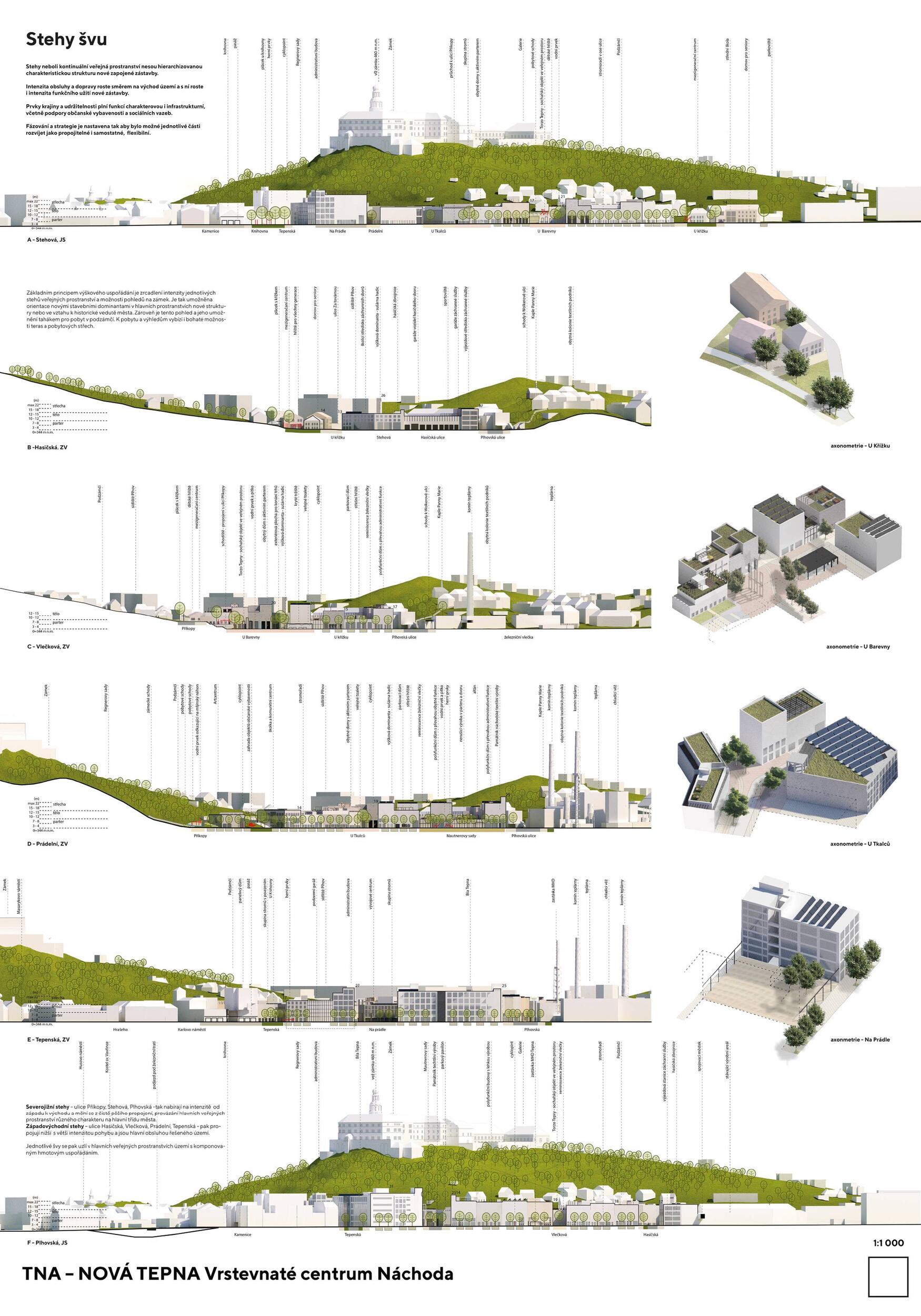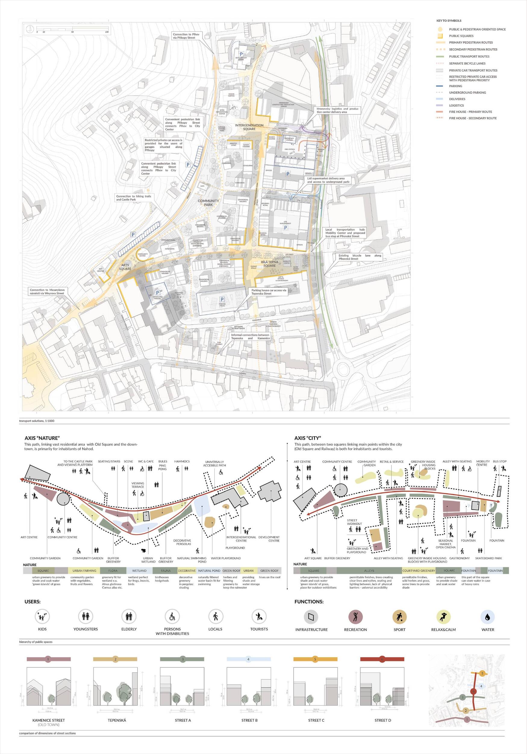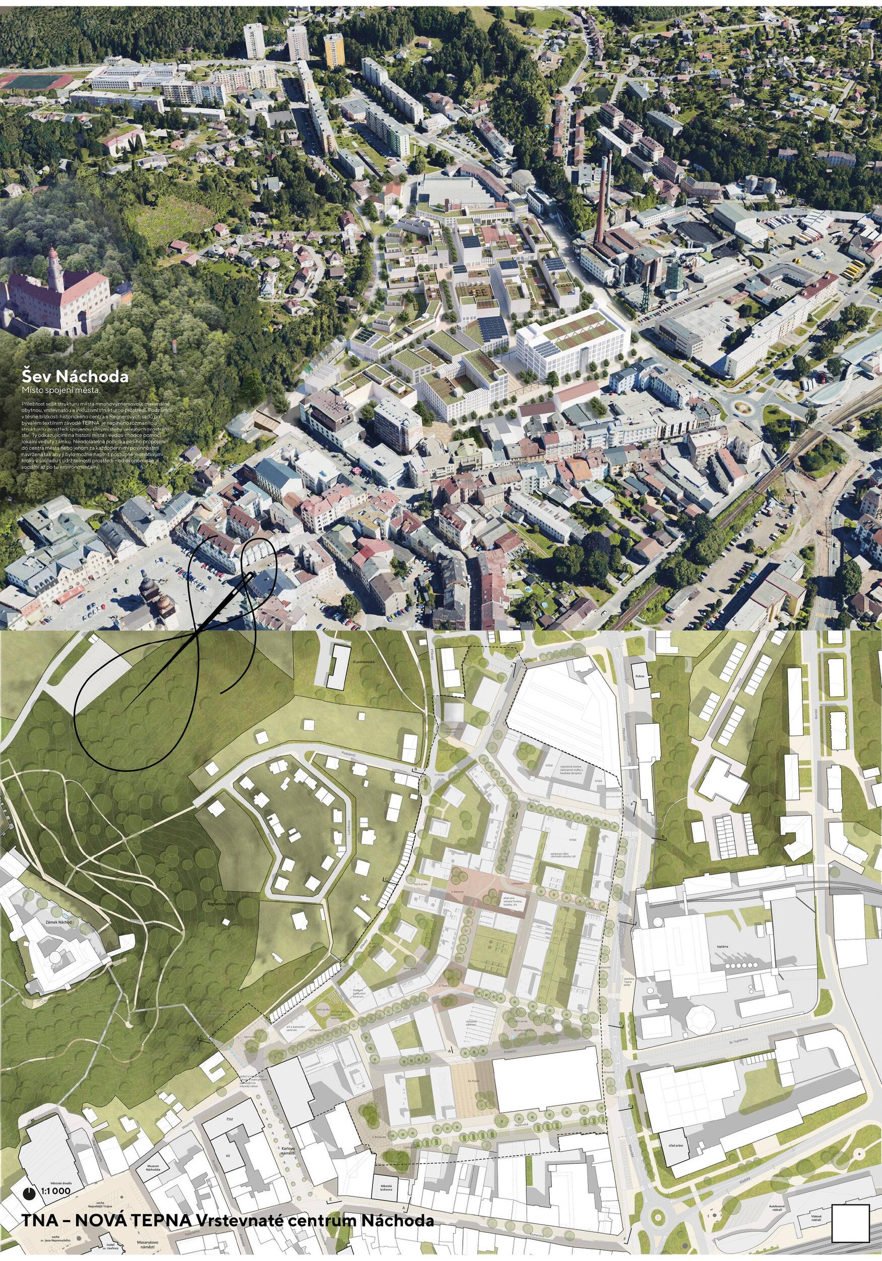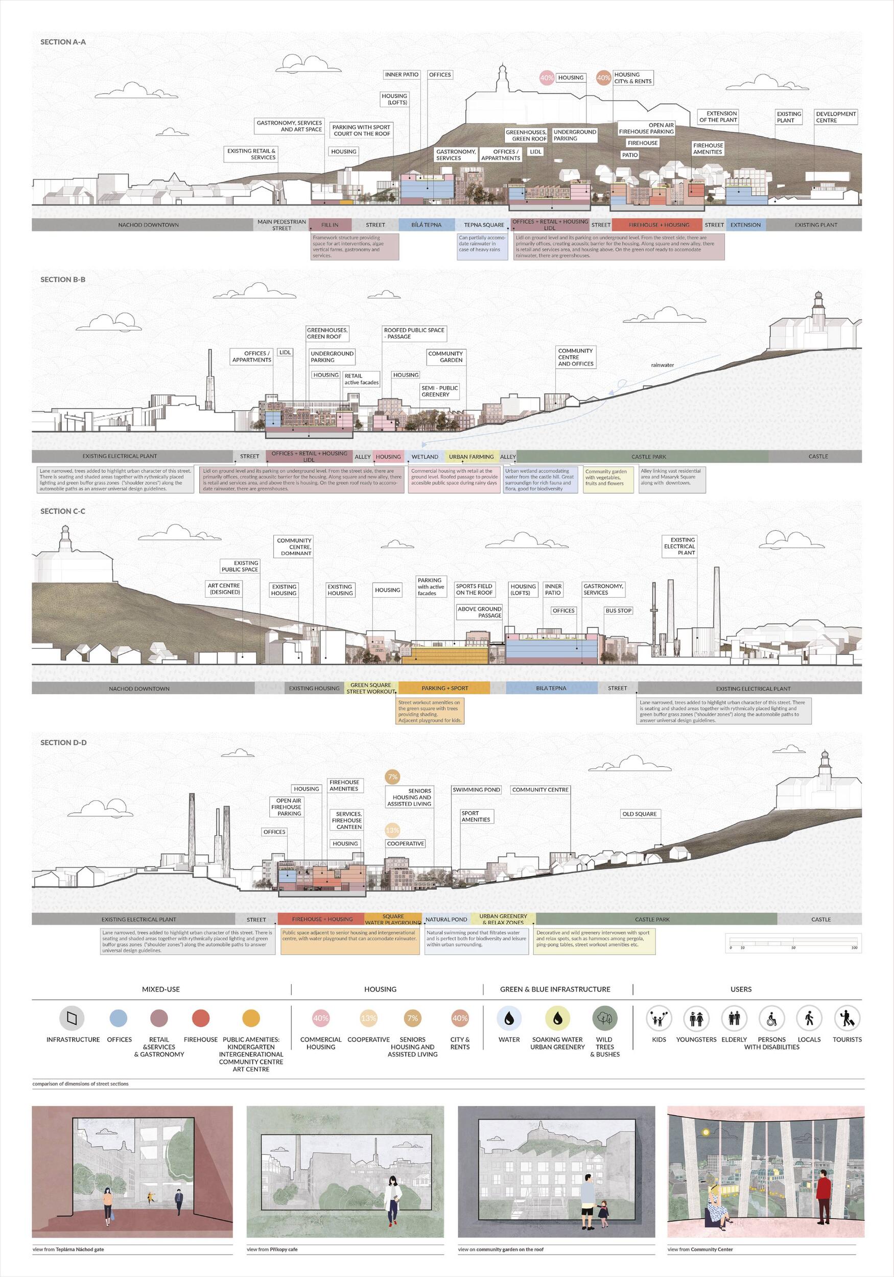 Seam of Náchod. The place where the city connects. Opportunity to sew and tie together the structure of the city with a polyseamus, highly livable, stratified and inclusive structure of the urban environment. Podzámčí, former industrial area, the place of TEPNA textile factory, located close to the historic center and Regner orchard is filled with a diverse urban structure connected together by strong bindings of public spaces. These bindings, in the context of textile factory so called stitches refer to the history of the place and lead pedestrians alongside view of the castle on the one side and the industrial landmarks of the heating plant on the other side. Compelling invitation of walk to the city center or simple routine course for everyday duties, all is designed to be fulfilled by sequential steps proposed I harmony with principles of sustainability – from economic and social to environmental.