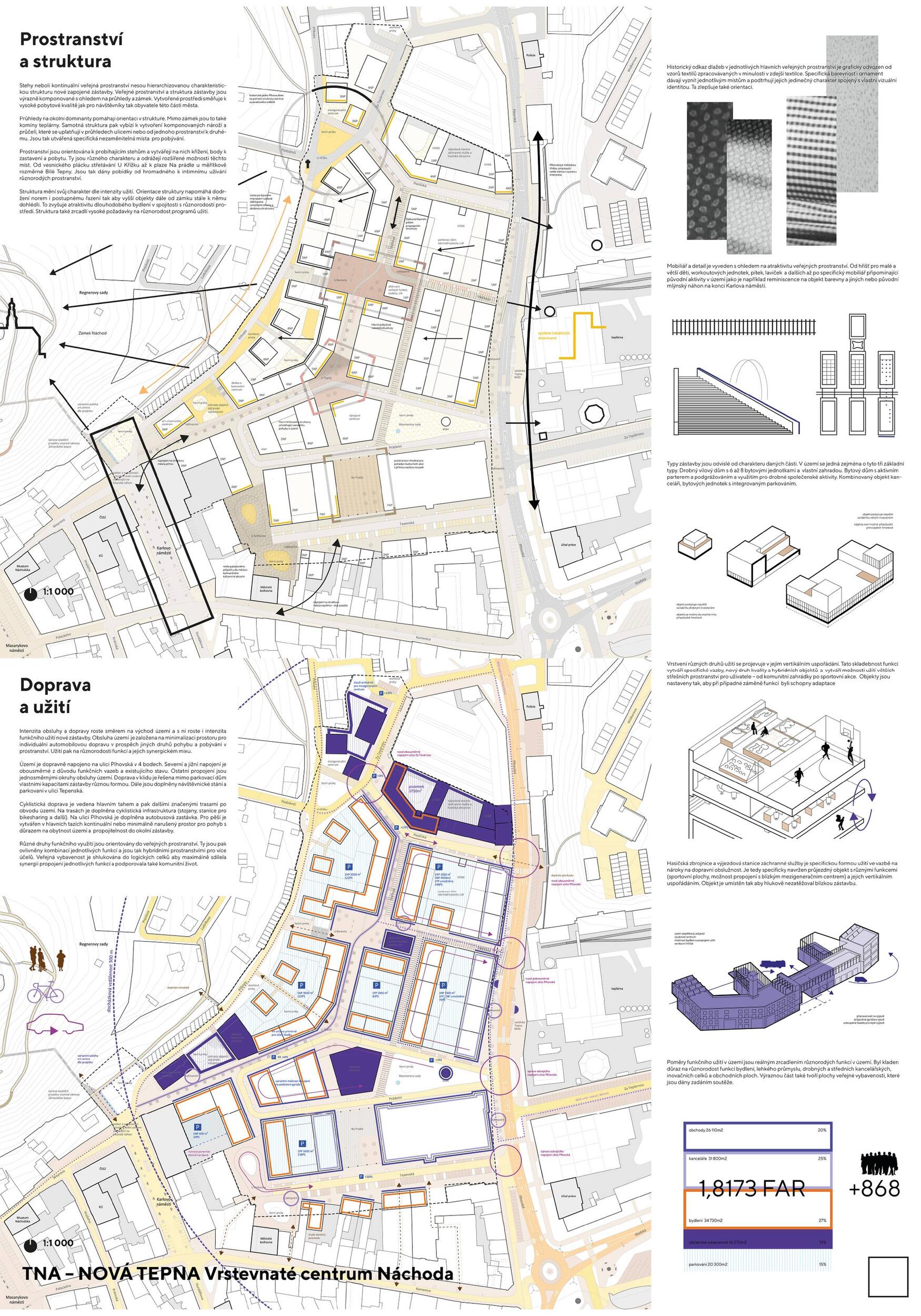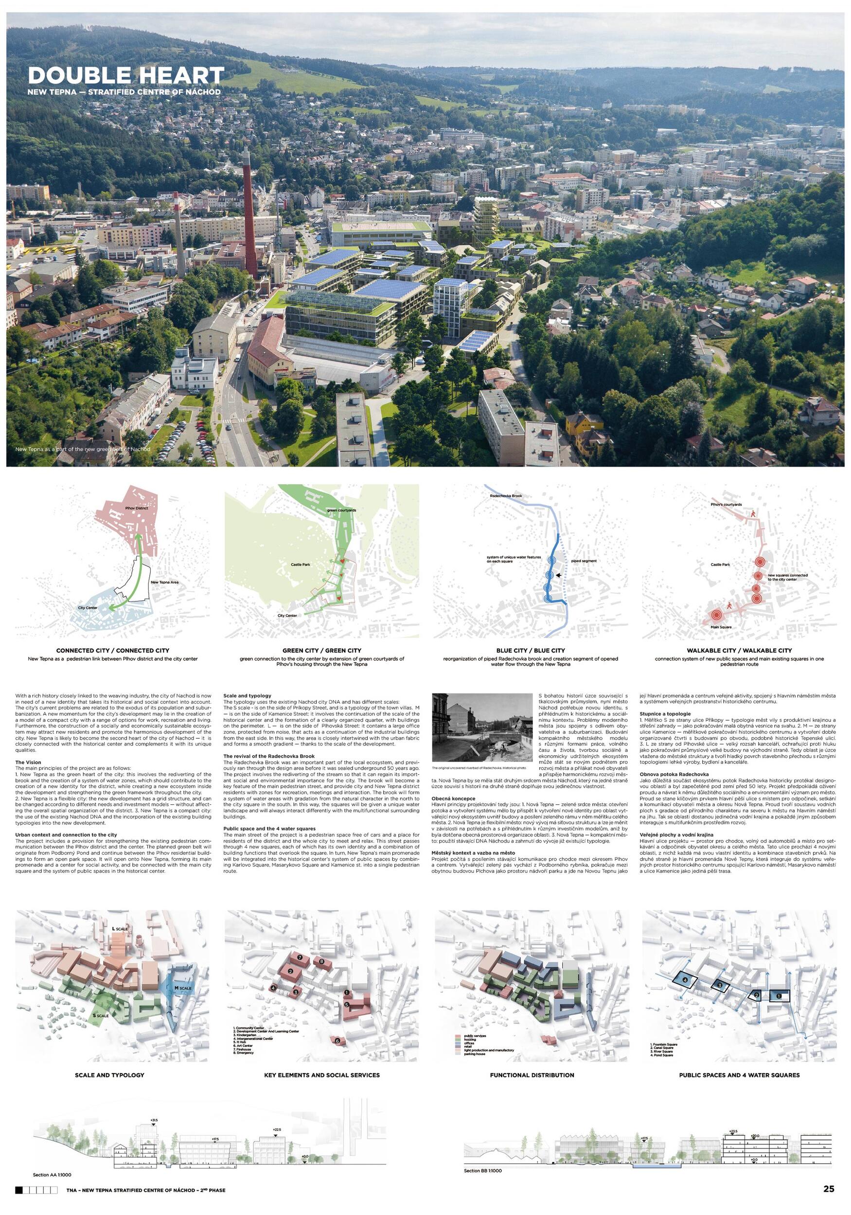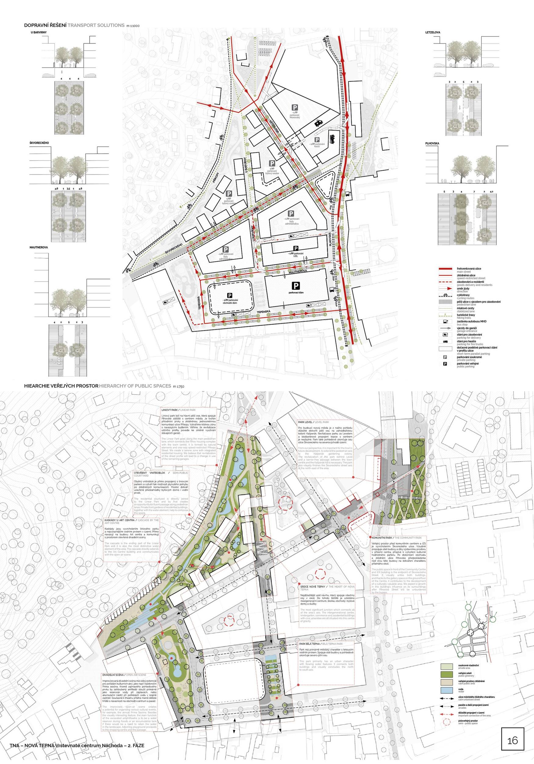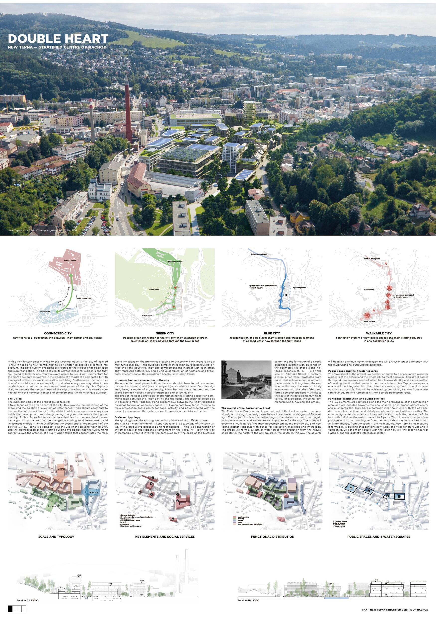 Seam of Náchod. The place where the city connects. Opportunity to sew and tie together the structure of the city with a polyseamus, highly livable, stratified and inclusive structure of the urban environment. Podzámčí, former industrial area, the place of TEPNA textile factory, located close to the historic center and Regner orchard is filled with a diverse urban structure connected together by strong bindings of public spaces. These bindings, in the context of textile factory so called stitches refer to the history of the place and lead pedestrians alongside view of the castle on the one side and the industrial landmarks of the heating plant on the other side. Compelling invitation of walk to the city center or simple routine course for everyday duties, all is designed to be fulfilled by sequential steps proposed I harmony with principles of sustainability – from economic and social to environmental.