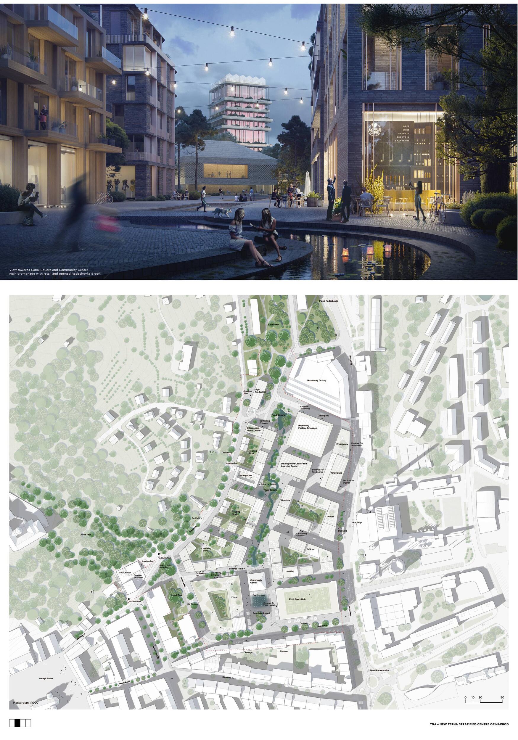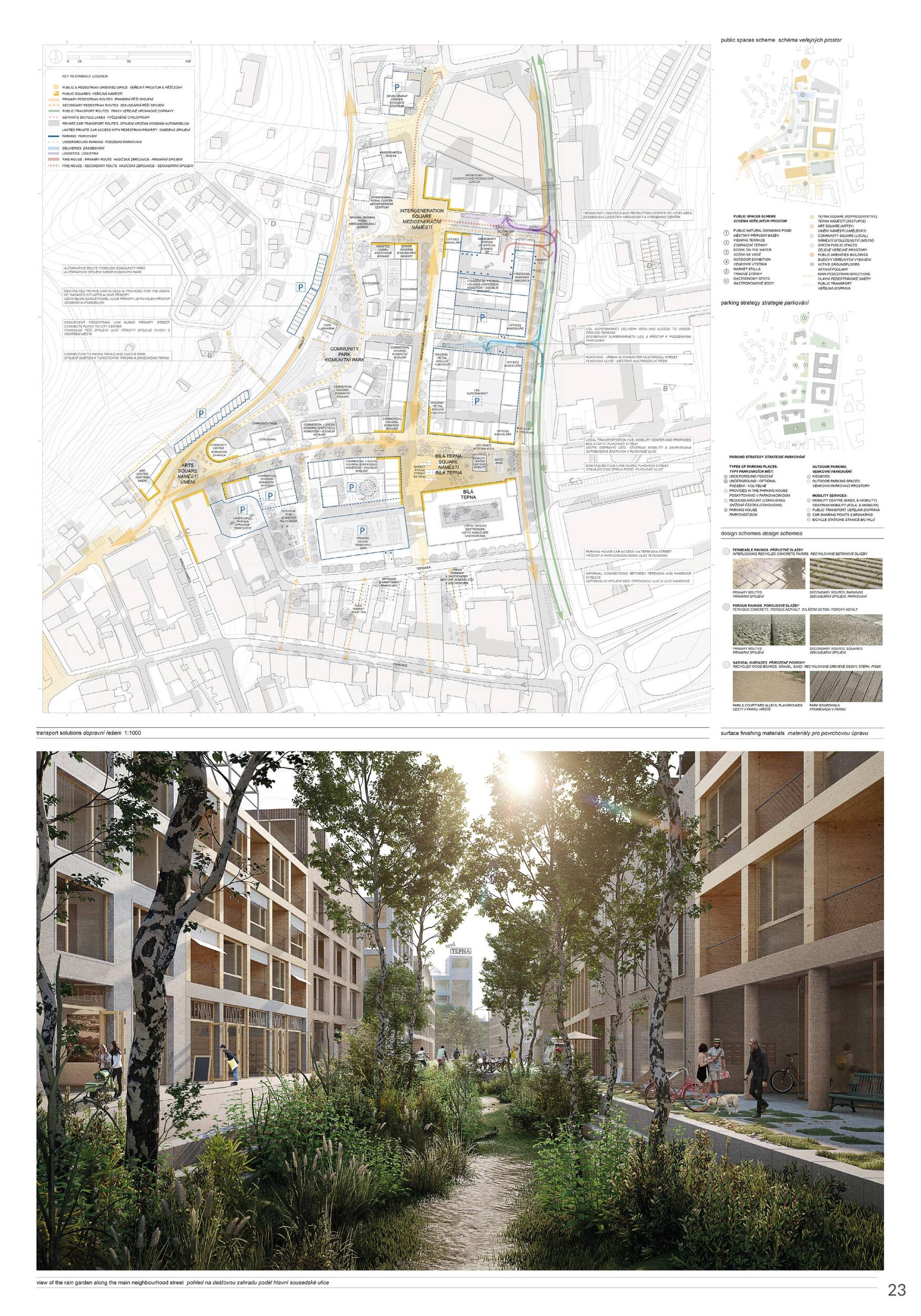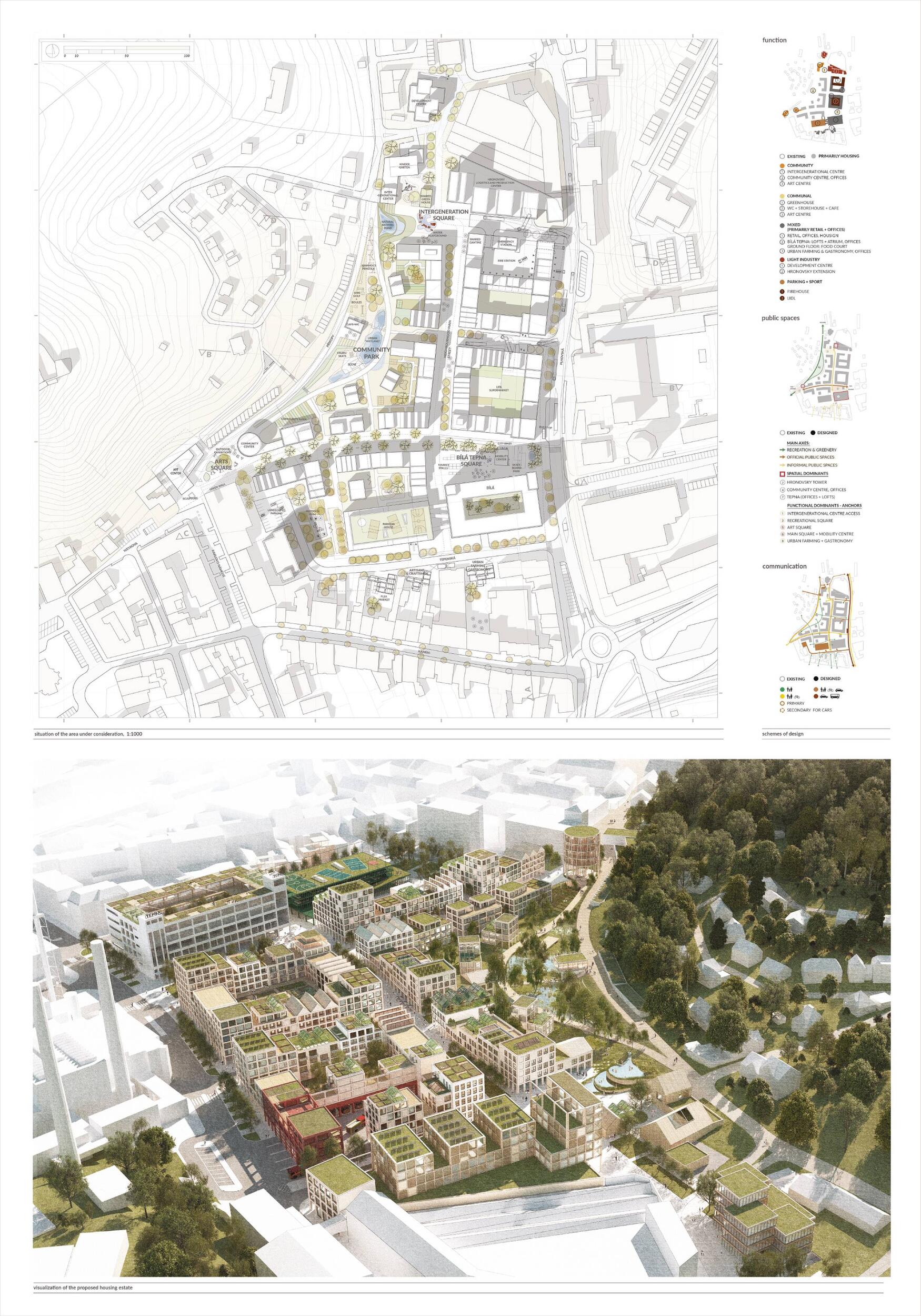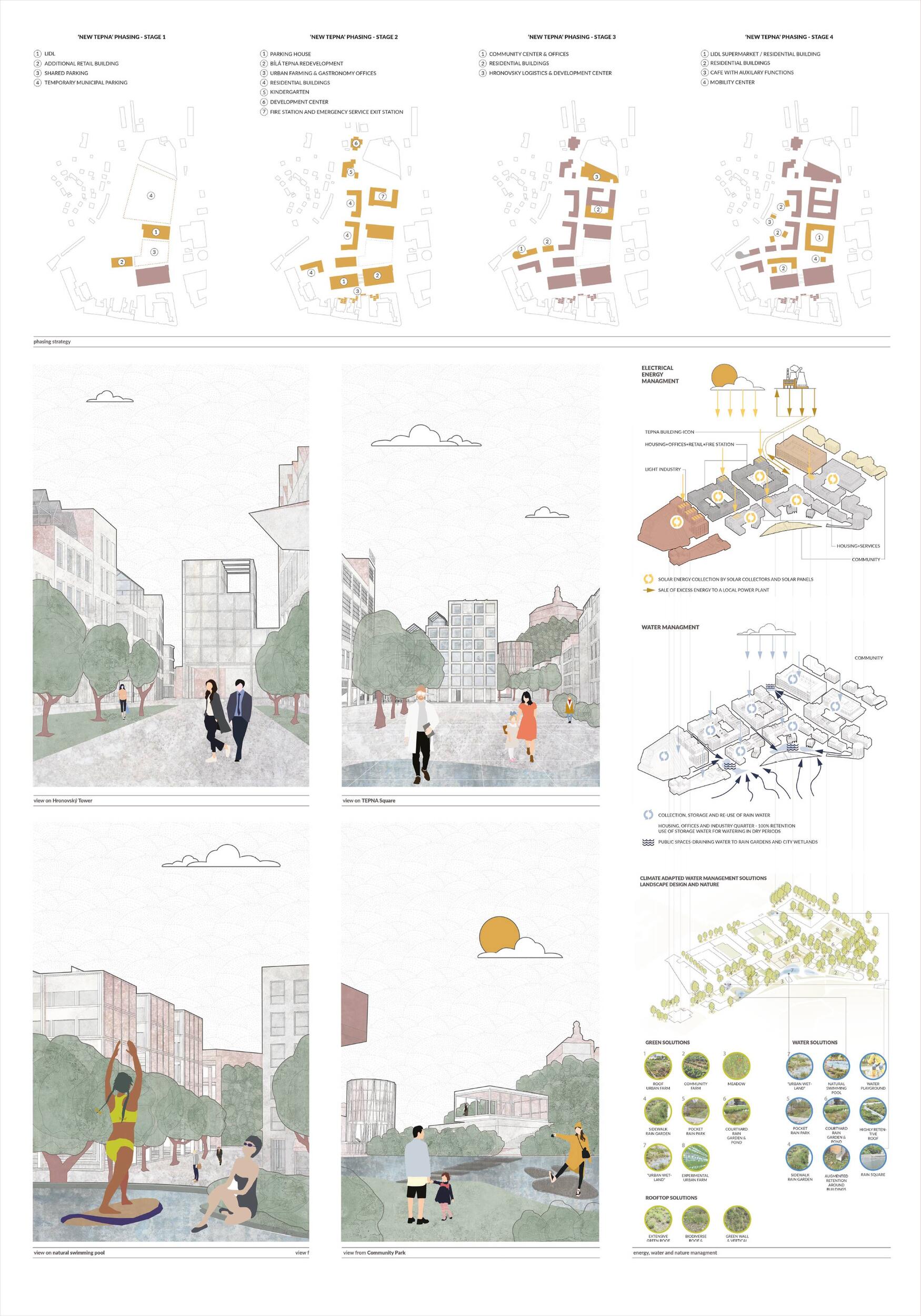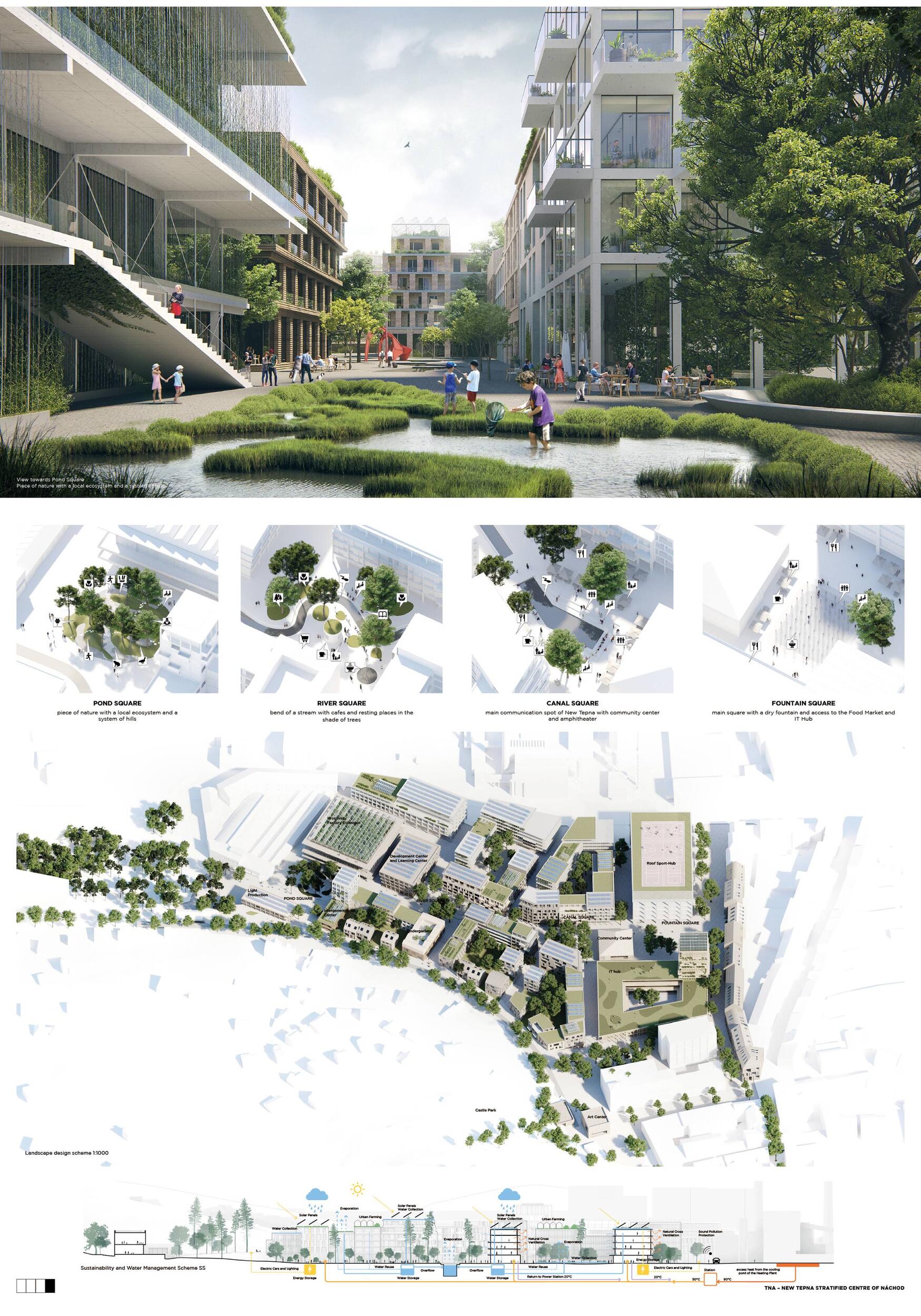 Among challenges rising in the area of residential development, there are two that appear particularly urgent: one is climate adaptability, and the other is social cohesion. The main idea of this proposal is, therefore, to create a comfortable, inclusive, restorative living environment that would inscribe into the existing urban and cultural context and that would go hand in hand with the idea of “hedonistic sustainability,” creating an attractive, enjoyable living environment. This idea is mirrored on all levels and scales. A network of public spaces was created in urban design layout, enhancing connectivity between attractive public functions and highlighting main physical dominants. Those axes would be primarily pedestrian. Functionally, attractors and anchors were used to creating different ambiances of the publicly available spaces so as to answer the needs of all the user groups. The housing structure is differentiated to ensure social mix and inclusion. Circularity and sustainability of solutions are of great importance. New constructions are interwoven with green and blue infrastructure, which is present at every scale. From urban wetlands, natural swimming pond and fountains in the public realm to green roofs and greenhouses, to urban algae plantations, water and greenery are present everywhere, ensuring the environment enhances biodiversity and proper microclimate. Secondary, recycled materials and energy saving solutions such as sharing amenities, food sharing, repair cafes should be introduced.