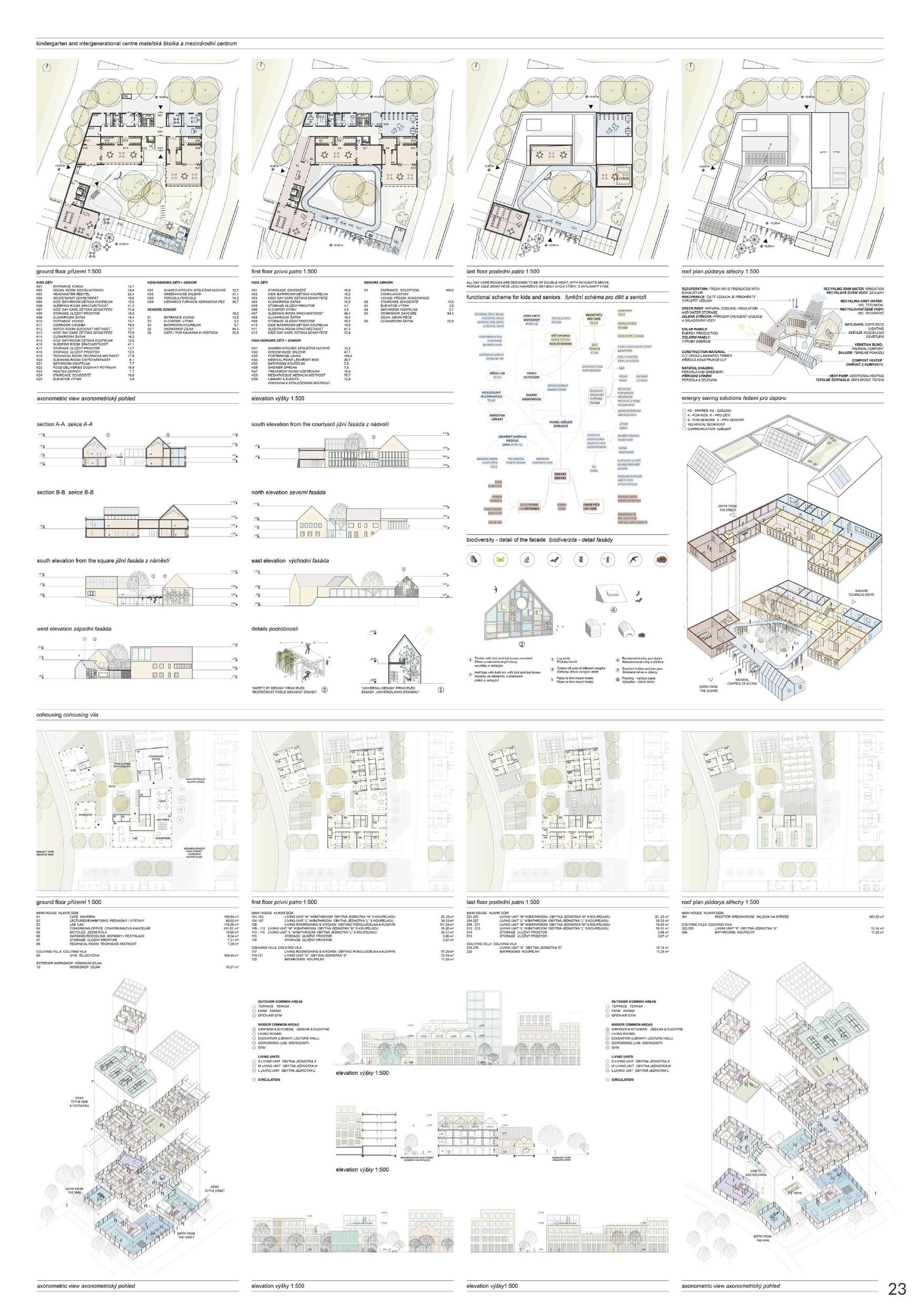 One of the basic principles of the design is the relocation and opening of the Radechovský brook, which should become a certain backbone of the new construction. The center of the new construction should be a public space accessible only to pedestrians and cyclists, while car service would be only around the perimeter. However, this premise of the north-south axis carries with it the need to demolish the corner house at the mouth of Palackého Street. Without this intervention, the principle would lose its charm and meaning. However, it is difficult to imagine that the demolition proposal would be warmly received by the public, and so this otherwise high-quality proposal is, unfortunately, difficult to implement. Urban spaces are designed sensitively and adequately, as well as the layout of the buildings gives a clear idea that it is otherwise a viable plan. However, the reaction to the property map and the solution of the LIDL store, which does not have the possibility of time phasing, remains debatable. The jury especially appreciated the diversity of urban spaces, transforming the passage from the Plhov housing estate to the center into an urban story. The jury likes the two elegant height dominants at the entrances to the territory. The remaining height with mostly flat roofs is perhaps too calm and monotonous, not corresponding to the developed urban structure. Thanks to the predominant roofs with a regular system of solar panels, the whole district gives the impression of a development center in the middle of a small town. The addition of some parts with greenhouses, playgrounds and other than flat roofs was applied only to a too small extent.